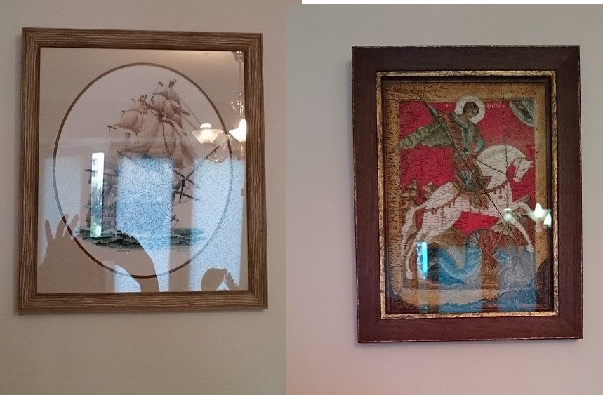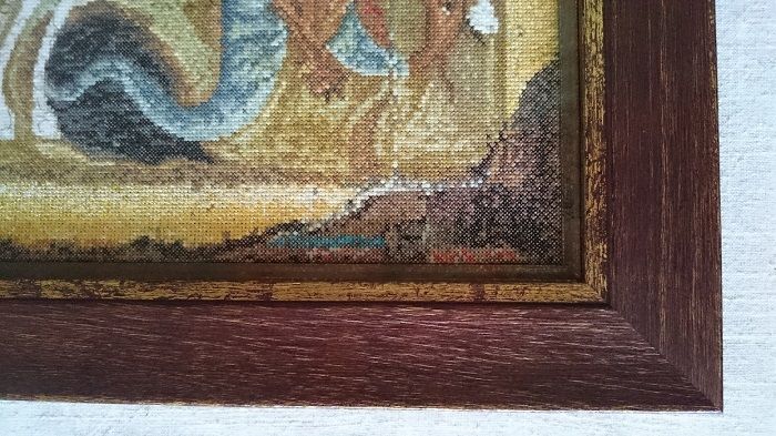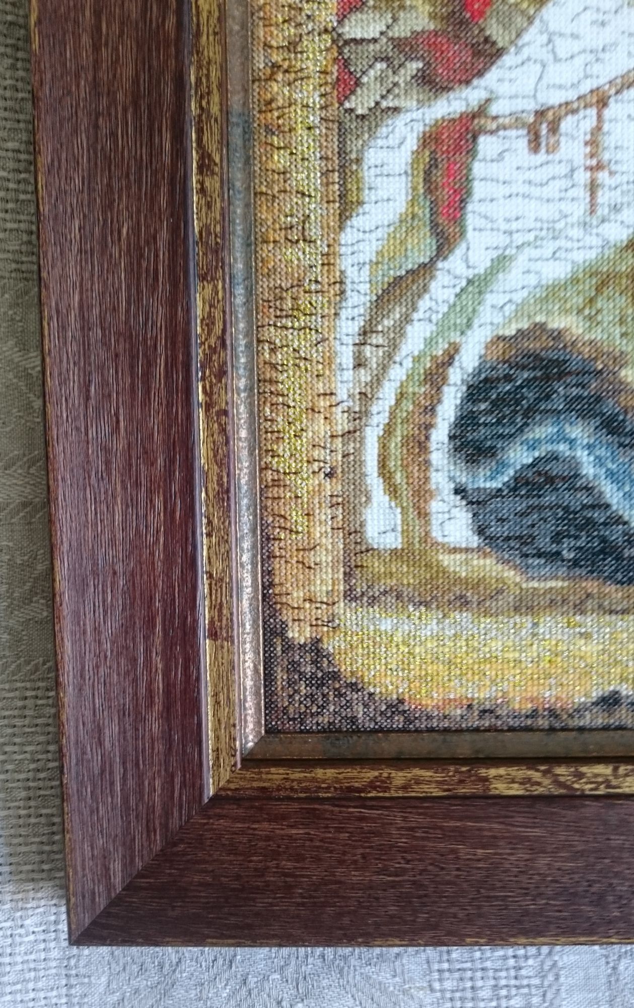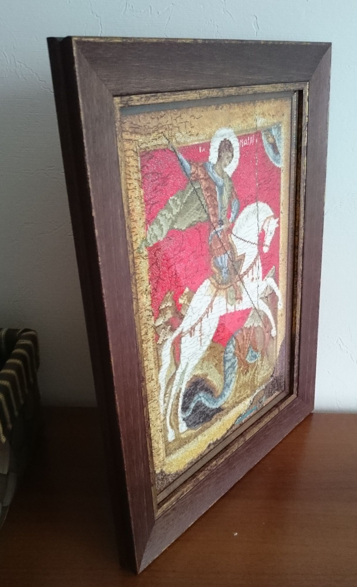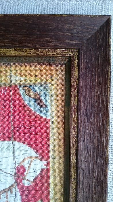 9 августа 2017 Девочки, спасибо всем огромное! Я несколько раз за вечер пыталась что-нибудь написать, но такой поток хвалебных отзывов меня совершенно обескуражил, настолько, что все слова куда-то делись. Если честно, то не ожидала столь единодушной оценки. Предполагала, что мнения разойдутся, ибо иконы, как правило, принято обрамлять в золоченые рамы. Поскольку Георгий шился долго, то за это время идеи оформления приходили и уходили. Первая - оформить так, как его в свое время представили на ФР - просто натяжкой на подрамник - скромно и с намеком на "оригинальную" фреску по дереву. От этой идеи отказалась давно по многим причинам. В багетке обсуждали с Ириной - она тоже согласилась, что это не лучший вариант. Потом думала о "золоте". Но я очень не люблю этот псевдо шик. К тому же, вышивка самодостаточна, уже имеет золотую рамку, и приделывать к ней еще одну показалось лишним. Ну, и наконец утвердилась в мысли, что рама должна быть деревянной, с эффектом "мореного" дерева и состаренности, как бы сливаться с изображением. В идеале хотелось деревянную резную. Однако, предполагала, что такого не найду. В любой багетной мастерской в ассортименте масса деревянного узорчатого багета с вензелями, но производители почему-то обязательно выливают на него ведро самоварного золота. Резной и некрашеный можно сделать только на заказ. Поэтому пошла по более простому пути. Ирина разложила передо мной все, что более-менее подходило под мой запрос. К счастью, нашлось именно то, что искала. Еще выбрала "бронзовый" кантик (малость с патиной). Вот фото рамки поближе, возможно будет лучше видно. Стекло музейное, его в реале не видно вообще. Кантик забран под стекло. вишенка аллая, tashu02, курочка и 30 других сказали спасибо Поделиться сообщением Ссылка на сообщение