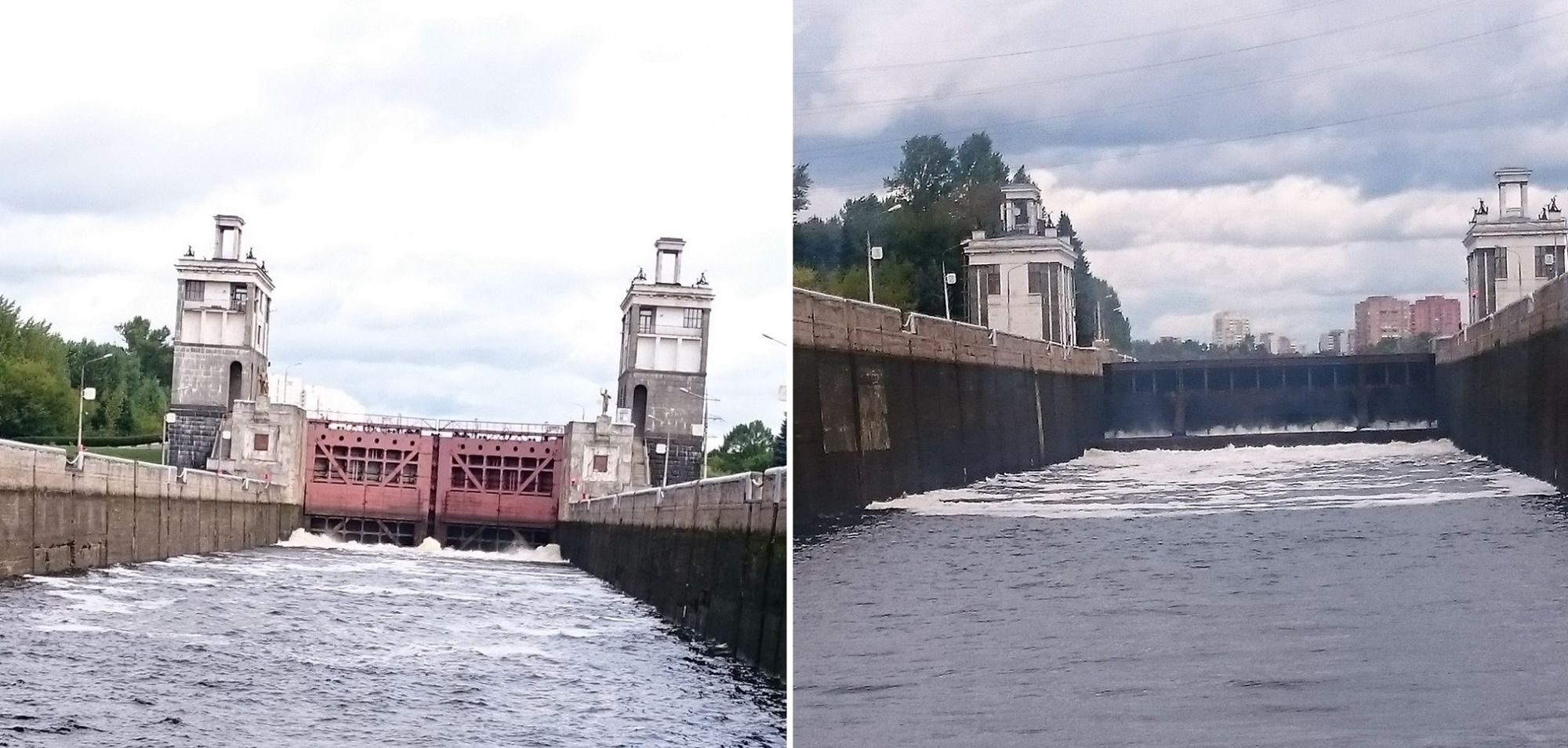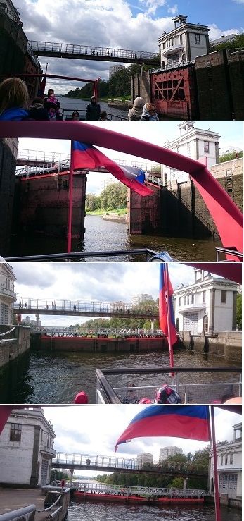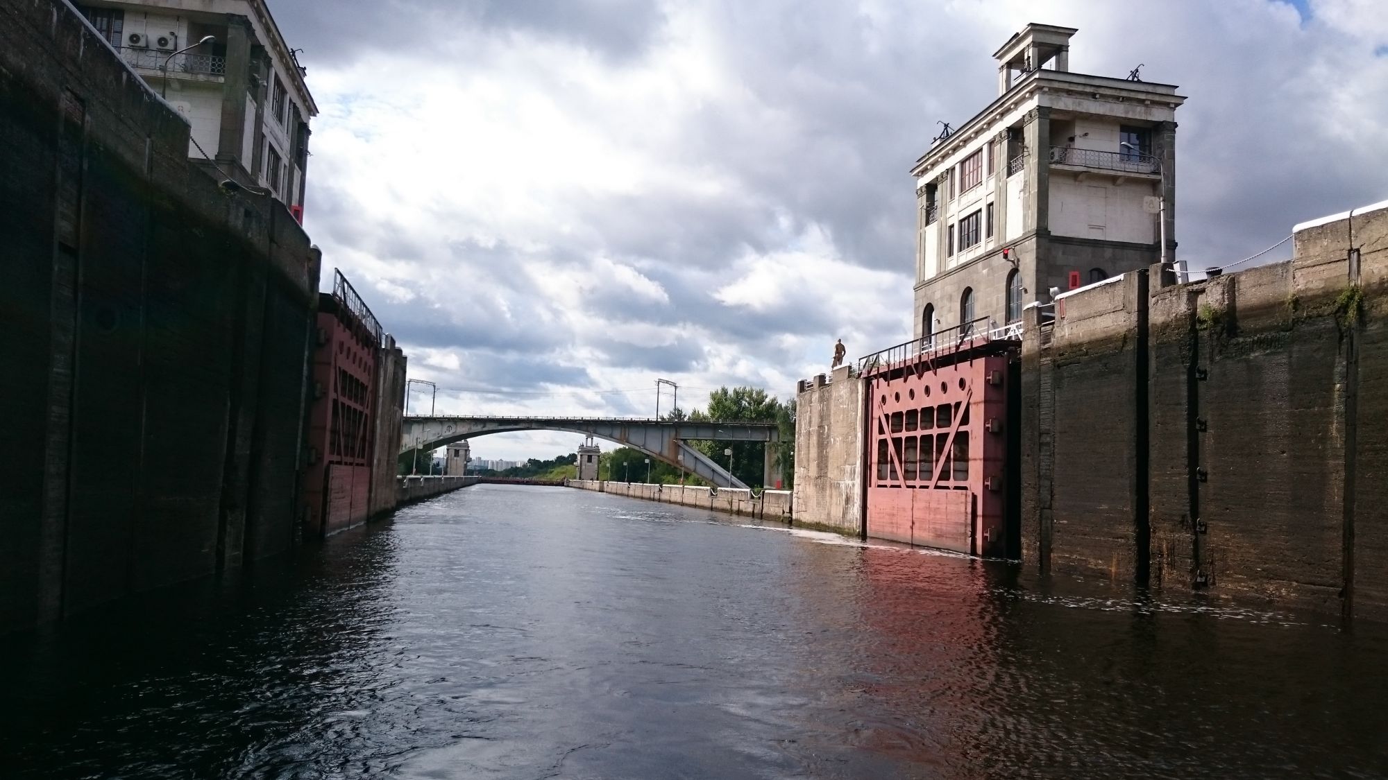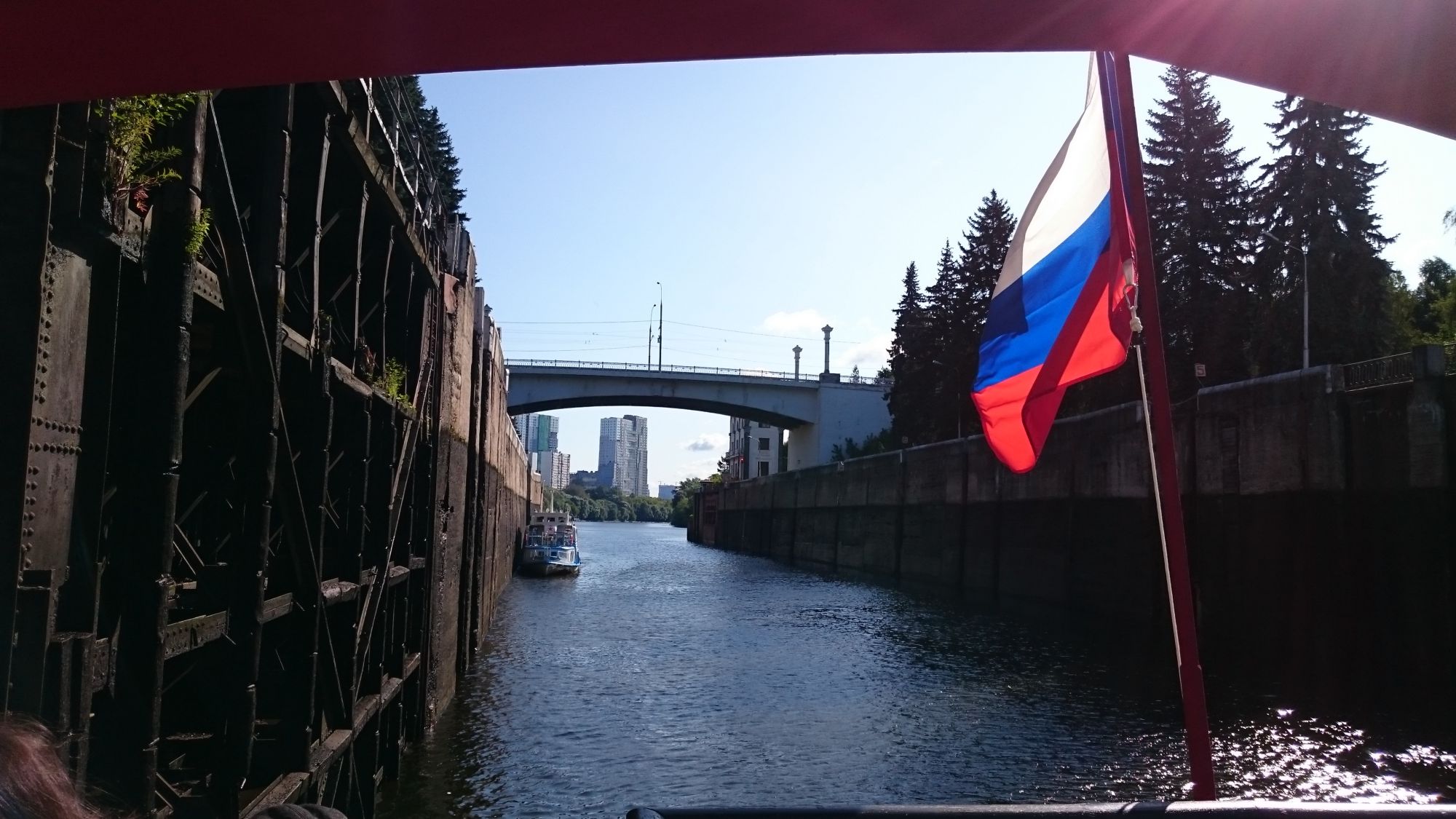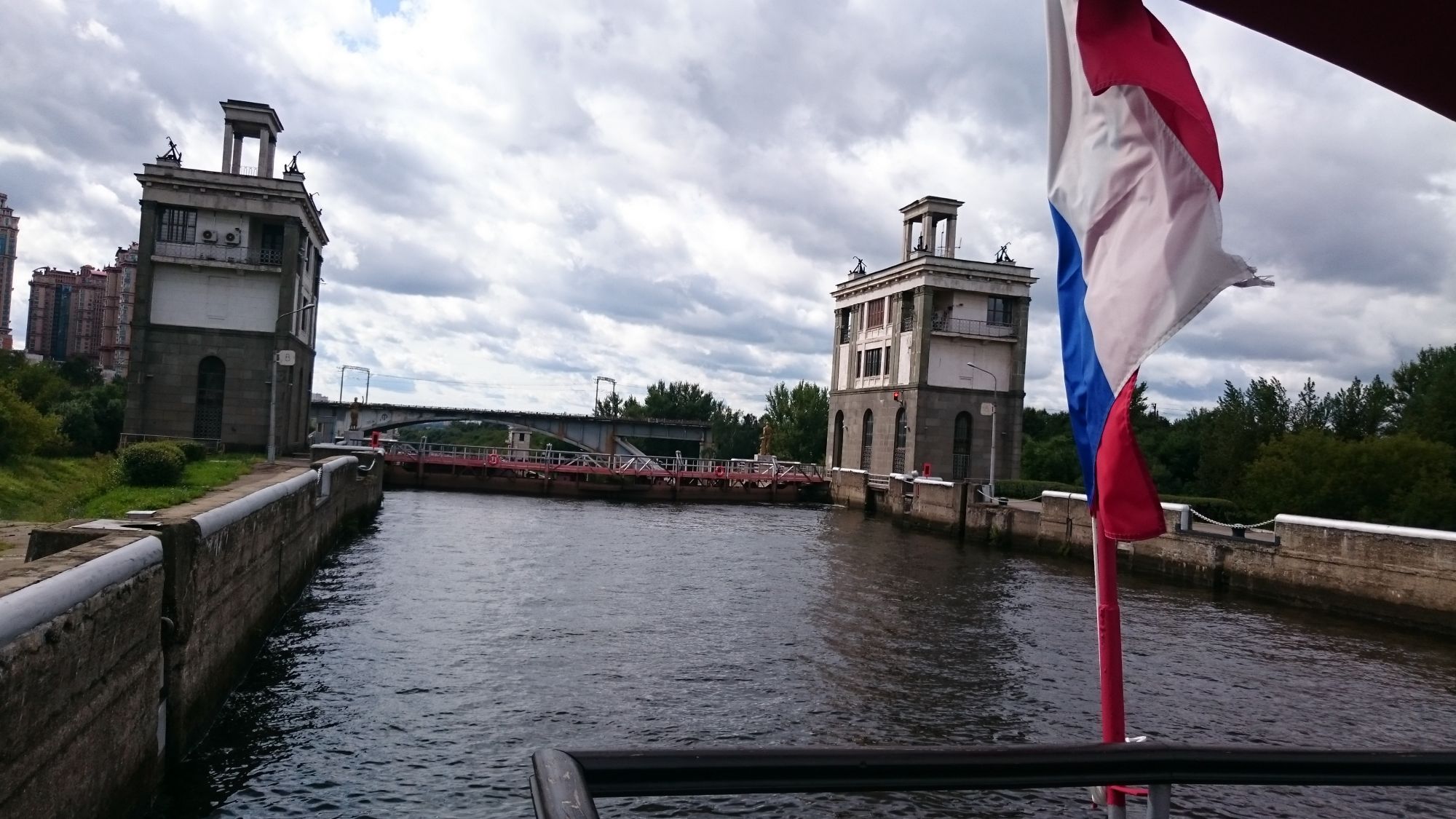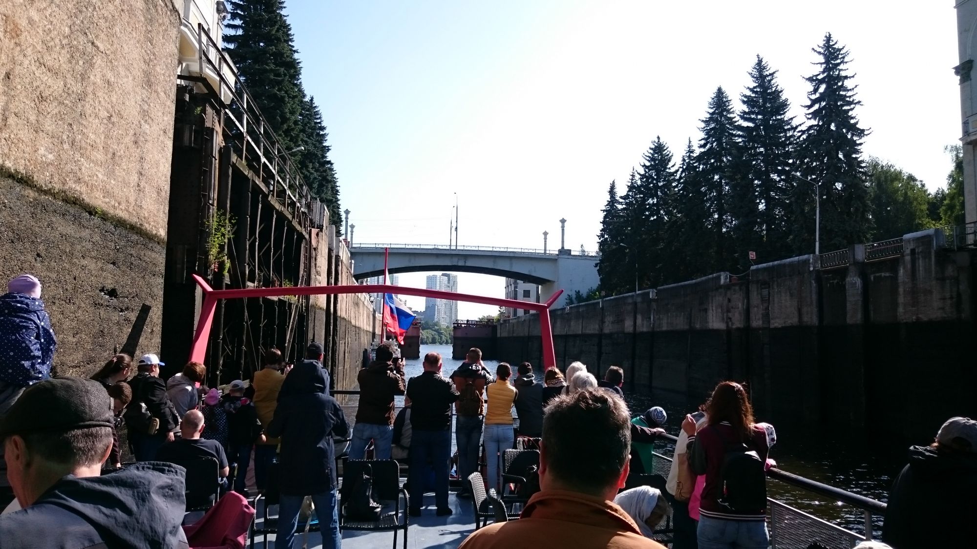 28 августа 2017 Всем привет! Хочу поделиться впечатлениями, а, возможно, кому-то помогу со свежими идеями. Если у вас уже есть подобный опыт, то читать, наверное, будет не очень интересно. Я, скорее, хотела бы "заразить" тех, кто такого еще не видел. А я – видела… Мне было неполных три года, и плыли мы на круизном лайнере по каналу имени Москвы. Мама взяла меня с собой во взрослую компанию, о чем, наверное, в пути сто раз пожалела. Ибо мой непреодолимый ужас и истерику при виде шлюзов помню до сих пор. Эта картинка всю жизнь стоит у меня перед глазами, и является первым детским воспоминанием. Причем воспоминанием ужасным. С тех пор прошла жизнь, и как-то вдруг мне стукнуло, что шлюзов я, наверное, больше не боюсь, а в сознательном возрасте их так и не увидела. Ну, а далее, сбор «команды» и в путь. Экскурсия "Московская шлюзованная система" длится 4 часа, бывает не так часто и только по хорошей погоде. Это путешествие на прогулочном катере по Московским шлюзам (Канал имени Москвы, шлюзы № 9, 8, 7). Идея возникла не вчера, но мы как-то долго раскачивались, потом начались дожди… Поэтому с нетерпением ждали, что же будет в ближайшее воскресенье. Утром проснувшись в 6 утра и увидев в окне солнышко, вопрос решился сам, и наша поездка состоялась. Маршрут таков: отправление от причала Международного выставочного центра – прибытие в Северный речной порт (Речной вокзал). Для справки: Канал имени Москвы построен в 1937 году, руками, есс-но, заключенных. Все постройки имеют уникальную архитектуру в стиле, называемом «Сталинский ампир». Как сказал гид, если хотите бежать из столицы, но для вас перекрыты все пути выхода из города (автодороги, ж/д, авиа), то не надейтесь уйти водным путем: вас не пропустят шлюзы. Москва-река в черте города заканчивается шлюзами как на севере, так и на юге. Первое сооружение, которое встретило нас после отправления – старая водонапорная башня. Сразу после нее показался вход в девятый шлюз. Вот мы вошли в него через открытые массивные красные ворота. Следом за нами следовал другой катер. Перед шлюзованием оба судна очень крепко привязали правым боком к специальным сооружениям, почти впритык к стене. Затем ворота постепенно закрылись, и шлюз начал наполняться водой. Обратите внимание на первой фотографии, стена снизу совершенно черная, эта чернота постепенно скрывается под водой. Вот весь процесс… Мы выплываем в довольно широкую по московским меркам акваторию Крылатского. И видим сооружение старой гидростанции, справа по борту новые микрорайоны, слева – скандально известный поселок речник, и странно-космический Живописный мост. Всего мы шлюзовались пять раз. Я покажу только самые интересные моменты. Вот восьмой шлюз: Очень высокий двойной подъем. Шлюз с сюрпризом. Очень интересно наблюдать, как эти огромные ворота уходят под воду. Тут наглядно видно, насколько высоко поднимается вода. Снято с одной точки. И вот, когда цепочка верхнего ограждения оказалась на уровне глаз, мы увидели «сюрприз», а именно, Волоколамский проспект, уходящий как бы «под воду». Т.е. канал проложен сверху, НАД проезжей частью. Это схематично седьмой шлюз. Он интересен тем, что над красными воротами, как только они достаточно опустились, мы увидели мостик для того, чтобы персонал шлюза мог переходить на другую сторону. А еще сверху над шлюзом есть большой пешеходный мо