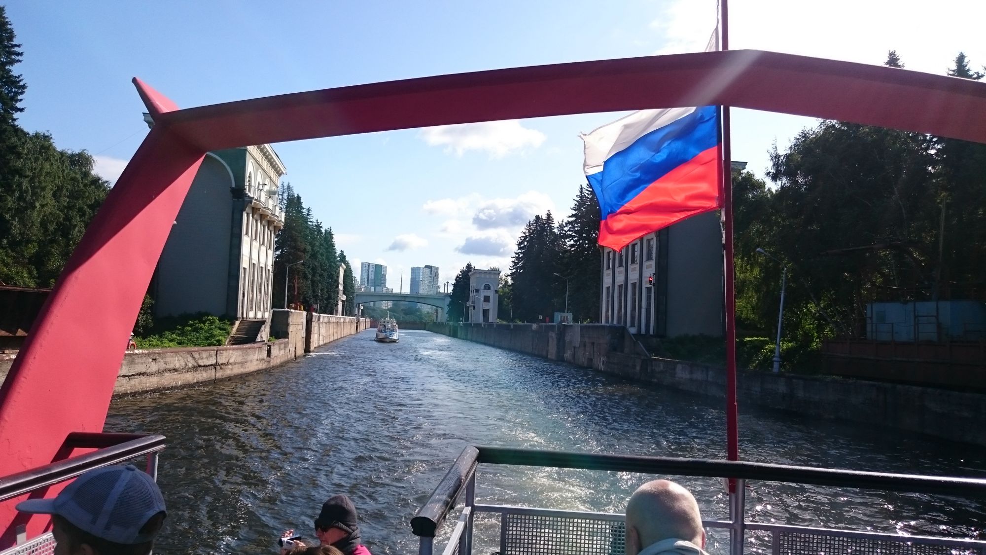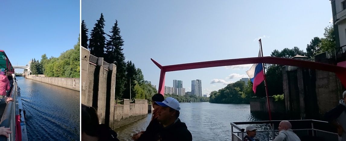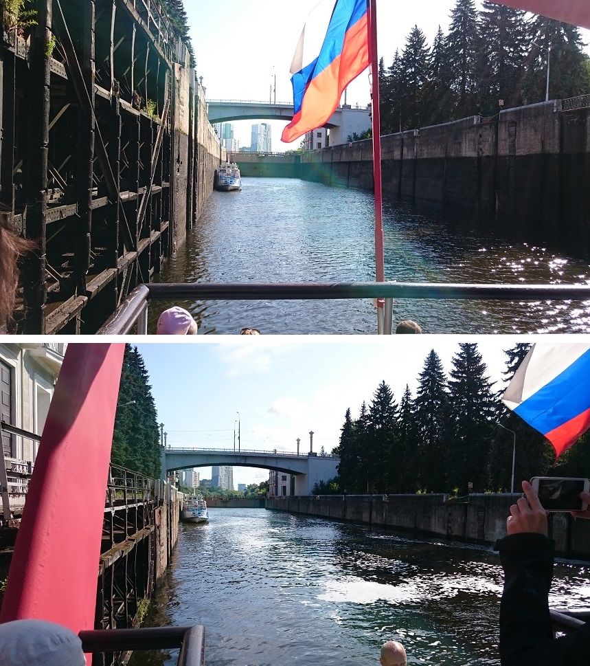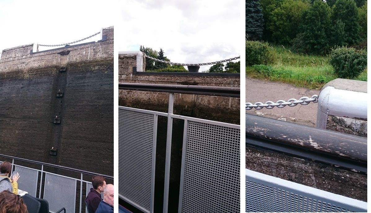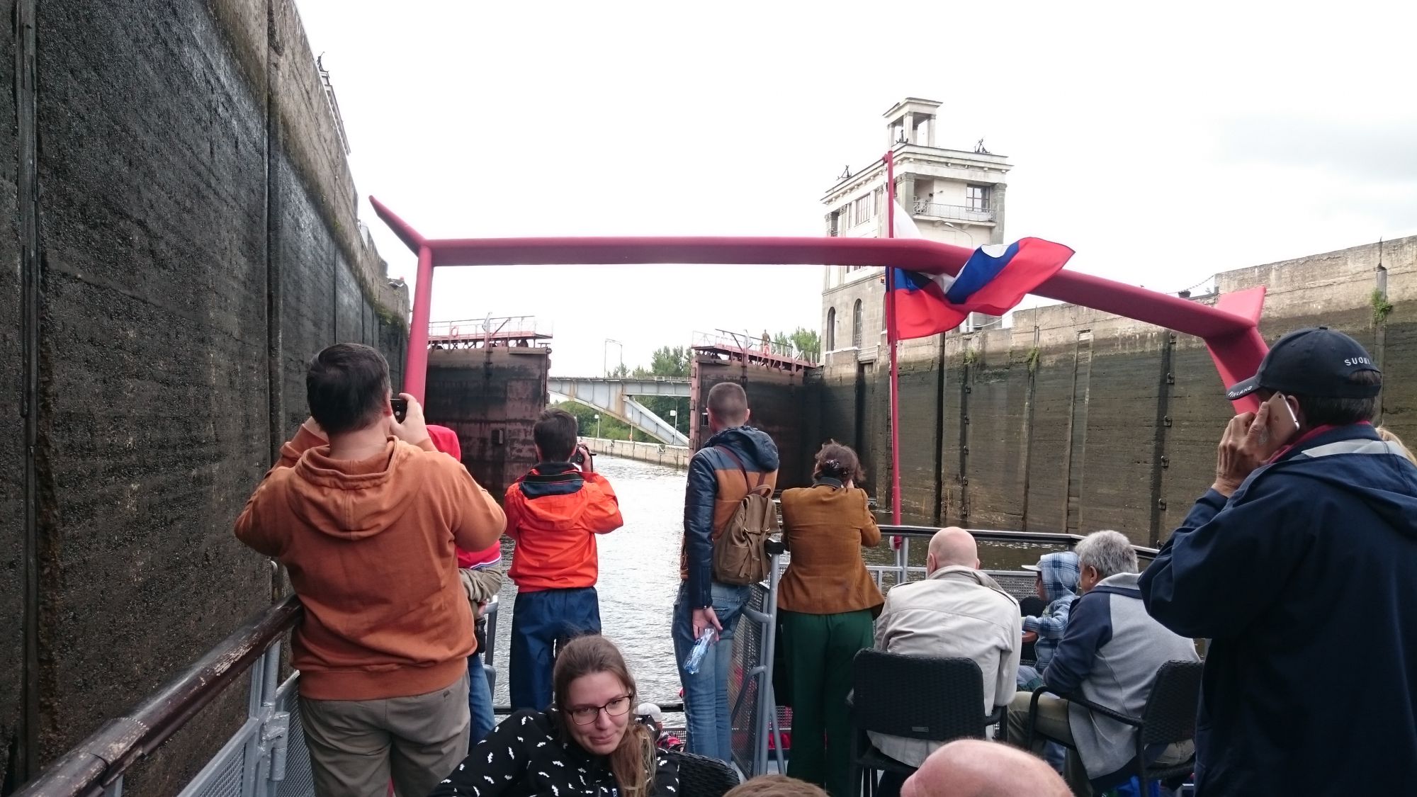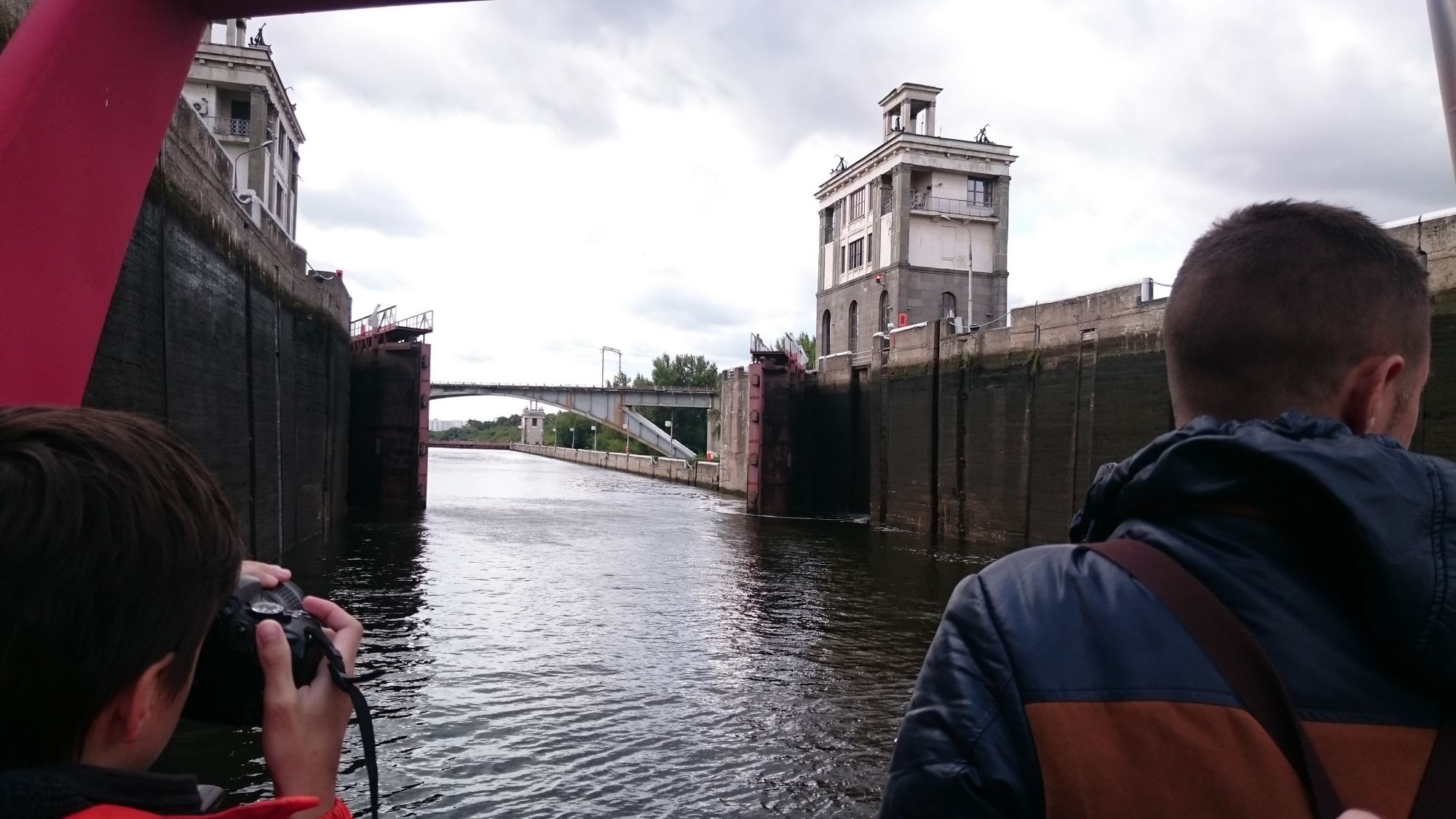 28 августа 2017 Всем привет! Хочу поделиться впечатлениями, а, возможно, кому-то помогу со свежими идеями. Если у вас уже есть подобный опыт, то читать, наверное, будет не очень интересно. Я, скорее, хотела бы "заразить" тех, кто такого еще не видел. А я – видела… Мне было неполных три года, и плыли мы на круизном лайнере по каналу имени Москвы. Мама взяла меня с собой во взрослую компанию, о чем, наверное, в пути сто раз пожалела. Ибо мой непреодолимый ужас и истерику при виде шлюзов помню до сих пор. Эта картинка всю жизнь стоит у меня перед глазами, и является первым детским воспоминанием. Причем воспоминанием ужасным. С тех пор прошла жизнь, и как-то вдруг мне стукнуло, что шлюзов я, наверное, больше не боюсь, а в сознательном возрасте их так и не увидела. Ну, а далее, сбор «команды» и в путь. Экскурсия "Московская шлюзованная система" длится 4 часа, бывает не так часто и только по хорошей погоде. Это путешествие на прогулочном катере по Московским шлюзам (Канал имени Москвы, шлюзы № 9, 8, 7). Идея возникла не вчера, но мы как-то долго раскачивались, потом начались дожди… Поэтому с нетерпением ждали, что же будет в ближайшее воскресенье. Утром проснувшись в 6 утра и увидев в окне солнышко, вопрос решился сам, и наша поездка состоялась. Маршрут таков: отправление от причала Международного выставочного центра – прибытие в Северный речной порт (Речной вокзал). Для справки: Канал имени Москвы построен в 1937 году, руками, есс-но, заключенных. Все постройки имеют уникальную архитектуру в стиле, называемом «Сталинский ампир». Как сказал гид, если хотите бежать из столицы, но для вас перекрыты все пути выхода из города (автодороги, ж/д, авиа), то не надейтесь уйти водным путем: вас не пропустят шлюзы. Москва-река в черте города заканчивается шлюзами как на севере, так и на юге. Первое сооружение, которое встретило нас после отправления – старая водонапорная башня. Сразу после нее показался вход в девятый шлюз. Вот мы вошли в него через открытые массивные красные ворота. Следом за нами следовал другой катер. Перед шлюзованием оба судна очень крепко привязали правым боком к специальным сооружениям, почти впритык к стене. Затем ворота постепенно закрылись, и шлюз начал наполняться водой. Обратите внимание на первой фотографии, стена снизу совершенно черная, эта чернота постепенно скрывается под водой. Вот весь процесс… Мы выплываем в довольно широкую по московским меркам акваторию Крылатского. И видим сооружение старой гидростанции, справа по борту новые микрорайоны, слева – скандально известный поселок речник, и странно-космический Живописный мост. Всего мы шлюзовались пять раз. Я покажу только самые интересные моменты. Вот восьмой шлюз: Очень высокий двойной подъем. Шлюз с сюрпризом. Очень интересно наблюдать, как эти огромные ворота уходят под воду. Тут наглядно видно, насколько высоко поднимается вода. Снято с одной точки. И вот, когда цепочка верхнего ограждения оказалась на уровне глаз, мы увидели «сюрприз», а именно, Волоколамский проспект, уходящий как бы «под воду». Т.е. канал проложен сверху, НАД проезжей частью. Это схематично седьмой шлюз. Он интересен тем, что над красными воротами, как только они достаточно опустились, мы увидели мостик для того, чтобы персонал шлюза мог переходить на другую сторону. А еще сверху над шлюзом есть большой пешеходный мо