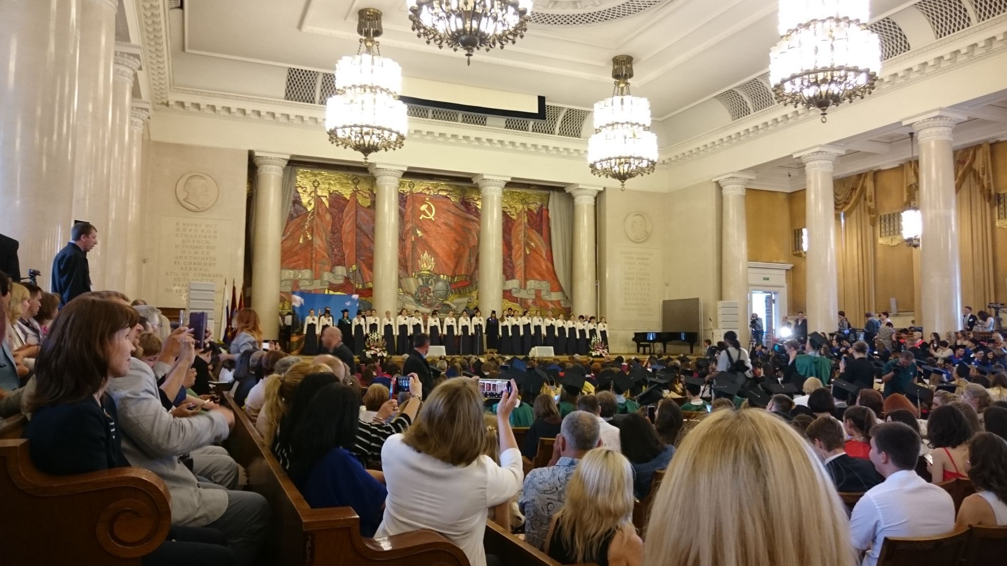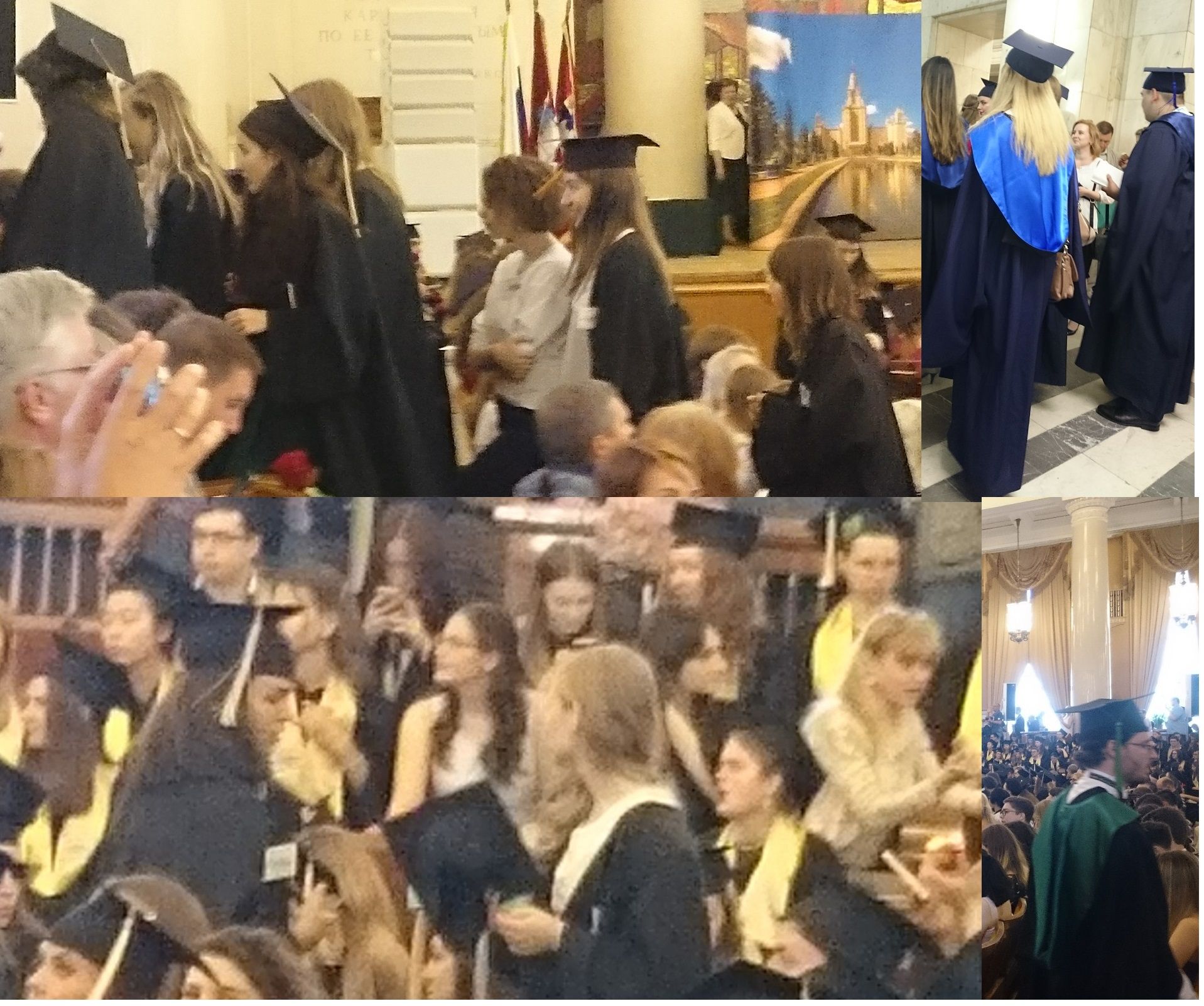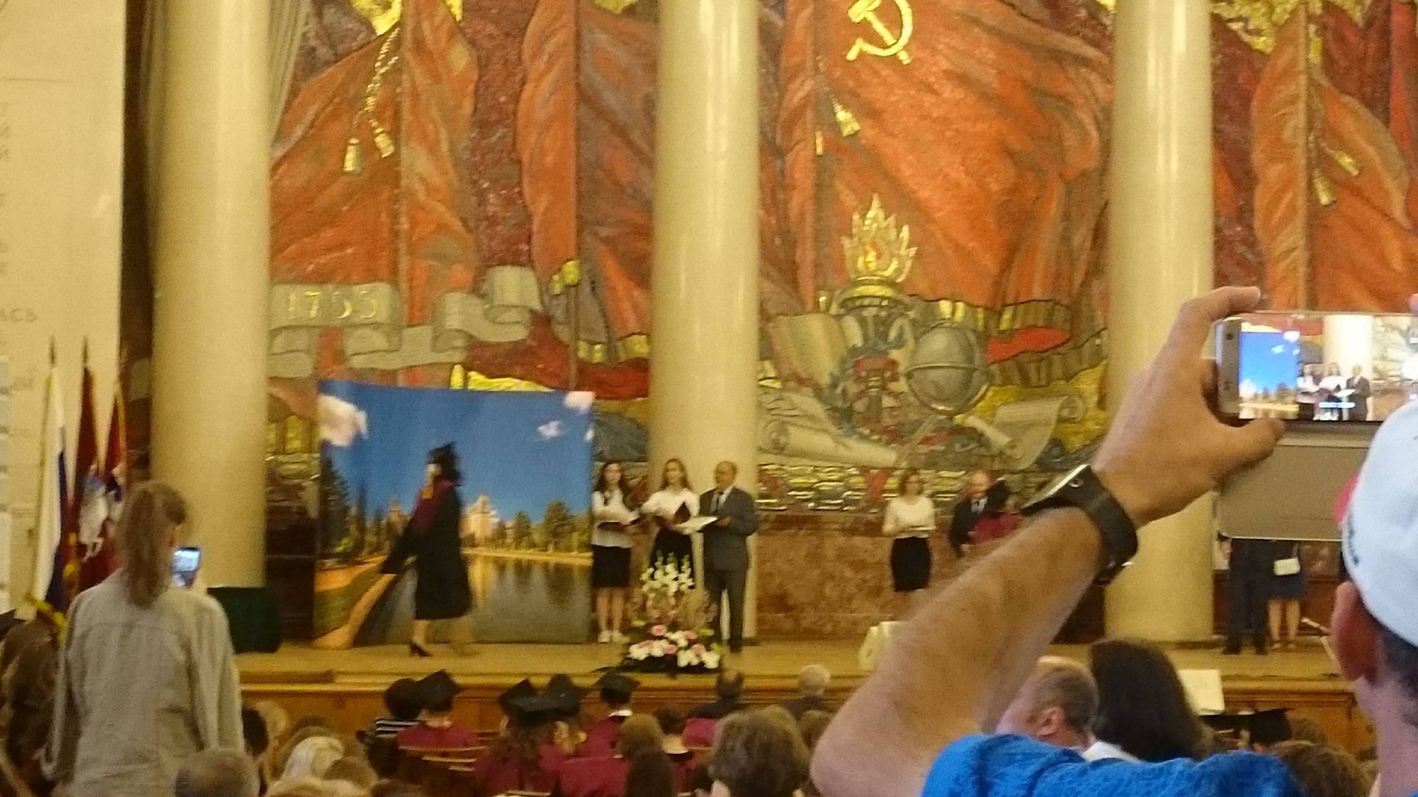 22 июня 2018 Уважаемые модераторы! Все фото в данном посте - НЕ для гаечки! Всем добрый день! Я сегодня тоже созрела на, так сказать, «отчет». Для начала, покажу розочки, которые я, все-таки, переделала (маленькую в очередной раз - по сравнению с предыдущим отчетом она несколько изменилась). Четыре раза переделанная большая роза и пять раз переделанный бутон несколько подорвали мои силы, однако пока я остановилась на этом. Из четырех оттенков фиолетового/сиреневого оставила только один, ибо как показала практика и промежуточные отшивы, он дает максимально точное «попадание» в свет и тень, а также в границы рисунка. Теперь, так сказать, «тоже путешествие». Сейчас я буду максимально политкорректна, и ни одним дурным словом не упомяну ЧМ по футболу, который так изгадил жизнь выпускникам и студентам МГУ. И еще много чего не скажу. Вчера довелось мне совершить прогулку. Недалеко, всего за 4,5 км от дома. Надо сказать, что МГУ – это все-таки город. Причем, немаленький. 42 (или 41? – никто точно не может сказать) факультет, на каждом из которых кол-во студентов сопоставимое с размерами небольшого вуза, не дает возможности вручить студентам все дипломы одновременно. Поэтому каждый факультет проводит свою церемонию, а студентов, которые получили красные дипломы, приглашают в высотку МГУ на самое торжественное вручение, которое тоже проводится в три этапа. Вчера получили «документ» 15 факультетов, в т.ч. и моя деточка. Я сделала некоторое кол-во снимков, не особо задумываясь, т.к. не собиралась их показывать. Но придя домой, исполненная впечатлениями, все-так подумала, что кому-то может быть интересно. Новая традиция – мантии выпускников. У каждого факультета свои. Не очень удачная подборка, но другого нет. Такой вот роскошный зал в духе сталинского ампира. Напомню, годы постройки 1949-1953гг. Поближе некоторая часть «алтаря», так сказать. Над сценой – мозаичное панно советской тематики. Вообще, мне понравилось то, что здесь все осталось в том виде, в котором было первоначально. Уж сделали, так сделали. Это ведь тоже история. На сцене - хор МГУ, который буквально унес меня на вершины блаженства. Я очень неровно дышу к хорам, и хорошим исполнением заставить меня прослезиться довольно легко. А тут, что называется, пробило на философию. Давно я не была здесь (бывала и раньше, и в студенчестве, и в детстве). Но вчера вдруг ощутила совершенно четкую преемственность эпох, как бы ни пафосно это звучало. Ибо очень много лет назад здесь получал диплом и мой отец. Ну вот, как-то так происходило вручение (ребенок на фото – не мой). На сцене ректор МГУ В.Садовничий. Сколько рук он пожал в этот день, представить сложно. По моим прикидкам получилось около 700, но быть может я ошибаюсь, причем в меньшую сторону. К его чести можно сказать, что в 79 лет довольно сложно выдержать столь непростой «прием» (моя ассоциация только с балом Сатаны, где у Маргариты сильно опухло колено). Дипломы вручались целых три часа с перерывами на концертные номера. Я насладилась от души, но дочь сказала, что все это отстой. Вот вам и конфликт поколений. Кстати, сидящим рядом родителям тоже всё очень понравилось. После вручения всех дипломов – торжественная клятва выпускника. Ну и венец всего – торжественное фотографирование на ступенях Альма Матер. Под звуки оркестра. Боже, как их много!!! Попыталась сделать панора