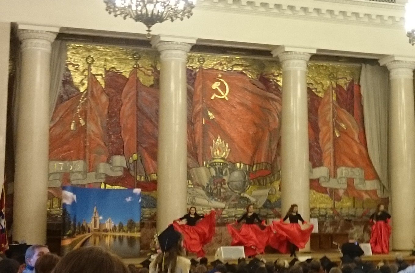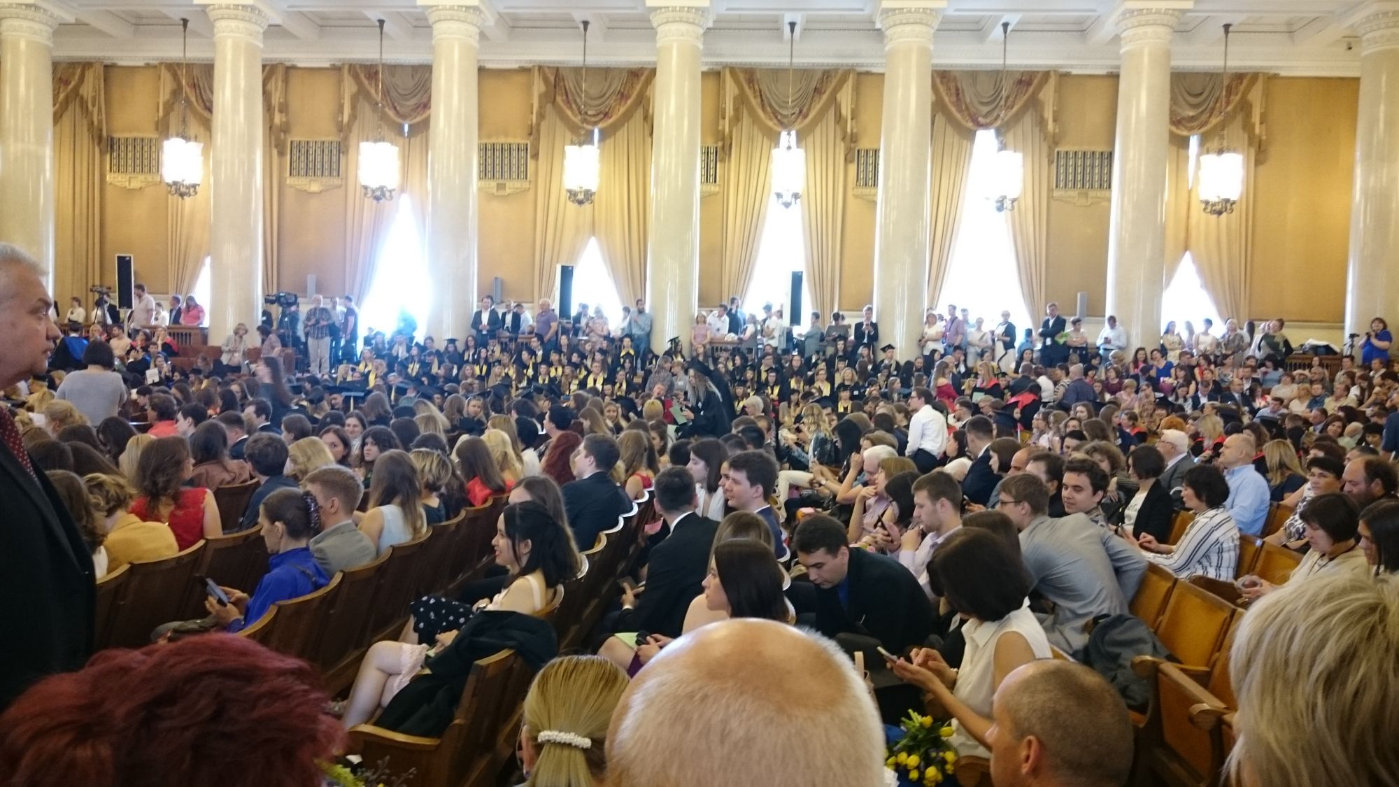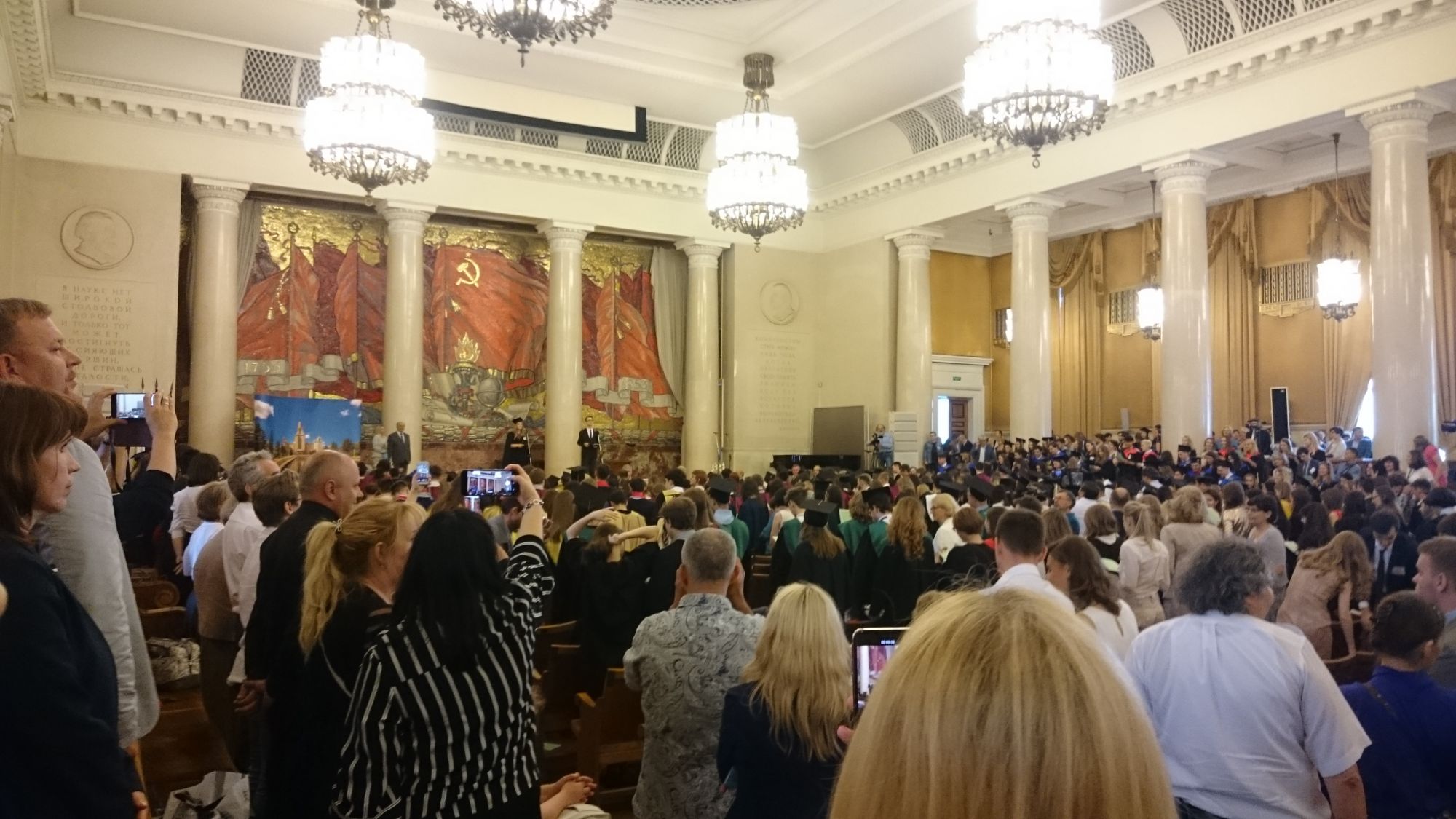 22 июня 2018 Уважаемые модераторы! Все фото в данном посте - НЕ для гаечки! Всем добрый день! Я сегодня тоже созрела на, так сказать, «отчет». Для начала, покажу розочки, которые я, все-таки, переделала (маленькую в очередной раз - по сравнению с предыдущим отчетом она несколько изменилась). Четыре раза переделанная большая роза и пять раз переделанный бутон несколько подорвали мои силы, однако пока я остановилась на этом. Из четырех оттенков фиолетового/сиреневого оставила только один, ибо как показала практика и промежуточные отшивы, он дает максимально точное «попадание» в свет и тень, а также в границы рисунка. Теперь, так сказать, «тоже путешествие». Сейчас я буду максимально политкорректна, и ни одним дурным словом не упомяну ЧМ по футболу, который так изгадил жизнь выпускникам и студентам МГУ. И еще много чего не скажу. Вчера довелось мне совершить прогулку. Недалеко, всего за 4,5 км от дома. Надо сказать, что МГУ – это все-таки город. Причем, немаленький. 42 (или 41? – никто точно не может сказать) факультет, на каждом из которых кол-во студентов сопоставимое с размерами небольшого вуза, не дает возможности вручить студентам все дипломы одновременно. Поэтому каждый факультет проводит свою церемонию, а студентов, которые получили красные дипломы, приглашают в высотку МГУ на самое торжественное вручение, которое тоже проводится в три этапа. Вчера получили «документ» 15 факультетов, в т.ч. и моя деточка. Я сделала некоторое кол-во снимков, не особо задумываясь, т.к. не собиралась их показывать. Но придя домой, исполненная впечатлениями, все-так подумала, что кому-то может быть интересно. Новая традиция – мантии выпускников. У каждого факультета свои. Не очень удачная подборка, но другого нет. Такой вот роскошный зал в духе сталинского ампира. Напомню, годы постройки 1949-1953гг. Поближе некоторая часть «алтаря», так сказать. Над сценой – мозаичное панно советской тематики. Вообще, мне понравилось то, что здесь все осталось в том виде, в котором было первоначально. Уж сделали, так сделали. Это ведь тоже история. На сцене - хор МГУ, который буквально унес меня на вершины блаженства. Я очень неровно дышу к хорам, и хорошим исполнением заставить меня прослезиться довольно легко. А тут, что называется, пробило на философию. Давно я не была здесь (бывала и раньше, и в студенчестве, и в детстве). Но вчера вдруг ощутила совершенно четкую преемственность эпох, как бы ни пафосно это звучало. Ибо очень много лет назад здесь получал диплом и мой отец. Ну вот, как-то так происходило вручение (ребенок на фото – не мой). На сцене ректор МГУ В.Садовничий. Сколько рук он пожал в этот день, представить сложно. По моим прикидкам получилось около 700, но быть может я ошибаюсь, причем в меньшую сторону. К его чести можно сказать, что в 79 лет довольно сложно выдержать столь непростой «прием» (моя ассоциация только с балом Сатаны, где у Маргариты сильно опухло колено). Дипломы вручались целых три часа с перерывами на концертные номера. Я насладилась от души, но дочь сказала, что все это отстой. Вот вам и конфликт поколений. Кстати, сидящим рядом родителям тоже всё очень понравилось. После вручения всех дипломов – торжественная клятва выпускника. Ну и венец всего – торжественное фотографирование на ступенях Альма Матер. Под звуки оркестра. Боже, как их много!!! Попыталась сделать панора