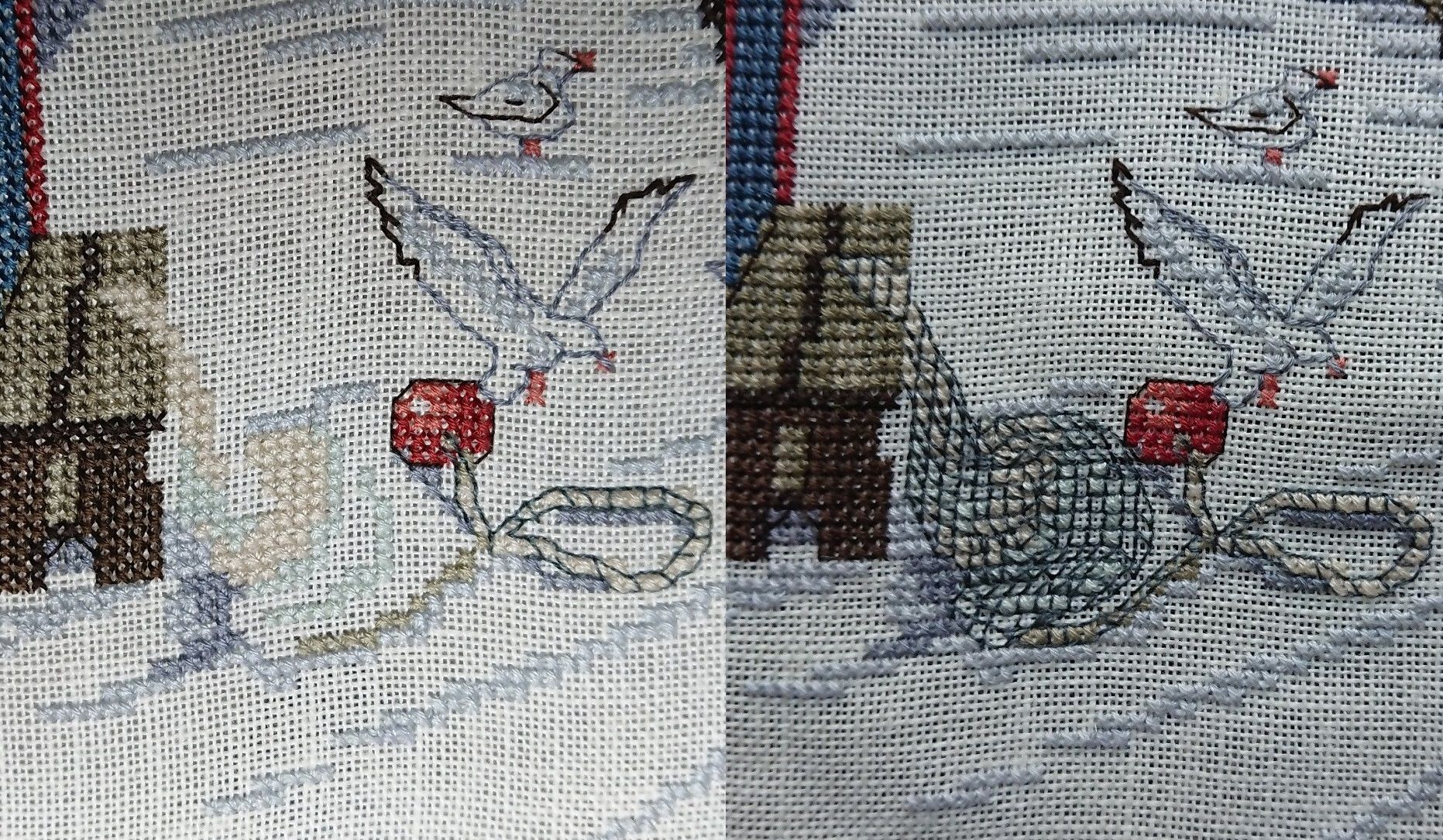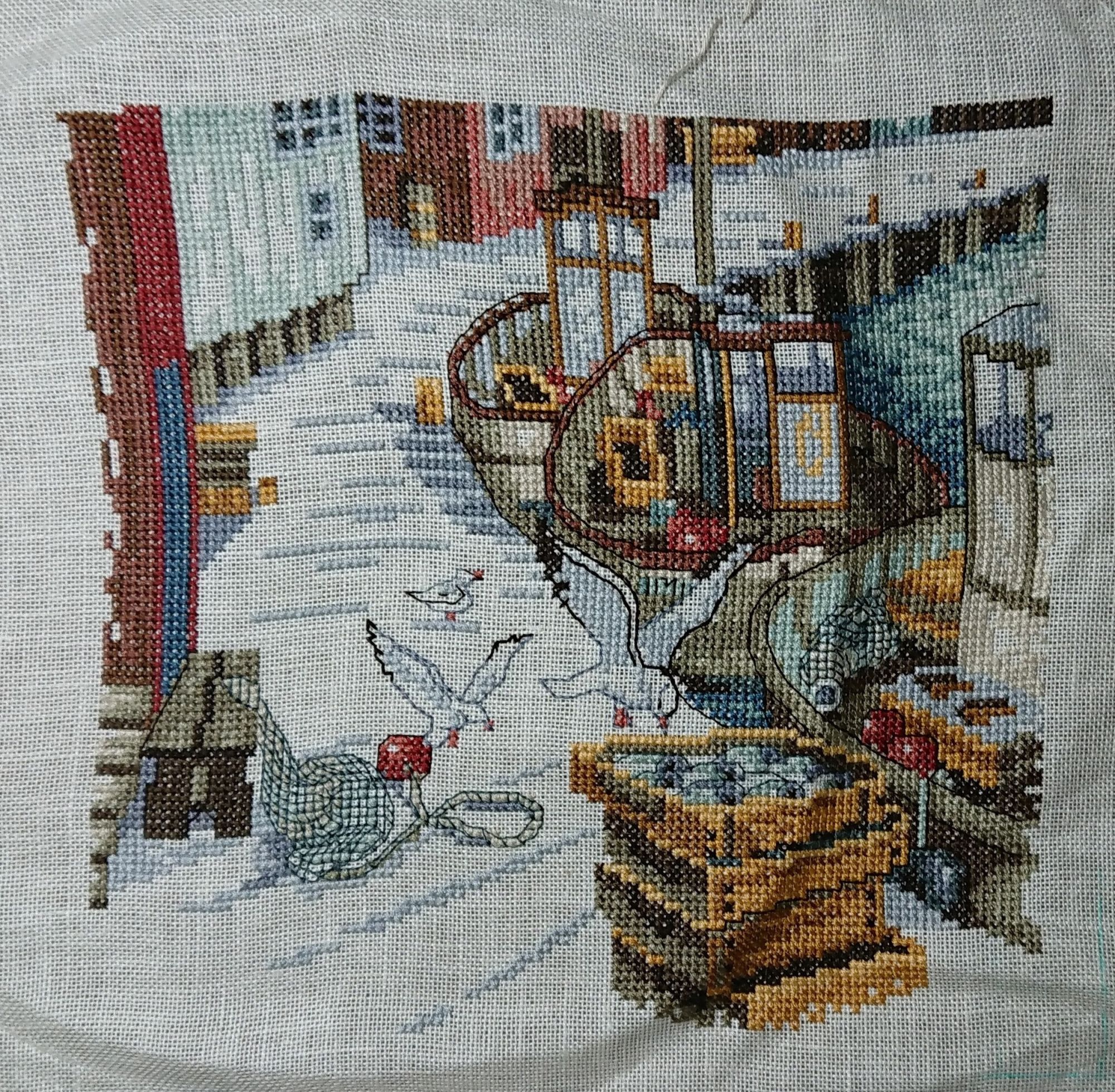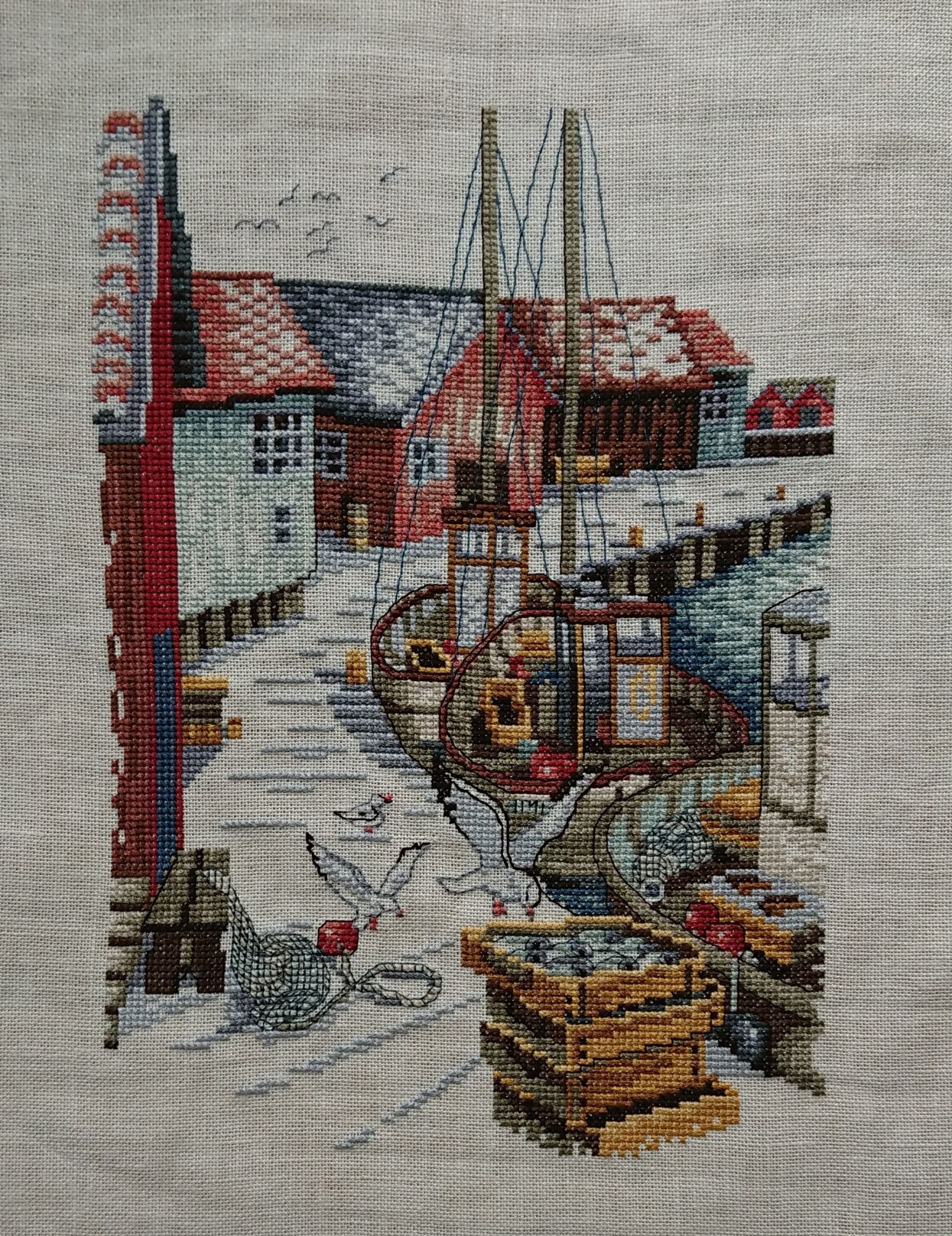 31 августа 2019 Всем добрый день! Открываю «гаечку» и тут же зеленю. Не знаю, насколько, по мнению кое-кого, выдержана интрига (специально это не задумывалось), однако вывожу «на сцену» нашего маленького сообщества нового для меня и для гостей моей темы производителя из Дании с непроизносимым для нас именем Oehlenschläger. Я его прочитала как Ойленшлягер, но мне подсказали, что судя по всему, это должно читаться как Эленшлегер. Однако, в сети я нашла и более простое его сокращение: ООЕ (на обложке наборов он значится как О. Oehlenschläger). Буду называть его именно так. Итак, дизайн OEHLENSCHLAGER арт. 73-67512 с прозаическим названием «Гавань». Так он поименован в наших интернет-магазинах, хотя у производителя не называется никак. Эта картинка специально для Татуси, чтобы завести «обложку» гаечки. Хочу подробно рассказать о комплектации, полагаю, в данном случае это должно быть интересно. Набор укомплектован нитками ДМС и потрясающе классным льном цвета экру 28 каунта (почему-то на сайтах наших инет-магазинов заявлен 25-й, хотя на обложке набора есть вся необходимая информация). Схема ч/б, хорошо читаемая, достаточно крупная, на двух листах А3. Подробнее о схеме и о том, насколько «оригинальный» набор. Из отзывов тех, кто побывал весной на ФР, я прочитала, что права на распространение продукции этой фирмы в нашей стране имеет фирма Гела, но на обложке с русским переводом стоит совсем другой поставщик: ООО Глобал Транс. Собственно, дело не в названии, а в схеме. Она явно не отпечатана в типографии, а имеет вид отсканированных листов А3, причем соединенных из листов более мелких, А4. Видны стыки, и буквально на долю миллиметра сдвиг сетки схемы на этих местах. Шить сие не мешает, но «осадочек» и сомнения остаются. Тем не менее, готовая работа полностью соответствует заявленной картинке, а сама комплектация набора отличная, ДМС настоящий (проверила, номера даны в ключе), лён настолько хорош, что впервые в жизни захотелось иметь такого еще и побольше (не знаю, чье производство: цвайгарт и ДМС имеют отличительные метки на кромке, а здесь кромка без опознавательных знаков. И похоже, что не Пермин, ибо на нём я шила, и никакого удовольствия от этого не получила). В общем, по моему единственному опыту, набор вполне достойный, и производителя включаю в число моих любимых. Ну и собственно, "Гавань" от начала и до конца: Немного фрагментов. На первом умилительно бодрящие пучеглазые селедки. На скрине непонятно, что лежит в ящиках. Я думала, просто сети. Но когда в процессе отшива на меня вдруг взглянуло множество глазок, стало очень весело. И чуть подробное, чудеса бэка. Я бы сказала «лабиринты» бэка. Вот вроде бы, чего проще, строчи себе по клеточкам! Но просидела над этой рыболовной сетью целый вечер. Елена71, OlkaY, Полли и 37 других сказали спасибо Поделиться сообщением Ссылка на сообщение