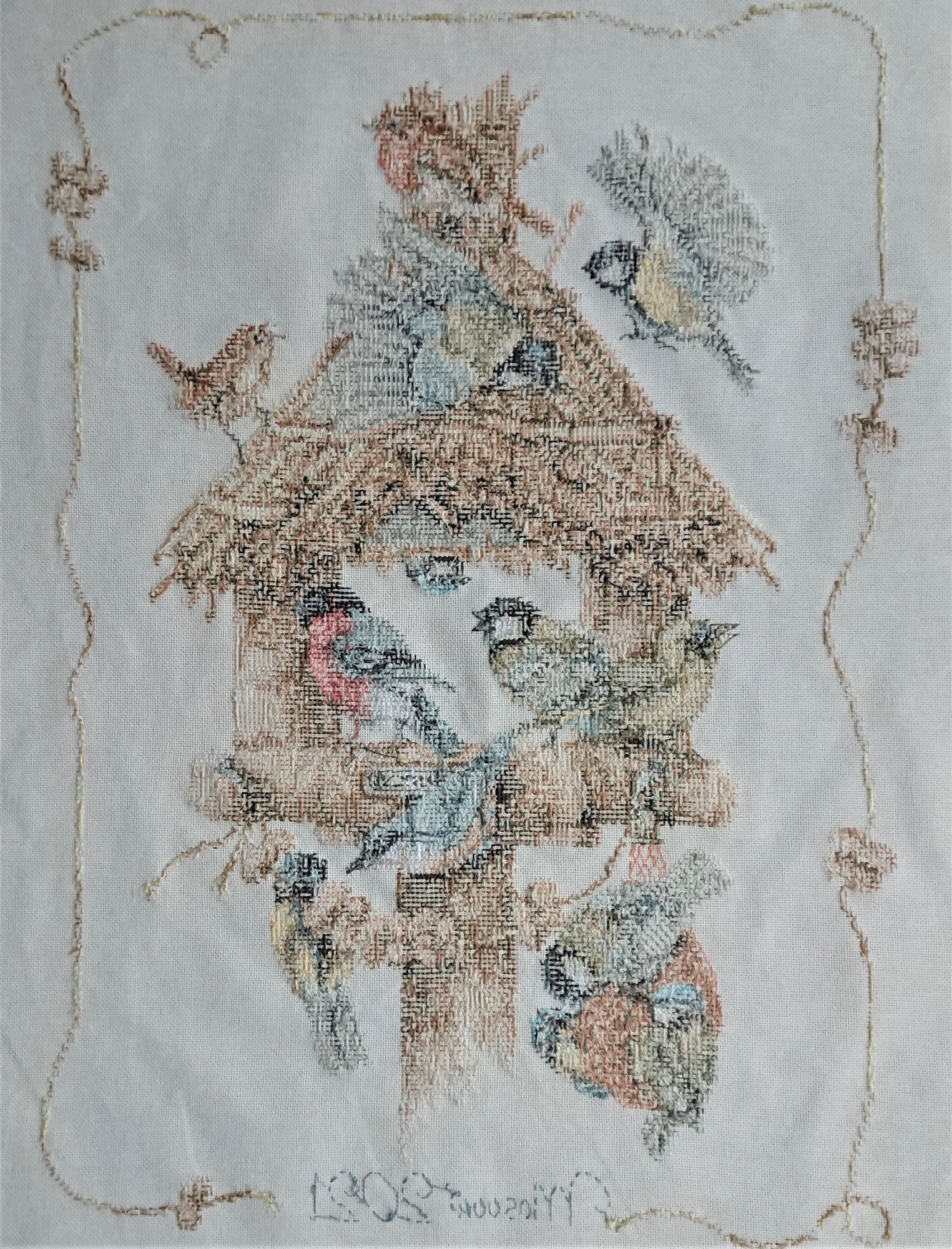31 декабря 2021 Всем привет! В последнюю ночь года я таки "добила" свою 14-ю работу (в 2021 г), поставив тем самым личный рекорд. Птички завершены, гаечку можно зеленить! В последний момент решился вопрос с надписью внизу. Я изначально не хотела дублировать имя художницы дважды. Марджолин Бастин достойна, чтобы увековечить ее имя. Но, все-таки, мне кажется, дизайнер схемы переборщил. Любое живописное произведение содержит имя автора где-то скромно, в уголке. Но на этом дизайне оно проставлено дважды: на "бирке" скворечника, и по центру нижней части рамки. Все время пока шила, терзалась мыслью, как убрать подпись, чтобы не испортить гармоничность рамки. Но буквально с последним крестиком, еще раз взглянув на имя Марджолин, заглавная буква М подсказала мне решение. Оно простое и лаконичное. И довольно символичное, ибо я завершила рисунок в последнюю ночь уходящего года. А второе изменение, которое собиралась сделать - как-то обозначить "четырнадцатую" птичку, делать не стала. Пусть будет тринадцать. С моей любовью к цифрам я нашла достаточно добрых личных аналогов с этим числом, так что буду вполне спокойно обладать тринадцатью птичками. Что хочется еще сказать. Дизайн замечательный, проработка прекрасная, шить было одно удовольствие, хотя тяжело далась крыша и рамка. Получила огромное удовольствие. И окончательный итог по комплектации: Один цвет отсутствовал. Двух цветов не хватило. Два цвета - осталось по пол-ниточки. И при этом обвинить меня в расточительном расходе ниток нельзя: Татуся, ionastorm, Iharu и 21 других сказали спасибо Поделиться сообщением Ссылка на сообщение