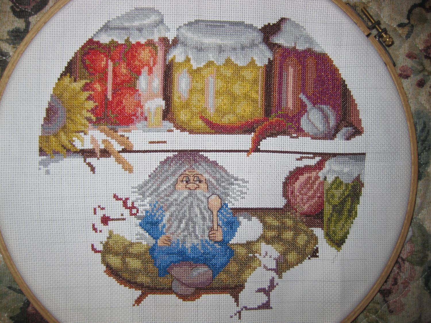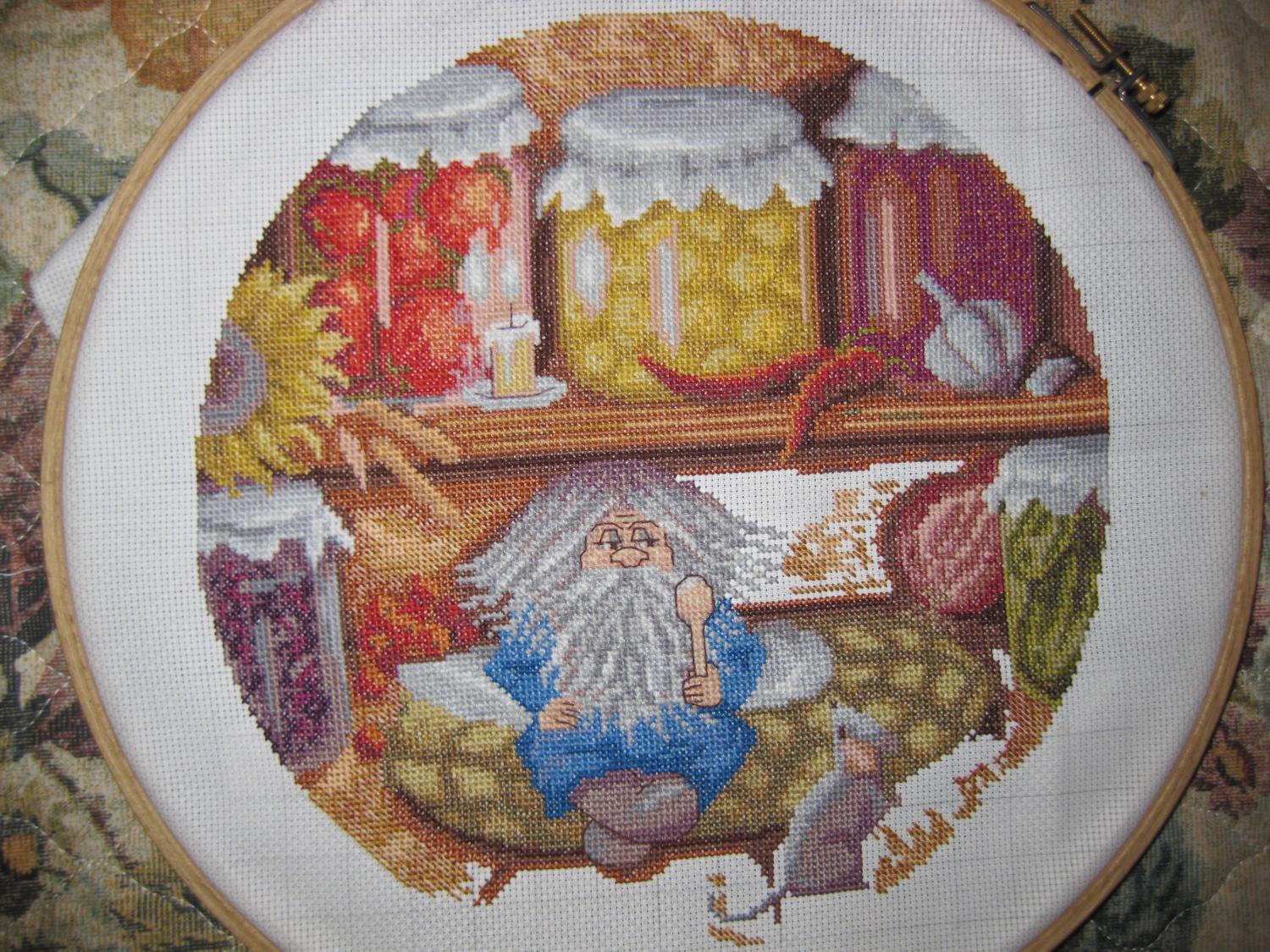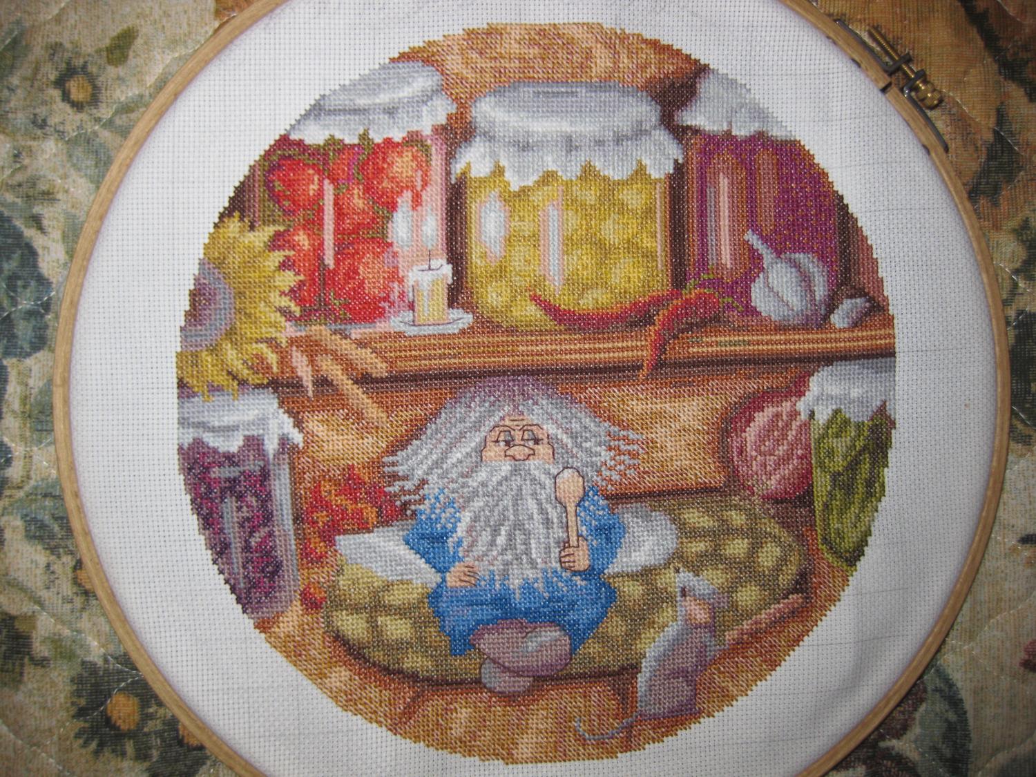 20 апреля 2012 Ну вот, за месяц со времени публикации последней фотки Домовенок вылупился целиком. В светлый пасхальный день. Есть в этом какое-то предзнаменование. Шился он ровно полтора месяца – с 29 февраля по 15 апреля. Несмотря на возникшие проблемы, море удовольствия. Ведь каждый элемент на картинке настолько родной и домашний. Каждому новому вышитому предмету радовались всей семьей. Очень теплая картинка, светлая по энергетике работа. Ну а теперь процесс. После баночки с желтыми ягодками, которые настолько мастерски были выписаны дизайнером, что текли слюнки, я приступила к своей задумке, которая была в голове изначально. А именно, наполнить баночку с красно-розовыми разводами по своему усмотрению. А именно - помидорами. И вот что получилось. Не откажу себе в удовольствие показать процесс заполнения банки. За исключением лаптя (о котором было и еще будет отдельно), помидорная эпопея вылилась дней в десять. Сначала пыталась приспособить готовые схемы. «Помидорки» от ДМС были первой попыткой. Но хотя они подошли по размеру, стиль картинки был не выдержан, пришлось с ними расстаться. Отказалась также и от схем с просторов интернета. Так что помидоры в банке – моя собственная разработка. Понимаю, что нет предела совершенству, но уж как вышло. После помидорок за несколько часов «вырос» чеснок «от производителя», настолько отлично проработанный и вкусный, что я бегом побежала готовить обед, ибо эфемерный чесночный дух заполонил окрестности. За чесноком последовали банка с огурцами и луковица, которые изначально предполагала несколько видоизменить, что и сделала. С луковицей возилась целое воскресенье. По-моему, она получилась более похожа на луковичку, нежели на миниатюрный футбольный мячик, предложенный по схеме. Верхняя баночка с вареньем (я предполагаю, что с малиновым) нарисовалась очень быстро и заняла свое достойное место. И вот наступила очередь лаптя. Его я боялась. Напомню, на предыдущей странице есть фото страшного темно-коричневого полураспущенного лаптя с нитками, которые были в фабричной комплектации. Лапоть был распорот, и я все оттягивала момент приступать к нему вновь. Пришлось посетить «ниточный» магазин. Диалог в магазине: Продавец: какие Вам номера? Я: Мне не номера, мне надо «на лапоть» подобрать… Короче, вот что получилось. Я довольна. Отдельно про мышку. Она такая славненькая, с розовыми ушками. Во всяком случае, об этом заявляла картинка на обложке. В наборе же нитки «для ушка» были вложены шоколадно-коричневые. Пришлось опять пороть и шить заново по-своему. Вообще, процесс «порки» занял место не многим меньше, чем процесс созидания. Последнее изменение я внесла в нижнюю баночку с синей жижей. Долго опрашивала домочадцев и коллег по работе, что такое съедобное можно сложить в банку, чтобы она была такой невыносимо васильково-синей. Ответов не было ни одного. Поскольку травиться не захотелось, то по совету дочки-старшеклассницы заменила васильковый на черничный. И вот вам варенье из черники (а может, смородины). Вполне съедобно. На а деревянное покрытие вышилось быстро и просто. Проработка дерева я считаю, у дизайнера на высоте. Вот мой домовеночек без бэка, и с бэком. По-своему обшила крышки банок. Не стала «обводить» желтый цветок.Там так красиво играют краски, что не хотелось портить эти переливы. А вот на лапте 
