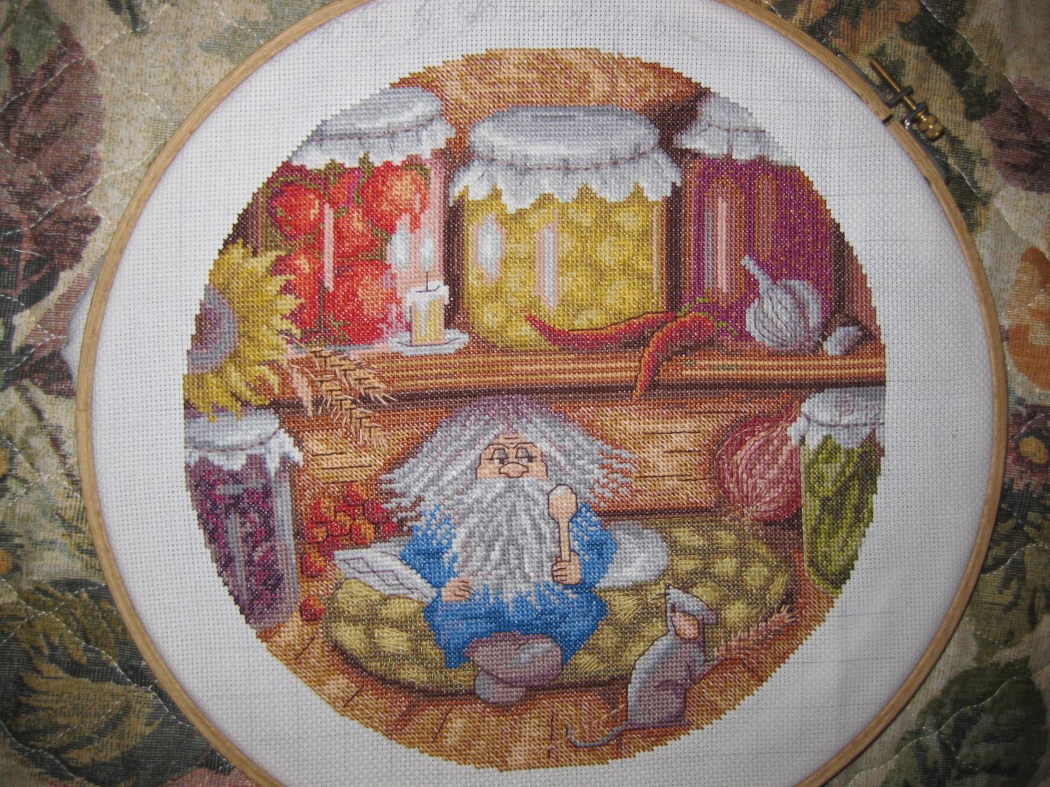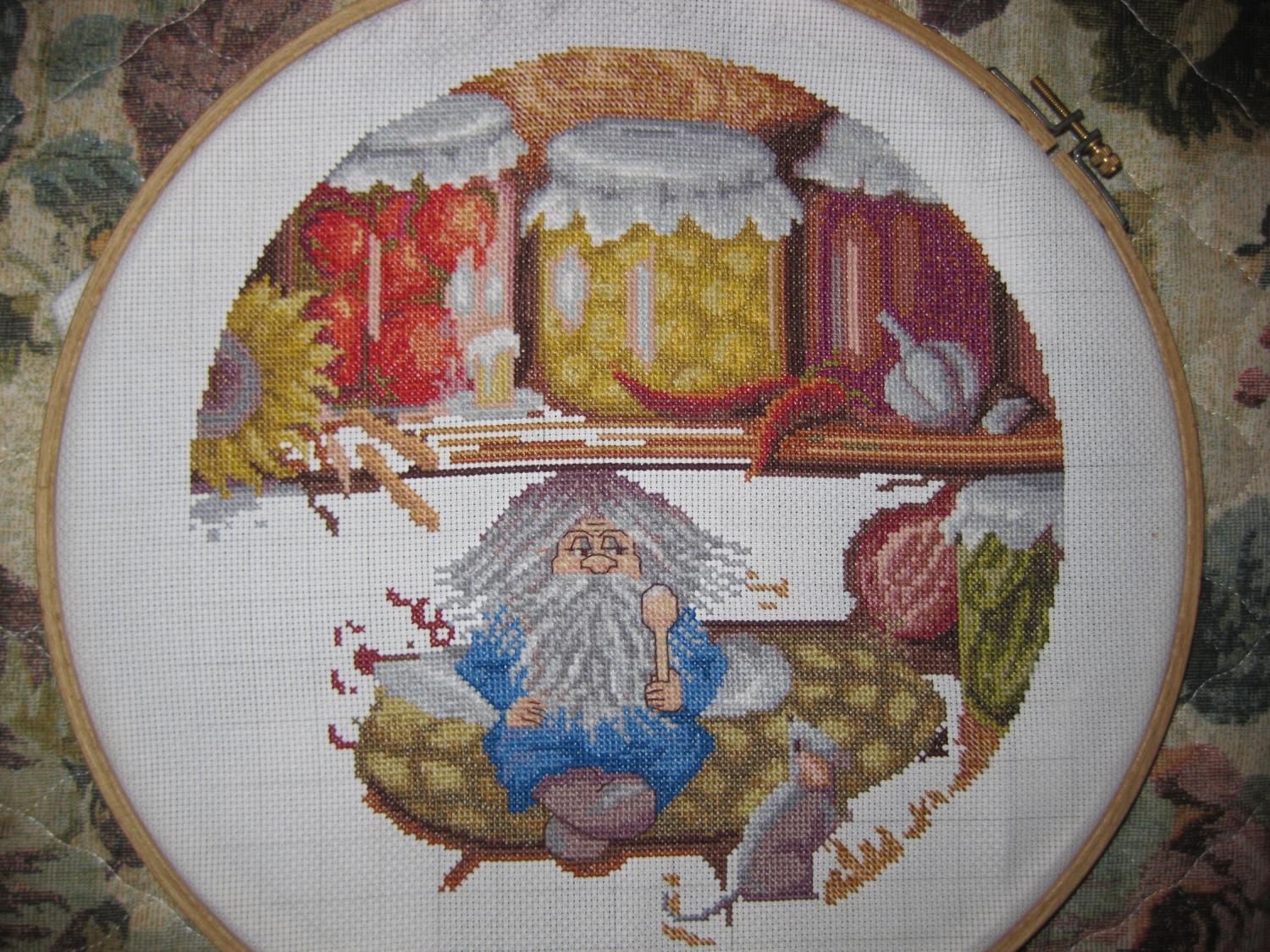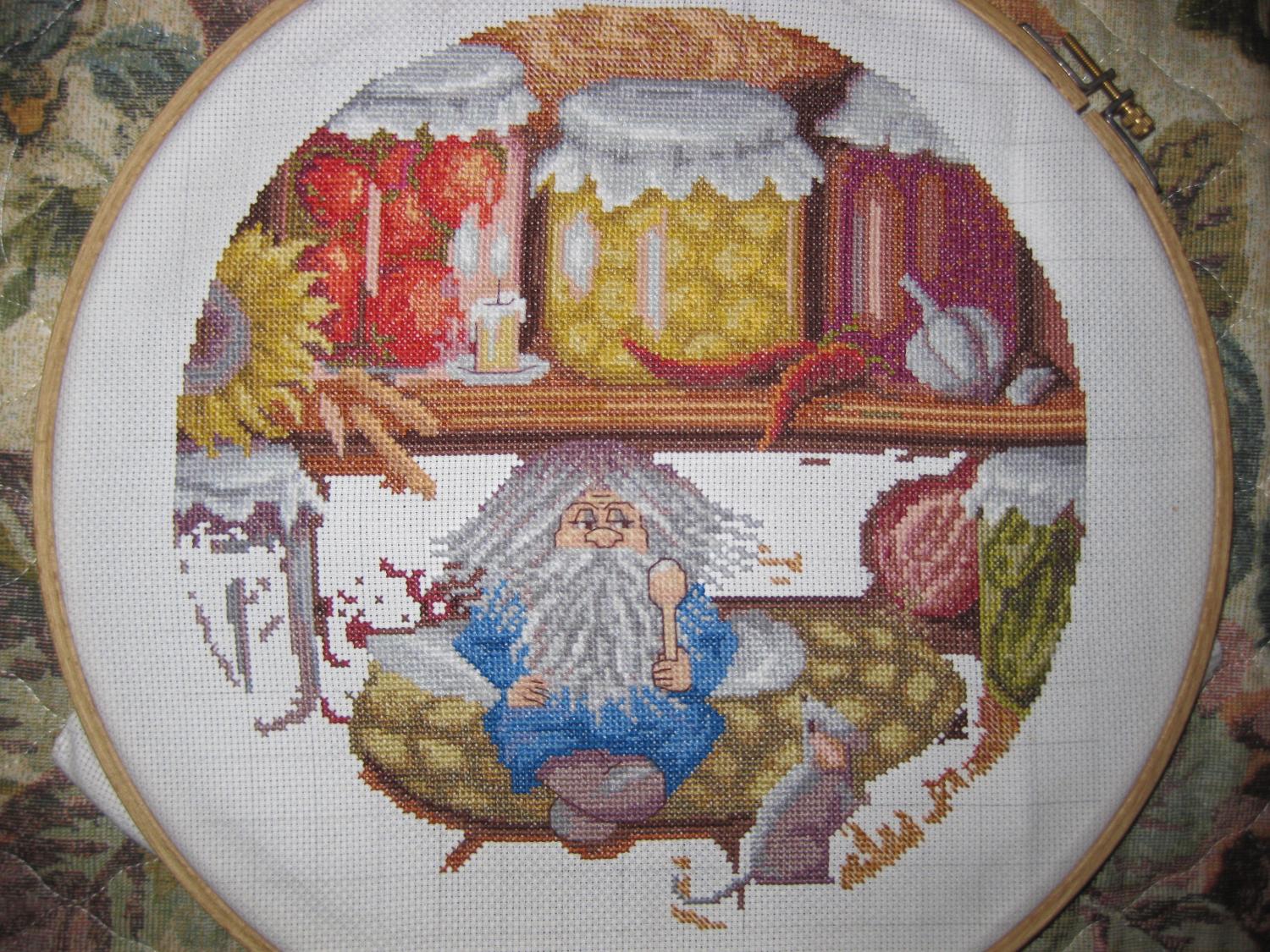 20 апреля 2012 Ну вот, за месяц со времени публикации последней фотки Домовенок вылупился целиком. В светлый пасхальный день. Есть в этом какое-то предзнаменование. Шился он ровно полтора месяца – с 29 февраля по 15 апреля. Несмотря на возникшие проблемы, море удовольствия. Ведь каждый элемент на картинке настолько родной и домашний. Каждому новому вышитому предмету радовались всей семьей. Очень теплая картинка, светлая по энергетике работа. Ну а теперь процесс. После баночки с желтыми ягодками, которые настолько мастерски были выписаны дизайнером, что текли слюнки, я приступила к своей задумке, которая была в голове изначально. А именно, наполнить баночку с красно-розовыми разводами по своему усмотрению. А именно - помидорами. И вот что получилось. Не откажу себе в удовольствие показать процесс заполнения банки. За исключением лаптя (о котором было и еще будет отдельно), помидорная эпопея вылилась дней в десять. Сначала пыталась приспособить готовые схемы. «Помидорки» от ДМС были первой попыткой. Но хотя они подошли по размеру, стиль картинки был не выдержан, пришлось с ними расстаться. Отказалась также и от схем с просторов интернета. Так что помидоры в банке – моя собственная разработка. Понимаю, что нет предела совершенству, но уж как вышло. После помидорок за несколько часов «вырос» чеснок «от производителя», настолько отлично проработанный и вкусный, что я бегом побежала готовить обед, ибо эфемерный чесночный дух заполонил окрестности. За чесноком последовали банка с огурцами и луковица, которые изначально предполагала несколько видоизменить, что и сделала. С луковицей возилась целое воскресенье. По-моему, она получилась более похожа на луковичку, нежели на миниатюрный футбольный мячик, предложенный по схеме. Верхняя баночка с вареньем (я предполагаю, что с малиновым) нарисовалась очень быстро и заняла свое достойное место. И вот наступила очередь лаптя. Его я боялась. Напомню, на предыдущей странице есть фото страшного темно-коричневого полураспущенного лаптя с нитками, которые были в фабричной комплектации. Лапоть был распорот, и я все оттягивала момент приступать к нему вновь. Пришлось посетить «ниточный» магазин. Диалог в магазине: Продавец: какие Вам номера? Я: Мне не номера, мне надо «на лапоть» подобрать… Короче, вот что получилось. Я довольна. Отдельно про мышку. Она такая славненькая, с розовыми ушками. Во всяком случае, об этом заявляла картинка на обложке. В наборе же нитки «для ушка» были вложены шоколадно-коричневые. Пришлось опять пороть и шить заново по-своему. Вообще, процесс «порки» занял место не многим меньше, чем процесс созидания. Последнее изменение я внесла в нижнюю баночку с синей жижей. Долго опрашивала домочадцев и коллег по работе, что такое съедобное можно сложить в банку, чтобы она была такой невыносимо васильково-синей. Ответов не было ни одного. Поскольку травиться не захотелось, то по совету дочки-старшеклассницы заменила васильковый на черничный. И вот вам варенье из черники (а может, смородины). Вполне съедобно. На а деревянное покрытие вышилось быстро и просто. Проработка дерева я считаю, у дизайнера на высоте. Вот мой домовеночек без бэка, и с бэком. По-своему обшила крышки банок. Не стала «обводить» желтый цветок.Там так красиво играют краски, что не хотелось портить эти переливы. А вот на лапте 