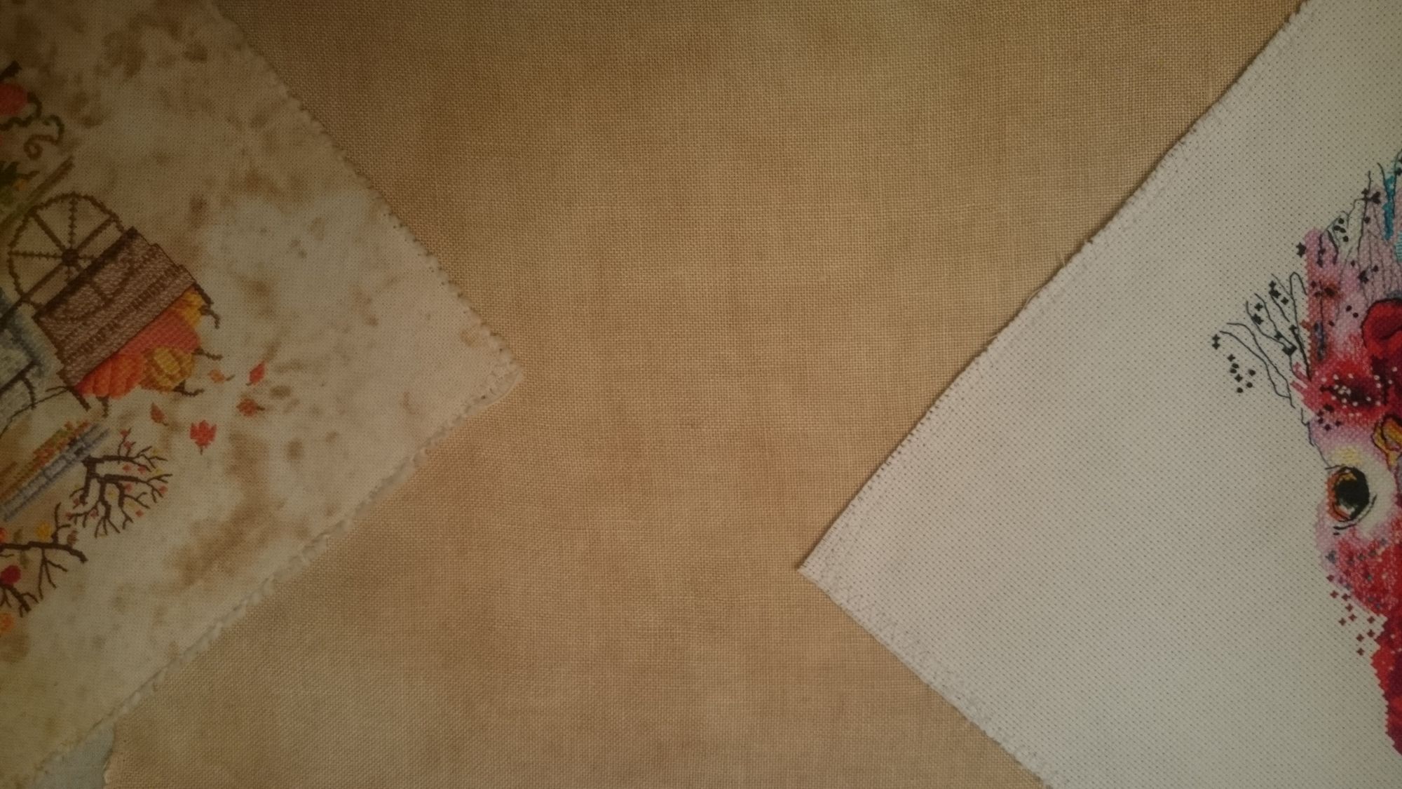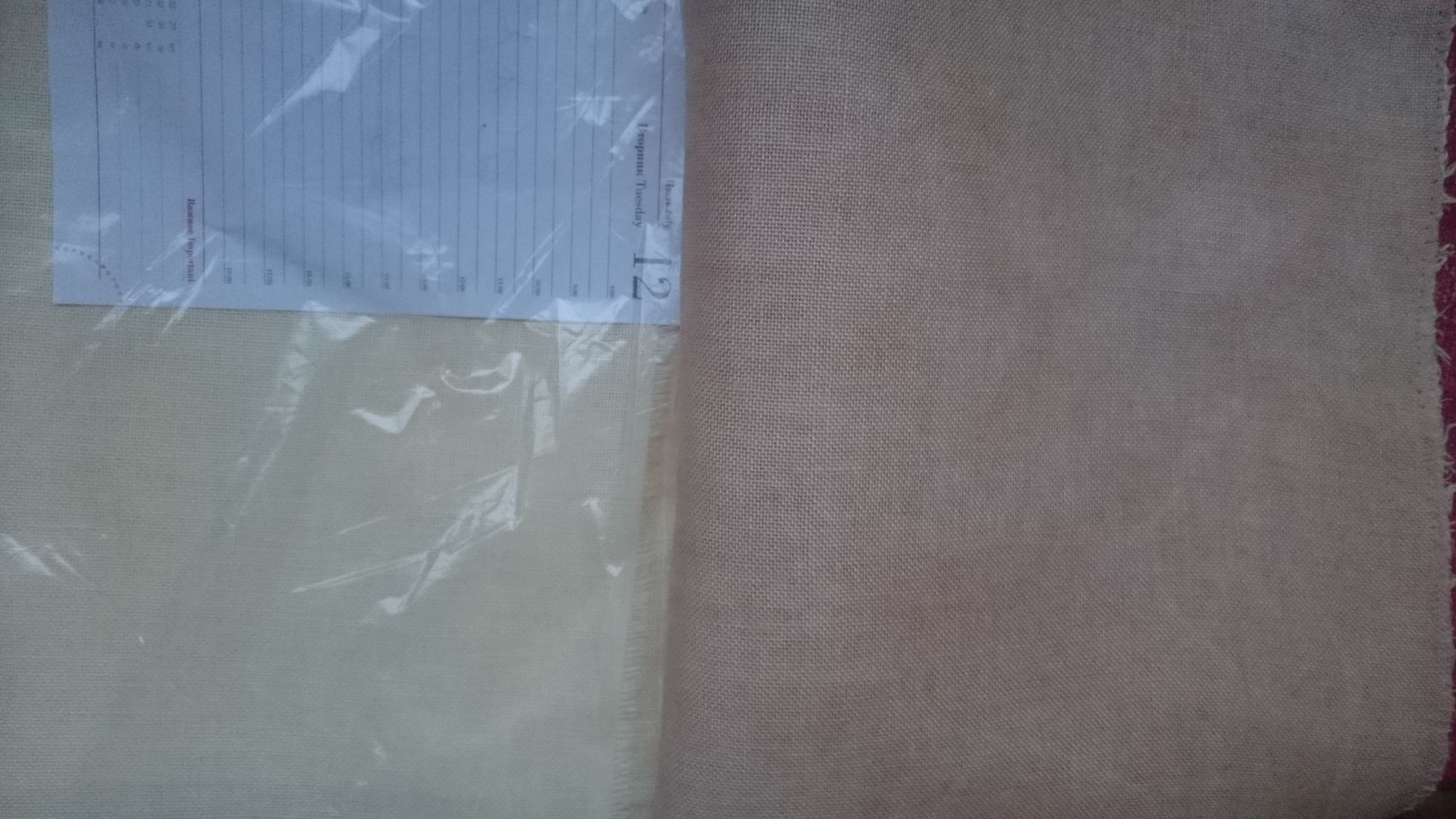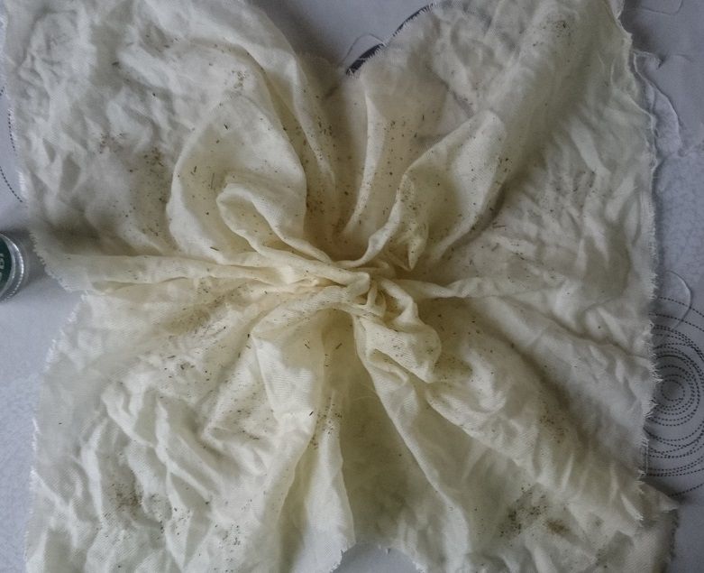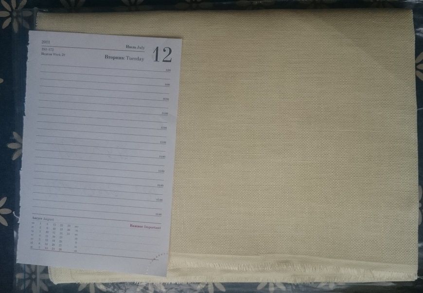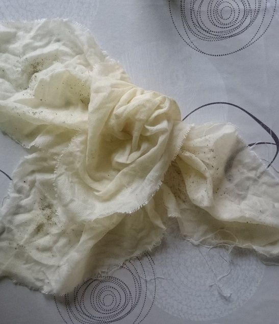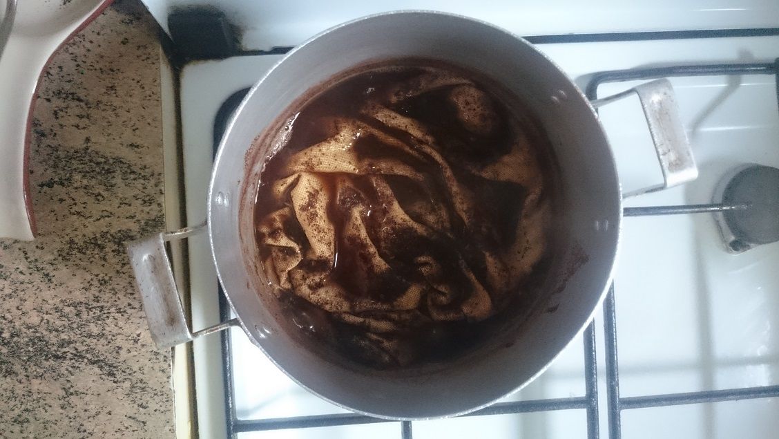 26 ноября 2016 Я собралась с мыслями и начинаю "апупею", прям-таки "роман" о том, как можно испоганить или не испоганить кусочек ткани разными красителями. Сегодня на встрече я рассказала девочкам лишь крошечную часть этой истории. Возможно, мой опыт, и удачный, и "не очень", кому-то пригодится. Начну с эпилога. Ребенок, периодически присутствующий при моем эксперименте (он длился более суток), и увидев результат, сказал следующее: "Мам, ты не возражаешь, если я напишу в твиттере, что мама для того, чтобы отбелить лён, запихнула его в крепкий кофе?". Теперь предыстория. Уже делилась с вами, что хочу вышить салфетку со всякими новогодними "штучками". Сначала собиралась купить подходящую ткань в Стежке, но, к сожалению, при великолепном качестве ткани, мне не подошла расцветка. Да и "думки" о лишних затратах сильно портили настроение. Тогда я полезла в свои закрома.... и.... барбанная дробь... нашла кусок ДМС-овского льна 28 каунта. Вся беда заключалась в том, что лён желтый (с лимонным отливом). Вот такой. Здесь и далее признаю, что цветовая гамма на фото сильно отличается от натуральной. И хотя в этом повествовании очень важно показать цвет, к сожалению, тут уже ничего не могу сделать. Снимала в разное время, при разном освещении и в разных помещениях. А потому воображение в данном случае - наш лучший друг. Желтая салфетка не входила в мои планы, и решила я для начала ее осветлить. Развела сильно концентрированный раствор "Белизны", Результат через два часа не оставил себя ждать. Он оказался "никаким": Я побоялась держать более ткань в щелочном растворе, и вспомнила про свои эксперименты с покраской ткани с помощью чая и красного перца, которые в прошлом году прошли весьма успешно. Но если уж красить, то больше хотелось получить цвет натурального льна, т.е. сероватый оттенок. И, почитав интернет, поняла, что на этот раз мне больше пригодится кофе. Далее буду писать не то, что прочитала в интернете, а то, что адаптировала и применила собственноручно. Важное замечание. Ткань перед "опущением в кипяток" обязательно необходимо намочить. Так пишут и подчеркивают абсолютно все, кто пытался красить ткань. Варим концентрированный раствор из двух стаканов воды и двух столовых ложек молотого кофе. Поскольку я хотела получить неоднородную фактуру с "вкраплениями", то воспользовалась своим прошлогодним опытом, и решила насыпать немного сухого "красящего" вещества непосредственно на мокрую ткань перед кипячением. В прошлом году этим веществом был чай. В этом году, из-за того. что хотелось получить холодный оттенок, взяла нечто зеленое, что нашлось в доме. В доме нашлись сухие листочки под названием "Прованские травы". После сей процедуры ткань необходимо завернуть. Т.к. в прошлом году проделывала это неоднократно, опытным путем поняла, что для того, чтобы было относительно симметрично прокрашено, заворачивать надо тоже симметрично. Для себя я придумала вот такой способ. (4 фото поэтапно) Рулончик надо было перевязать веревкой, но я забыла об этом. Вспомнила только на следующем этапе (об этом позже). Далее ткань поместила в кастрюльку с кипящим "бульончиком" из кофе. Варить ее, как говорят, нужно минут 15, но у меня эта красотень варилась около получаса с практически нулевым результатом. Судите сами, как была желтенькая, так и осталась: Далее тряпочка была тщательно выполоскана. П