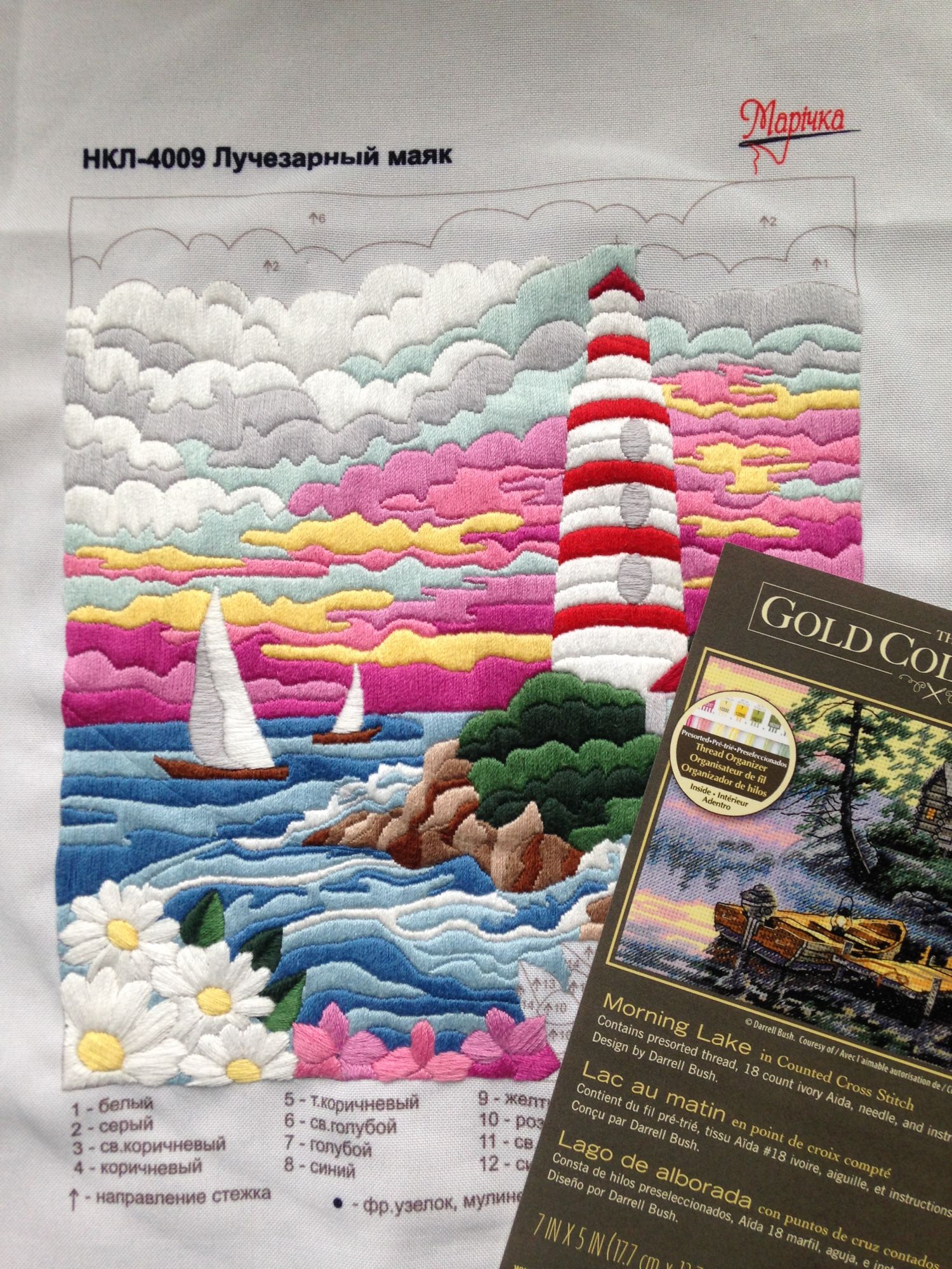 28 октября 2017 И ещё плюс три дня. Всего 25, по моей первой оценке должна была все дошить ))) Но у меня закончились белые нитки и точно не хватает серых и светло-бирюзовых. Наверное сегодня ещё пошью цветочки и уточню по розовым. Мне обещали прислать. Но не уверена, что пришлют так как они по-моему подумали, что я из Украины. Тем не менее маяк с подросшими облаками. И фото не для гаечки. Родилась у меня шальная мысль, что маяк мой сочетается с димовским домиком. Причём дизайны одинаковой ширины и висеть могут друг на другом. Точнее так - есть простенок, где точно будет висеть маяк. Вот размышляю про пару. Вопрос: как думаете сочетаются? Есть мысль, что если таки да, то пока буду ждать нитки, можно этот домик вышить. sakineva, snowflake, Одуванчик и 2 других сказали спасибо Поделиться сообщением Ссылка на сообщение