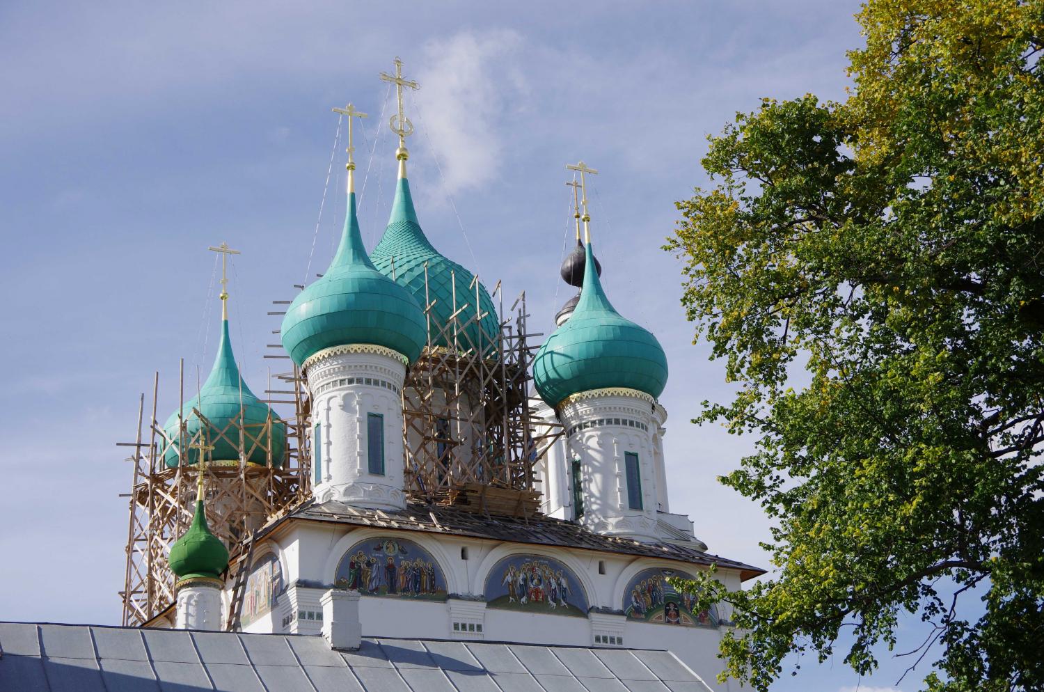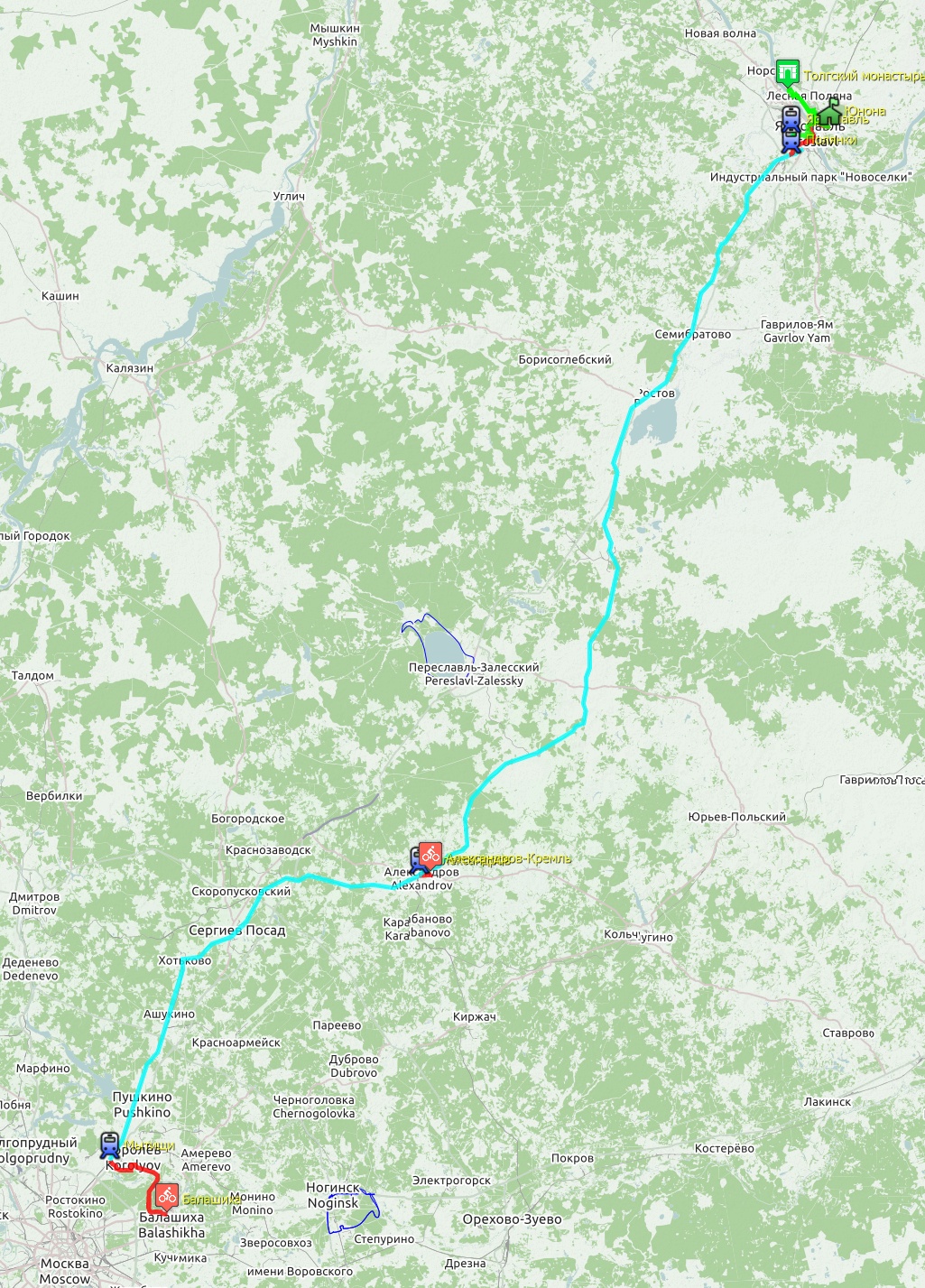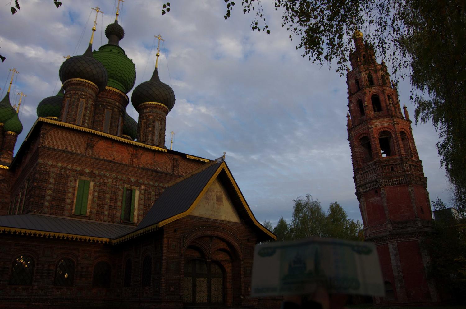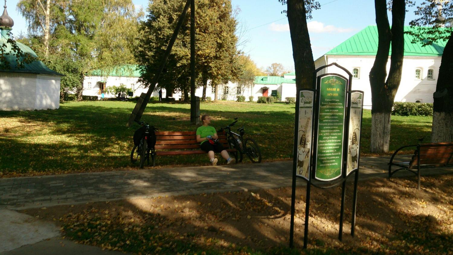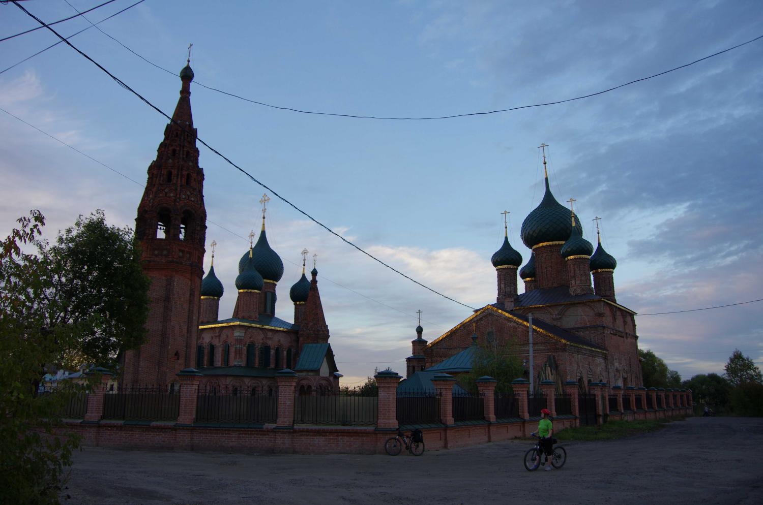21 сентября 2015 112,8 км за 2 дня. Доехали от дома до Мытищ на великах, сели на электричку до Александрова. В Александрове доехали на великах до кремля, погуляли там (было время до электрички), сели на электричку до Ярославля. В Ярославле вылезли на станции Полянки )))) Оттуда огородами пробирались к Юноне. Зато посмотрели удивительно красивую Петропавловскую церковь (все фото позже). Глянули церковь с 1000 рублевой купюры, церковь Иоанна Златоуста с удивительной красоты изразцовым окном. Прокатились по стрелке, посмотрели на поющие фонтаны. Закат был великолепен, но фото нет, т.к. лень было доставать фотик. Переехали через реку и уже двинули в гости. Но мы же не можем как нормальные человеки ехать по асфальту. Поэтому мы ехали через бор. А дорога - мягкий песок... Ехать в некоторых местах было невозможно... И под конец я еще и навернулась (синячищщщщи.... ууу...). Но Юнона встретила как родных. Еще раз низкий поклон за встречу. Сидели до 3-х утра (Женька уснул гораздо раньше), разбирали ниточки, болтали "за жисть"...))))) Встали с утра на удивление легко. Плотненько так позавтракали.))))Поболтали пару часиков и поехали. Толгский монастырь, куча достопримечательностей... Ну и в обратный путь тем же маршрутом. Только вот в Мытищи приехали уже затемно. Но ничего - фонари нас выручили.))) Мини отчет я уже выкладывала. Теперь немного иллюстраций. )))) Как я уже писала, заехали в Александровский кремль, т.к. между электричками была разница в час. В кремле очень все ухожено, все покрашено, вокруг клумбы и газоны. Внутрь по выставкам в эту поездку никуда не заходили. Погода, кстати, порадовала. Золотая осень, тепло и хорошо. Даже на обратном пути нас нигде дождь не застал, хотя, судя по дороге, кое-где он был.))) Это Александровский кремль. В электричке удалось сесть и даже повышивать.))) Билеты были куплены до Ярославля главного. Но Женька глянул на карту в навигаторе и предложил вылезти в Полянках, т.к. там по пути было пару интересных мест, которые хотелось посмотреть. В Полянках на дорогу вылезали по какой-то тропиночке (все нормальные люди ушли через мост совсем в другую сторону))). Заехали в Петропавловский парк. Там встретили полуразрушенное здание Голландской светлицы. А потом из-за деревьев показался огромный шпиль, который был похож на огромную ракету. Очень хотелось побыстрее увидеть что же там такое. Оказалось, что это церковь Петра и Павла. Здание, правда, совсем не характерное для православного христианства... Стоит эта церковь рядом с довольно живописным прудом. Фотик доставали нечасто, т.к. это целая эпопея (фотик большой и ехал в багажнике). Поэтому следующая остановка у нас была около церкви, которая изображена на 1000-рублевой купюре.)))) Очень красиво! Куча изразцов (а я их просто обожаю!), интересная архитектура и самой церкви и колокольни, очень интересные врата (сфоткали только одни, но все были разные и все красивы по-своему). рядом проходила фотосессия девы в розовом.))) А вот это фото просто мне очень нравится. Следующая остановка - церковь Иоанна Златоуста. Опять интересная архитектура, чудесное местоположение и окно, украшеное изразцами!!! Это нечто! На самом деле, почему-то тут вспомнился восток. Дальше мы проехали мимо кремля, зацепив взглядом Ярослава, проехали мимо часовенки-мемориальчика с 1000рублевой купюры.))) Прокатились по Стрелке, полюбовались на поющие фонт