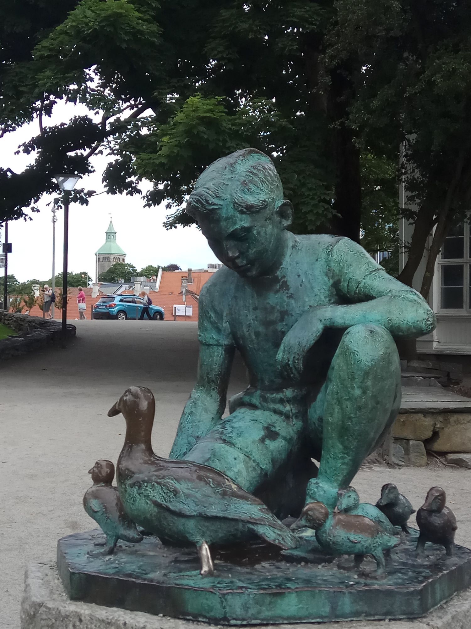 24 августа 2017 Ставангер. Скажу сразу, что я ничего не читала про города, в которых мы были, заранее. Поэтому гуляли мы с чистой головой, просто наслаждаясь городом, разглядывая детали и не ища (почти не ища) каких-то конкретных достопримечательностей. Машину мы поставили на парковку на пристани, оплатив 2 часа. И решили, что гуляем в пределах этого времени кто где хочет. Сначала мы пошли посмотреть собор. Уже дома я прочитала, что, вроде как был один король у них, который хотел развестись с женой. Все священники ему отказали, кроме одного. Но поставил условие, что разведет, если тот построит в Ставангере красивый собор. Собор был построен. Половина здания сделана в романском стиле, а половина в готическом. Разные стили бросаются в глаза сразу, по крайней мере, я это ещё там заметила. Смотрится прикольно. Внутрь попасть было нельзя, но из какого-то бокового выхода служитель выпустил пожилую пару. Оба еле шли, но так трогательно помогали друг другу, что я не удержалась и сфотографировала их себе на память. Эти вековые деревья растут рядом с собором И там же находится странная скульптура. Такие же мы видели потом ещё в нескольких местах. Например, на школьном дворе среди качелей... Вызывает недоумение и гнетет своим видом. Но, может для них это что-то значит. Женька очень хотел попасть на воинское кладбище, на котором есть могила русских воинов. Кладбище находилось в паре км, времени было не много, поэтому пошли туда довольно шустрым шагом, чтобы потом успеть захватить ещё кусочек старого города. Кладбище ухожено, разбито на сектора. На плане мы нашли место, куда нам идти. По пути не нашли ни одного цветочного магазина, поэтому просто почтили память. Заодно посмотрели на не туристический, а обычный жилой квартал Ставангера. Домики разные - разной степени ухоженности чтоли... Один можно на обложку журнала выставлять (цветочки, фигурки в окнах, кружевные занавесочки и какая-нибудь красивая висюлька на двери), а какие-то совсем не ухоженные (краска облупливается, забор покосился, а то и рухнул, какие-то засохшие цветы в страшных горшках)... В общем, как и в наших деревнях - у кого-то ухоженный палисадник, а у кого-то бурьян выше крыши. Ну и немного туристических кварталов и уличного искусства. А вот так выглядят жилые кварталы, по которым мы шли, с высоты смотровой у водонапорной башни Эту вывеску обойти стороной не могла))) Ну и ещё кадрик и по коням!) ПыСы Уже дома прочитала, что Ставангер в своё время сильно приподнялся на изготовлении рыбных консервов. Было очень много мелких частных заводиков. Сейчас есть даже музей рыбных консервов или как-то так называется. А ещё - делали краску. Самая дорогая была белая - в нее добавляли цинк. Поэтому зажиточные горожане красили дома именно в белый цвет (а мы все гадали - почему у них хоз. постройки по всей Норвегии красные, а вот жилые дома почти все в белый покрашены). А потом этот цвет как-то закрепили как обязательный на уровне городских постановлений. А потом одному парикмахеру захотелось выделить свою контору среди остальных и он очень долго согласовывал возможность перекрасить здание в яркий цвет. В итоге согласовали. И, вроде как, есть яркая улочка, где дома совсем не белые, с розовые, фиолетовые и т.д. Ну, кто готовится к поездке, те знают, где это найти))) После того, как изготовление рыбных консервов отошло на задний п