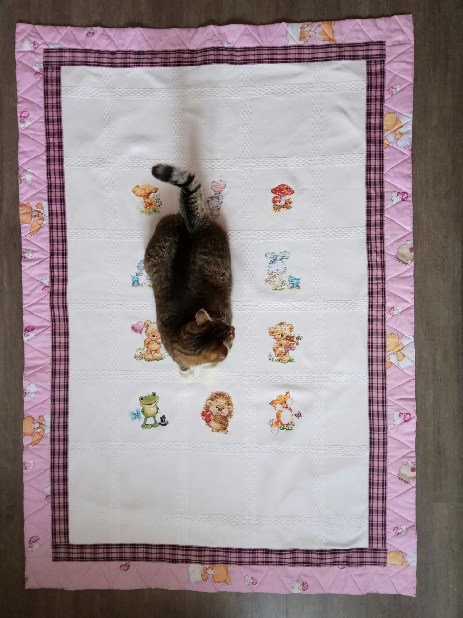 11 сентября 2017 Я пришла похвастать! Может помнит кто, что я для племянницы вышила пледик?) Я купила к нему ткань на задник, ленту и положила. Шью я только по вдохновению, а оно не шло. И вот в свой последний приезд к нам Оля @OlkaY забрала у меня все комплектующие со словами, что уже даже ей стыдно, что пледик не сшит. )))) И сшила. Причем очень быстро. В эту субботу, когда мы приехали к Оле в гости, нам торжественно вручили эту красоту! Я в полном восторге! А теперь к этому восторгу присоединяются мама и бабушка племяшки.))) Долго разглядывали и вынесли вердикт - такую красоту надо на стену вешать, т.к. пользоваться жалко.))) Но, надеюсь, что всё-таки плед будет использоваться по прямому назначению. И вот итог! Гаечку можно зеленить. Оля, низкий поклон за твои золотые руки! Остался у меня один племянник, не одарённый. В мишках продвигаюсь, но, на мой взгляд, медленно) безумно нравится тёмно-синий бисер на носу - он сливается с черным, но при свете даёт синим блики. Ну и покажу как умеют отдыхать котики))) А тут - привез меня к гладильной доске, прыгнул наверх, развалился и требовал гладить))) Правильно - доска-то гладильная!) apanjul, mamatata, Okeaн и 37 других сказали спасибо Поделиться сообщением Ссылка на сообщение