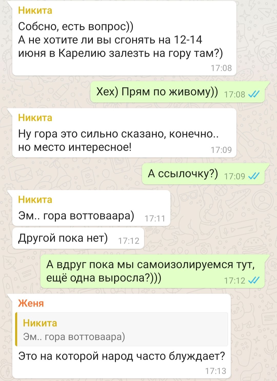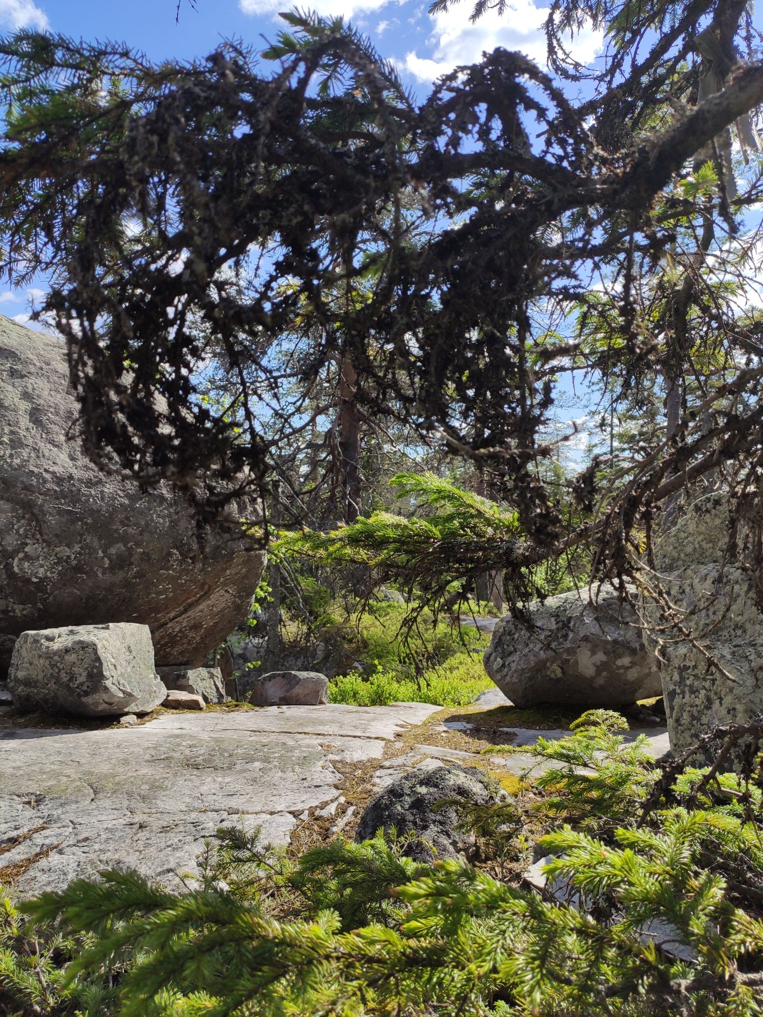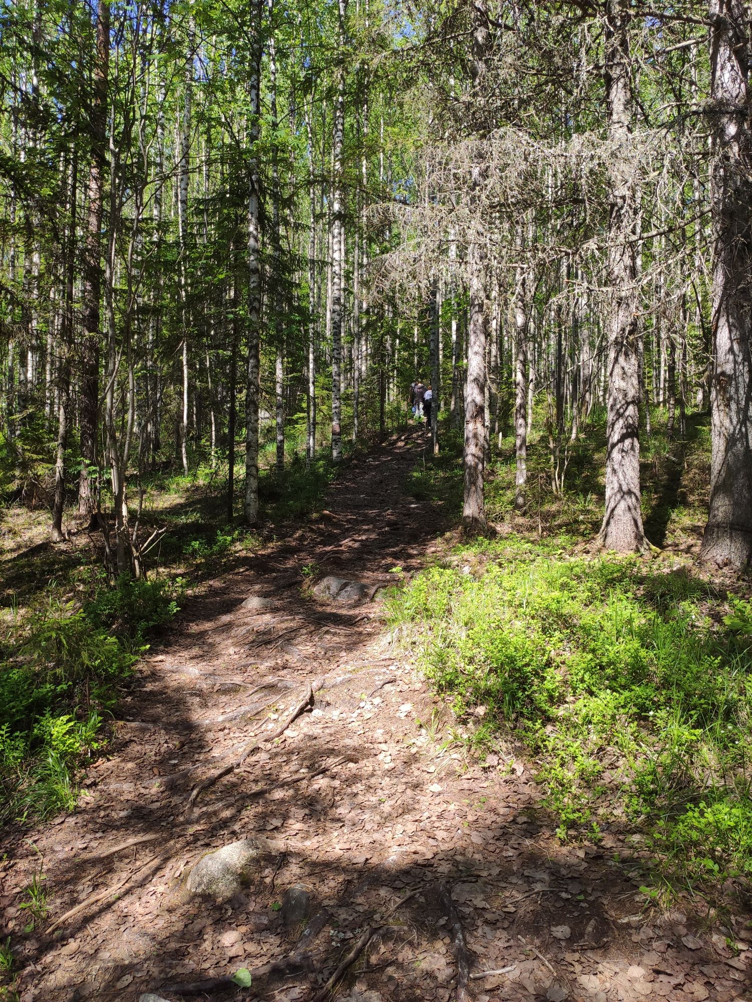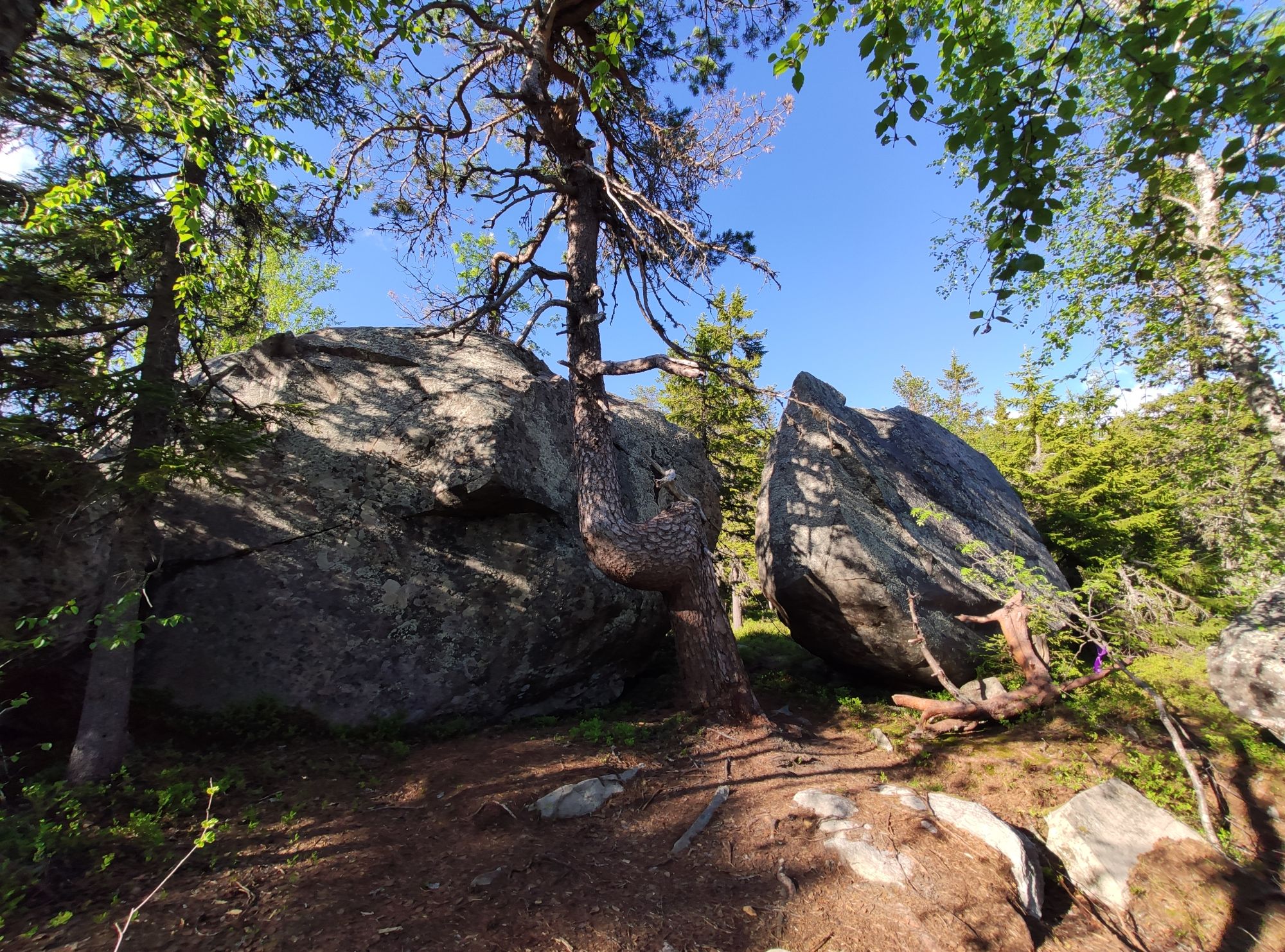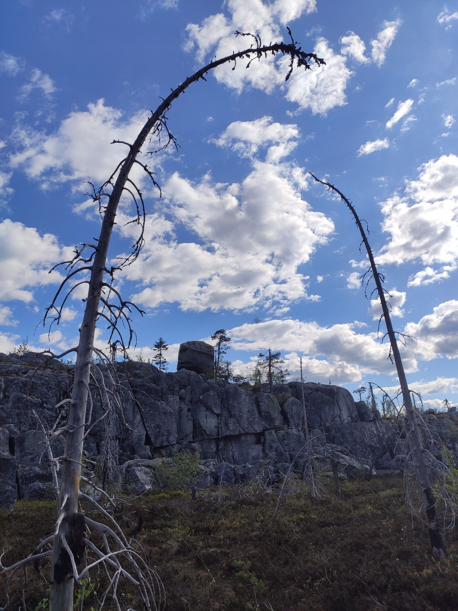 17 июня 2020 На следующий день мы поехали на саму гору Воттаваара. От Петрозаводска до нее 300 км. Поэтому ехали с несколькими остановками. Выбирали отвороточку "к воде" и немного гуляли. Погода была отличная, а небо волшебным. Заодно выгуляли лисёнка из Шуи (по пути оказалось, что и в Карелии есть своя Шуя, только это поселок)))) - на последнем фото цветущий багульник. До населенного пункта Гимолы можно доехать, в принципе, на любом транспорте. А вот дальше уже сложнее. Последние 17 км - только на внедорожнике. Немного дороги))) - оказалось, что это растение называется пушица вагинальная, растет на болоте. А ещё на болоте цветут разные ягоды - морошка клюква Перед второй большой лужей встретили "Крузак". Его водитель рассказал и показал нам место, где в луже лежит большой камень. Один он бы ехать побоялся. Но мы дорожку проторили, а он за нами))) Машину оставили у начала тропы на гору. Взяли с собой маленькую бутылочку воды и пачку орехово-сухофруктной смеси и пошли. Подъем дался тяжело. Карантин, малоподвижность.... Но мы пыхтели и ползли, ползли и пыхтели)))) Природа завораживает. На верху тропы я нашла два сморчка. Трогать их не стала, только сфоткала. А потом пошли огромные валуны и скрученные деревья. Говорят, что пляшущий лес на Куршской косе отдыхает. Мы сами там не были, а вот попутчики наши были. А мы потихоньку уходили все выше. Лес становился все более низким и скрюченным. Вообще, Воттоваара считается раем для эзотериков всяких и экстрасенсов. Многие пишут, что тут прям страшно, их корячит. Не знаю. Мне там было очень комфортно. И тут мы поднялись на первую вершину из трёх. И офигели от видов. Мы садились на камушки и смотрели вдаль. И то вчетвером обсуждали виды, то распадались на пары что-то обсуждая, а то и по одинокие смотрели в даль. - если не ошибаюсь, то вот там внизу Амфитеатр - заболоченная долина между двух вершин. Слезть в нее оказалось отдельным приключением. Зато, сидя внизу на камушке мы с мужем одновременно увидели воооон в том большом валуне лицо великана. Мы решили, что тут тоже есть Дух горы и это как раз он. А дальше опять в гору - на вторую вершину. Там почти не было деревьев. По ощущениям она самая высокая. И видно с нее очень далеко. Ну а дальше сказ про четырех идиотов людей, любящих приключения))))) Если посмотреть на карту, то мы прошли от нижней точки по прямой до зелёной отметки возле названия горы. Дальше можно было повернуть назад и вернуться той же дорогой. Но... нормальные герои всегда идут в обход. Женька, глядя с умным видом в карту, изрёк - тут есть ещё одна достопримечательность - Лестница в небо. До нее 2 км. Но получится крюк. В итоге нам около 8 км пройти надо. А потом осуждающим взглядом посмотрел на нас и спросил - Мы же хотим посмотреть лестницу в небо? Ну, в общем, да, сказали мы и устремились. )))) Третья вершина совсем другая. Много корявых деревьев, болот и черники. И озёр! С чистейшей водой! Но сначала мы шли по азимуту, т.к. тропа закончилась и мы шли по мхам и корягам. Было как-то морально тяжело в тот момент. - это и есть та лестница. Огромный валун в виде лестницы. Но нас там гнали комары и мошка, коих ооочень много на третьей вершине (на первой и второй они тоже были, но их ветер сдувал на открытых пространствах). После лестницы началась тропа. Не такая утоптанная, как на первых двух вершинах, но она была!!! Это придавало сил! Ну и ещё орешк