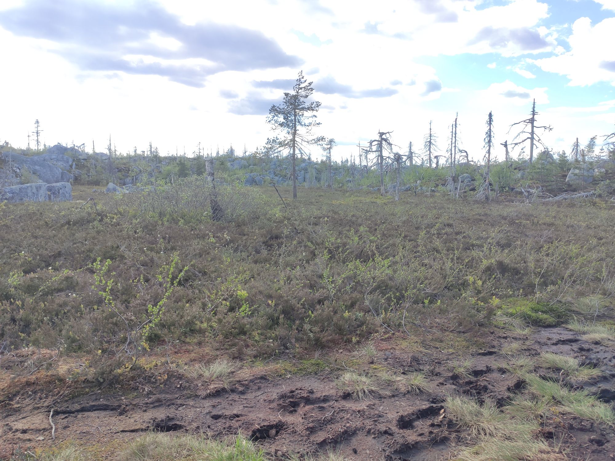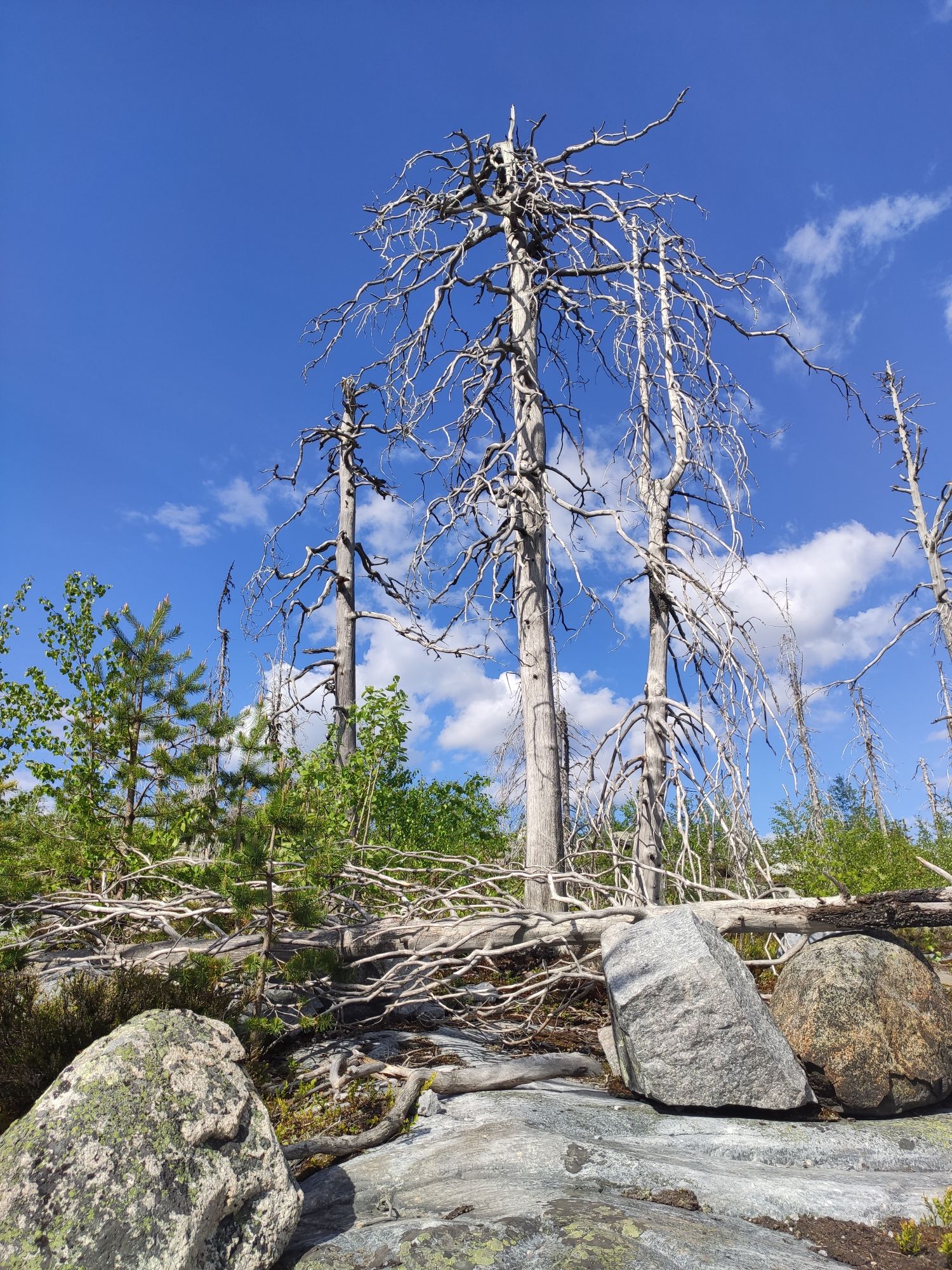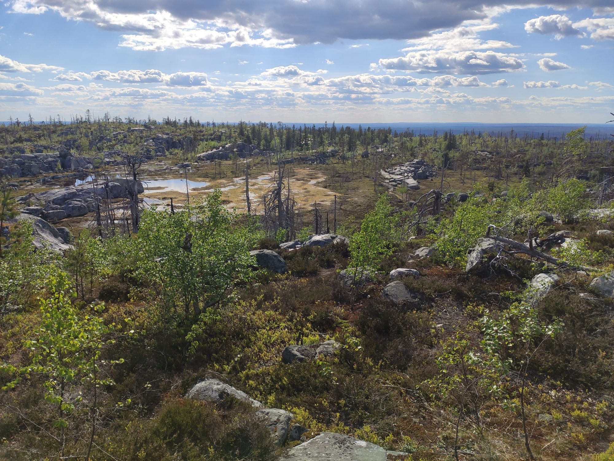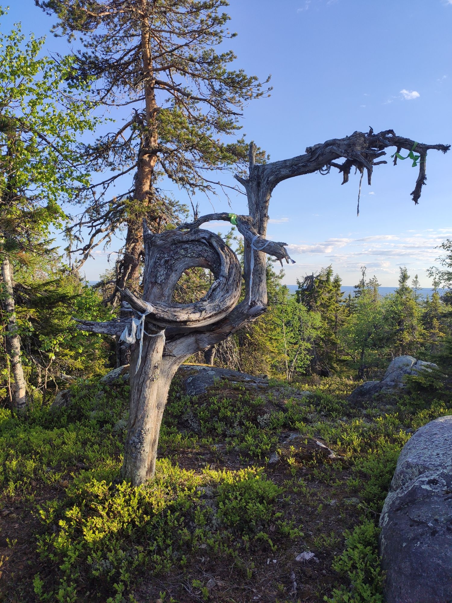 17 июня 2020 На следующий день мы поехали на саму гору Воттаваара. От Петрозаводска до нее 300 км. Поэтому ехали с несколькими остановками. Выбирали отвороточку "к воде" и немного гуляли. Погода была отличная, а небо волшебным. Заодно выгуляли лисёнка из Шуи (по пути оказалось, что и в Карелии есть своя Шуя, только это поселок)))) - на последнем фото цветущий багульник. До населенного пункта Гимолы можно доехать, в принципе, на любом транспорте. А вот дальше уже сложнее. Последние 17 км - только на внедорожнике. Немного дороги))) - оказалось, что это растение называется пушица вагинальная, растет на болоте. А ещё на болоте цветут разные ягоды - морошка клюква Перед второй большой лужей встретили "Крузак". Его водитель рассказал и показал нам место, где в луже лежит большой камень. Один он бы ехать побоялся. Но мы дорожку проторили, а он за нами))) Машину оставили у начала тропы на гору. Взяли с собой маленькую бутылочку воды и пачку орехово-сухофруктной смеси и пошли. Подъем дался тяжело. Карантин, малоподвижность.... Но мы пыхтели и ползли, ползли и пыхтели)))) Природа завораживает. На верху тропы я нашла два сморчка. Трогать их не стала, только сфоткала. А потом пошли огромные валуны и скрученные деревья. Говорят, что пляшущий лес на Куршской косе отдыхает. Мы сами там не были, а вот попутчики наши были. А мы потихоньку уходили все выше. Лес становился все более низким и скрюченным. Вообще, Воттоваара считается раем для эзотериков всяких и экстрасенсов. Многие пишут, что тут прям страшно, их корячит. Не знаю. Мне там было очень комфортно. И тут мы поднялись на первую вершину из трёх. И офигели от видов. Мы садились на камушки и смотрели вдаль. И то вчетвером обсуждали виды, то распадались на пары что-то обсуждая, а то и по одинокие смотрели в даль. - если не ошибаюсь, то вот там внизу Амфитеатр - заболоченная долина между двух вершин. Слезть в нее оказалось отдельным приключением. Зато, сидя внизу на камушке мы с мужем одновременно увидели воооон в том большом валуне лицо великана. Мы решили, что тут тоже есть Дух горы и это как раз он. А дальше опять в гору - на вторую вершину. Там почти не было деревьев. По ощущениям она самая высокая. И видно с нее очень далеко. Ну а дальше сказ про четырех идиотов людей, любящих приключения))))) Если посмотреть на карту, то мы прошли от нижней точки по прямой до зелёной отметки возле названия горы. Дальше можно было повернуть назад и вернуться той же дорогой. Но... нормальные герои всегда идут в обход. Женька, глядя с умным видом в карту, изрёк - тут есть ещё одна достопримечательность - Лестница в небо. До нее 2 км. Но получится крюк. В итоге нам около 8 км пройти надо. А потом осуждающим взглядом посмотрел на нас и спросил - Мы же хотим посмотреть лестницу в небо? Ну, в общем, да, сказали мы и устремились. )))) Третья вершина совсем другая. Много корявых деревьев, болот и черники. И озёр! С чистейшей водой! Но сначала мы шли по азимуту, т.к. тропа закончилась и мы шли по мхам и корягам. Было как-то морально тяжело в тот момент. - это и есть та лестница. Огромный валун в виде лестницы. Но нас там гнали комары и мошка, коих ооочень много на третьей вершине (на первой и второй они тоже были, но их ветер сдувал на открытых пространствах). После лестницы началась тропа. Не такая утоптанная, как на первых двух вершинах, но она была!!! Это придавало сил! Ну и ещё орешк