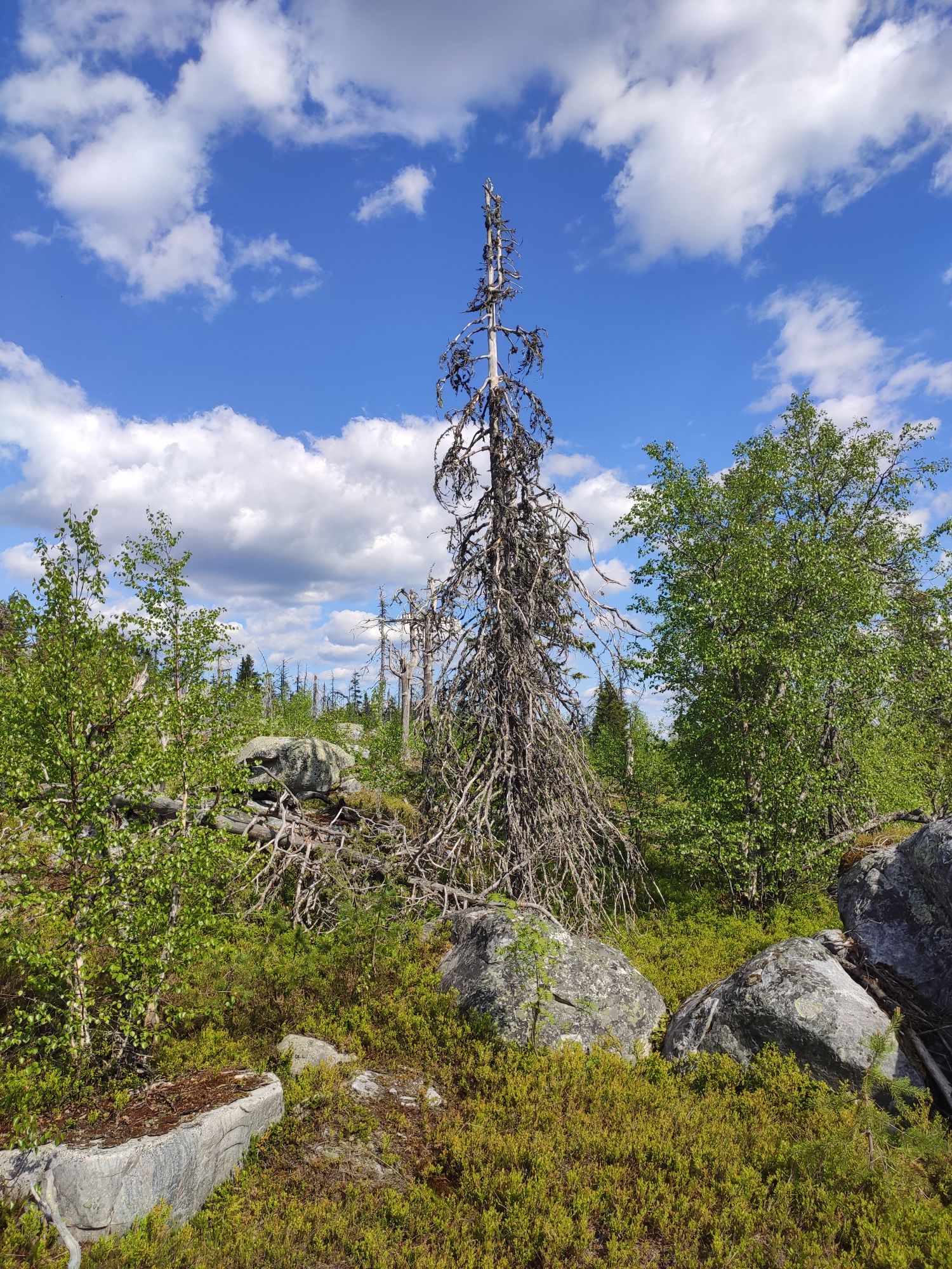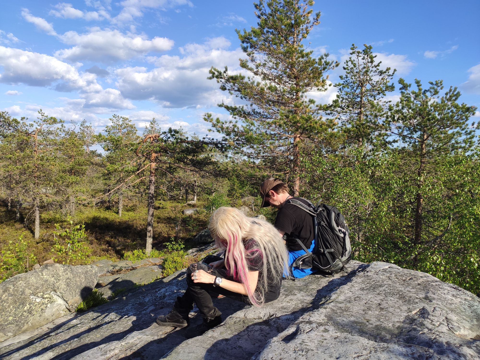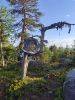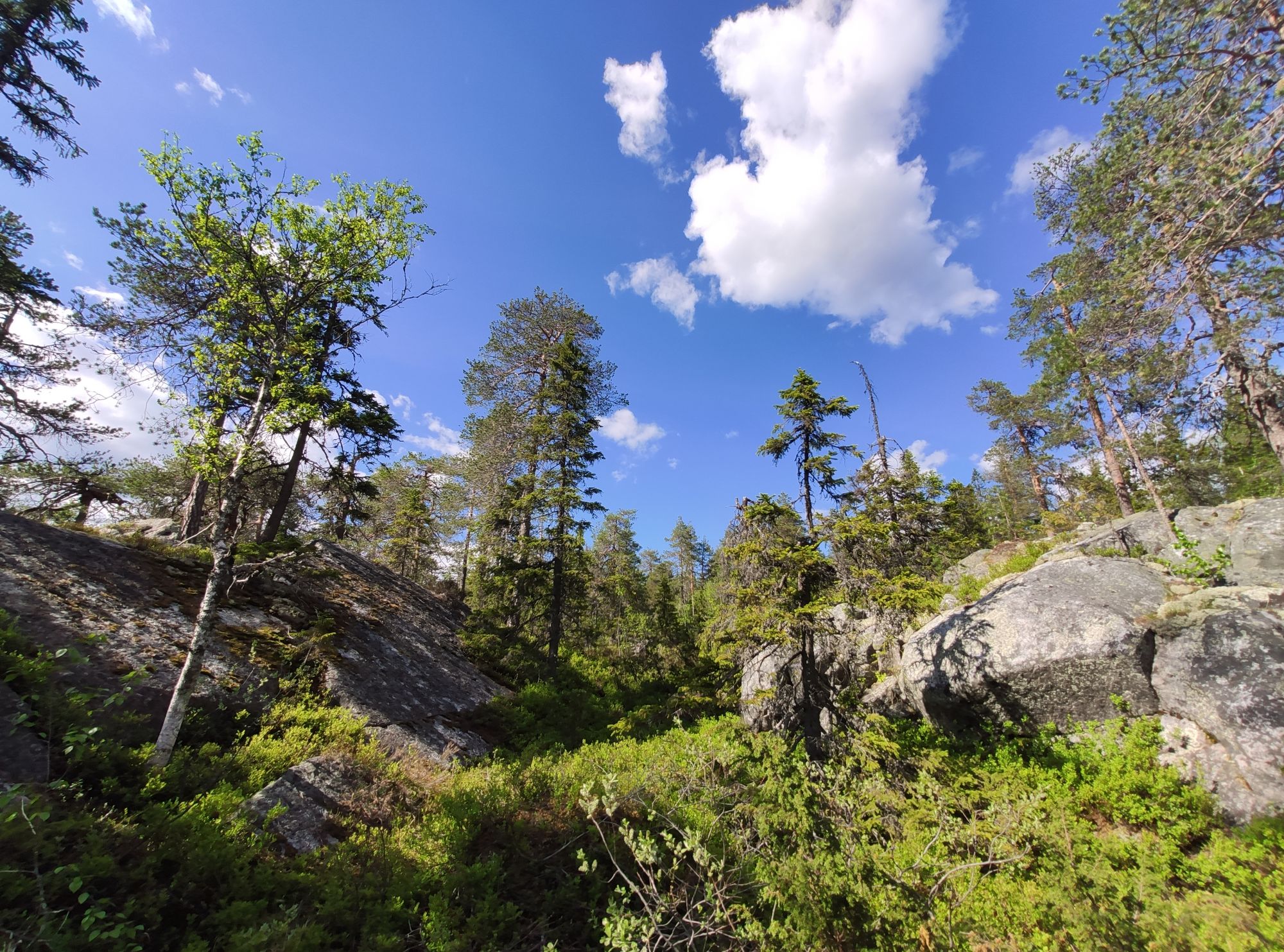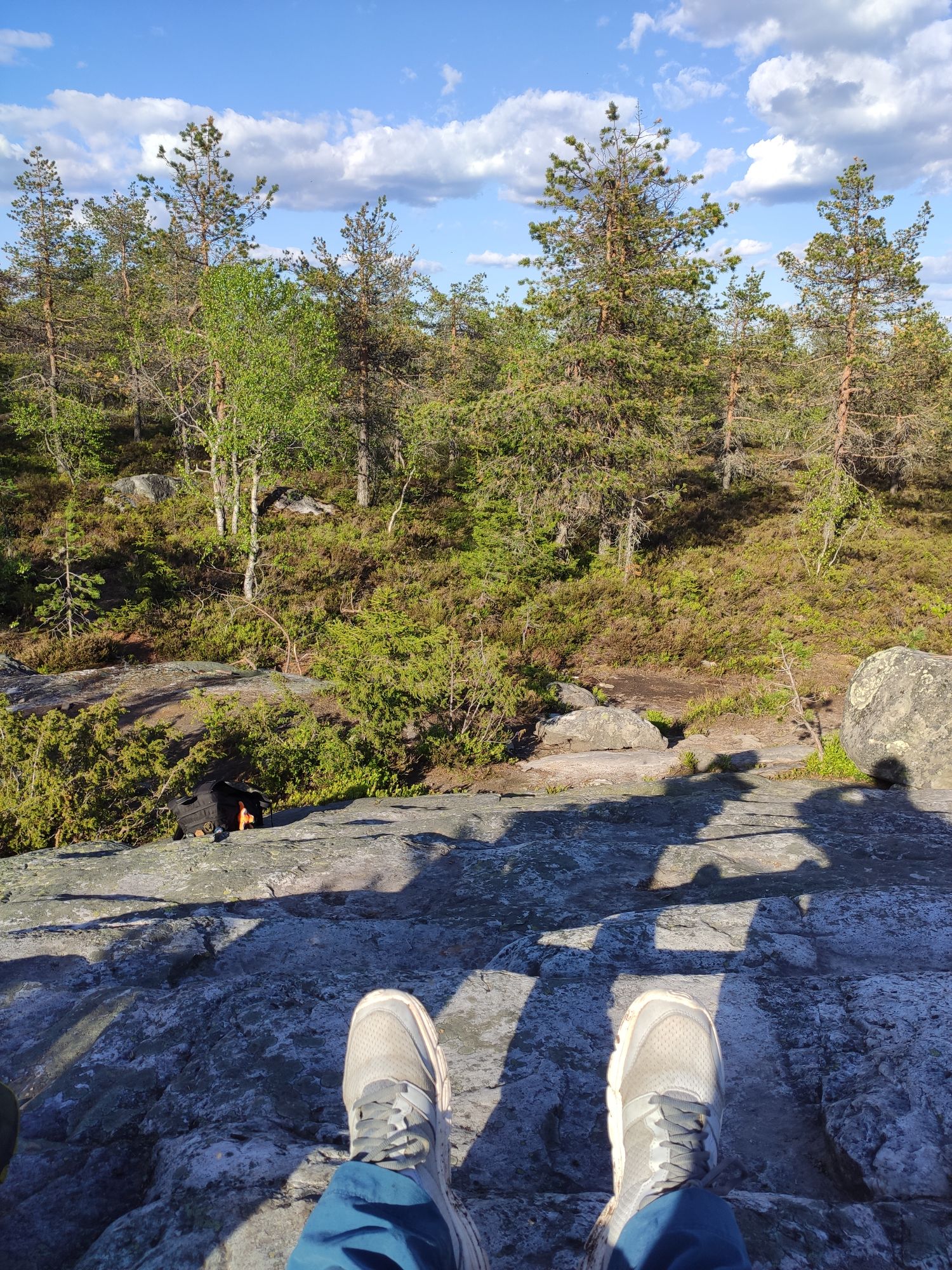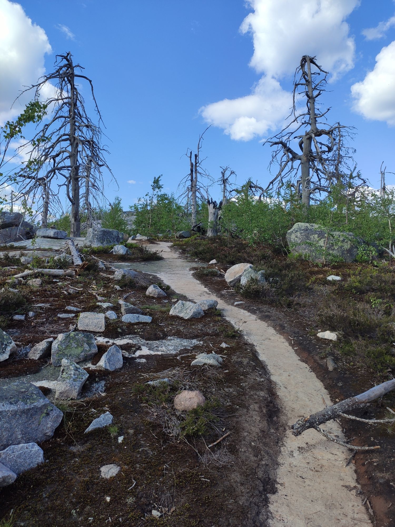 17 июня 2020 На следующий день мы поехали на саму гору Воттаваара. От Петрозаводска до нее 300 км. Поэтому ехали с несколькими остановками. Выбирали отвороточку "к воде" и немного гуляли. Погода была отличная, а небо волшебным. Заодно выгуляли лисёнка из Шуи (по пути оказалось, что и в Карелии есть своя Шуя, только это поселок)))) - на последнем фото цветущий багульник. До населенного пункта Гимолы можно доехать, в принципе, на любом транспорте. А вот дальше уже сложнее. Последние 17 км - только на внедорожнике. Немного дороги))) - оказалось, что это растение называется пушица вагинальная, растет на болоте. А ещё на болоте цветут разные ягоды - морошка клюква Перед второй большой лужей встретили "Крузак". Его водитель рассказал и показал нам место, где в луже лежит большой камень. Один он бы ехать побоялся. Но мы дорожку проторили, а он за нами))) Машину оставили у начала тропы на гору. Взяли с собой маленькую бутылочку воды и пачку орехово-сухофруктной смеси и пошли. Подъем дался тяжело. Карантин, малоподвижность.... Но мы пыхтели и ползли, ползли и пыхтели)))) Природа завораживает. На верху тропы я нашла два сморчка. Трогать их не стала, только сфоткала. А потом пошли огромные валуны и скрученные деревья. Говорят, что пляшущий лес на Куршской косе отдыхает. Мы сами там не были, а вот попутчики наши были. А мы потихоньку уходили все выше. Лес становился все более низким и скрюченным. Вообще, Воттоваара считается раем для эзотериков всяких и экстрасенсов. Многие пишут, что тут прям страшно, их корячит. Не знаю. Мне там было очень комфортно. И тут мы поднялись на первую вершину из трёх. И офигели от видов. Мы садились на камушки и смотрели вдаль. И то вчетвером обсуждали виды, то распадались на пары что-то обсуждая, а то и по одинокие смотрели в даль. - если не ошибаюсь, то вот там внизу Амфитеатр - заболоченная долина между двух вершин. Слезть в нее оказалось отдельным приключением. Зато, сидя внизу на камушке мы с мужем одновременно увидели воооон в том большом валуне лицо великана. Мы решили, что тут тоже есть Дух горы и это как раз он. А дальше опять в гору - на вторую вершину. Там почти не было деревьев. По ощущениям она самая высокая. И видно с нее очень далеко. Ну а дальше сказ про четырех идиотов людей, любящих приключения))))) Если посмотреть на карту, то мы прошли от нижней точки по прямой до зелёной отметки возле названия горы. Дальше можно было повернуть назад и вернуться той же дорогой. Но... нормальные герои всегда идут в обход. Женька, глядя с умным видом в карту, изрёк - тут есть ещё одна достопримечательность - Лестница в небо. До нее 2 км. Но получится крюк. В итоге нам около 8 км пройти надо. А потом осуждающим взглядом посмотрел на нас и спросил - Мы же хотим посмотреть лестницу в небо? Ну, в общем, да, сказали мы и устремились. )))) Третья вершина совсем другая. Много корявых деревьев, болот и черники. И озёр! С чистейшей водой! Но сначала мы шли по азимуту, т.к. тропа закончилась и мы шли по мхам и корягам. Было как-то морально тяжело в тот момент. - это и есть та лестница. Огромный валун в виде лестницы. Но нас там гнали комары и мошка, коих ооочень много на третьей вершине (на первой и второй они тоже были, но их ветер сдувал на открытых пространствах). После лестницы началась тропа. Не такая утоптанная, как на первых двух вершинах, но она была!!! Это придавало сил! Ну и ещё орешк