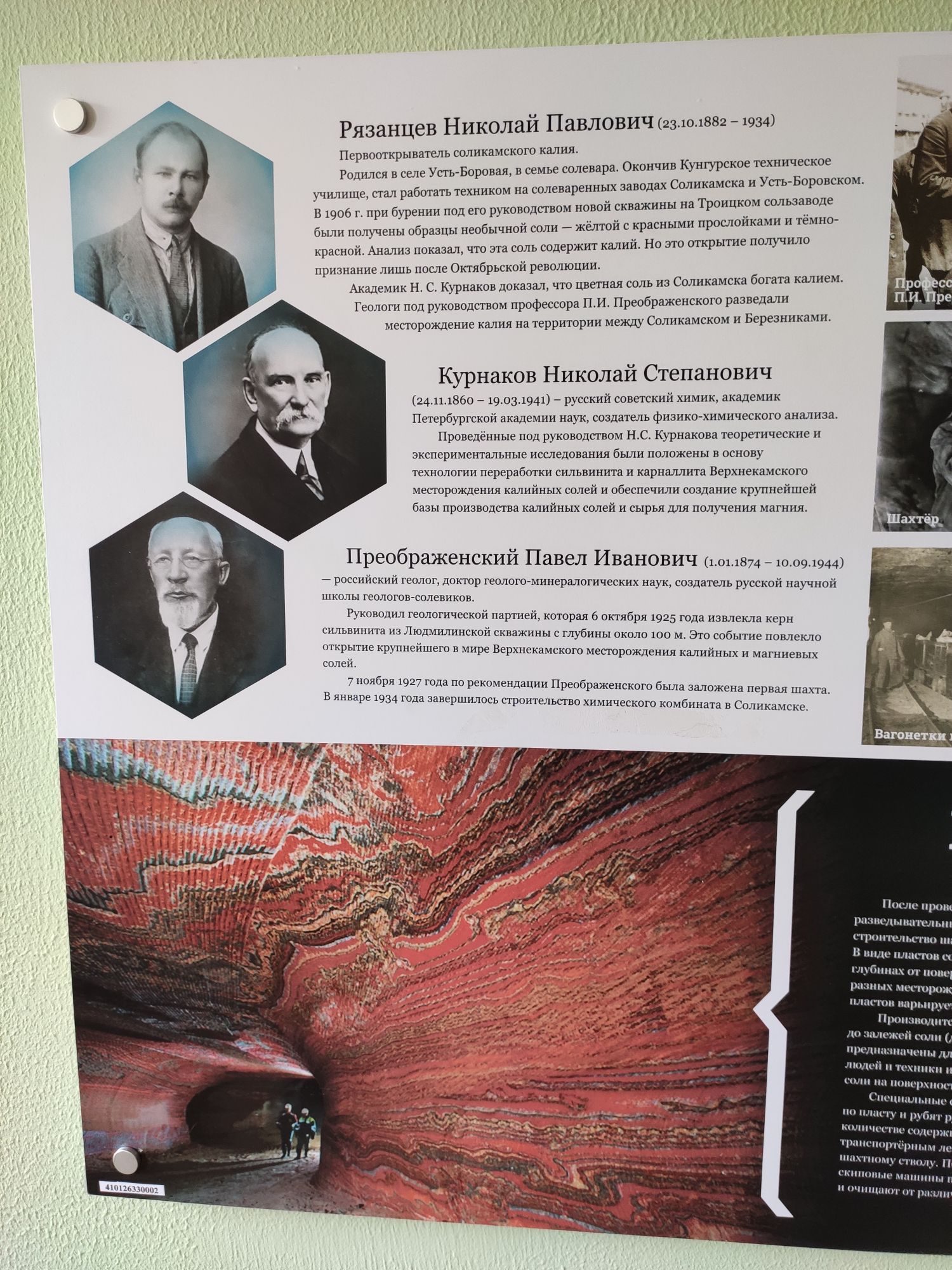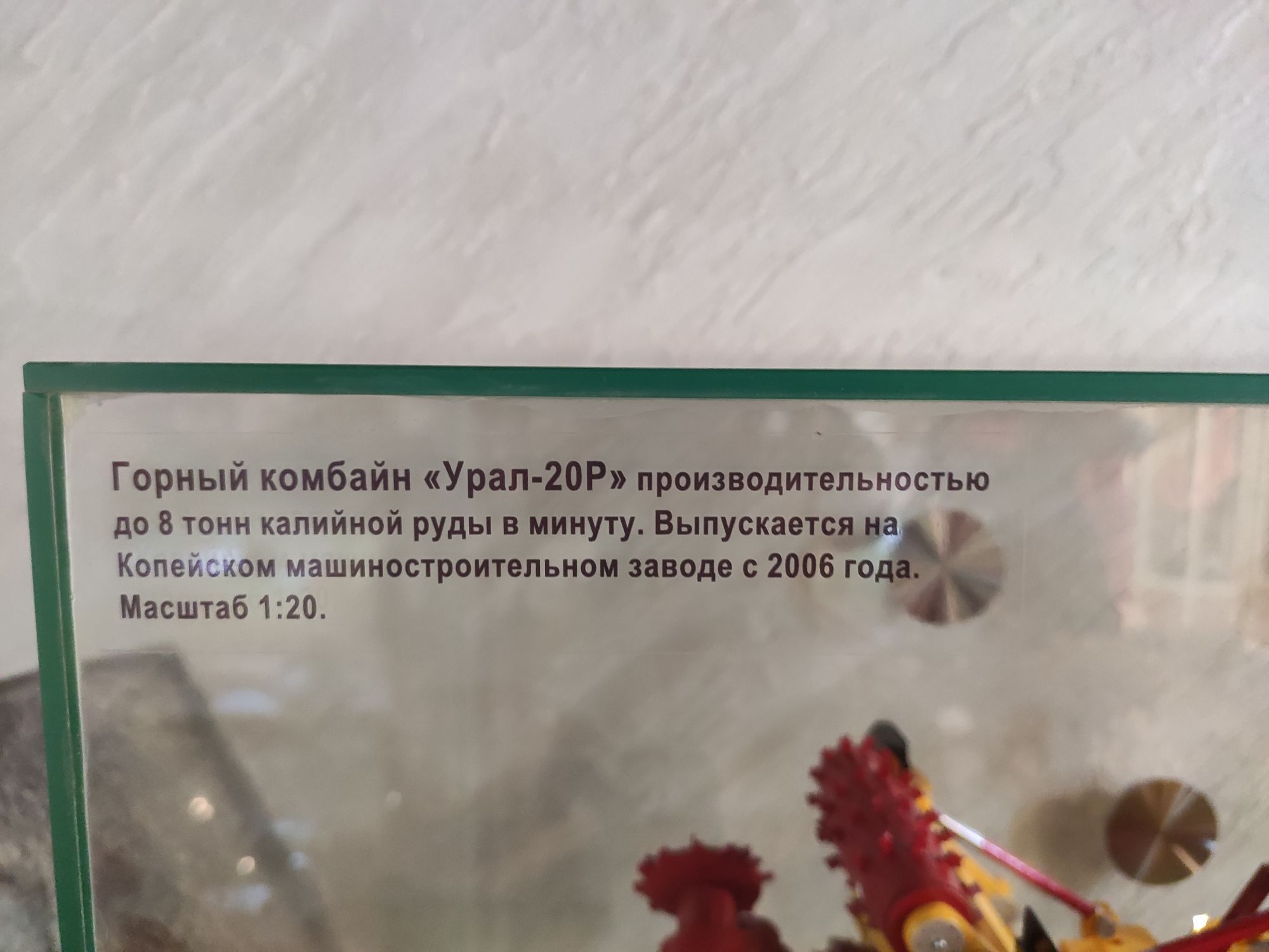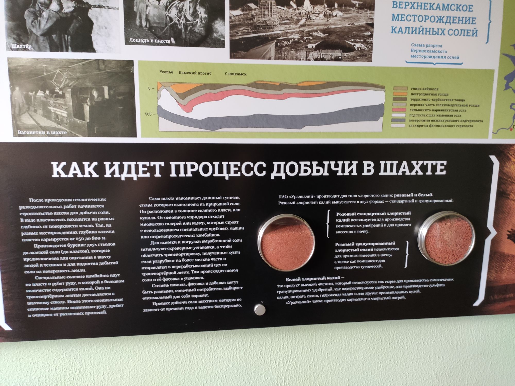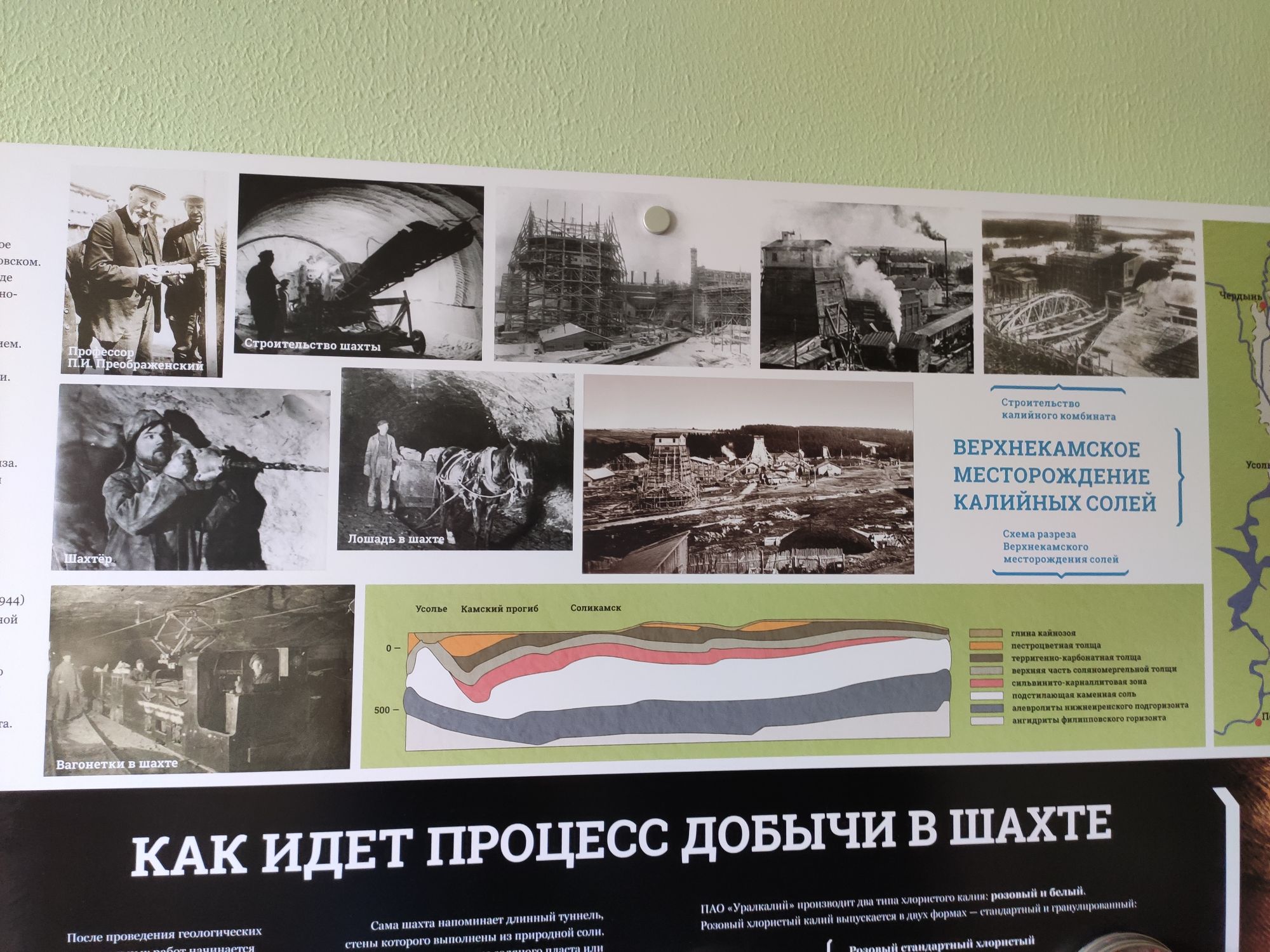 4 августа 2020 Сегодня был ленивый день. В 12 у нас была заказана экскурсия в ведомственный музей Уралкалия. Музей очень классный. Все очень наглядно. Видно, что у предприятия есть деньги, раз оно может так оснастить музей. Экскурсия, правда, началась как-то скучновато. Я даже успела подумать, что это даже и не экскурсия, а нам просто покажут что в музее и всё))) Но довольно быстро экскурсия поменяла настроение))) Девушка увидела наш интерес и стала рассказывать больше и с задором. По стеклянным полам можно ходить, разглядывая минералы. На стендах представлены разные виды соли и пород, из которых эту разную соль добывают. Вообще, в окрестностях Соликамска и Березников находится огромный пласт солей калия и магния. Ну и поваренной соли, хотя ее из подземного рассола добывать не выгодно сейчас, ибо есть соленые озера Калмыкии, например, где соль можно прям черпать горстями практически. Порода, в которой находится калий называется сильвинит. Он очень твердый и тяжёлый. И ещё очень красивый. Эта скульптура сделана как раз из сильвинита. Порода с магнием называется карналлит. Но про него нам мало рассказывали. В первом зале помимо образцов пород маленькая выставка палеонтологических находок. И ещё стоит ящер, который, по идее, должен рычать, но нас он решил не пугать и сломался. Мастера ему, если что, уже вызвали))) Тут не могло не быть макета прародителя калийных рудников - солеварни. Именно с поваренной соли все и началось. Макет шахты. Первая калийная шахта была построена и пущена в Соликамске. В Березниках запустили позже. Маленький зал, посвященный советскому времени Около этих сувениров я замерла И тут нам показали ёлочку, которую вырастили для новогоднего конкурса в шахте. Правда, красавица?) В отдельной комнате стоит большой макет порта Уралкалия в Санкт-Петербурге. Там очень хитрая схема разгрузки-погрузки. Удобрения привозят в вагонах. У вагонов в спец. ангарах открывается дно и руда попадает в спецхранилище. Дальше она будет перемещаться только по специальным транспортерам, чтобы не набраться влаги из воздуха и т.д. Плюс - тут все экологично. После погрузки на танкеры руду везут в основном в Китай, Индию, Бразилию и ещё примерно 65-70 стран. А затем был зал с механизмами. Сначала модели машин. Это самая первая машина, созданная для угольных шахт, которую пытались приспособить под работу с сильвинитом. Но порода значительно твёрже угля, поэтому машина не справлялась. И встал вопрос о создании машины специально по эту породу. Сейчас используют две. Первая - наша, Корейского завода. Говорят, что она надёжнее. Вторая - импортная. Производительность у нее выше, но она заточена под более мягкие породы (если не ошибаюсь, в Канаде), а в нашей часто выходит из строя. И два "прицепа". В один из них складируется руда. Как только он наполняется, то высыпают всё в самоходный вагон, который и увозит руду к выходу из шахты. А тут показаны 2 проходки (2 "этажа" в шахте). Это маркшейдеры - люди, без которых, как я поняла, не продвинутся ни на метр. Они изучают породу и говорят как должны пройти тоннели. А этот макет машины рабочий - у него крутится механизм и все громыхает! Эта машина захватывает кусок породы размером с однокомнатную квартиру и перемалывает ее. Винты снизу как у мясорубки подхватывают руду и отправляют ее в прицеп. Сверху есть мощный пылеуловитель. И всем эт