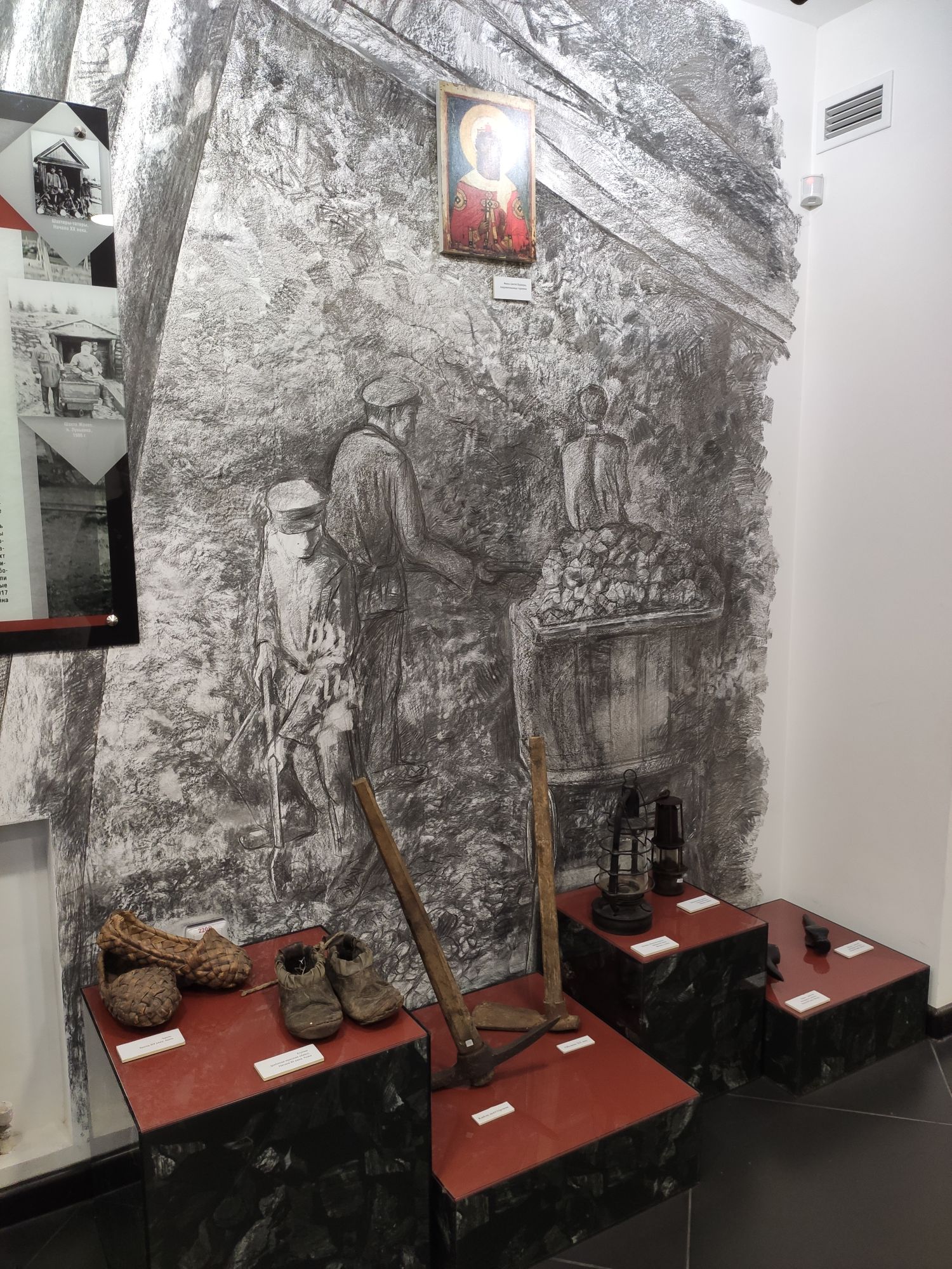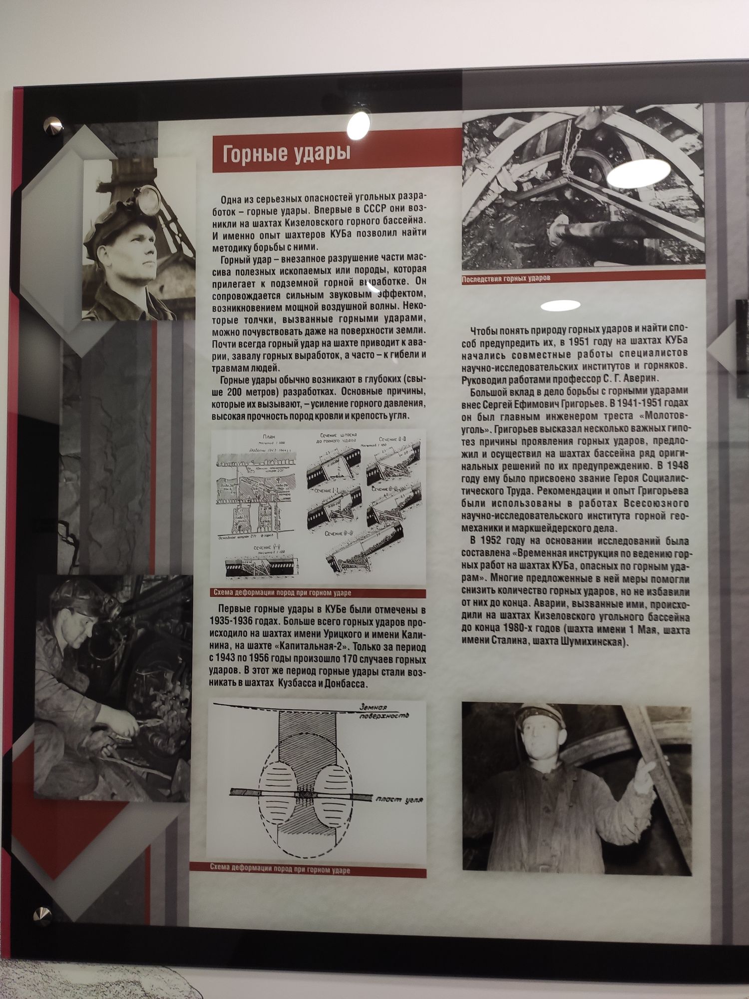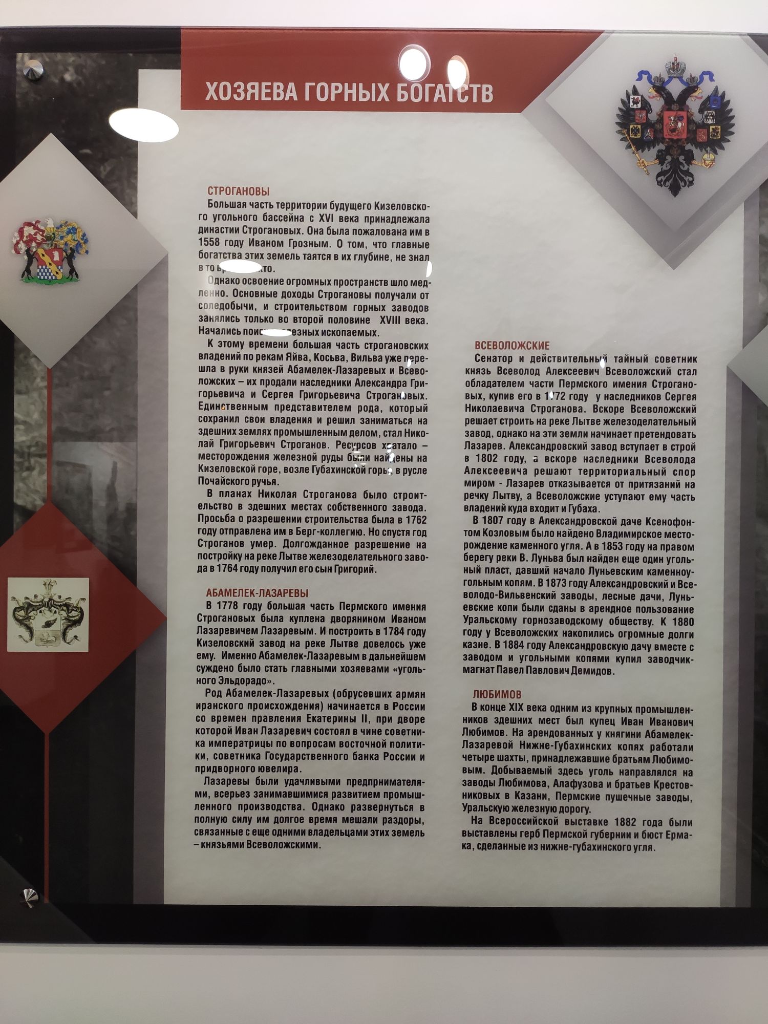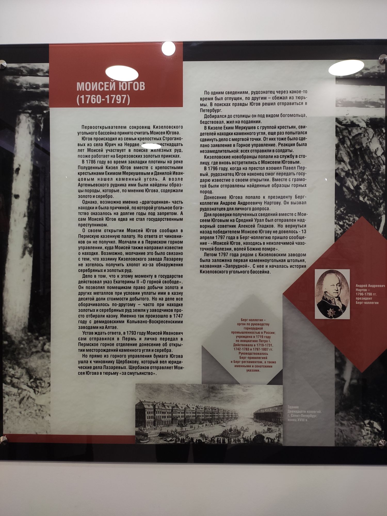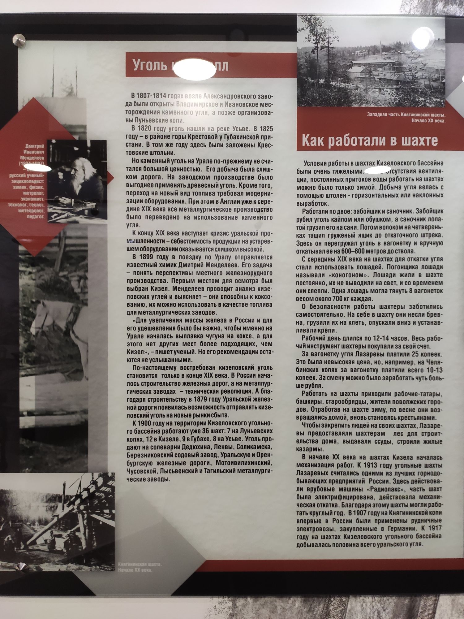 4 августа 2020 Дальше планов у нас не было))) Нужен был интернет, чтобы найти телефоны музеев, в которые мы хотим заехать, чтобы заказать экскурсии (и узнать - работают ли они). Для ловли интернета решили доехать до Губахи)))) Пока я звонила в музей Уралкалия, музей Пермской нефти и в музей Мотовилихинских заводов, муж нашел Губахинский музей КУБ'а. Решили зайти. Музей даже снаружи оформлен великолепно + выставка во дворе. КУБ - это Кизеловский Угольный Бассейн. Губаха - один из городов, жизнь которого тесно связана с углем и шахтами. В каждой семье там есть тот, кто работал в угольной промышленности. В музее два этажа. На первом музей угля, на втором сокровища Дворцового грота. Экскурсии разные и билеты отдельно. Но это тот случай, когда не жалко ни рубля. Мы ещё и первыми посетителями после карантина оказались. И все было на позитиве. В музее угля рассказывают про историю его нахождения. От первых владельцев земли - Строгановых до текущего времени. На стенах рисунки углем, которые любят потрогать все посетители. От рук остаются следы. Мы трогать не стали, хотя я и спросила про рисунки отдельно. Расписывала местная художница. Моисей Югов - знатный рудознатец. Историю его вставлю в виде фото со стенда. Нам рассказали про условия работы в шахте. Какие они были тяжёлые. Как мало за все платили, а требовали на работу со своей одеждой, инструментами и т.д. Рассказали, что для работы в шахтах вывели отдельную породу лошадей, которая не бывала на солнечном свету. А если и бывала, то выводили ее с завязанными глазами из-за проблем со зрением. В следующем зале показано развитие угледобывающего дела. Палеонтологические находки, керны, образцы угля. Макет с недрами земли и шахтами. Нам рассказали про Горные удары - подземные землетрясения. Даже была выпущена брошюра - как их опознать и что делать. Но шахтеры оказались хитрее - они брали с собой в забой канареек в клетке. Эти птицы очень чувствительны. Поэтому они либо начинали нервничать, либо могли даже умереть при начале выброса метана. А ещё - у шахтеров серая крыса - практически священное животное. Их нельзя было обижать! Почти у каждого шахтера была своя прикормленная крыса. Эти животные тоже всё чувствуют, поэтому шахтеры всегда наблюдали за их поведением. Образцы угля, керны и т.д. Фото немного, но рассказ (язык не поворачивается назвать экскурсией) был прекрасен! С юмором, со знанием дела и т.д.))) Мы не смогли расстаться с экскурсоводом Жанной и оплатили второй этаж))) Там находится палеонтологическая выставка "Тайны Дворцового грота". Оказалось, что Дворец - это Дворец культуры шахты им. Калинина в Верхней Губахе - городе-призраке, но про это позже. За дворцом находится грот-пещера, в которой начал вести раскопки палеонтологический кружок. И вдруг они нашли огромное количество костей древних животных. Сначала учащихся кружка отстранили, т.к. они несовершеннолетние, но руководительница поставила всех на уши и добилась того, что раскопки детям проводить разрешили. Часть костей находится в губахинском музее, а часть в Перми. И да - дети настолько этим увлеклись, что многие пошли в палеонтологию и археологию. И присылают в музей свои работы и доклады. А в сам период раскопок детей было не вытащить домой и родители приносили еду детям прям на место работы)))) Выходили мы через зал природы. Нам немного рассказали про п