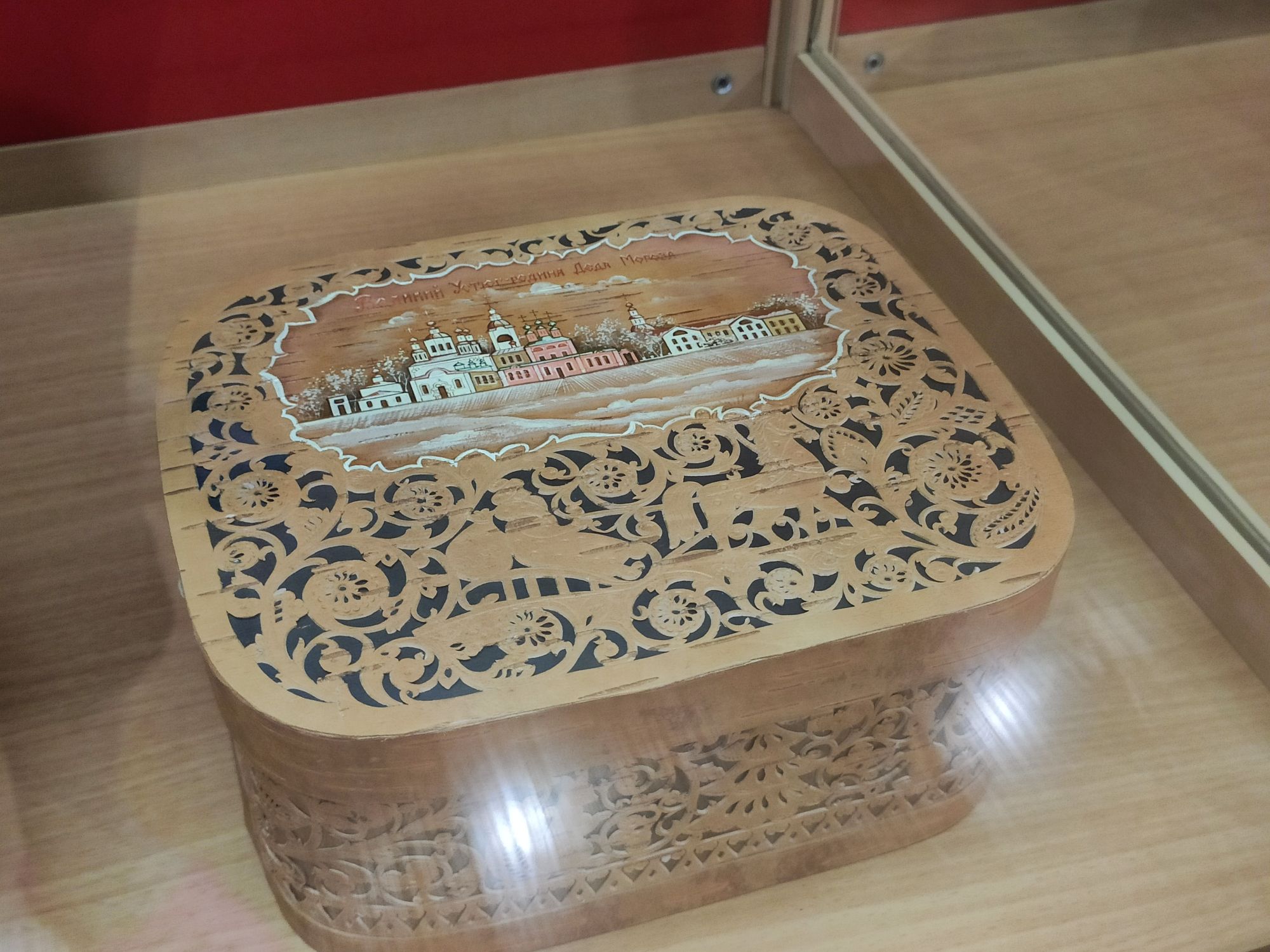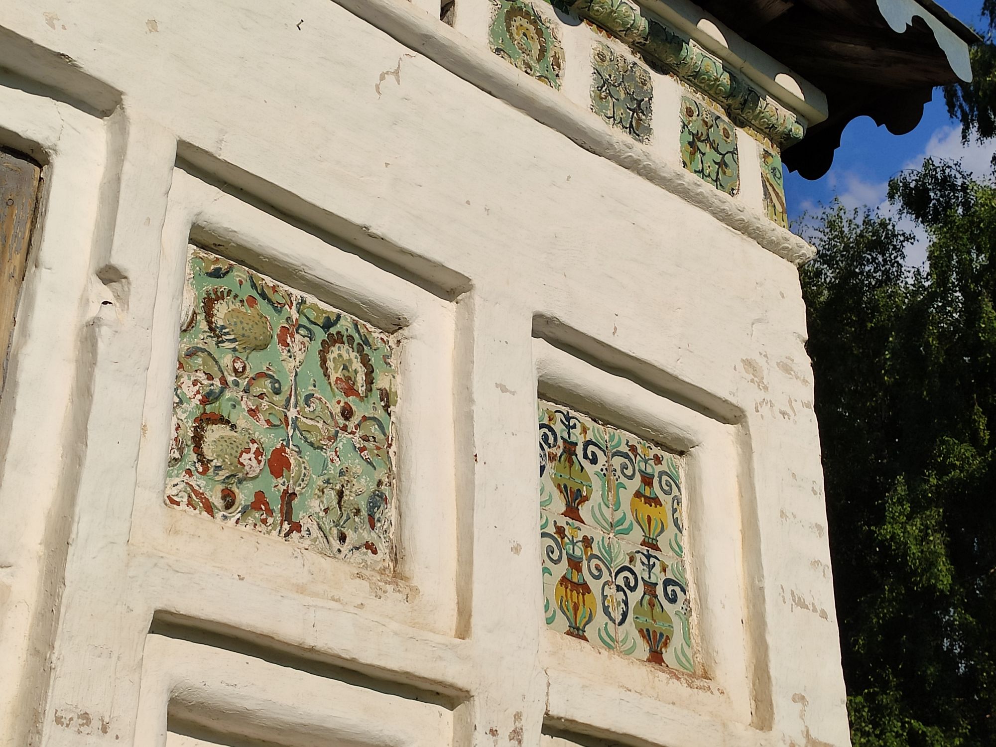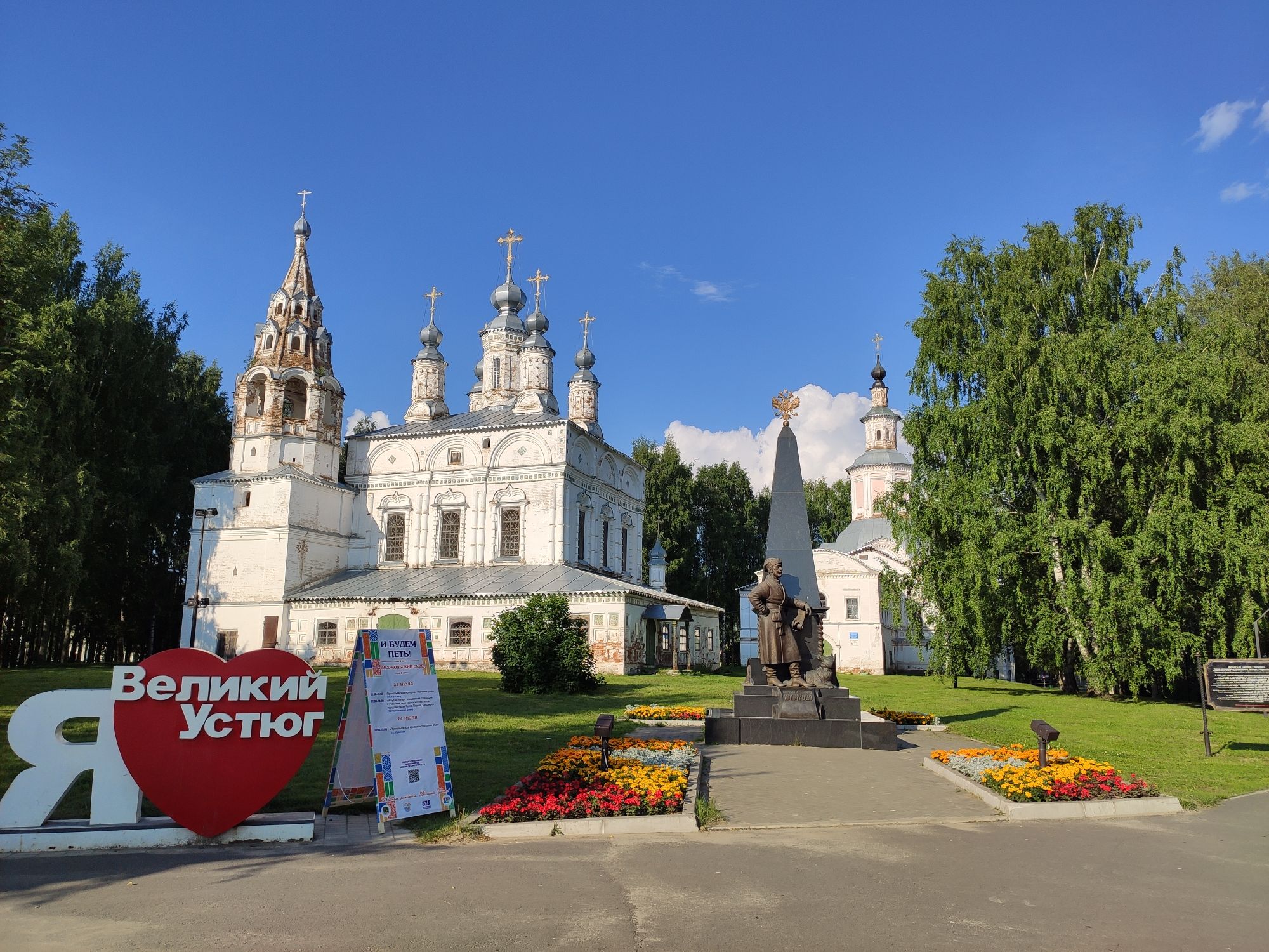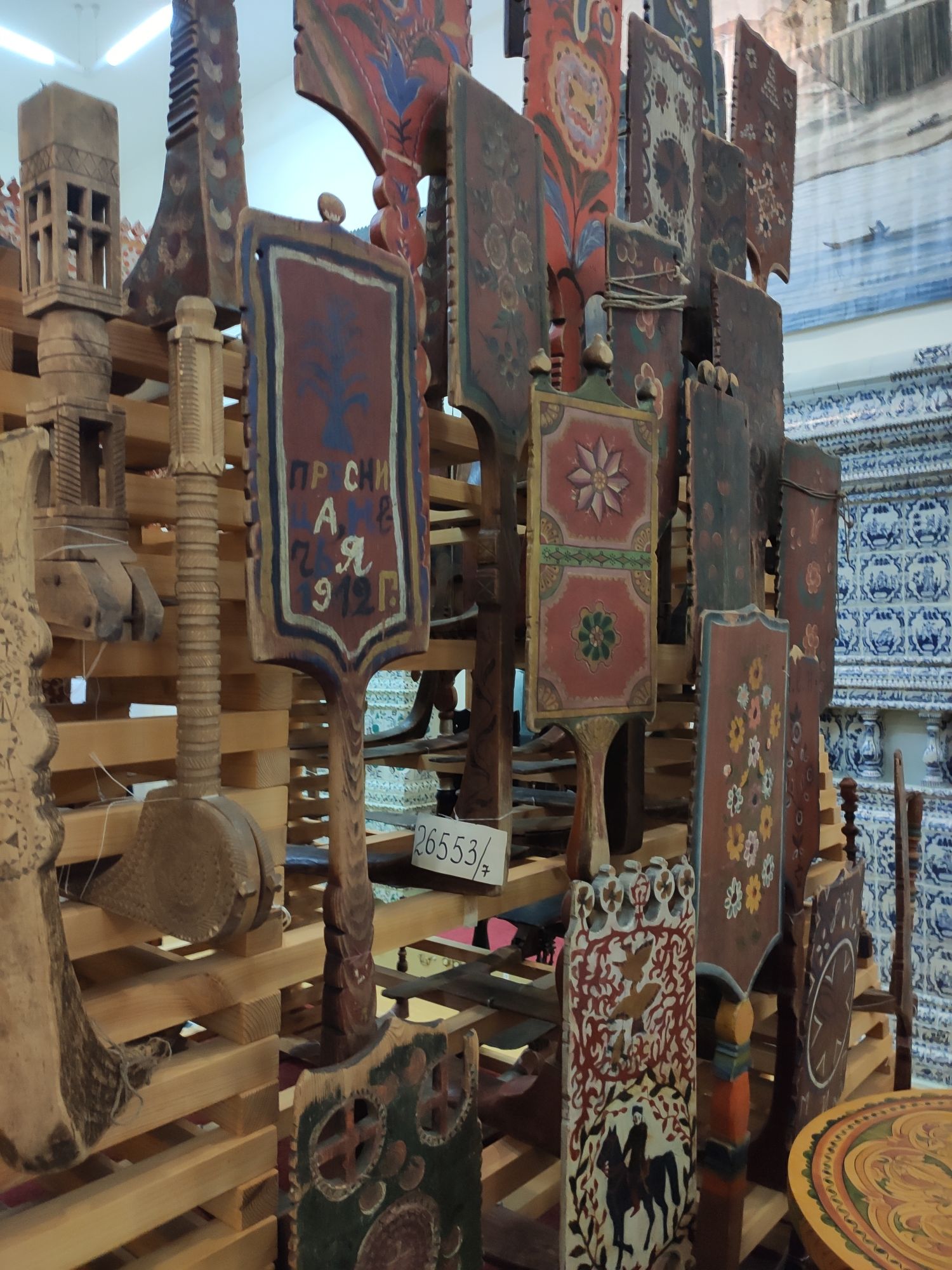 8 августа 2022 Продолжение. Великий Устюг. Город встретил нас изнуряющей жарой. Вообще, мы были очень голодные, поэтому начали с обеда))) Потом решили чуток пройтись. Шли от тени до тени и сторону улицы выбирали теневую. И вот идём мы за какими-то палаточками. Думали, что там просто рынок приехал и продают шторы/штаны/полотенца.... И тут опа - из-под палатки выглядывает огромный туесок с росписью. Ну и мы не смогли пройти мимо. Женька ушел в тень, а мы с Асей погуляли вдоль палаточек. Продавали разные изделия народных промыслов и всякие авторские вещицы. И мы бы ушли без покупок, если бы не вот этот лоток... Муж с женой делают вот таких куколок. В основном там парочки, занятые разными делами))) Визитку брала, но что-то найти не могу. Найду, выложу. Я купила Женьке подарок - бабулька и дедулька на мотоцикле)))) Прошли через Соборное дворище - центр В. Устюга с несколькими храмами. А дальше пошли в Депозитарий - это открытое хранение фондов музея (то, что не вошло в выставочные коллекции музеев Устюга на данный момент). Этот музей нам давно рекомендовала Маша из Тотьмы как самый крутой устюжский музей. (Но я продолжаю хотеть ещё и в краеведческий))) В Депозитарии мы взяли экскурсию. Нам досталась великолепная Инна Валерьевна. От нее мы узнали слово "шишебар" (или шишибар, не знаю)))). Это репейник. Нам рассказали, что когда выделили здание под фондохранилище, сотрудники пошли его смотреть. В здании в советское время был кинотеатр. И вот посреди зрительного зала рос огромный куст шишебара))) А сейчас в этом зале вот такая красота: Фото будет много, уж простите))) Город был купеческий, богатый. Сухона и Северная Двина - это торговые пути в свое время были. А богатые купцы любили, чтобы у них всё было самое лучшее. Поэтому изразцовых печей в городе было много. Жаль, что жители не очень это всё ценили. Чтобы увеличить жилплощадь, печи ломали. А сотрудники музея буквально на помойках собирали изразцы и уносили в музеи. Причем, производство наладили своё - из местной глины. Были даже свои сюжеты. Например "барочные часы". Ну и всякие веточки, травки)) А эти сюжетные изразцы я вообще обожаю. Надписи читать и картинки разглядывать всегда удовольствие. Типа "заяц дикой". Такие изразцы ещё в зелёной гамме встречаются. А на узких изразцах как мультик покадрово - собака увидела зайца и он начал от неё удирать, иногда оглядываясь. А ещё - дверцы и заслонки обычно делались с обратной стороны печи, а где изразцы было лицо. Без всяких заслонок. Но в музеях часто, чтобы показать и дверки, вставляют их в изразцовую сторону. Это дверка местного производства. В экспозиции много разной красивой мебели. Почему-то я не сфоткала красивый немецкий то ли буфет, то ли шкаф. В Великом Устюге буфеты назывались ресторанами. И каждая дверка и каждый ящичек запирались на ключ. Прятали там сладости от детей и спиртное от мужа))) Стенд с прялками. Часть прялок отсутствует - они на выставке в Кирилло-Белозерском монастыре. Обсуждаем прялки. Выясняется, что, во-первых, мы в курсе выставки и в курсе, что в Кирилло-Белозерском монастыре директор музея "болен" прялками и мечтал о выставке много лет)))) На нас Инна Валерьевна начинает коситься. Во-вторых, она перечисляет росписи - Мезенская, Двинская и, забывая слово, говорит - "ну на Р, только я забыла"... Из меня вылетает "Ракульская. Не знаю зачем я это знаю". Нам тут же вопро