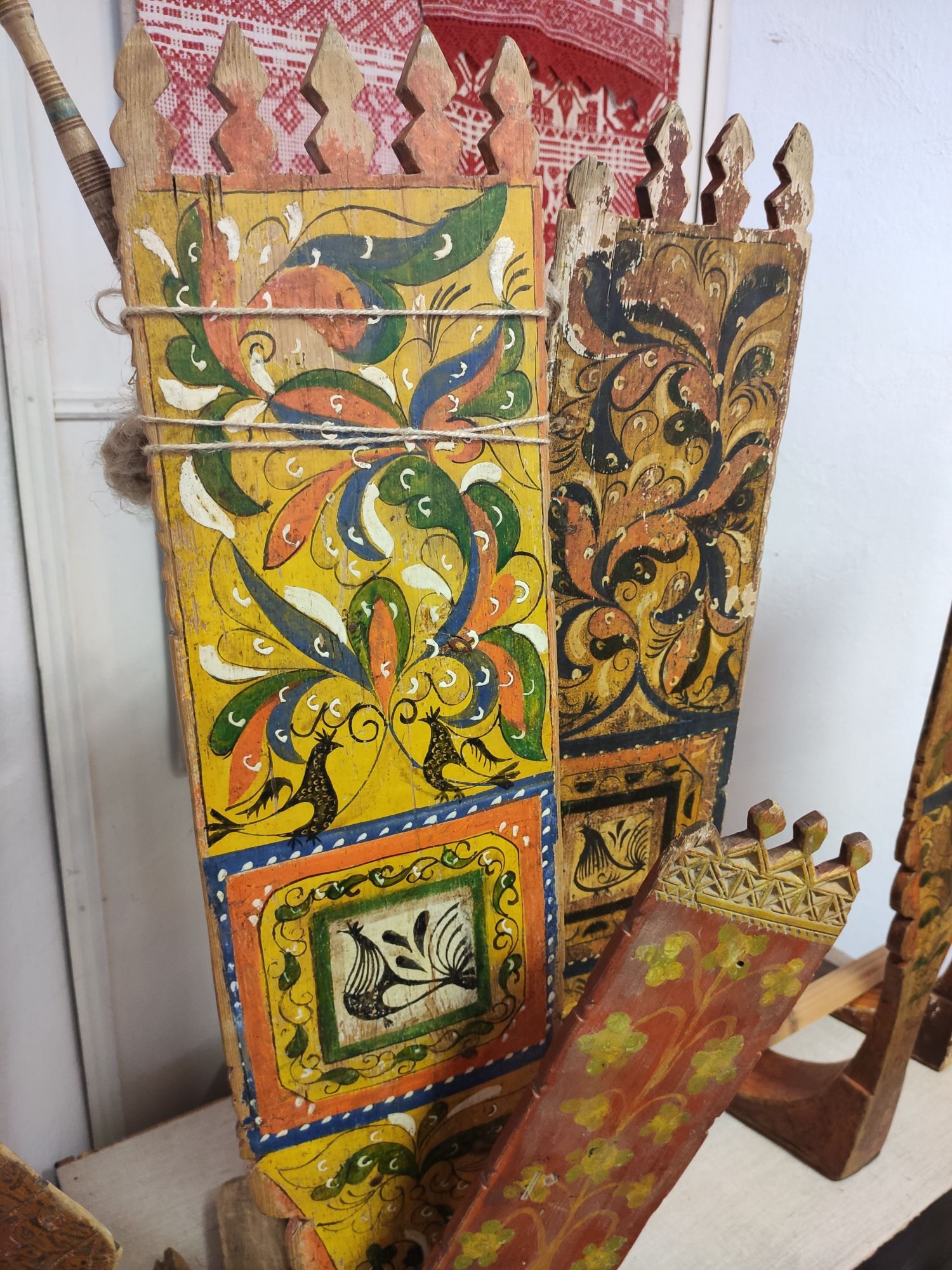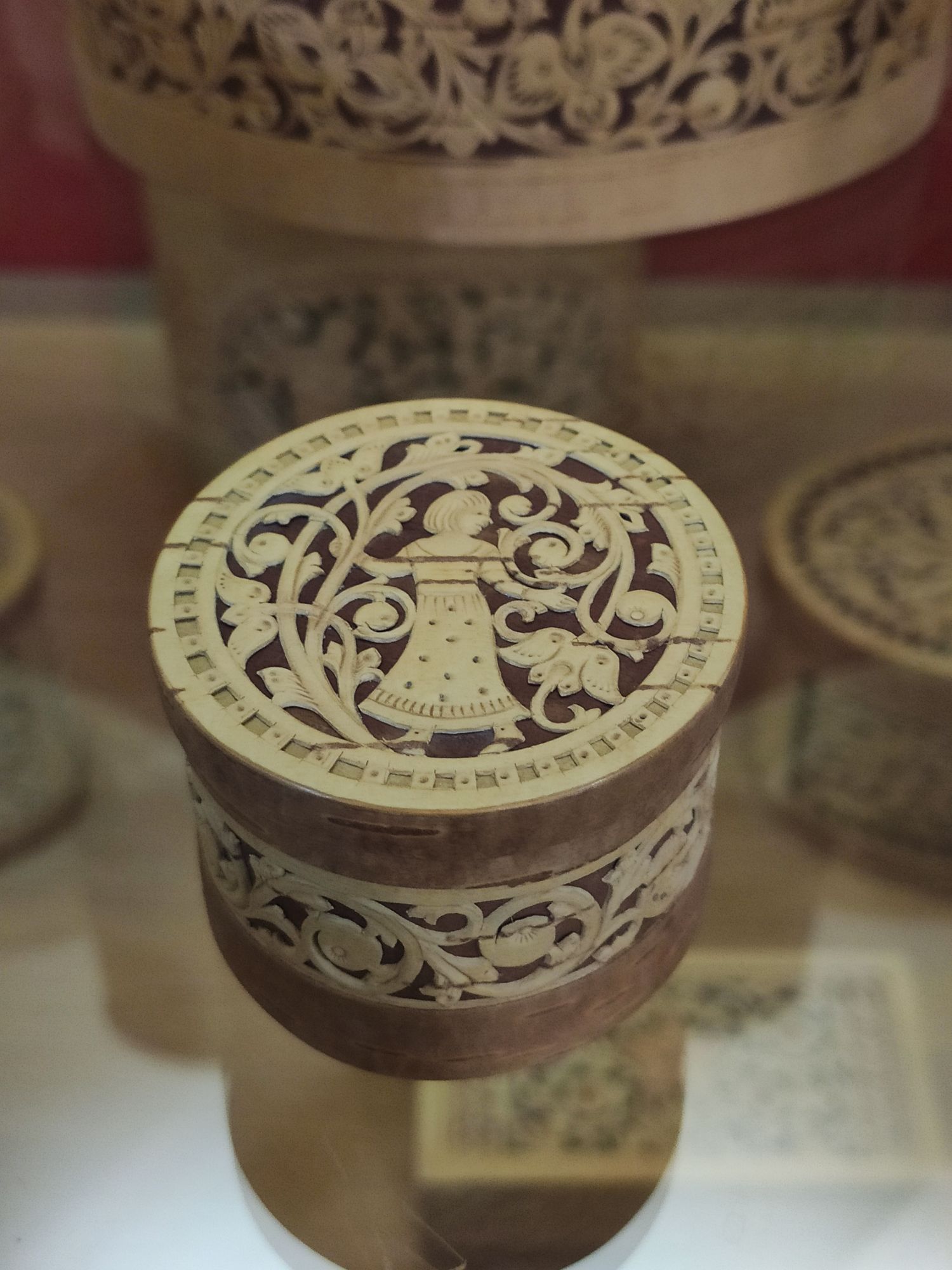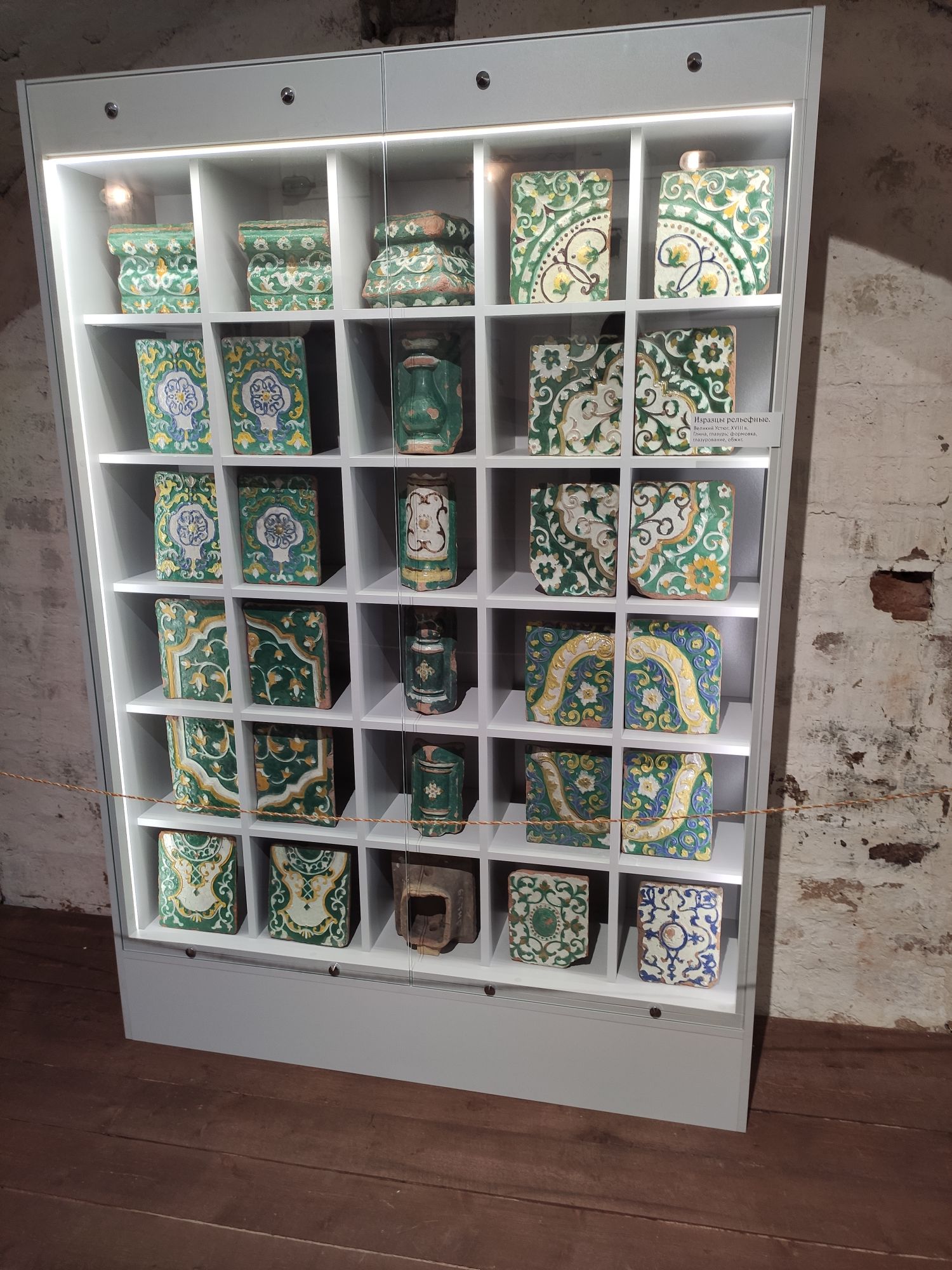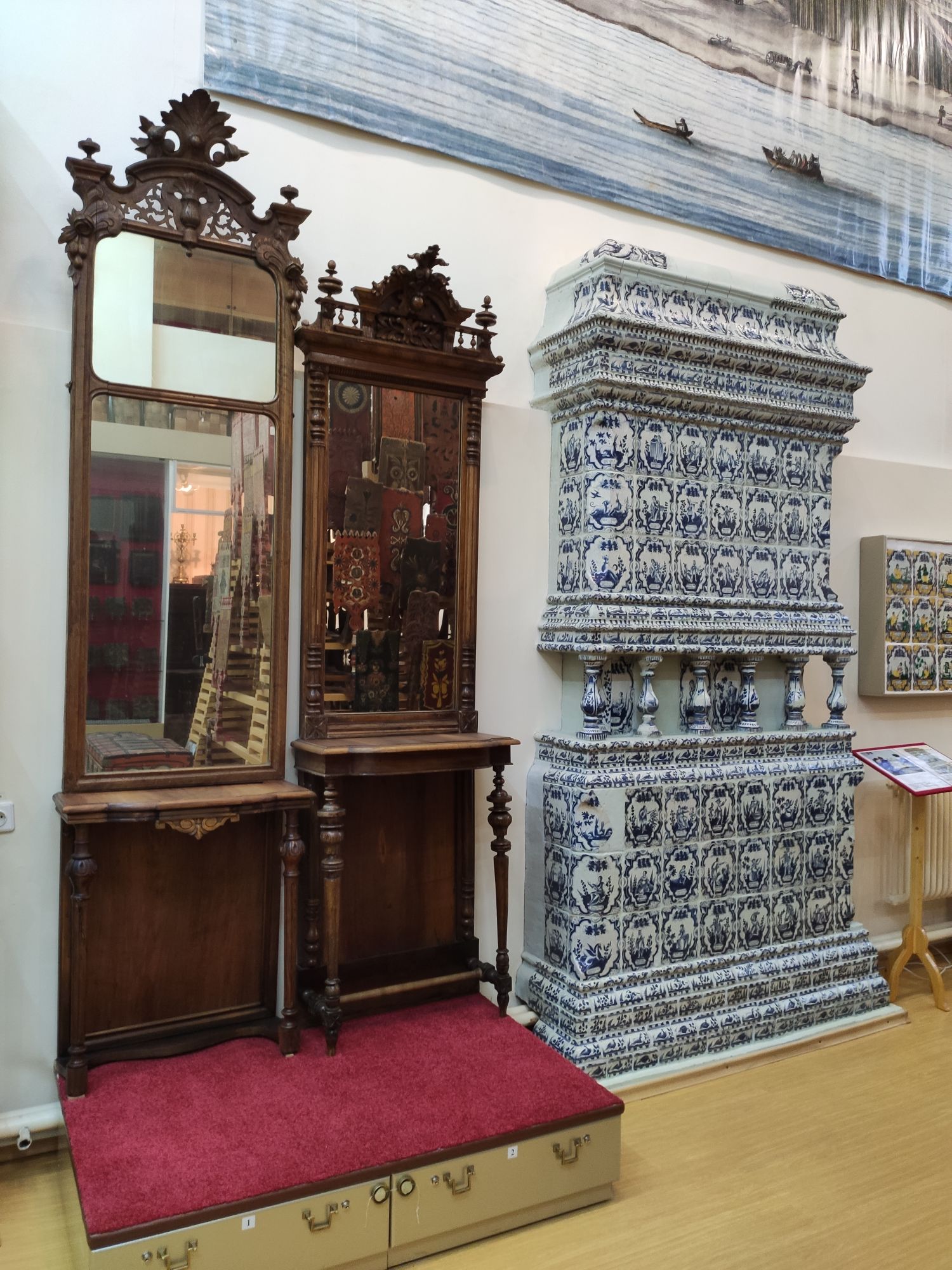 8 августа 2022 Продолжение. Великий Устюг. Город встретил нас изнуряющей жарой. Вообще, мы были очень голодные, поэтому начали с обеда))) Потом решили чуток пройтись. Шли от тени до тени и сторону улицы выбирали теневую. И вот идём мы за какими-то палаточками. Думали, что там просто рынок приехал и продают шторы/штаны/полотенца.... И тут опа - из-под палатки выглядывает огромный туесок с росписью. Ну и мы не смогли пройти мимо. Женька ушел в тень, а мы с Асей погуляли вдоль палаточек. Продавали разные изделия народных промыслов и всякие авторские вещицы. И мы бы ушли без покупок, если бы не вот этот лоток... Муж с женой делают вот таких куколок. В основном там парочки, занятые разными делами))) Визитку брала, но что-то найти не могу. Найду, выложу. Я купила Женьке подарок - бабулька и дедулька на мотоцикле)))) Прошли через Соборное дворище - центр В. Устюга с несколькими храмами. А дальше пошли в Депозитарий - это открытое хранение фондов музея (то, что не вошло в выставочные коллекции музеев Устюга на данный момент). Этот музей нам давно рекомендовала Маша из Тотьмы как самый крутой устюжский музей. (Но я продолжаю хотеть ещё и в краеведческий))) В Депозитарии мы взяли экскурсию. Нам досталась великолепная Инна Валерьевна. От нее мы узнали слово "шишебар" (или шишибар, не знаю)))). Это репейник. Нам рассказали, что когда выделили здание под фондохранилище, сотрудники пошли его смотреть. В здании в советское время был кинотеатр. И вот посреди зрительного зала рос огромный куст шишебара))) А сейчас в этом зале вот такая красота: Фото будет много, уж простите))) Город был купеческий, богатый. Сухона и Северная Двина - это торговые пути в свое время были. А богатые купцы любили, чтобы у них всё было самое лучшее. Поэтому изразцовых печей в городе было много. Жаль, что жители не очень это всё ценили. Чтобы увеличить жилплощадь, печи ломали. А сотрудники музея буквально на помойках собирали изразцы и уносили в музеи. Причем, производство наладили своё - из местной глины. Были даже свои сюжеты. Например "барочные часы". Ну и всякие веточки, травки)) А эти сюжетные изразцы я вообще обожаю. Надписи читать и картинки разглядывать всегда удовольствие. Типа "заяц дикой". Такие изразцы ещё в зелёной гамме встречаются. А на узких изразцах как мультик покадрово - собака увидела зайца и он начал от неё удирать, иногда оглядываясь. А ещё - дверцы и заслонки обычно делались с обратной стороны печи, а где изразцы было лицо. Без всяких заслонок. Но в музеях часто, чтобы показать и дверки, вставляют их в изразцовую сторону. Это дверка местного производства. В экспозиции много разной красивой мебели. Почему-то я не сфоткала красивый немецкий то ли буфет, то ли шкаф. В Великом Устюге буфеты назывались ресторанами. И каждая дверка и каждый ящичек запирались на ключ. Прятали там сладости от детей и спиртное от мужа))) Стенд с прялками. Часть прялок отсутствует - они на выставке в Кирилло-Белозерском монастыре. Обсуждаем прялки. Выясняется, что, во-первых, мы в курсе выставки и в курсе, что в Кирилло-Белозерском монастыре директор музея "болен" прялками и мечтал о выставке много лет)))) На нас Инна Валерьевна начинает коситься. Во-вторых, она перечисляет росписи - Мезенская, Двинская и, забывая слово, говорит - "ну на Р, только я забыла"... Из меня вылетает "Ракульская. Не знаю зачем я это знаю". Нам тут же вопро