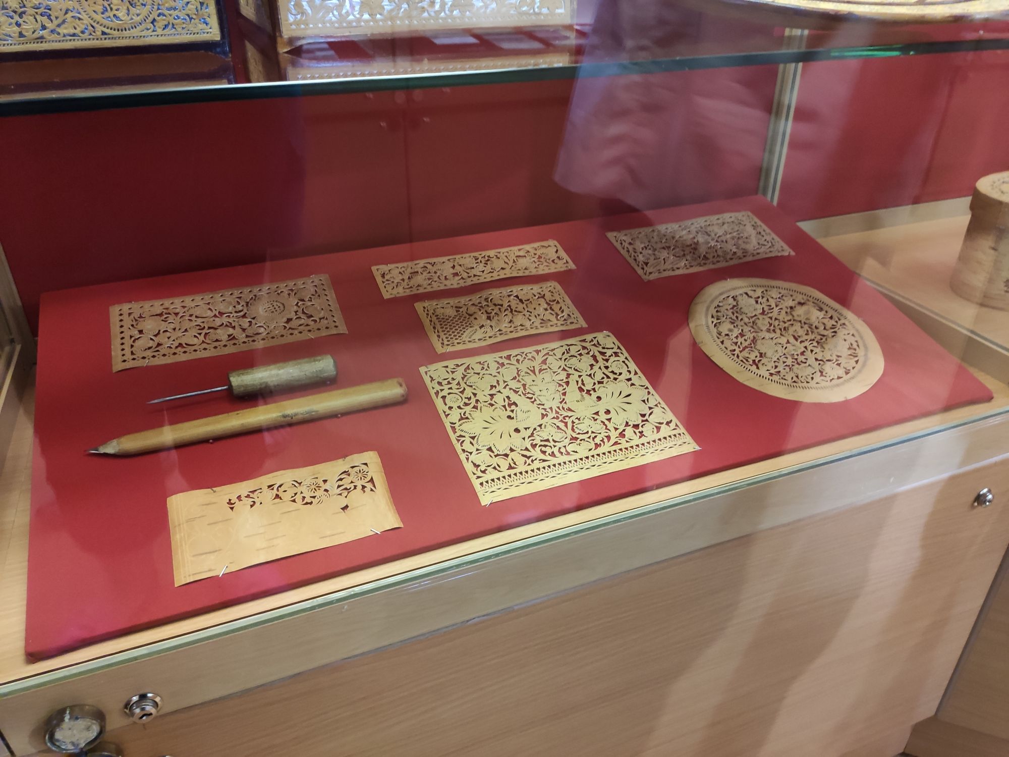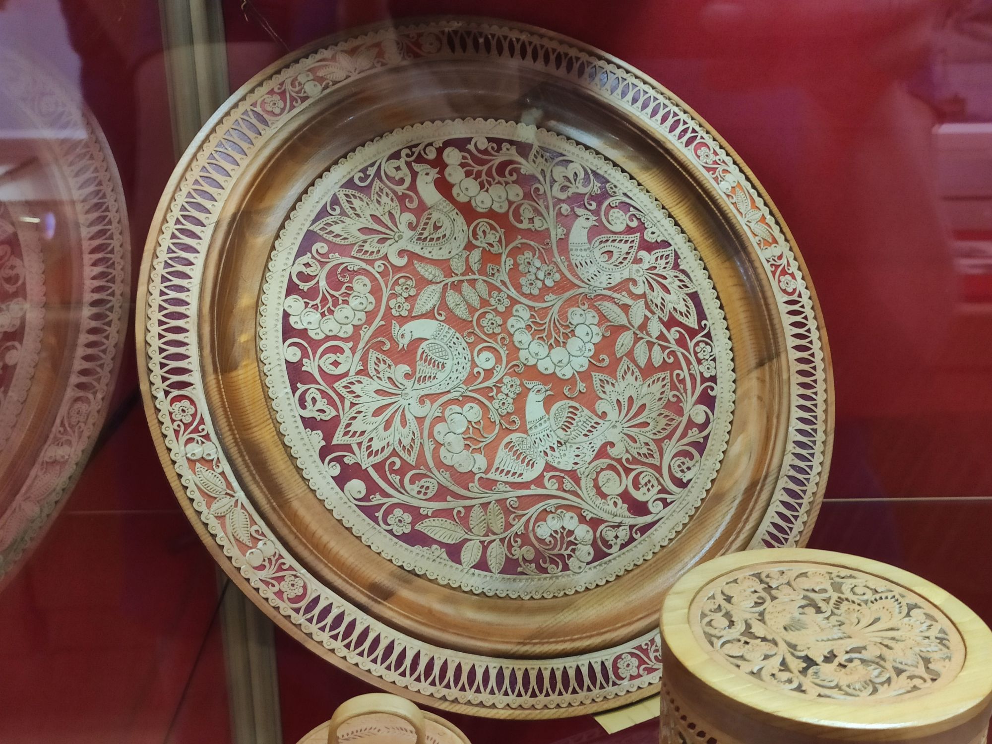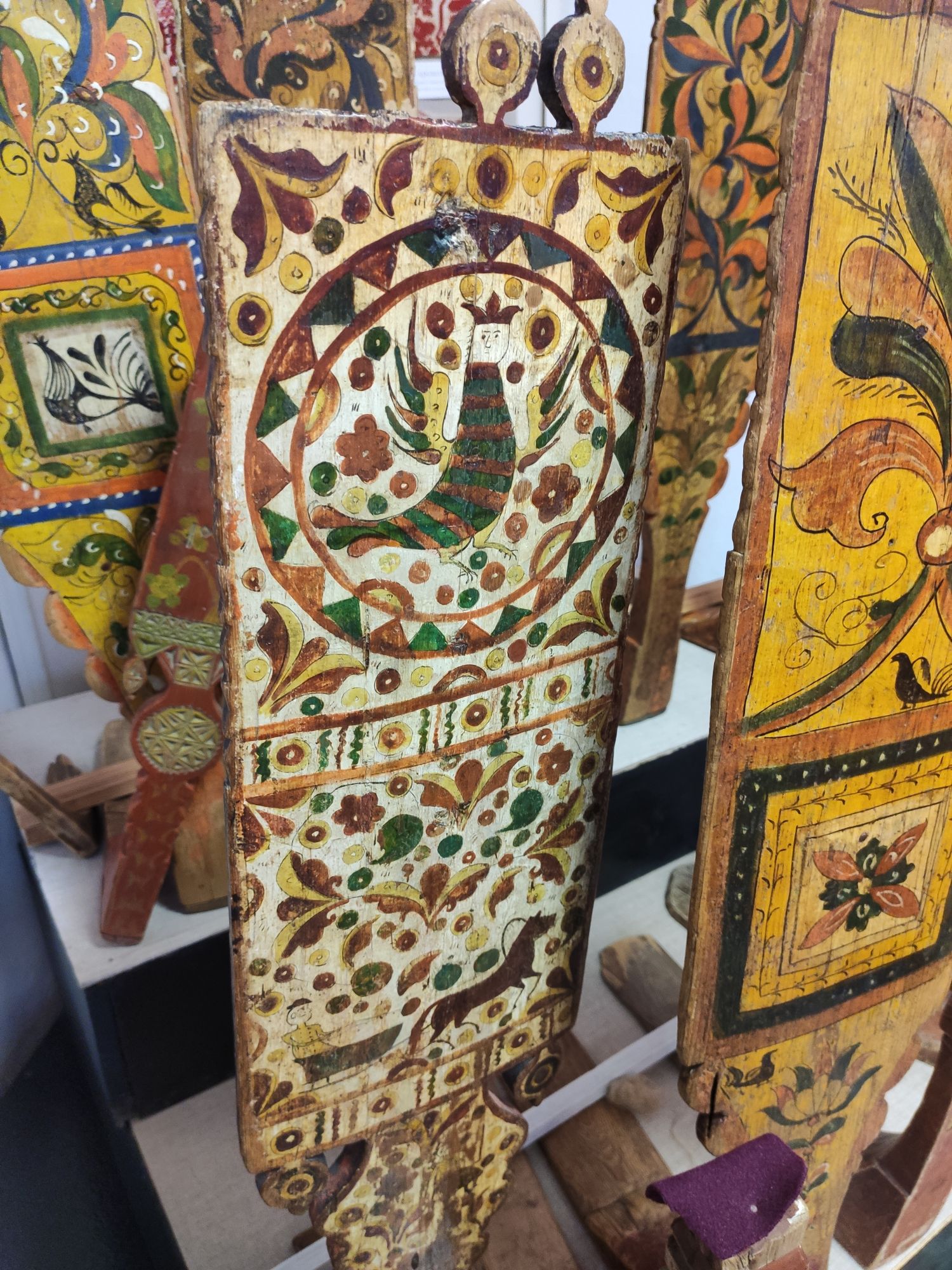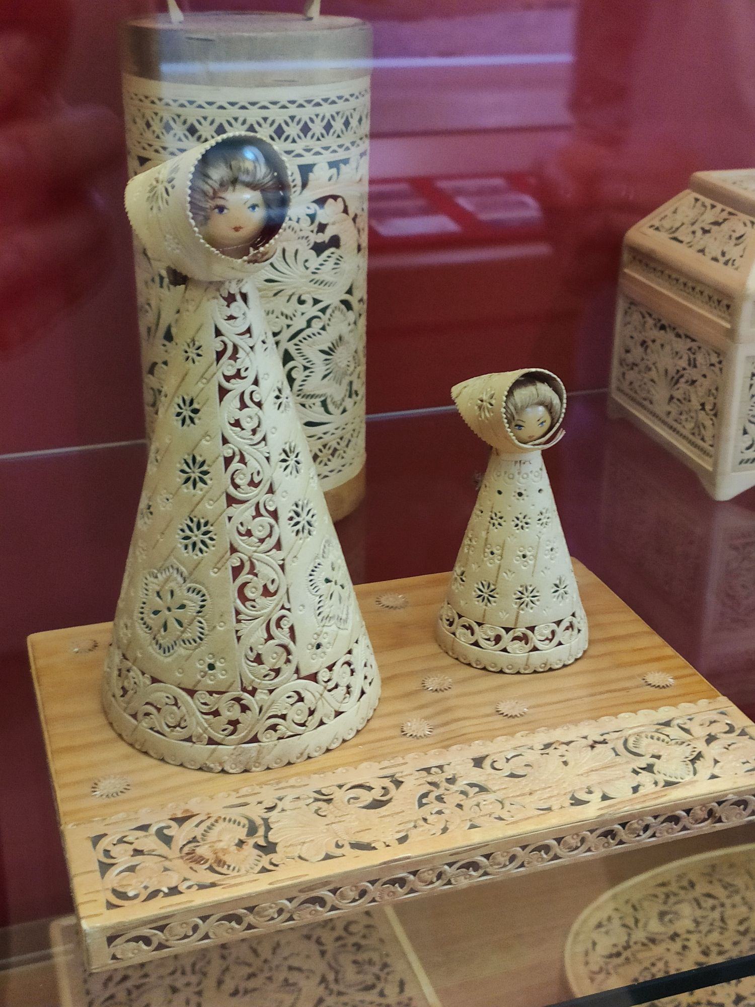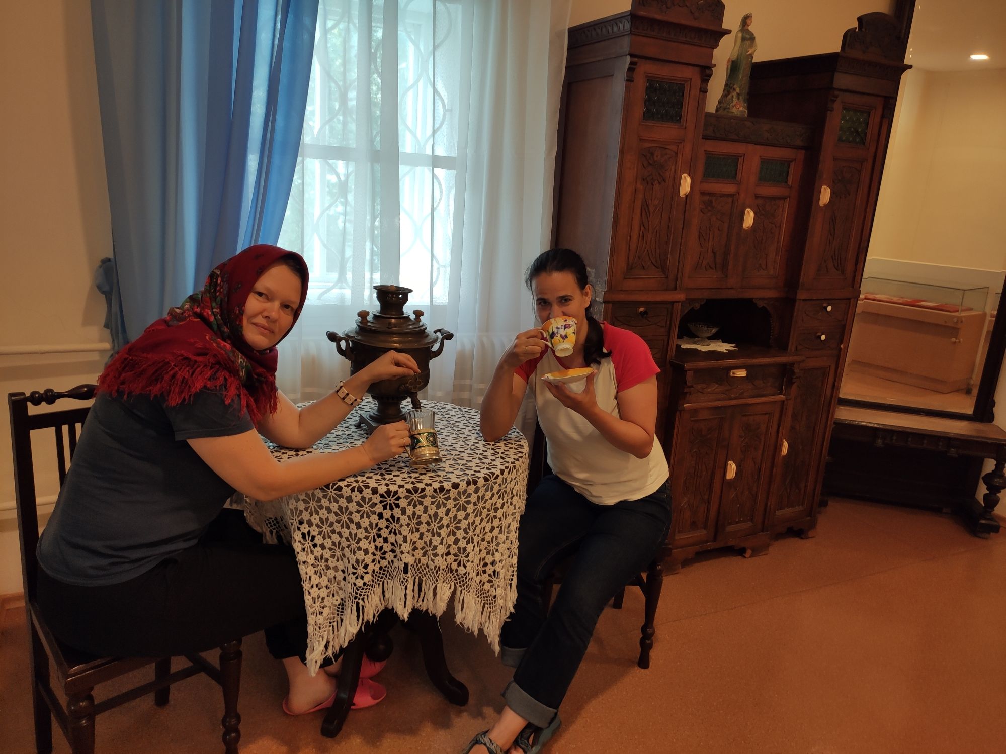 8 августа 2022 Продолжение. Великий Устюг. Город встретил нас изнуряющей жарой. Вообще, мы были очень голодные, поэтому начали с обеда))) Потом решили чуток пройтись. Шли от тени до тени и сторону улицы выбирали теневую. И вот идём мы за какими-то палаточками. Думали, что там просто рынок приехал и продают шторы/штаны/полотенца.... И тут опа - из-под палатки выглядывает огромный туесок с росписью. Ну и мы не смогли пройти мимо. Женька ушел в тень, а мы с Асей погуляли вдоль палаточек. Продавали разные изделия народных промыслов и всякие авторские вещицы. И мы бы ушли без покупок, если бы не вот этот лоток... Муж с женой делают вот таких куколок. В основном там парочки, занятые разными делами))) Визитку брала, но что-то найти не могу. Найду, выложу. Я купила Женьке подарок - бабулька и дедулька на мотоцикле)))) Прошли через Соборное дворище - центр В. Устюга с несколькими храмами. А дальше пошли в Депозитарий - это открытое хранение фондов музея (то, что не вошло в выставочные коллекции музеев Устюга на данный момент). Этот музей нам давно рекомендовала Маша из Тотьмы как самый крутой устюжский музей. (Но я продолжаю хотеть ещё и в краеведческий))) В Депозитарии мы взяли экскурсию. Нам досталась великолепная Инна Валерьевна. От нее мы узнали слово "шишебар" (или шишибар, не знаю)))). Это репейник. Нам рассказали, что когда выделили здание под фондохранилище, сотрудники пошли его смотреть. В здании в советское время был кинотеатр. И вот посреди зрительного зала рос огромный куст шишебара))) А сейчас в этом зале вот такая красота: Фото будет много, уж простите))) Город был купеческий, богатый. Сухона и Северная Двина - это торговые пути в свое время были. А богатые купцы любили, чтобы у них всё было самое лучшее. Поэтому изразцовых печей в городе было много. Жаль, что жители не очень это всё ценили. Чтобы увеличить жилплощадь, печи ломали. А сотрудники музея буквально на помойках собирали изразцы и уносили в музеи. Причем, производство наладили своё - из местной глины. Были даже свои сюжеты. Например "барочные часы". Ну и всякие веточки, травки)) А эти сюжетные изразцы я вообще обожаю. Надписи читать и картинки разглядывать всегда удовольствие. Типа "заяц дикой". Такие изразцы ещё в зелёной гамме встречаются. А на узких изразцах как мультик покадрово - собака увидела зайца и он начал от неё удирать, иногда оглядываясь. А ещё - дверцы и заслонки обычно делались с обратной стороны печи, а где изразцы было лицо. Без всяких заслонок. Но в музеях часто, чтобы показать и дверки, вставляют их в изразцовую сторону. Это дверка местного производства. В экспозиции много разной красивой мебели. Почему-то я не сфоткала красивый немецкий то ли буфет, то ли шкаф. В Великом Устюге буфеты назывались ресторанами. И каждая дверка и каждый ящичек запирались на ключ. Прятали там сладости от детей и спиртное от мужа))) Стенд с прялками. Часть прялок отсутствует - они на выставке в Кирилло-Белозерском монастыре. Обсуждаем прялки. Выясняется, что, во-первых, мы в курсе выставки и в курсе, что в Кирилло-Белозерском монастыре директор музея "болен" прялками и мечтал о выставке много лет)))) На нас Инна Валерьевна начинает коситься. Во-вторых, она перечисляет росписи - Мезенская, Двинская и, забывая слово, говорит - "ну на Р, только я забыла"... Из меня вылетает "Ракульская. Не знаю зачем я это знаю". Нам тут же вопро