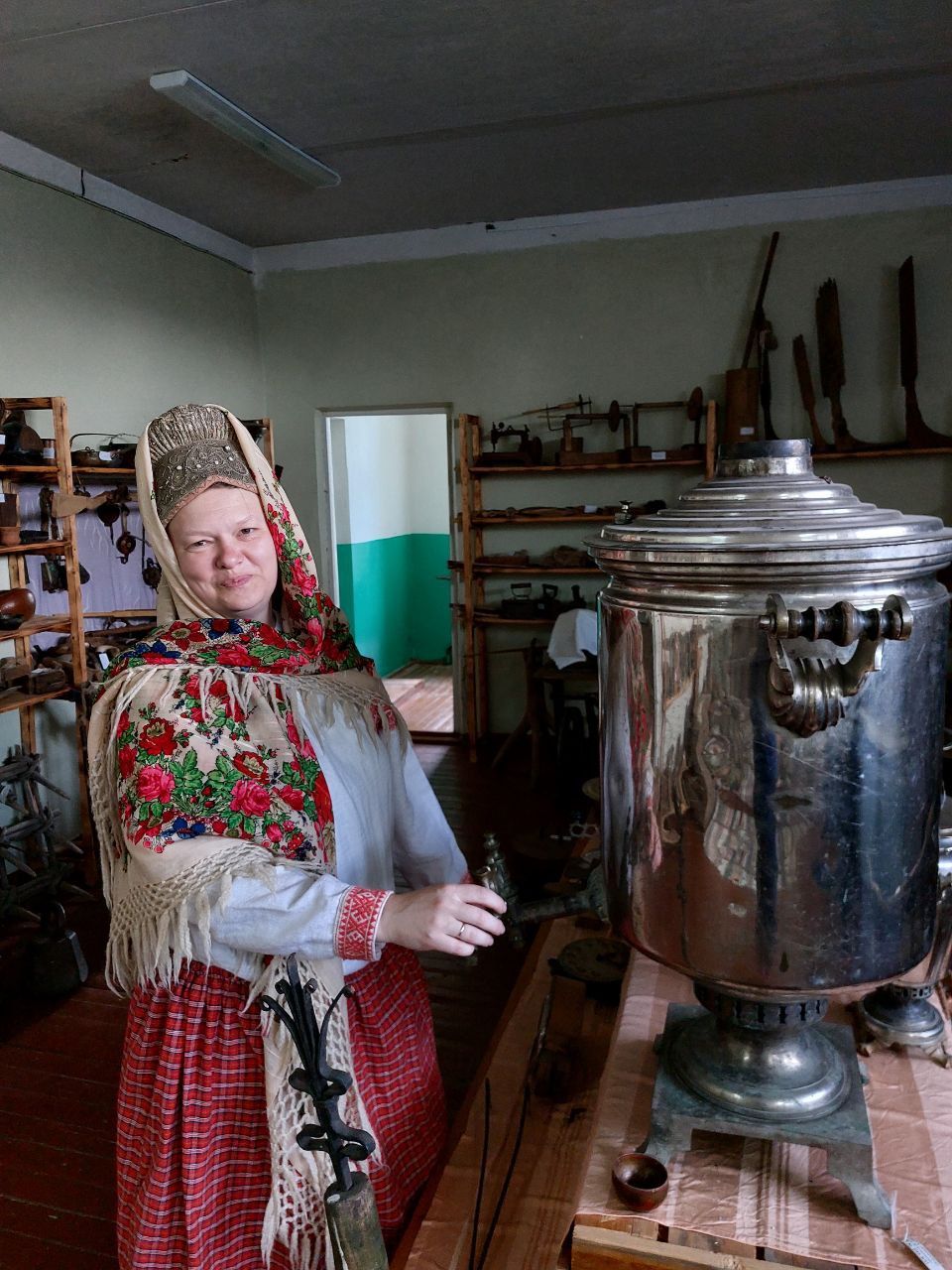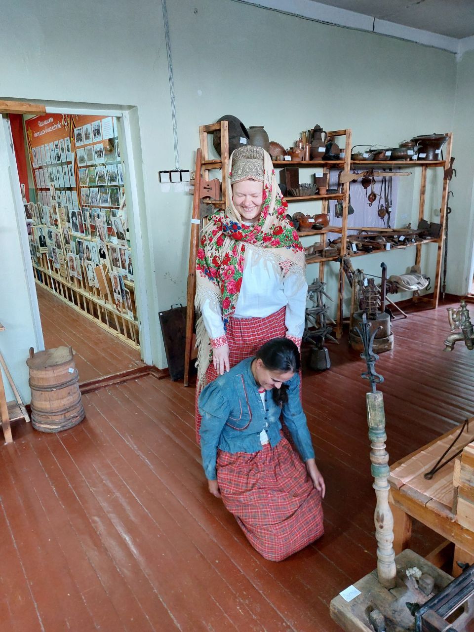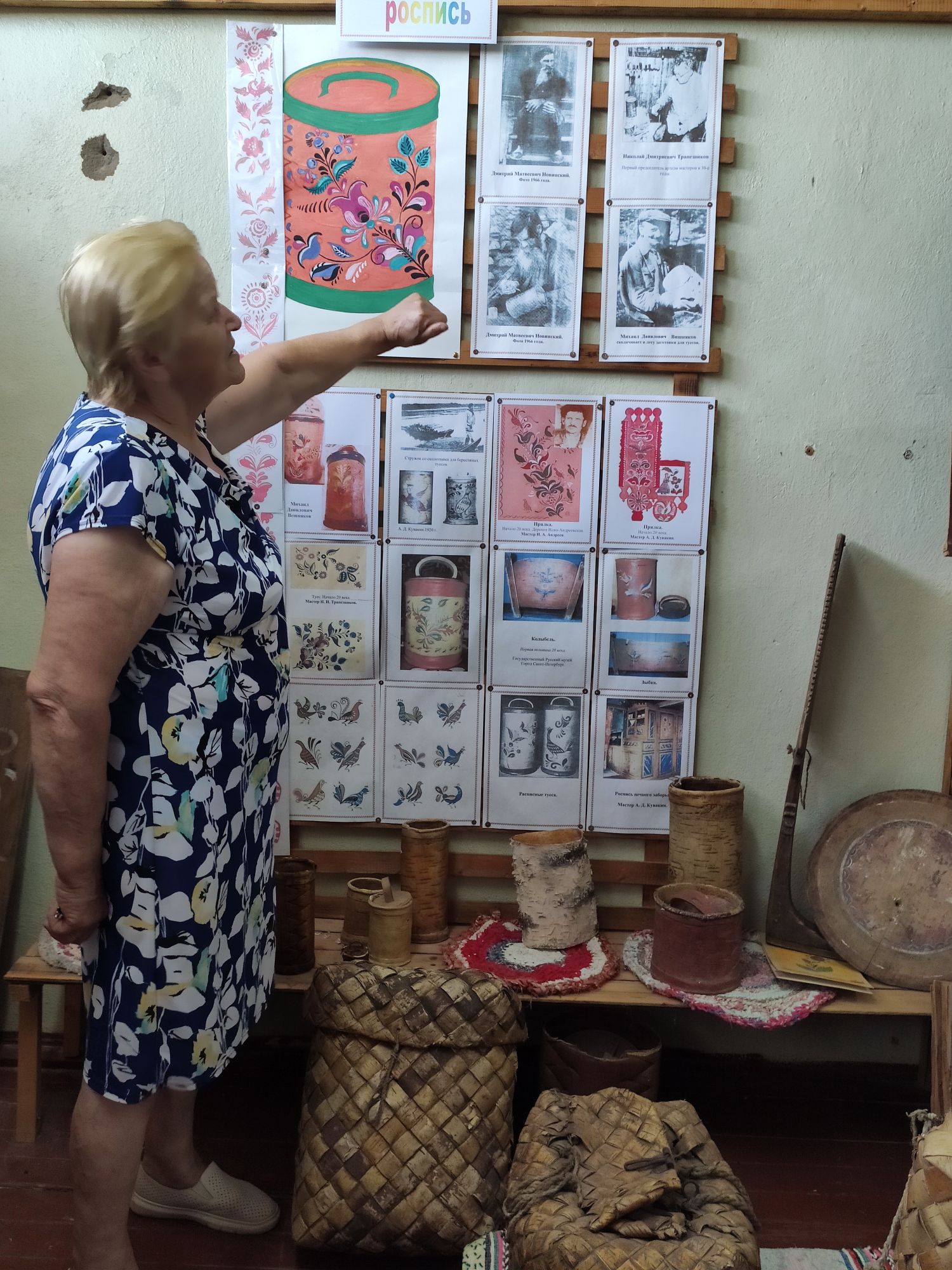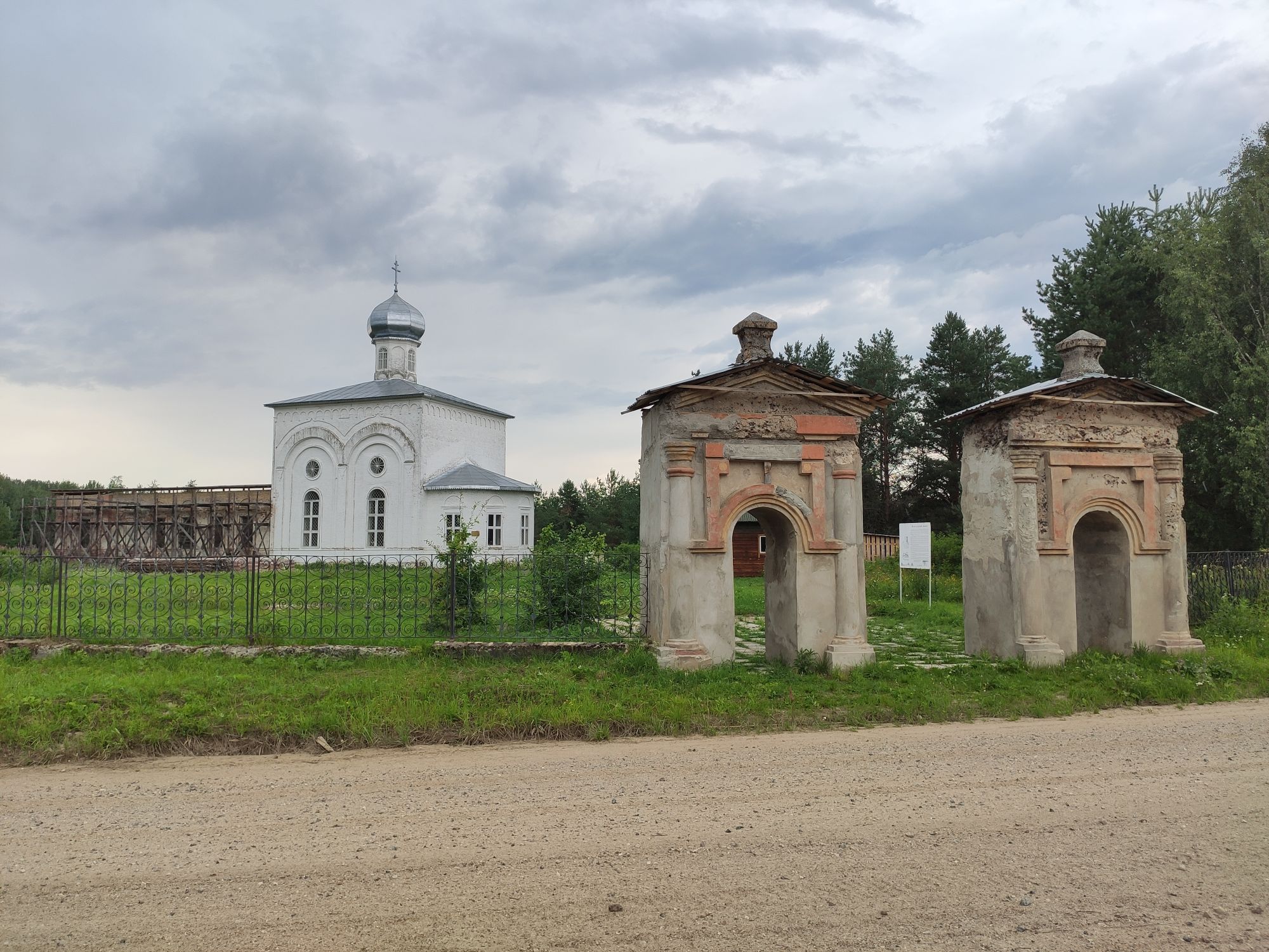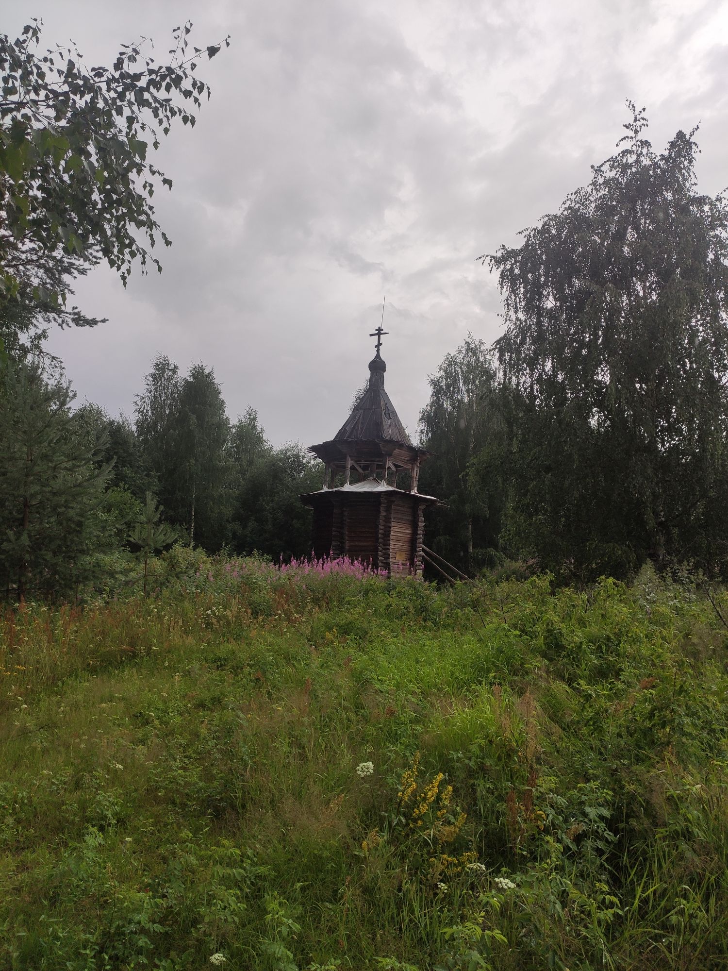 10 августа 2022 Подхватили мы Валентину Владимировну у ее дома и довезли до школы на нашей машине. Музей оказался школьный, но очень богатый на экспонаты. И, что ценно, всё подписано. Каждый предмет. Конечно, во всех местных музеях сетуют, что лучшие образцы увезли в Москву и Питер экспедиции, которые снаряжались сюда в ранне-советское время. Но в таких музеях ценно то, что ты как будто открыл бабушкин сундук и тебе всё можно потрогать и примерить. Можешь взять в руки вещь и понять какая она. Ася у себя в отчёте прекрасно описала этот музей, но я немного повторюсь))) В одном зале выставка предметов народного быта + верхнеуфтюжская роспись. Да, есть отдельное направление росписей такое. Я Погуглила про росписи этих мест. Похоже, что основную массу росписей привнесли старообрядцы (в этих местах их было очень много). Просто тут красители не те, росписи по дереву и бересте... Да и, возможно, не самыми мастерскими художниками... Скрытый текст Вот для примера фото старообрядческих книг из интернета. Интересный момент про художника Нестерова Михаила Васильевича. У него есть автопортрет, на котором изображен туес с верхнеуфтюжской росписью. Художник, побывав в этих краях был впечатлён и очарован севером. И после этого подобный туес появился почти на всех его дальнейших картинах. И, вроде как, хранится этот туес в музее в Уфе. Вот одна из статей на эту тему в сети. Ещё немного экспонатов. Погребушки для быстрого сбора ягод. Черники, например. До сих пор так собирают. В покатухе катали тесто перед тем, как его "посадить" на "грядку" - доска на высоте головы в районе печи. Там тесто поднималось "росло". Вот про эту красную штуку мы спросили, но все трое забыли зачем она)))) Вроде туда привязывали струну и использование как-то связано с шерстью. Но это неточно. Я в ВК написала Валентине Владимировне, но не знаю - ответит ли))) В корчаге варили пиво. А когда пиво варили в больших корчагах на продажу или на большие праздники, то разливали его огромным ковшом с одного из первых фото. Это крюк для закрепления груза на санях. Если я вру, то муж поправит))) Ну и мы перешли в следующую комнатку, которая нам подарила потрясную фотосессию и "татарчонка" (про это у Аси в теме подробно Лучшие фото я приносила. Теперь бэкстейдж практически))) Видео не принесу))) Ну и в следующем зале, в котором находится убранство комнаты с печью, перенесенное из одной из местных изб, фотосессия продолжилась. Были ещё залы, где сохраняется память школы и память о Великой Отечественной Войне. Но там я не фотографировала. И ещё, внезапно, там же есть 2 иконы из церкви Дмитрия Солунского (там в самой церкви были пару икон с подобным письмом), но в церковь их забирать не торопятся почему-то... Денег за экскурсию брать отказывались, но мы всё-таки настояли на том, что это на развитие музея - новые стенды, бумага, файлики. Нам сказали, что всё обязательно учтут. Валентине Владимировне низкий поклон за то, что она делает. За то, что сохраняет память. За то, что растит (не она одна, но и она тоже) таких как Дарья, которую мы встретили в церкви. Уезжали из Верхней Уфтюги под дождичком. Очень вдохновлённые и наполненные. Наверное, каждый своим. Но было тепло и хорошо на душе. В Белой Слуде остановились у симпатичной церкви. Про нее там всё написано на щите. Но можно ещё и вот тут почитать. В 1963 году тут сгорела церковь очень похожа