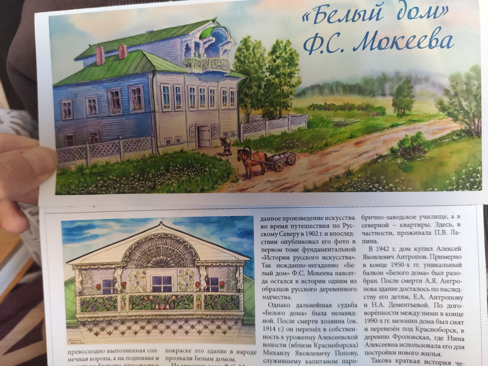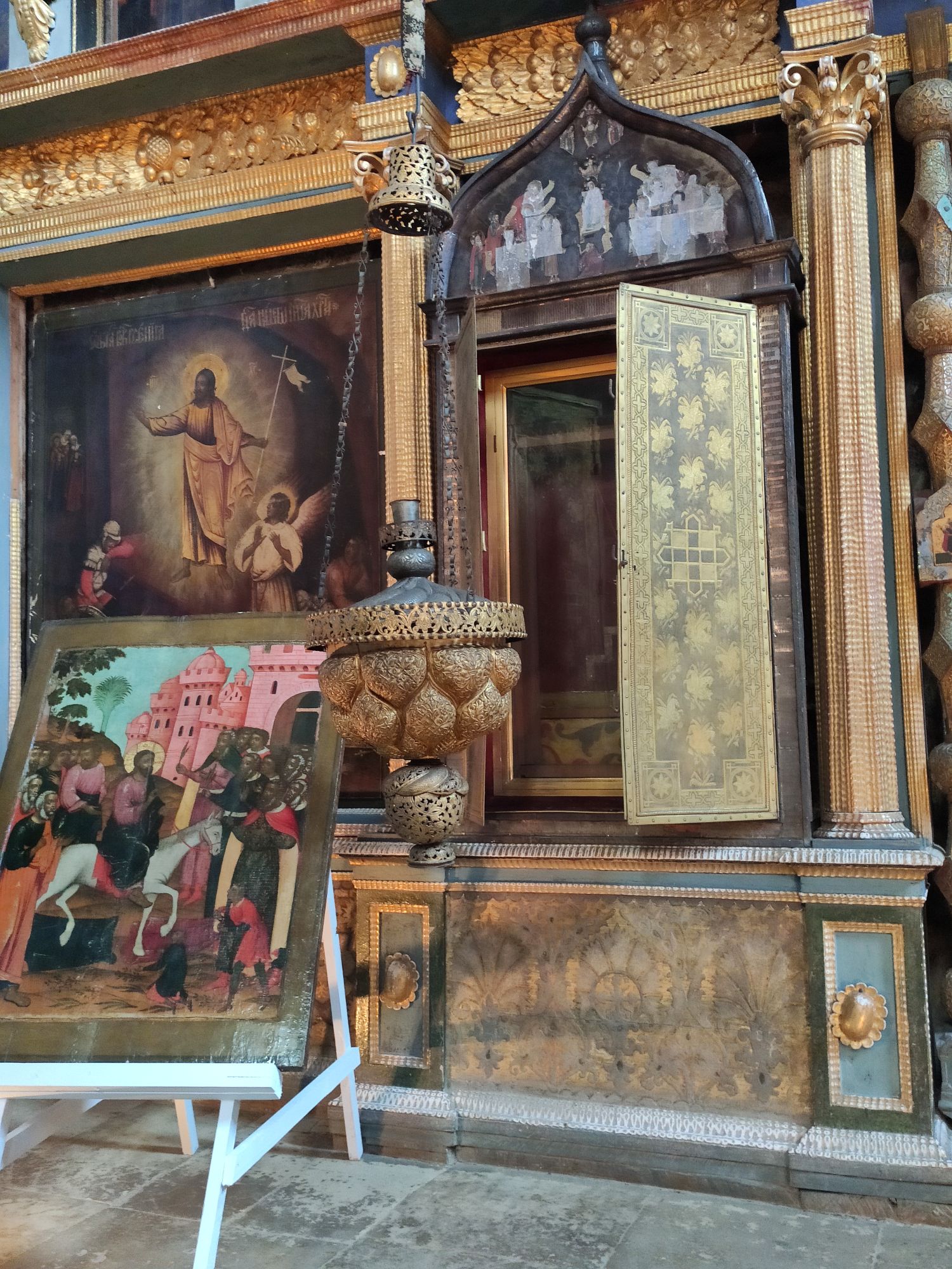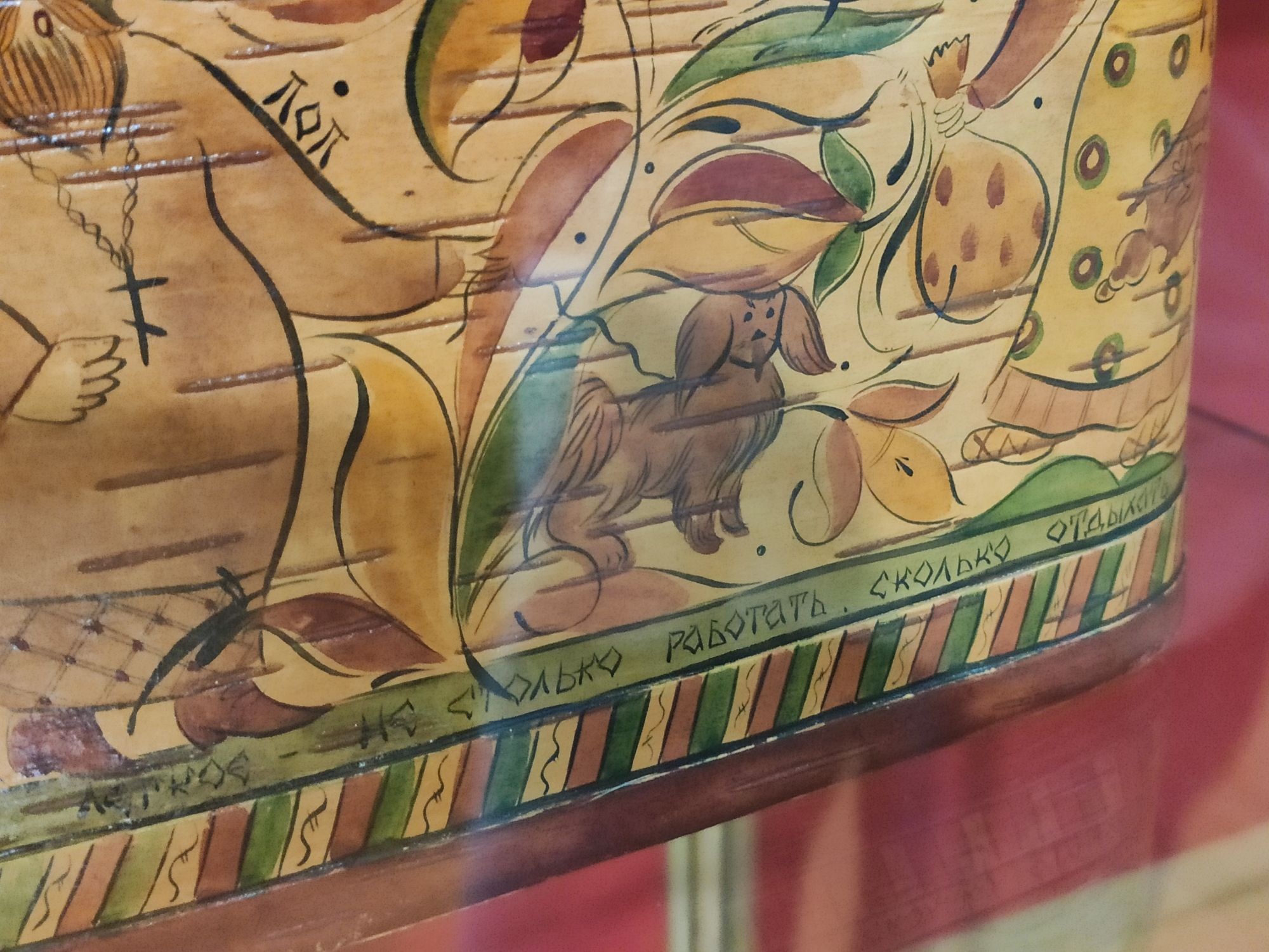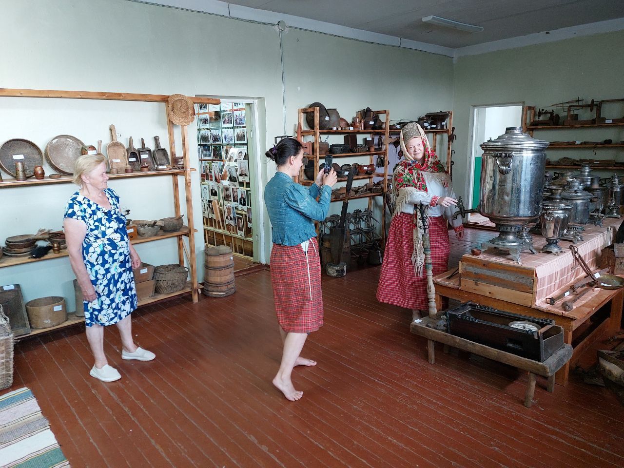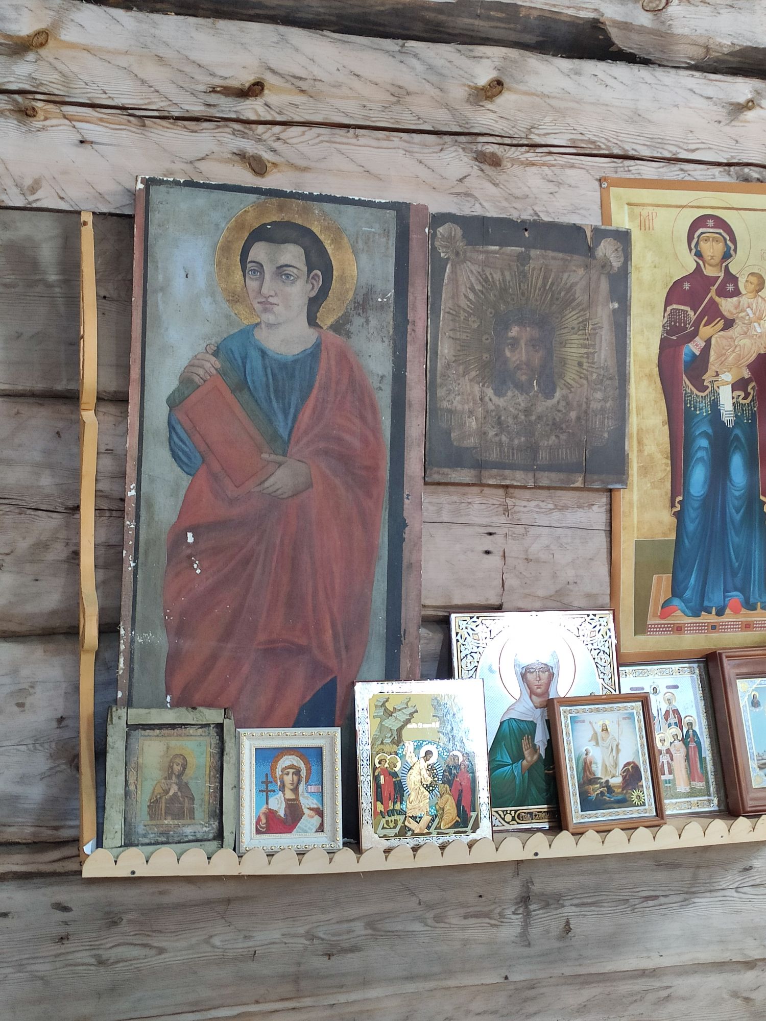 10 августа 2022 Подхватили мы Валентину Владимировну у ее дома и довезли до школы на нашей машине. Музей оказался школьный, но очень богатый на экспонаты. И, что ценно, всё подписано. Каждый предмет. Конечно, во всех местных музеях сетуют, что лучшие образцы увезли в Москву и Питер экспедиции, которые снаряжались сюда в ранне-советское время. Но в таких музеях ценно то, что ты как будто открыл бабушкин сундук и тебе всё можно потрогать и примерить. Можешь взять в руки вещь и понять какая она. Ася у себя в отчёте прекрасно описала этот музей, но я немного повторюсь))) В одном зале выставка предметов народного быта + верхнеуфтюжская роспись. Да, есть отдельное направление росписей такое. Я Погуглила про росписи этих мест. Похоже, что основную массу росписей привнесли старообрядцы (в этих местах их было очень много). Просто тут красители не те, росписи по дереву и бересте... Да и, возможно, не самыми мастерскими художниками... Скрытый текст Вот для примера фото старообрядческих книг из интернета. Интересный момент про художника Нестерова Михаила Васильевича. У него есть автопортрет, на котором изображен туес с верхнеуфтюжской росписью. Художник, побывав в этих краях был впечатлён и очарован севером. И после этого подобный туес появился почти на всех его дальнейших картинах. И, вроде как, хранится этот туес в музее в Уфе. Вот одна из статей на эту тему в сети. Ещё немного экспонатов. Погребушки для быстрого сбора ягод. Черники, например. До сих пор так собирают. В покатухе катали тесто перед тем, как его "посадить" на "грядку" - доска на высоте головы в районе печи. Там тесто поднималось "росло". Вот про эту красную штуку мы спросили, но все трое забыли зачем она)))) Вроде туда привязывали струну и использование как-то связано с шерстью. Но это неточно. Я в ВК написала Валентине Владимировне, но не знаю - ответит ли))) В корчаге варили пиво. А когда пиво варили в больших корчагах на продажу или на большие праздники, то разливали его огромным ковшом с одного из первых фото. Это крюк для закрепления груза на санях. Если я вру, то муж поправит))) Ну и мы перешли в следующую комнатку, которая нам подарила потрясную фотосессию и "татарчонка" (про это у Аси в теме подробно Лучшие фото я приносила. Теперь бэкстейдж практически))) Видео не принесу))) Ну и в следующем зале, в котором находится убранство комнаты с печью, перенесенное из одной из местных изб, фотосессия продолжилась. Были ещё залы, где сохраняется память школы и память о Великой Отечественной Войне. Но там я не фотографировала. И ещё, внезапно, там же есть 2 иконы из церкви Дмитрия Солунского (там в самой церкви были пару икон с подобным письмом), но в церковь их забирать не торопятся почему-то... Денег за экскурсию брать отказывались, но мы всё-таки настояли на том, что это на развитие музея - новые стенды, бумага, файлики. Нам сказали, что всё обязательно учтут. Валентине Владимировне низкий поклон за то, что она делает. За то, что сохраняет память. За то, что растит (не она одна, но и она тоже) таких как Дарья, которую мы встретили в церкви. Уезжали из Верхней Уфтюги под дождичком. Очень вдохновлённые и наполненные. Наверное, каждый своим. Но было тепло и хорошо на душе. В Белой Слуде остановились у симпатичной церкви. Про нее там всё написано на щите. Но можно ещё и вот тут почитать. В 1963 году тут сгорела церковь очень похожа