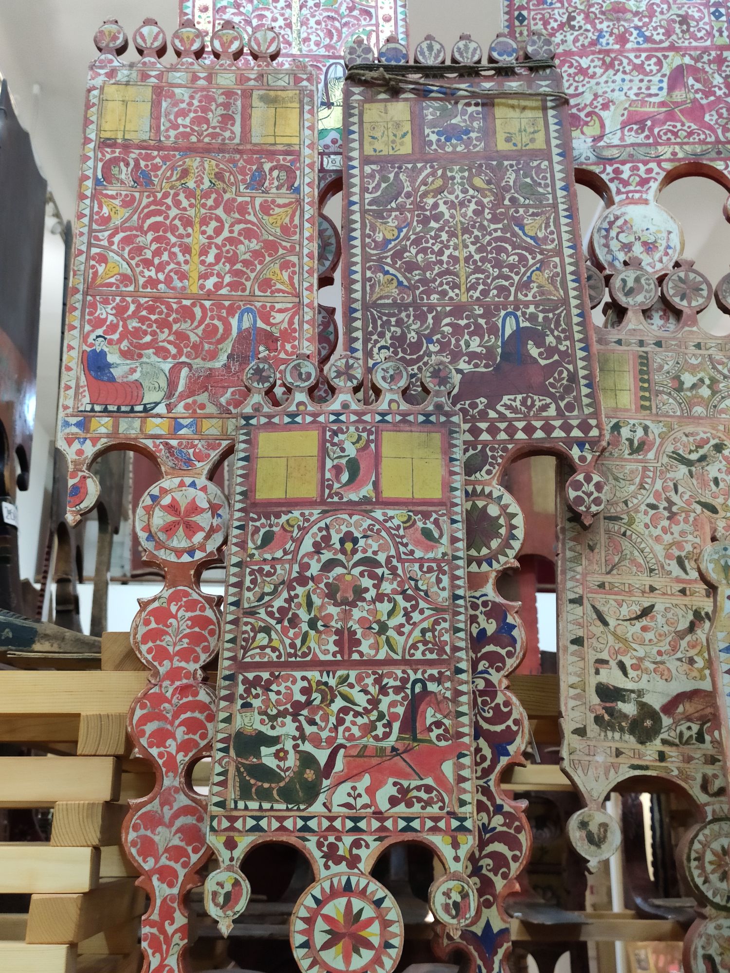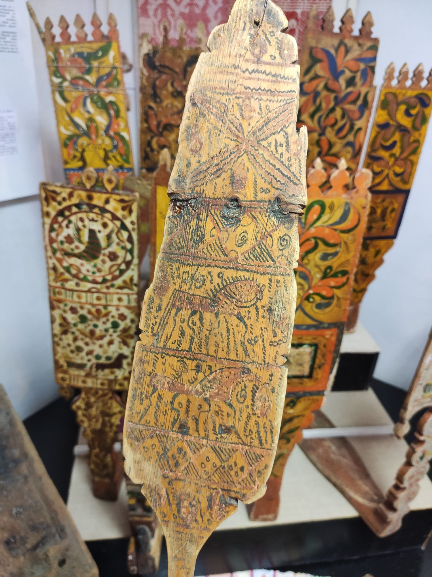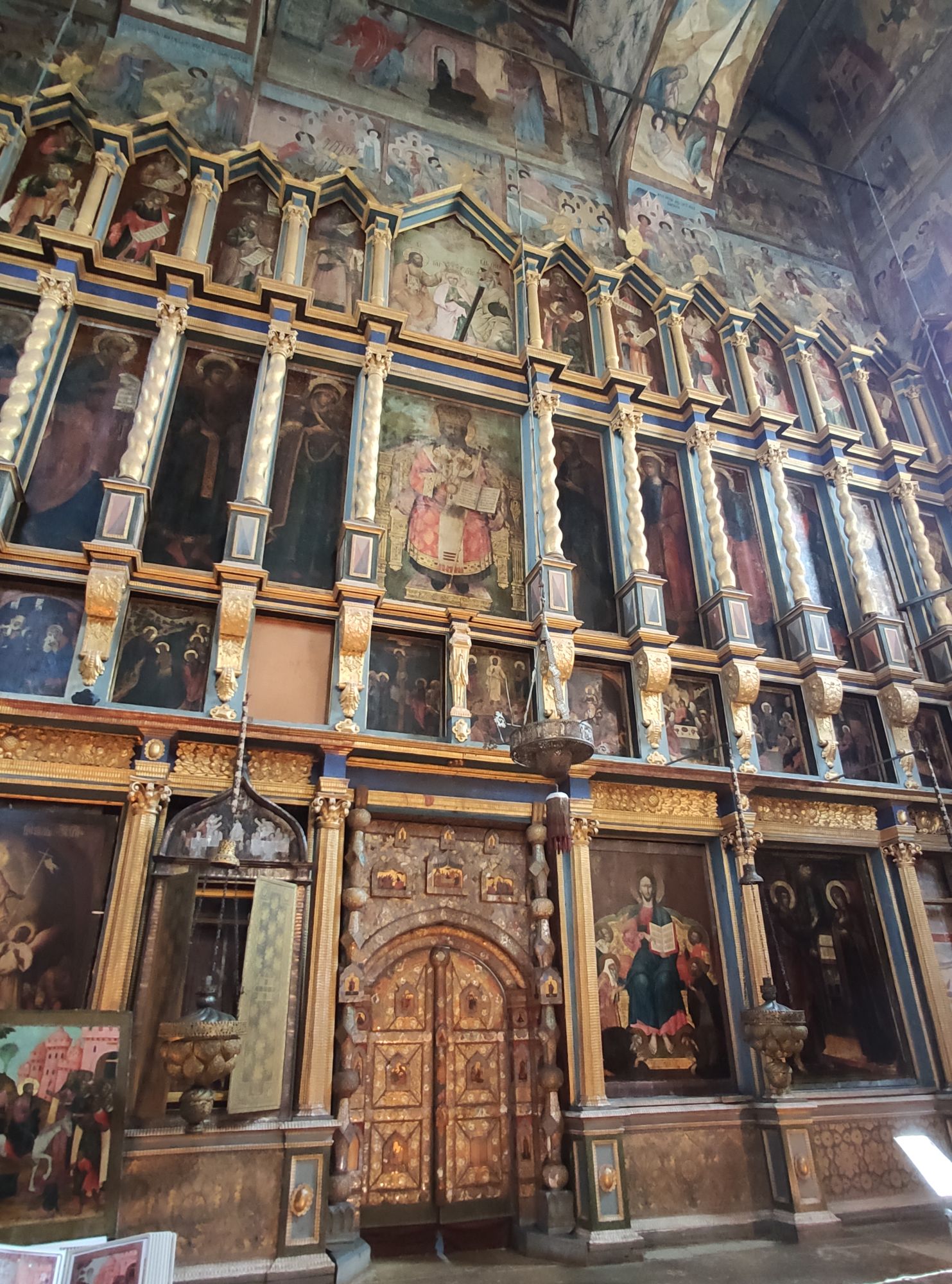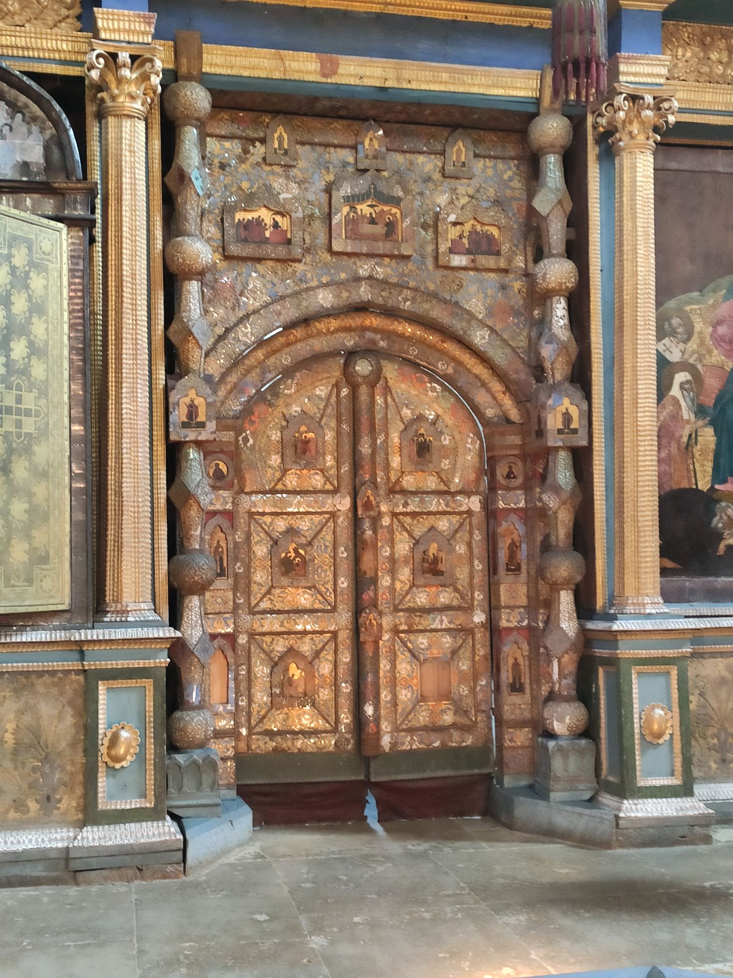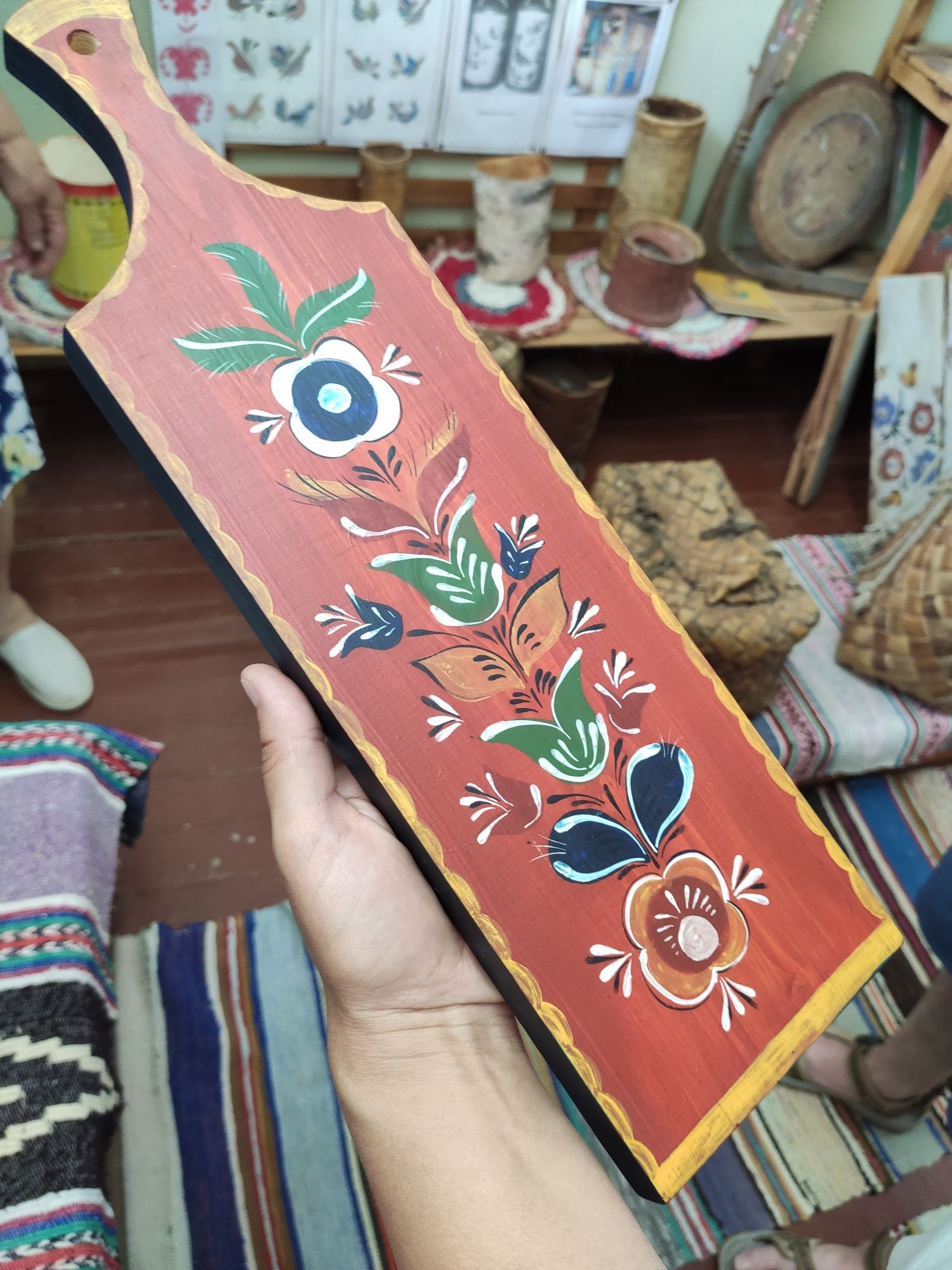 10 августа 2022 Подхватили мы Валентину Владимировну у ее дома и довезли до школы на нашей машине. Музей оказался школьный, но очень богатый на экспонаты. И, что ценно, всё подписано. Каждый предмет. Конечно, во всех местных музеях сетуют, что лучшие образцы увезли в Москву и Питер экспедиции, которые снаряжались сюда в ранне-советское время. Но в таких музеях ценно то, что ты как будто открыл бабушкин сундук и тебе всё можно потрогать и примерить. Можешь взять в руки вещь и понять какая она. Ася у себя в отчёте прекрасно описала этот музей, но я немного повторюсь))) В одном зале выставка предметов народного быта + верхнеуфтюжская роспись. Да, есть отдельное направление росписей такое. Я Погуглила про росписи этих мест. Похоже, что основную массу росписей привнесли старообрядцы (в этих местах их было очень много). Просто тут красители не те, росписи по дереву и бересте... Да и, возможно, не самыми мастерскими художниками... Скрытый текст Вот для примера фото старообрядческих книг из интернета. Интересный момент про художника Нестерова Михаила Васильевича. У него есть автопортрет, на котором изображен туес с верхнеуфтюжской росписью. Художник, побывав в этих краях был впечатлён и очарован севером. И после этого подобный туес появился почти на всех его дальнейших картинах. И, вроде как, хранится этот туес в музее в Уфе. Вот одна из статей на эту тему в сети. Ещё немного экспонатов. Погребушки для быстрого сбора ягод. Черники, например. До сих пор так собирают. В покатухе катали тесто перед тем, как его "посадить" на "грядку" - доска на высоте головы в районе печи. Там тесто поднималось "росло". Вот про эту красную штуку мы спросили, но все трое забыли зачем она)))) Вроде туда привязывали струну и использование как-то связано с шерстью. Но это неточно. Я в ВК написала Валентине Владимировне, но не знаю - ответит ли))) В корчаге варили пиво. А когда пиво варили в больших корчагах на продажу или на большие праздники, то разливали его огромным ковшом с одного из первых фото. Это крюк для закрепления груза на санях. Если я вру, то муж поправит))) Ну и мы перешли в следующую комнатку, которая нам подарила потрясную фотосессию и "татарчонка" (про это у Аси в теме подробно Лучшие фото я приносила. Теперь бэкстейдж практически))) Видео не принесу))) Ну и в следующем зале, в котором находится убранство комнаты с печью, перенесенное из одной из местных изб, фотосессия продолжилась. Были ещё залы, где сохраняется память школы и память о Великой Отечественной Войне. Но там я не фотографировала. И ещё, внезапно, там же есть 2 иконы из церкви Дмитрия Солунского (там в самой церкви были пару икон с подобным письмом), но в церковь их забирать не торопятся почему-то... Денег за экскурсию брать отказывались, но мы всё-таки настояли на том, что это на развитие музея - новые стенды, бумага, файлики. Нам сказали, что всё обязательно учтут. Валентине Владимировне низкий поклон за то, что она делает. За то, что сохраняет память. За то, что растит (не она одна, но и она тоже) таких как Дарья, которую мы встретили в церкви. Уезжали из Верхней Уфтюги под дождичком. Очень вдохновлённые и наполненные. Наверное, каждый своим. Но было тепло и хорошо на душе. В Белой Слуде остановились у симпатичной церкви. Про нее там всё написано на щите. Но можно ещё и вот тут почитать. В 1963 году тут сгорела церковь очень похожа