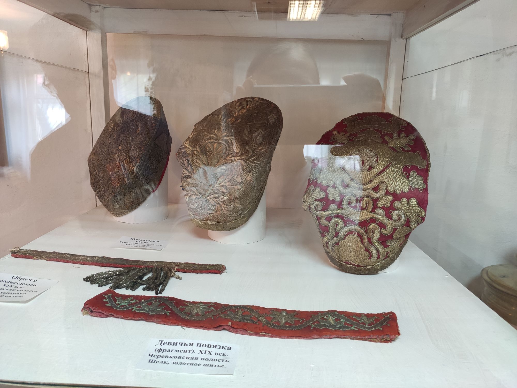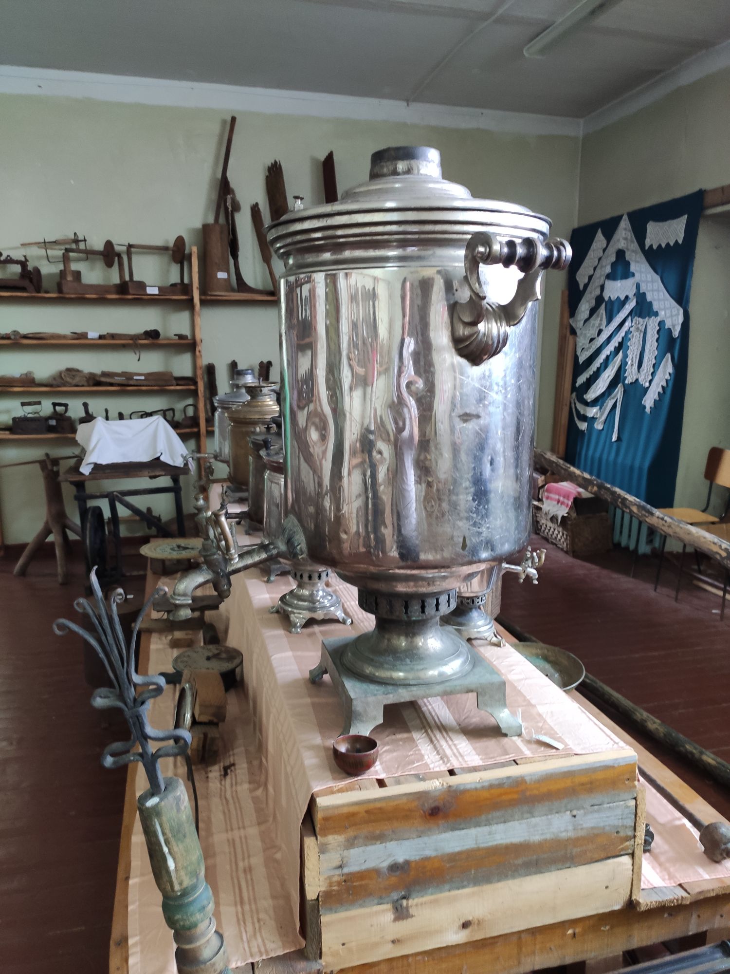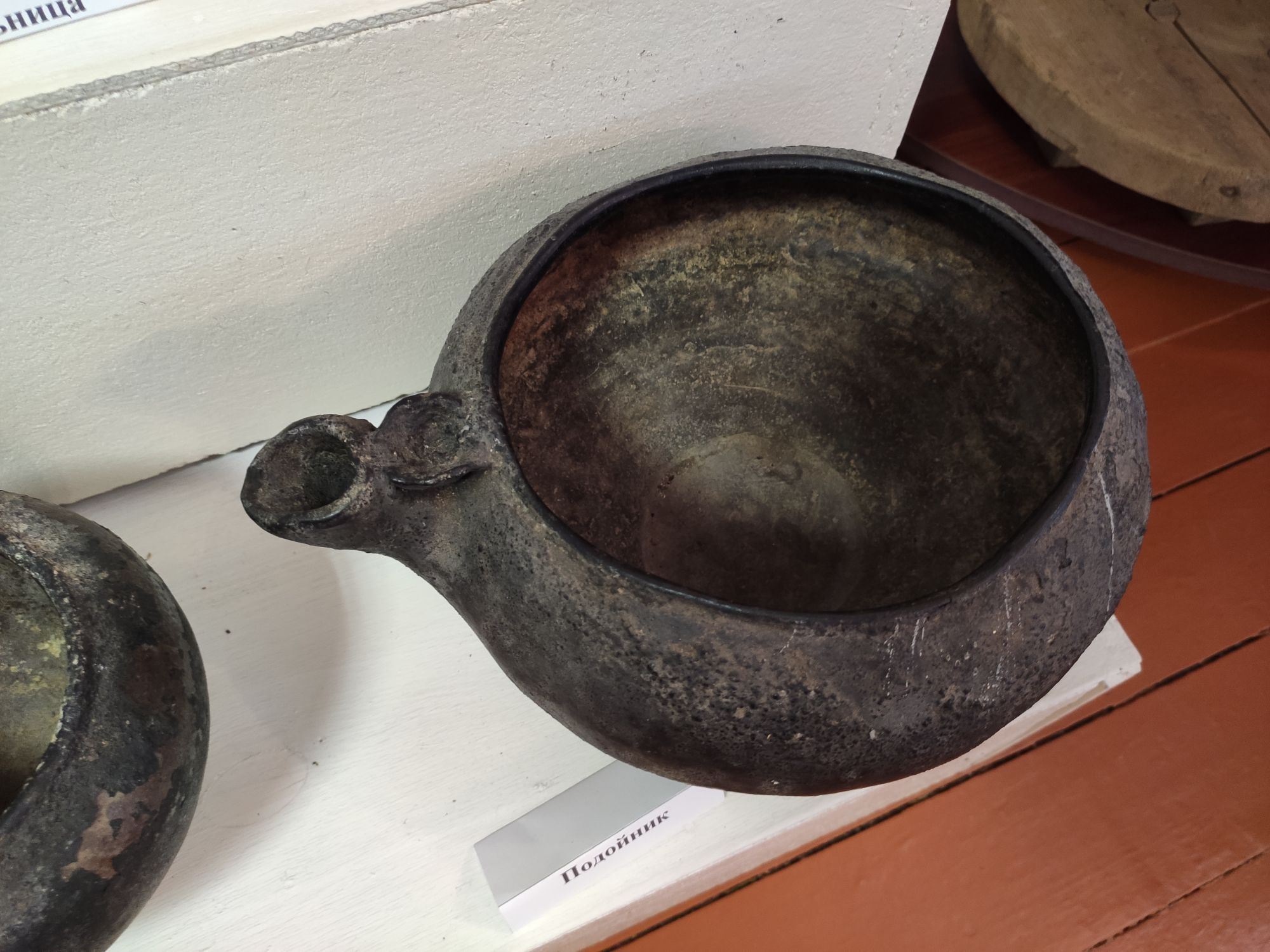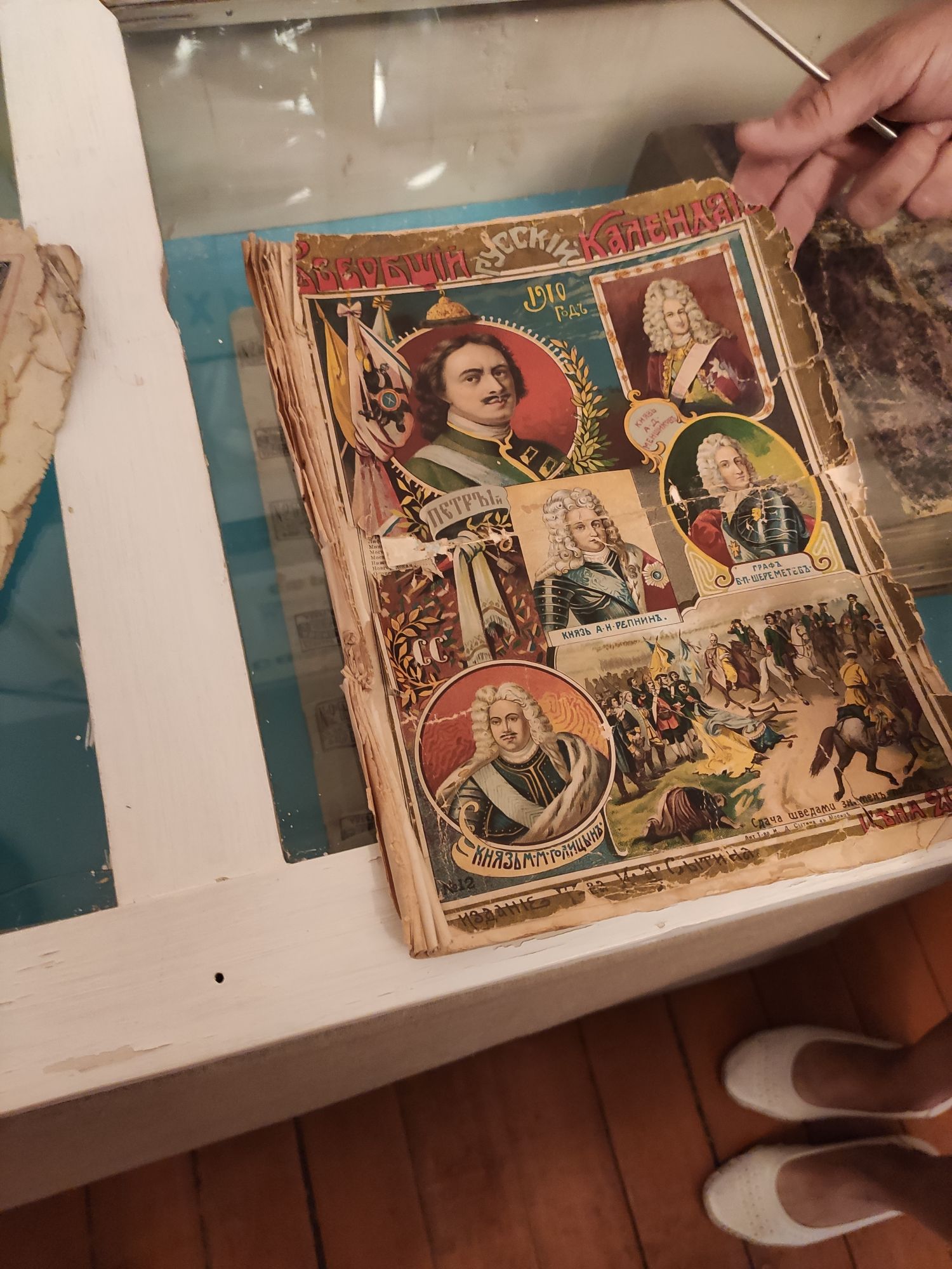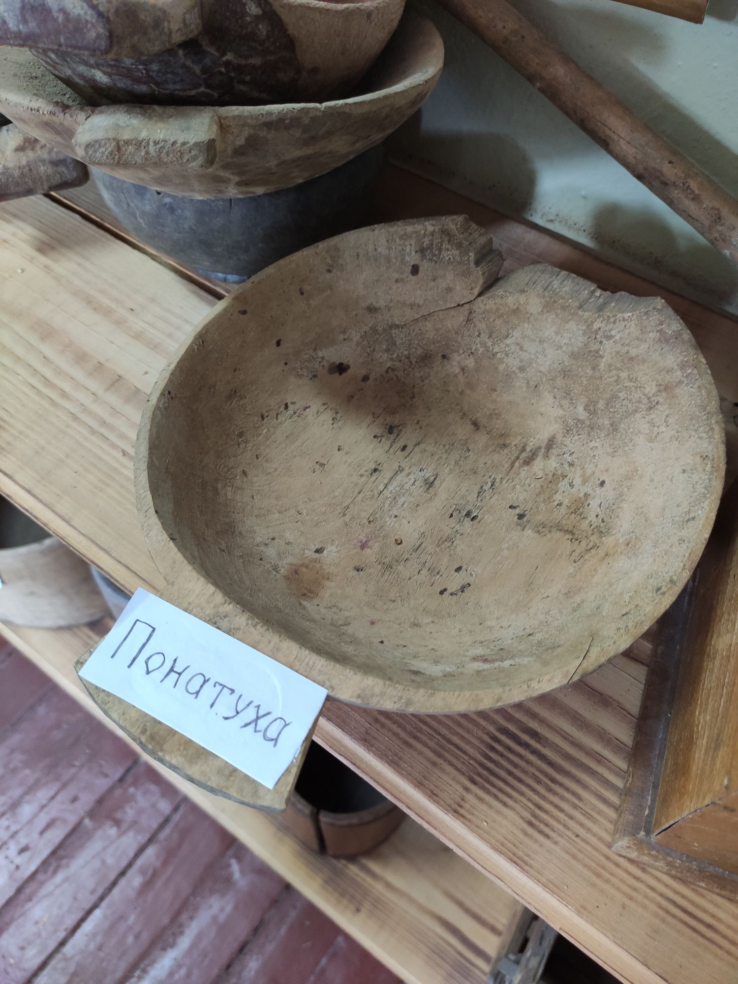 13 августа 2022 Черевковский музей оказался прекрасен всем, кроме запаха краски. Видимо, туристов/посетителей сейчас почти не бывает, поэтому решили быстренько покрасить внутри то, что надо. А тут мы... А у Аси ещё и голова самого утра болит. Тяжко ей было, т.к. ладно бы не интересно - ушел, сославшись на голову и дело с концом. Так нет - тут было очень интересно. И опять почти всё можно потрогать - и это прекрасно!))) Рассказ начался с общих данных про город. Мы узнали, что Черевково было одним из центров старообрядчества. И там даже старообрядческая церковь была. Но после прихода советской власти церковь перестроили в школу, если не ошибаюсь. На фото она такая приземистая из трёх двухскатных крыш. Потом показали часы и самовары. Про формы самоваров я себе даже заметку сделала: банка, рюмка, репка, яйцо и желудь)))) А дальше пошло раздолье. Кокошники и перчатки расшитые золотом тут лежали на витрине, зато костюмы все в доступе. Нам очень много рассказали про пошивы. Мы рассматривали швы, способы пошива, клины, вытачки, пуговицы, украшение бисером. Село было очень богатым, поэтому тут могли себе позволить такую красивую одежду. Немного зубов мамонта И идём смотреть предметы быта))) Огромная ступа/ларь, которой больше 200 лет. Фига на ручке на рубеле. Прялочки. Тут мы 4 росписи посмотрели. Ракульская. Основная особенность - птичка в квадрате (хотя на ранних может быть не птичка), а сверху древо, вырастающее из квадрата. Это пермогорская. Тут птицы сирин обычно изображены. И рисунок мелкий. Ну и это... Видишь прялку - загляни с обратной стороны, т.к. там частенько шедевры)))) Двинская роспись - тут четкое деление. Внизу обычно лошадь с повозкой, середина - растения и птицы, верх - разделен на три части, где крайние две как окошки. И Мезенская прялочка в плохом состоянии, но лошадки и птички характе́рные читаются. Саночки "оковыши" - для того, чтоб лучше скользили, их полозья обивали железом. Тяжёлые как не знаю что. Люлька или зыбка. Старообрядческая - на ней в изголовье изображён восьмиконечный крест. И год написан. Из керамических сосудов нам показали те, что редко встречаются. Кадильница - в ней хранили тлеющие угольки на случай, если печь потухнет, например, или разжечь где что надо. Вместо спичек) Необычный подойник. Там есть выемка для кусочка сливочного масла, которым смазывали вымя корове. И дегтярница. Название говорит само за себя. В ней делали и хранили деготь. Во втором зале советский период. Школьная форма, например. Девчачью не сфоткала. И там же почему-то лежит дореволюционный календарь, в котором куча всего - и информация о железных дорогах, и про писателей что-то написано и т.д. Ну и реклама - куда же без неё?))) Покажу несколько страниц, хотя фоткала много. Когда-то в Черевково была спичечная фабрика, но потом её в Балабаново, если не ошибаюсь перенесли. Огромные книги достижений и информации. Не знаю как их ещё описать))) там и медные планы и удои скота. А ещё - мы наткнулись на фотоальбом и нам рассказали про ежегодные соревнования по многим видам спорта - там и плавание, и мотогонки, и бег, и стрельба... Соревнование командное. Многие кубки передали на хранение в музей. Тут же и фотоархив))) Там столько задора в глазах у участников!) (У Аси в отчёте фоток побольше))) И ещё витрина с игрушками. Коник был отреставрирован недавно. Но хвостик родной у него отвалился. И, как с
