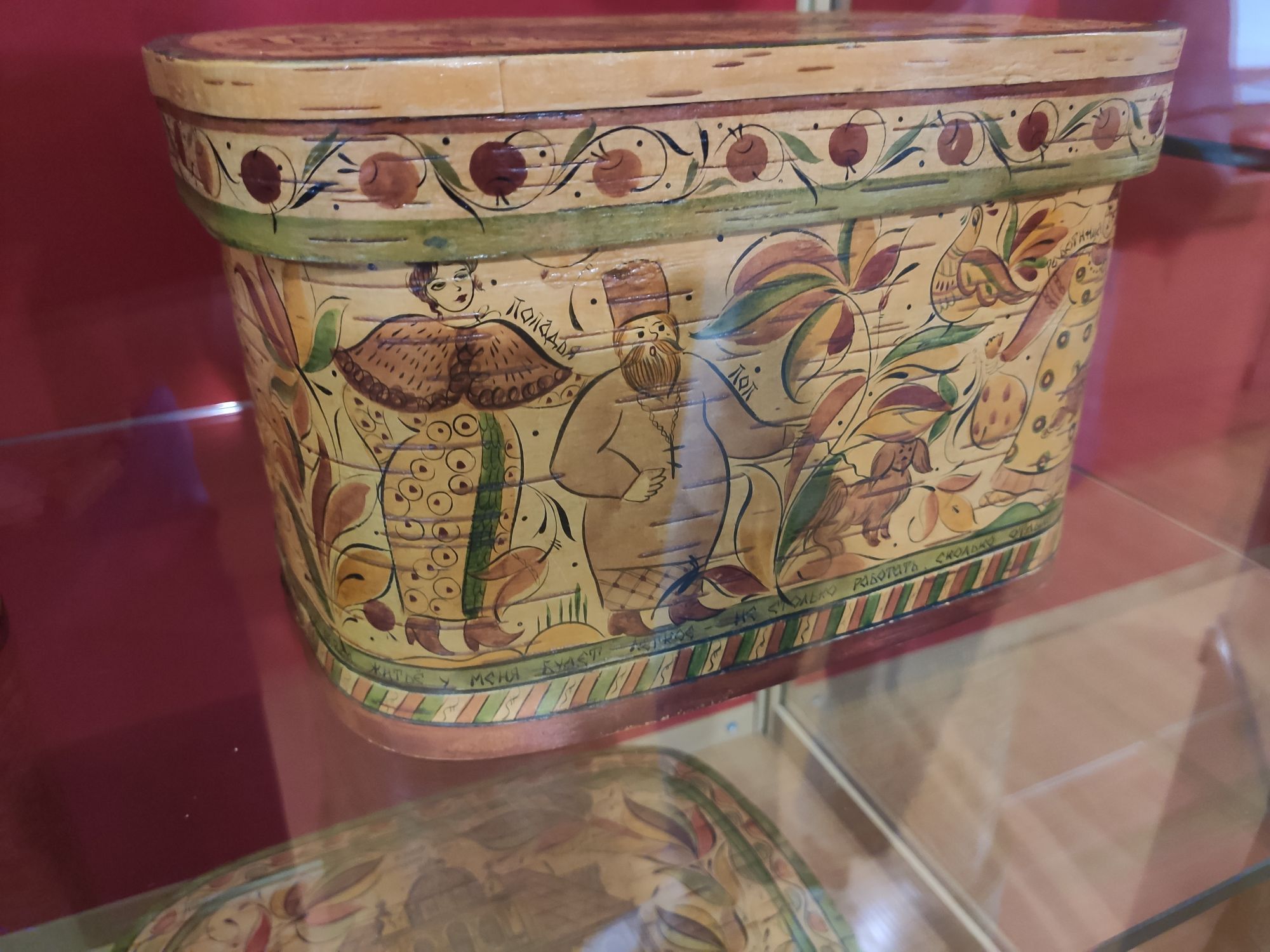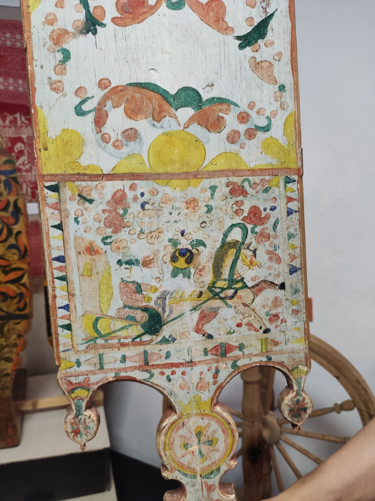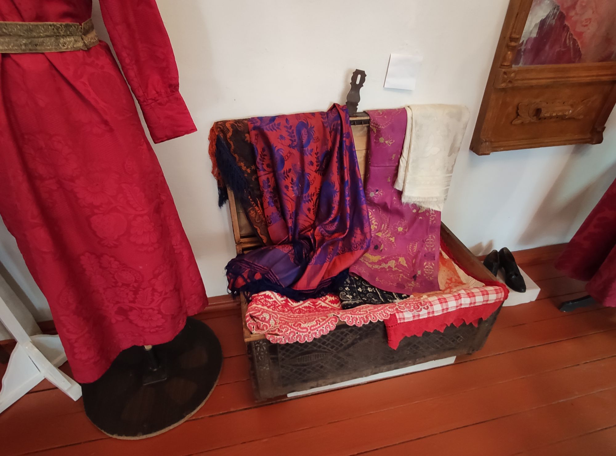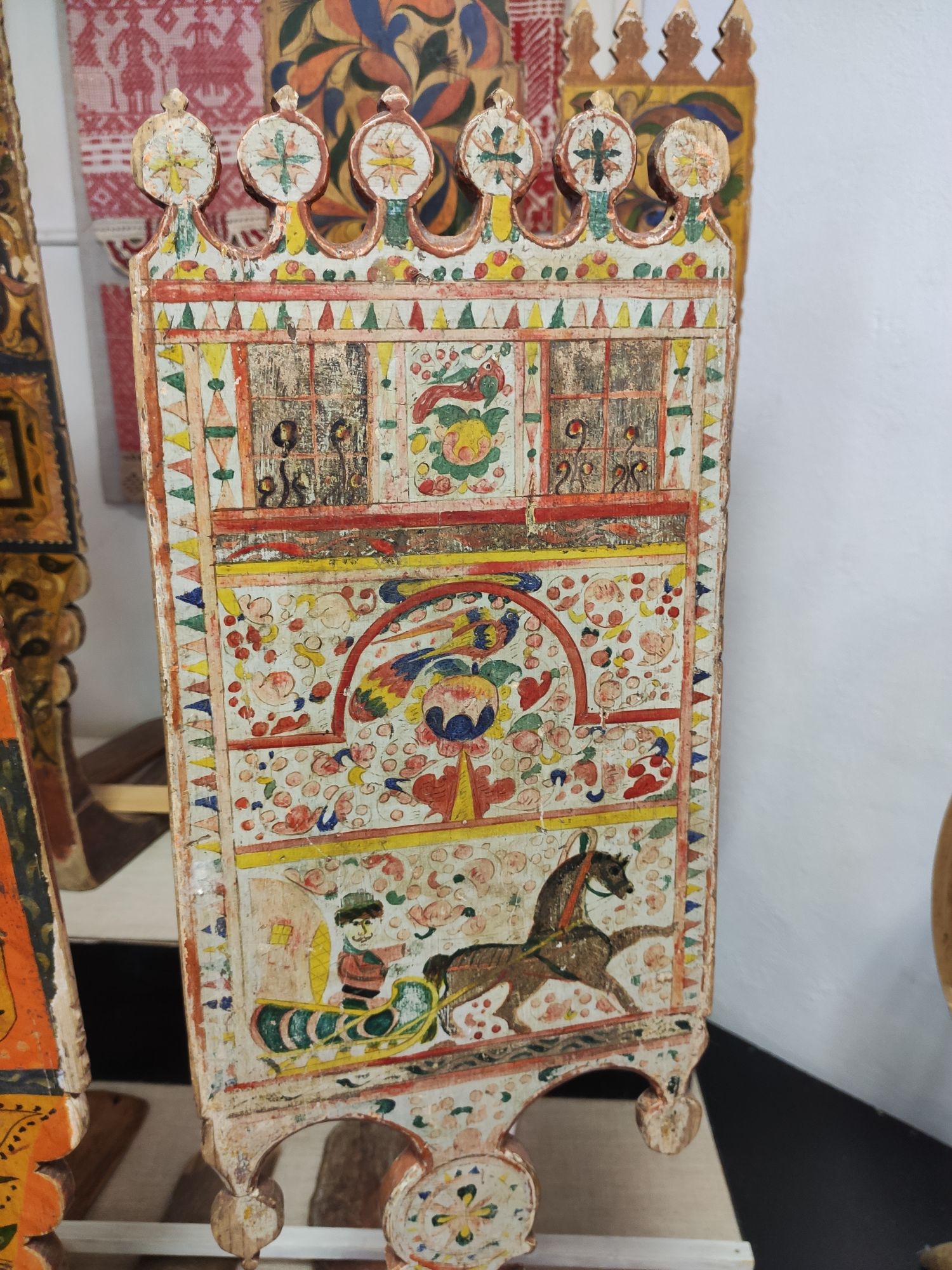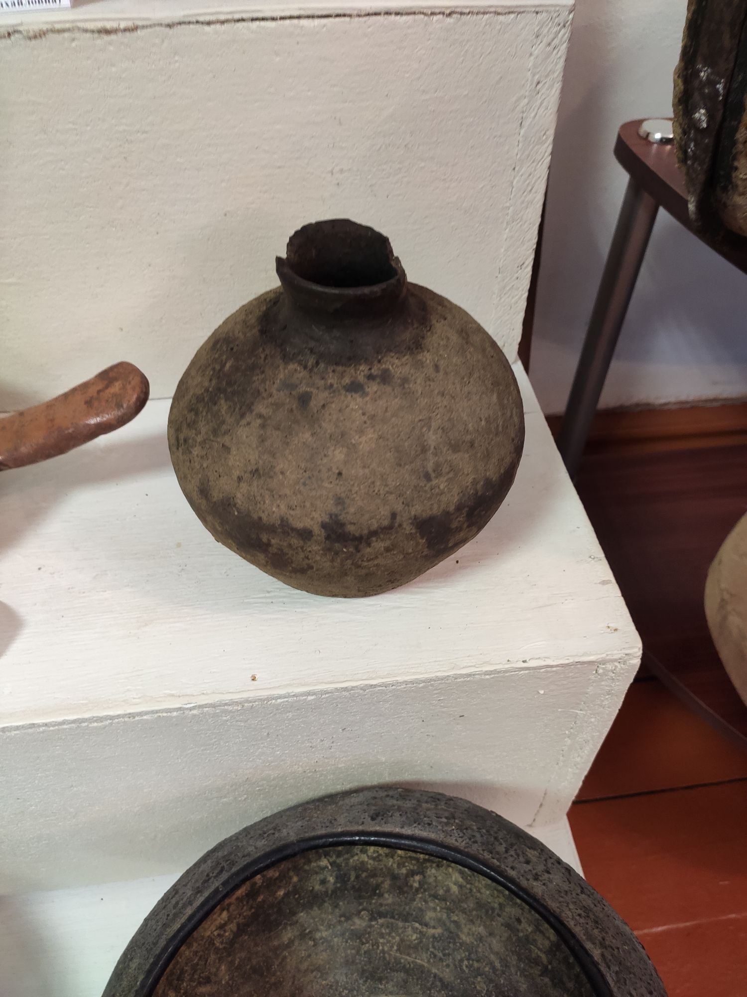 13 августа 2022 Черевковский музей оказался прекрасен всем, кроме запаха краски. Видимо, туристов/посетителей сейчас почти не бывает, поэтому решили быстренько покрасить внутри то, что надо. А тут мы... А у Аси ещё и голова самого утра болит. Тяжко ей было, т.к. ладно бы не интересно - ушел, сославшись на голову и дело с концом. Так нет - тут было очень интересно. И опять почти всё можно потрогать - и это прекрасно!))) Рассказ начался с общих данных про город. Мы узнали, что Черевково было одним из центров старообрядчества. И там даже старообрядческая церковь была. Но после прихода советской власти церковь перестроили в школу, если не ошибаюсь. На фото она такая приземистая из трёх двухскатных крыш. Потом показали часы и самовары. Про формы самоваров я себе даже заметку сделала: банка, рюмка, репка, яйцо и желудь)))) А дальше пошло раздолье. Кокошники и перчатки расшитые золотом тут лежали на витрине, зато костюмы все в доступе. Нам очень много рассказали про пошивы. Мы рассматривали швы, способы пошива, клины, вытачки, пуговицы, украшение бисером. Село было очень богатым, поэтому тут могли себе позволить такую красивую одежду. Немного зубов мамонта И идём смотреть предметы быта))) Огромная ступа/ларь, которой больше 200 лет. Фига на ручке на рубеле. Прялочки. Тут мы 4 росписи посмотрели. Ракульская. Основная особенность - птичка в квадрате (хотя на ранних может быть не птичка), а сверху древо, вырастающее из квадрата. Это пермогорская. Тут птицы сирин обычно изображены. И рисунок мелкий. Ну и это... Видишь прялку - загляни с обратной стороны, т.к. там частенько шедевры)))) Двинская роспись - тут четкое деление. Внизу обычно лошадь с повозкой, середина - растения и птицы, верх - разделен на три части, где крайние две как окошки. И Мезенская прялочка в плохом состоянии, но лошадки и птички характе́рные читаются. Саночки "оковыши" - для того, чтоб лучше скользили, их полозья обивали железом. Тяжёлые как не знаю что. Люлька или зыбка. Старообрядческая - на ней в изголовье изображён восьмиконечный крест. И год написан. Из керамических сосудов нам показали те, что редко встречаются. Кадильница - в ней хранили тлеющие угольки на случай, если печь потухнет, например, или разжечь где что надо. Вместо спичек) Необычный подойник. Там есть выемка для кусочка сливочного масла, которым смазывали вымя корове. И дегтярница. Название говорит само за себя. В ней делали и хранили деготь. Во втором зале советский период. Школьная форма, например. Девчачью не сфоткала. И там же почему-то лежит дореволюционный календарь, в котором куча всего - и информация о железных дорогах, и про писателей что-то написано и т.д. Ну и реклама - куда же без неё?))) Покажу несколько страниц, хотя фоткала много. Когда-то в Черевково была спичечная фабрика, но потом её в Балабаново, если не ошибаюсь перенесли. Огромные книги достижений и информации. Не знаю как их ещё описать))) там и медные планы и удои скота. А ещё - мы наткнулись на фотоальбом и нам рассказали про ежегодные соревнования по многим видам спорта - там и плавание, и мотогонки, и бег, и стрельба... Соревнование командное. Многие кубки передали на хранение в музей. Тут же и фотоархив))) Там столько задора в глазах у участников!) (У Аси в отчёте фоток побольше))) И ещё витрина с игрушками. Коник был отреставрирован недавно. Но хвостик родной у него отвалился. И, как с