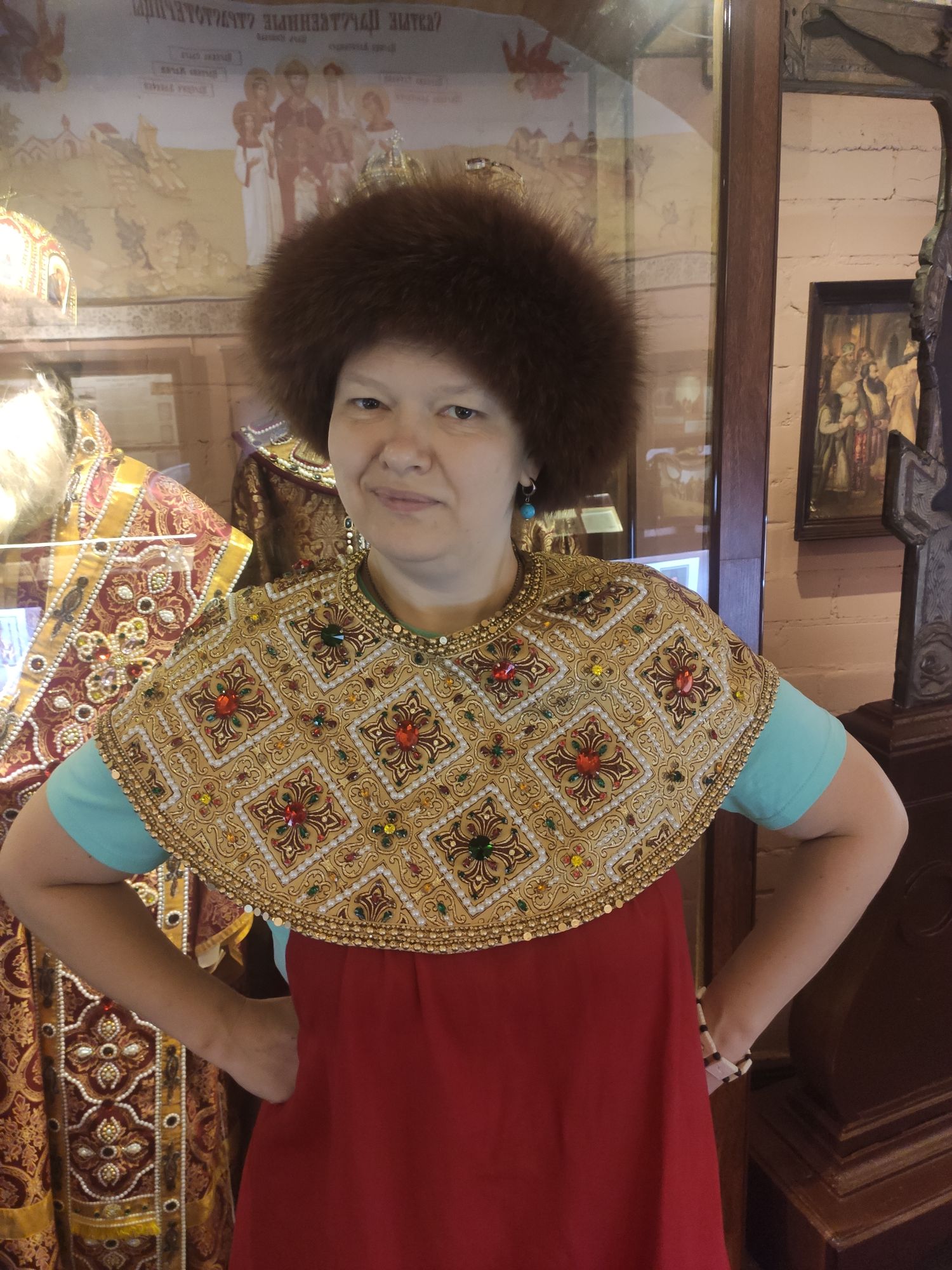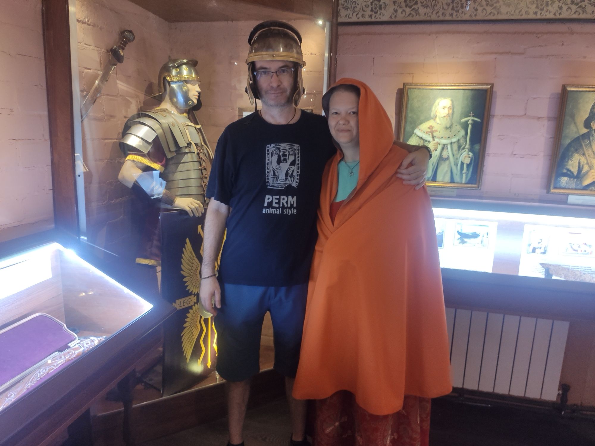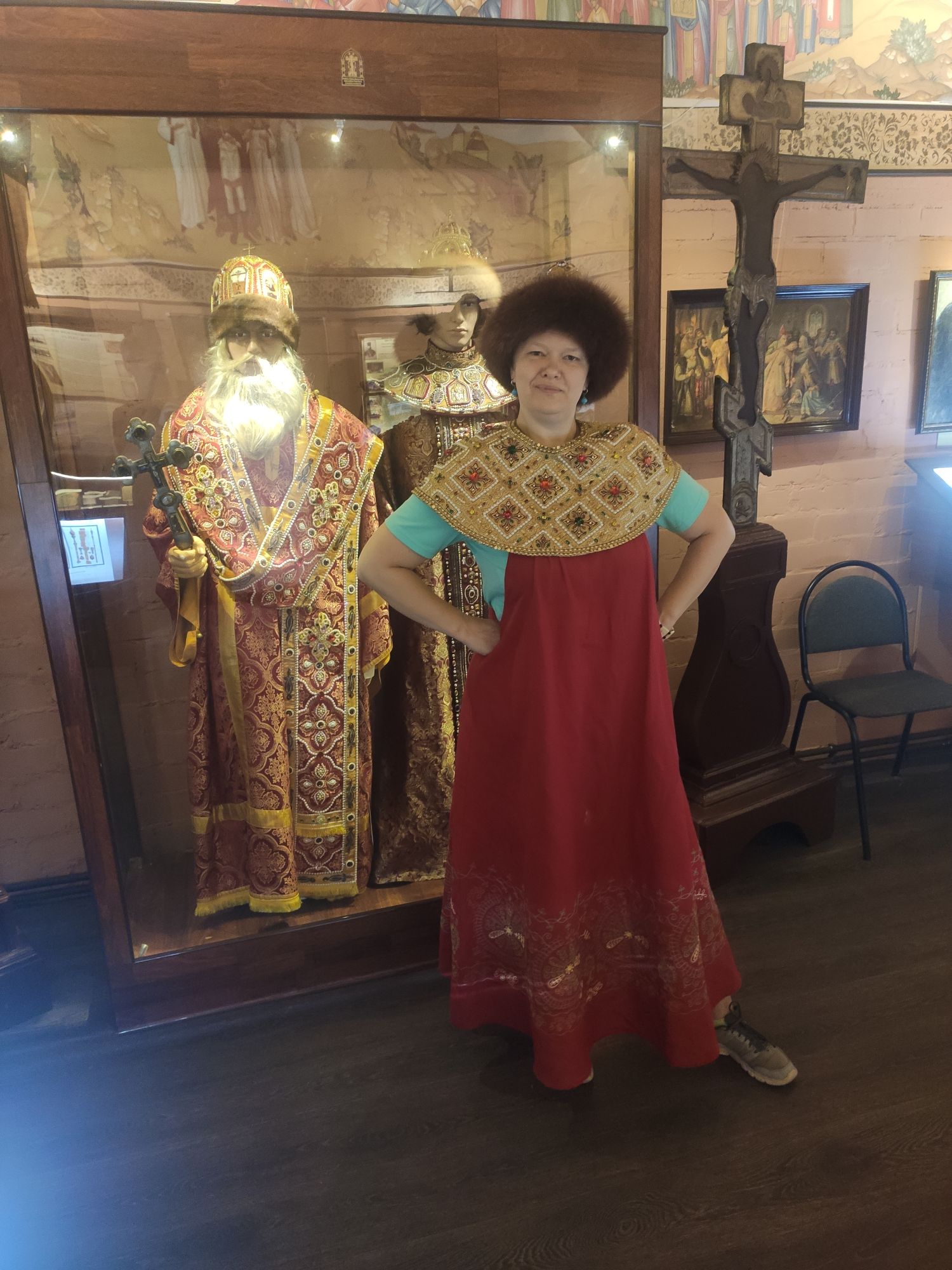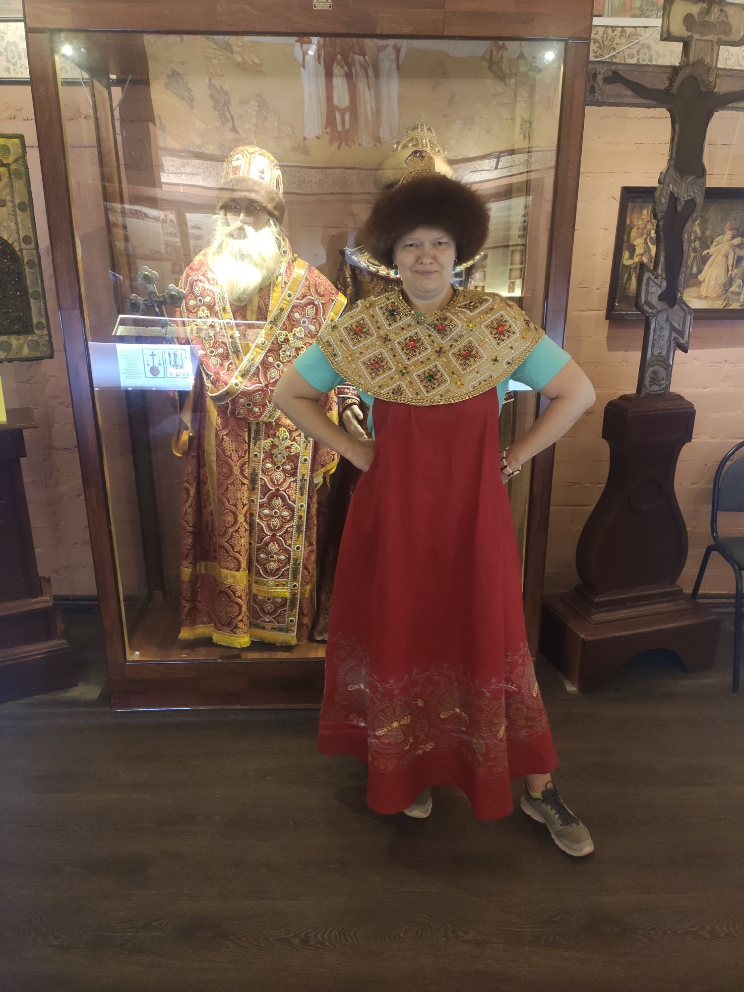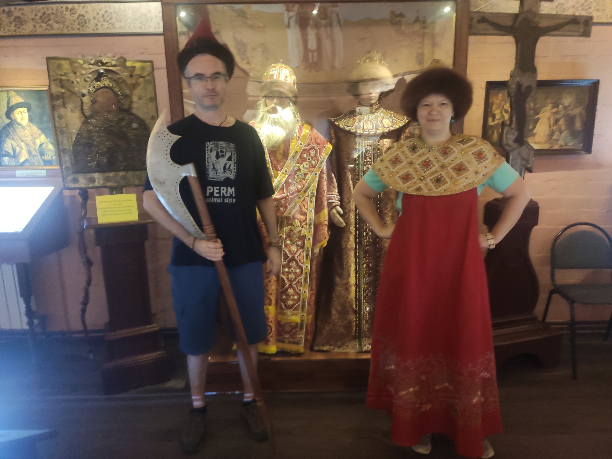 7 сентября 2022 Продолжу про Кострому. В общем, я, пока мы пережидали дома жару в предыдущий день, гуглила про достопримечательности Заволжья. А потом, когда Алиса написала, что экскурсию провести не сможет, сама звонила в музеи))) Изначально Заволжье привлекло зданием старого вокзала - я бы только ради него туда скаталась)))) Но! Там есть несколько церквей, одна из которых старообрядческая. И вот при двух церквях (РПЦ и старообрядческой) есть музеи. Они очень камерные и по записи. Мне повезло записаться в оба. Но обо всем по порядку. В музей при Александро-Антониновской церкви (РПЦ) Я дозвонилась и, получив утвердительный ответ, что приехать можно, спросила - можно ли прям с утра приехать, чтоб не по жаре? Посмеялись и договорились на 9 утра. Доехали туда на такси. Экскурсию проводил Михаил. Ему уже под 70, но очень шустрый и бодрый. Расположен музей прямо напротив церкви в очень красивом резном домике. В музее нам дали кучу исторических фактов, которые прям ну очень удачно легли в голову))) Вроде, часть этих фактов по истории проходят, но до этого они отказывались в голове помещаться))) ЦКровь посвящена святым Александру и Антонине. И единственная в мире, как я поняла, но в России точно, посвященная этим святым. Вот тут на картинке причина описана))) Ехал Мурза Чёт из Золотой Орды. Сам он был татаро-монгол, но крестился под именем Захарий и взял в жены православную жену (хотя есть другая версия - вот статья с сайта церкви https://pravoslavie-ru.turbopages.org/turbo/pravoslavie.ru/s/57723.html) Роды начались внезапно, родилась двойня - мальчик и девочка. По святцам в этот день были именины у Александра и Антонины. Так и назвали. А ещё - Захарий - основатель Ипатьевского монастыря, который находится на другом берегу то ли Волги, то ли Костромы))) Там слияние и сложно оценить как считать. Александр и Антонина (святые) родом из Рима. Антонина была православной, но правитель принуждал ее отказаться от Бога и начать верить "в идолов". Она, как водится, отказалась. Ее истязали, а потом повелели воинам над ней надругаться. И вот один из воинов ее пожалел. Зашёл к ней в темницу и отдал свой плащ, велев бежать. Причем, воин был не православный. Она бежала, но потом пожалела воина и вернулась. Их обоих сожгли. А потом они были причислены к лику святых, не смотря даже на не православность Александра. Михаил, который вел нам экскурсию, ловко переодел нас в Антонину и Александра и сфоткал))) А потом я была царицей Марфой, у которой просили отдать на царство малолетнего сына Михаила. Тут мужа в охрану поставили))) Рассказали нам и про Екатерину, которая, когда план города придумывала, уронила веер, поэтому так город веером и построили. Это легенда, если что) Вообще, у Михаила все предки жили в этих местах, поэтому в музее много вещей и фотографий его семьи. Ну и воспоминаний у него много своих)) На этом фото один из предков Михаила и "девица", хотя в это сложно поверить))) Та, что справа А это ангел из одной из церквей, которые были разрушены и разорены. Александро-Антониновский храм не закрывали, поэтому сюда приносили всё, что могли спасти. Венчальные платье и свечи бабушки или прабабушки Михаила. Платье как на девочку - очень маленького размера. Вещи, принадлежавшие пожарной дружине, в которую входили почти все мужчины села, т.к. это очень почётно было. И много предметов, связанных с церковью и ее служителями. Показав на че