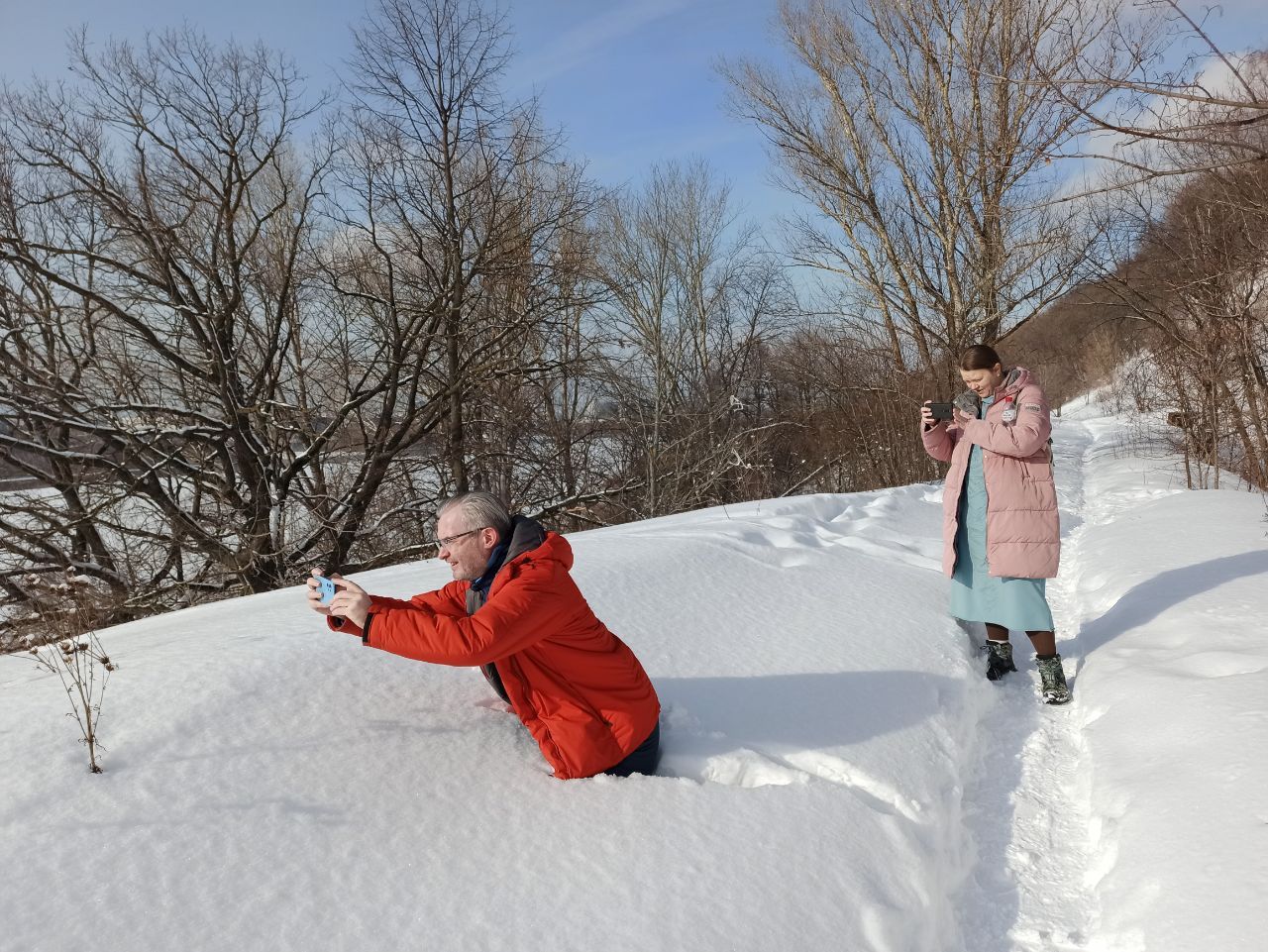 19 марта 2023 8 марта. Опять прекрасный солнечный день!) На первом фото муж пытался показать мне динозавра, а потом мы долго ржали, когда я сказала, что кота вижу, а где динозавр?)))) Муж увидел в кошачьем хвосте динозавра с длинной шеей) Потом мы позавтракали в милом месте))) Догуляли до Аси: И решили, что такому дню негоже пропадать - надо скататься в парк Швейцария. Анастасия сказала нам, что там ещё и водопады есть!))) Ок. Мы ж за любой кипиш) В парке были огромные белоснежные сугробы после недавнего снегопада. Мы быстренько проскочили толпу людей и детские площадки и вышли на высокий берег Оки. Вид красивый, но нам же поверху не идётся, решили спуститься вниз по длиннющей лестнице. Шли вниз и осознавали, что нам же ещё надо будет обратно залезть как-то)))) Но решили, что подумаем об этом позже))) До водопадов дошли довольно быстро. Заледеневшие они, конечно, очень красивые!) Возвращаться той же дорогой было скучновато, поэтому мы пошли вперёд вдоль склона. Видели много всяких технических выходов от берегоукрепояющих сооружений и штолен (может, конечно, не очень правильно их так называть))). Наблюдали за мини-лавинками. Откуда-то сверху падает снежок и скатывается вниз, накручивая на себя снежки-комочки. Мы даже сами попробовали такие лавинки сделать. Не очень удачно, но получилось в итоге. Грех было не фоткать красоту вокруг) Ася сделала снежного ангела) А Евгений по пояс ушёл, когда пошел делать мега-фото.))) Ну и куда же без совместного фото))) Поднялись мы по гораздо менее высокой лестнице))) Считерили, так сказать. А вечером мы с Асей начали плести наших ангелов) Ветер, Nadinka-Blondinka, Миссис Мыштон и 27 других сказали спасибо Поделиться сообщением Ссылка на сообщение