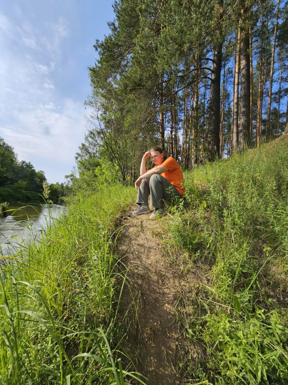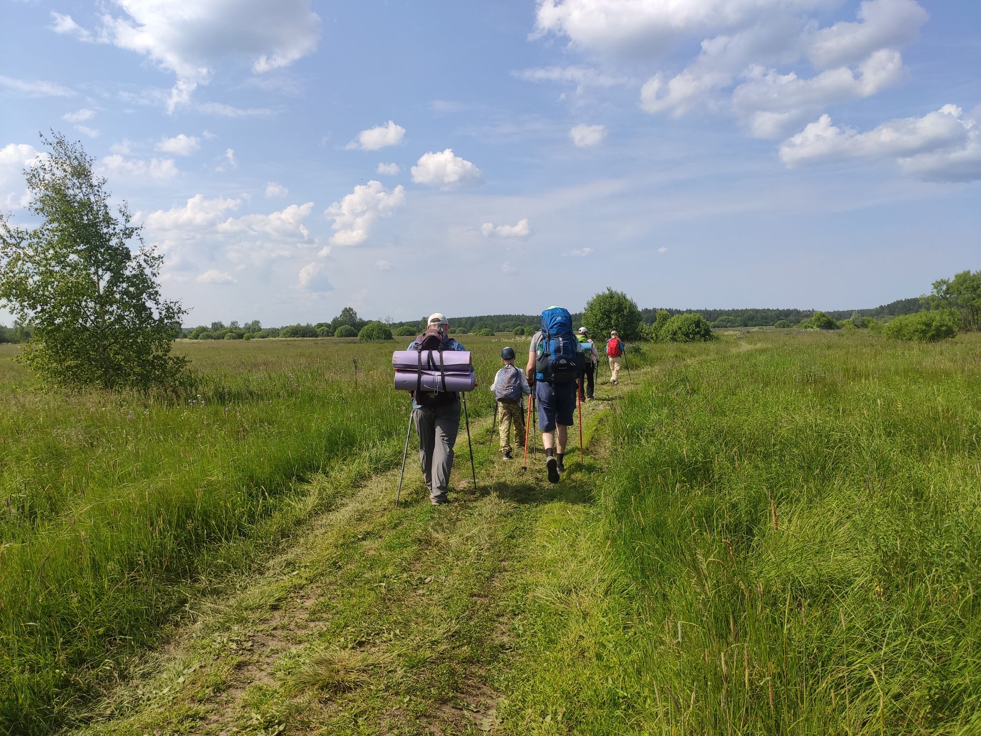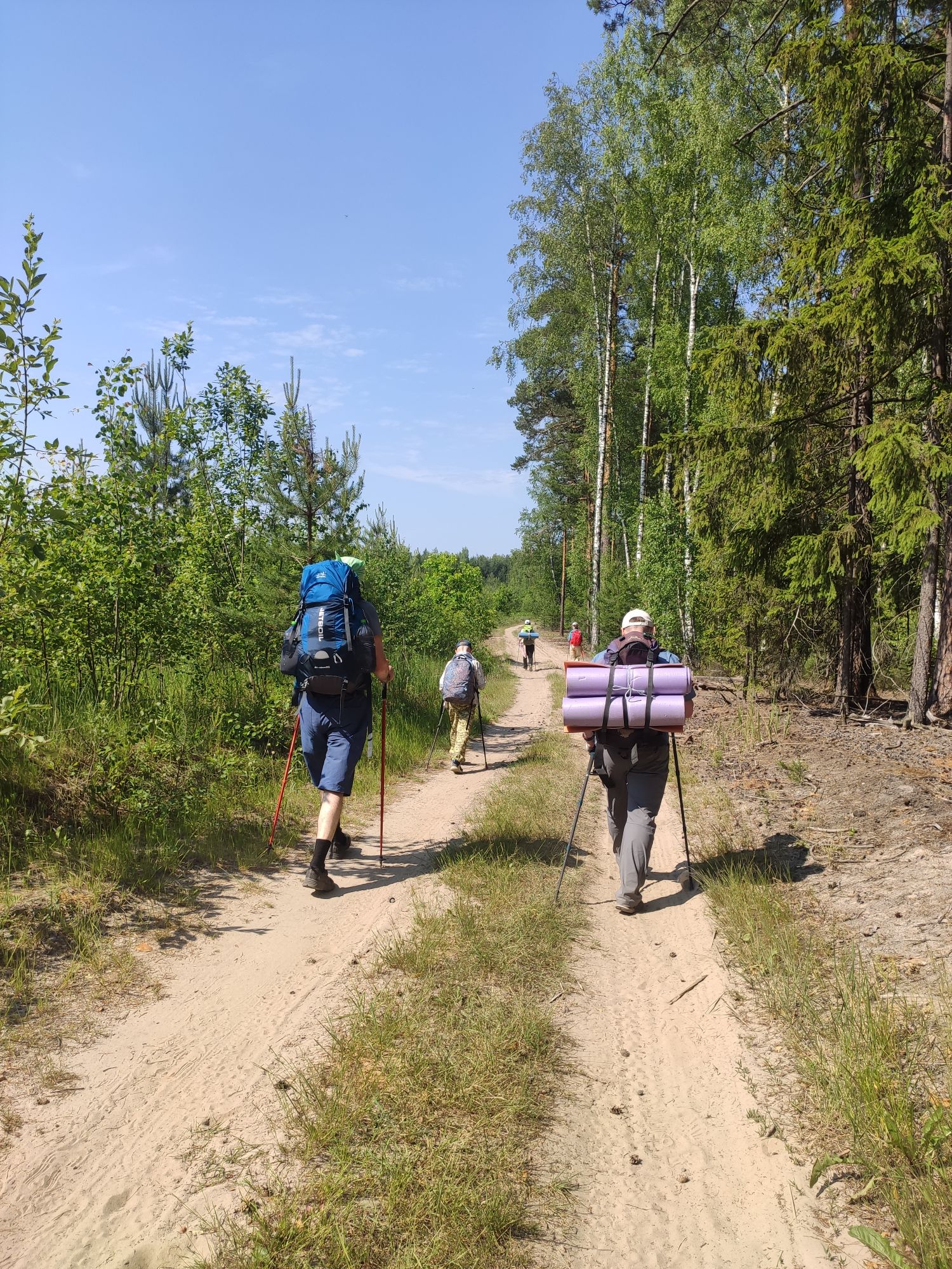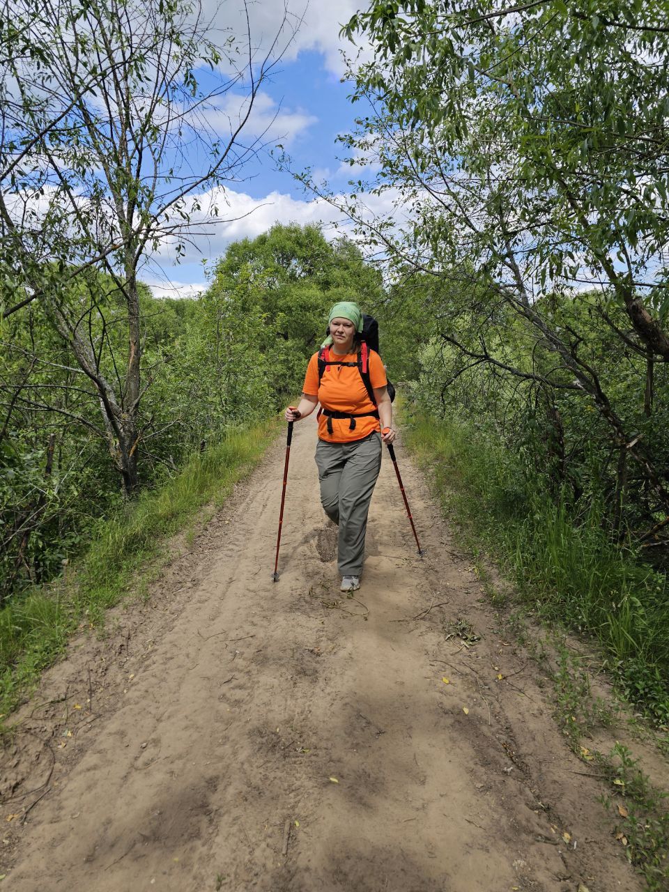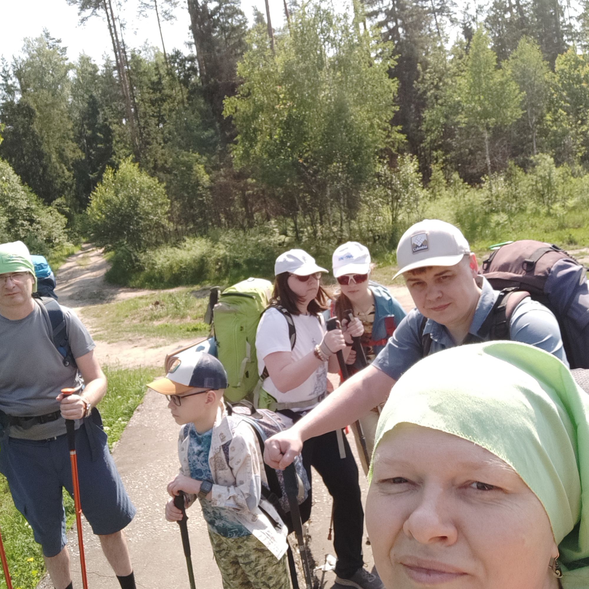 21 июня 2023 Всё сводится к тому, что есть июнь, Река и кромка берега под нами И небо с кучевыми облаками, И солнце льёт с небес на нас латунь. И что сказать, когда слова пусты? В них не вместить ни облака, ни реку, Ни кромку берега, ни тело человека, Сидящего у края пустоты. Всё сводится к тому, что есть момент, Который тихо сквозь тебя сочится. Река журчит, а небо золотится, Как фантики растаявших конфет. Давай молчать и впитывать закат И реку эту и её течение, Такое странное земное приключение - Ловить момент, что не вернуть назад. Ловить момент. В моменте раствориться. На жизнь текучую во все глаза смотреть. И умирать, чтоб снова возродиться, И возрождаться, чтобы умереть. © Наташа Маякова Т.к. я сама - поэт, зовусь Незнайка, то начну со стихов Наташи Маяковой, на которую давно подписана в ВК. Нравится мне как она пишет. И почти всё отзывается. В общем, поход. Встретиться договорились в 9:30, т.к. мы ехали на электричках с двумя пересадками и электричка наша прибывала на 173 км в 9:33. Прикольный опыт, когда ты не сел в машину и поехал до лагеря, а повесил рюкзак за спину и вперёд)))) Утренняя фотка у лифта в 5 утра)))) Женька тут прям говорит - И на что я подписался?)))) Поезда - романтика и вышивка))) Завтракали мы во Вкусно и точка в Орехово-Зуево - у нас там было 40 минут между электричками. В электричке Орехово-Зуево - Александров ехало очень много туристов. И обычных и вело))) Дачники слегка косились))) И вот встреча, настройка трекинговых палок по размеру, намазывание себя солнцезащитным кремом (обещали жару), распихивание питьевой воды по рюкзакам и в путь!) А дальше 21 км в первый день. Душа пела и наслаждалась запахами травы, нагретой солнцем земли и хвои, пока руки синхронно с ногами отсчитывали ритм палками. На смолке и горицвете кукушкином (гуглила, если что))) очень много бабочек какустниц). В пути мы постоянно находили то гусеницу, то ящерку, то какую-нибудь птицу на ветке, то грибы (подберёзовики и даже белые))). А ещё - делали привалы и о чем-то болтали). В какой-то момент поняли, что пора искать место под стоянку) Сначала прошли одно на стрелке двух рек. Потом долго не было ничего подходящего. И вот - ОНО - прекрасная полянка с местами для палаток и местом для посидеть, поболтать и приготовить еду. И даже река рядом со спуском и выходом в реку, хотя и не очень удобным, но нас это в итоге не остановило от купания)))) Я воду прохладную не очень жалую, но тут оказалось, что опустить усталые ноги в прохладу - это просто блаженство! Ну и обустройство быта в лагере - это всегда отдельная песня - установка палаток, готовка еды (мы с Женькой прям оценили буженину от Кронидов, а вот борщ их не зашёл)... По еде - в этот поход мы не заморачивались с подсчётами - веса, калорий и т.д. Шли всего на 2 дня, магазины на маршруте были, поэтому еды было всякой много))) Мне вот теперь интересно сходить дней на 5, где все посчитано и учтено). Потом все начинают бродить вокруг))) А нашим мужчинам вообще пришлось за водой вернуться к речке, которую мы проходили, чтобы набрать воды для готовки (оказалось, что мало взяли). С водой тоже надо учиться подсчётам. Фото, кстати, довольно мало. У меня телефон уже не очень хорошо держит зарядку. Розеток на соснах не было, зарядок от солнечных батарей у нас тоже нет, а банка (пауэр-банк) не вечная. Приходится как раньше с плёночным фотиком - думать что и когда фоткать + отключить ка