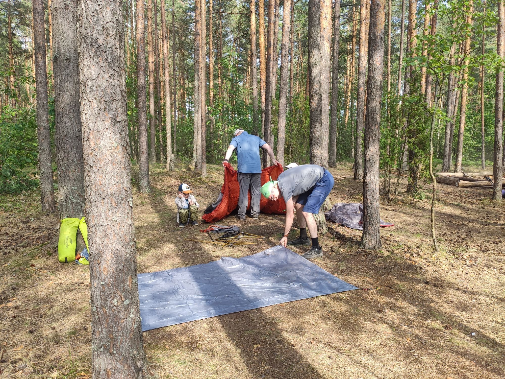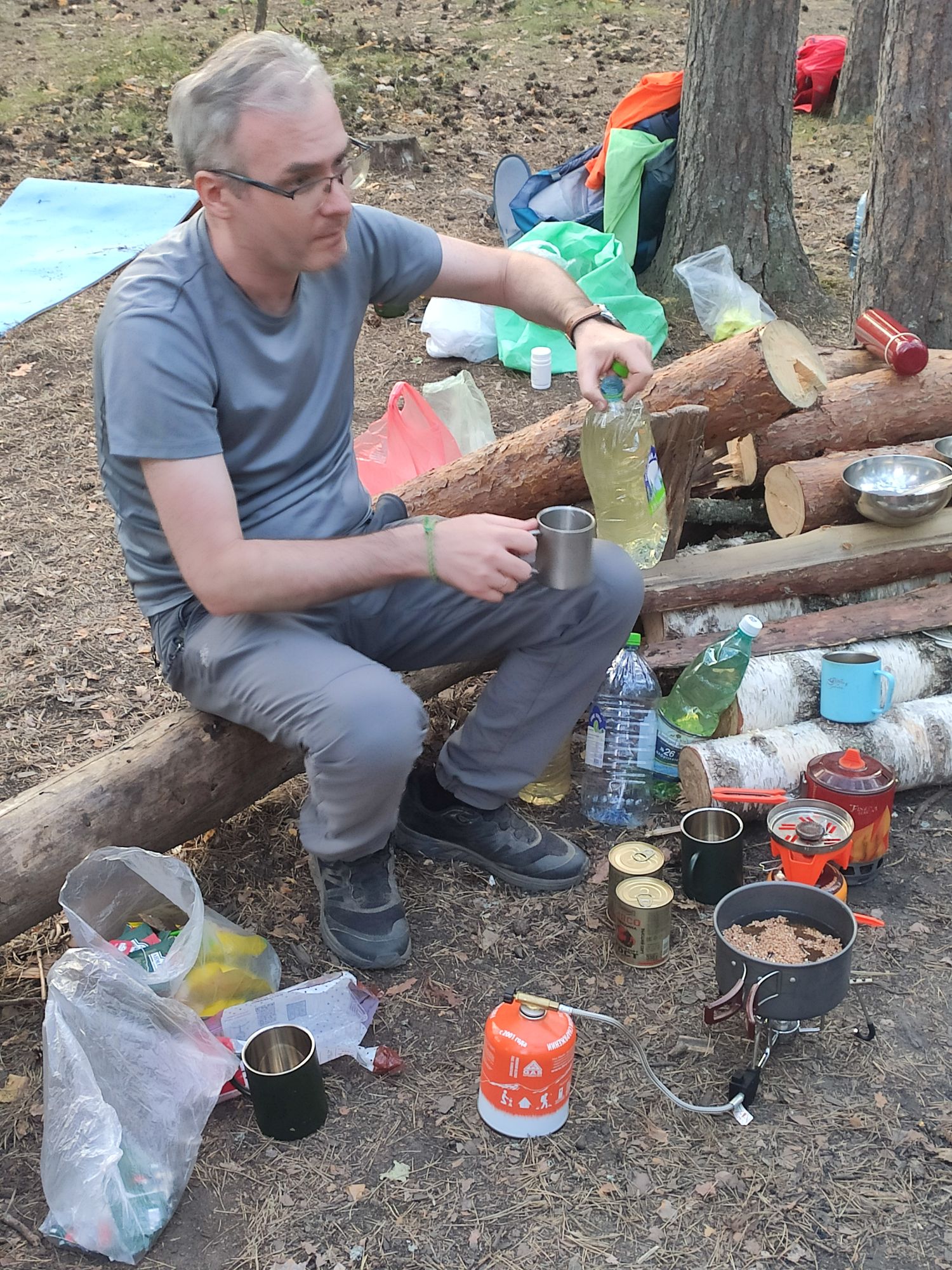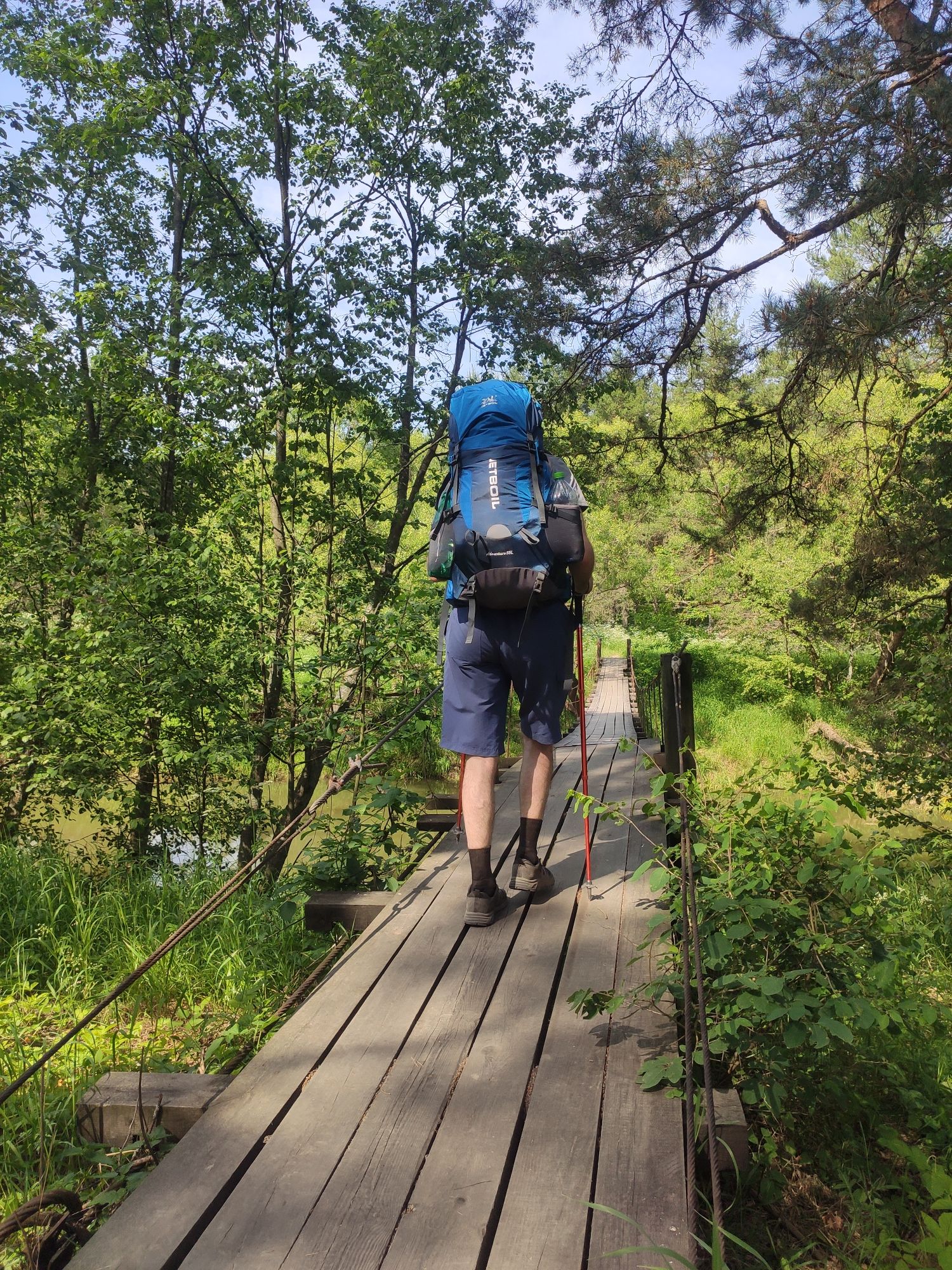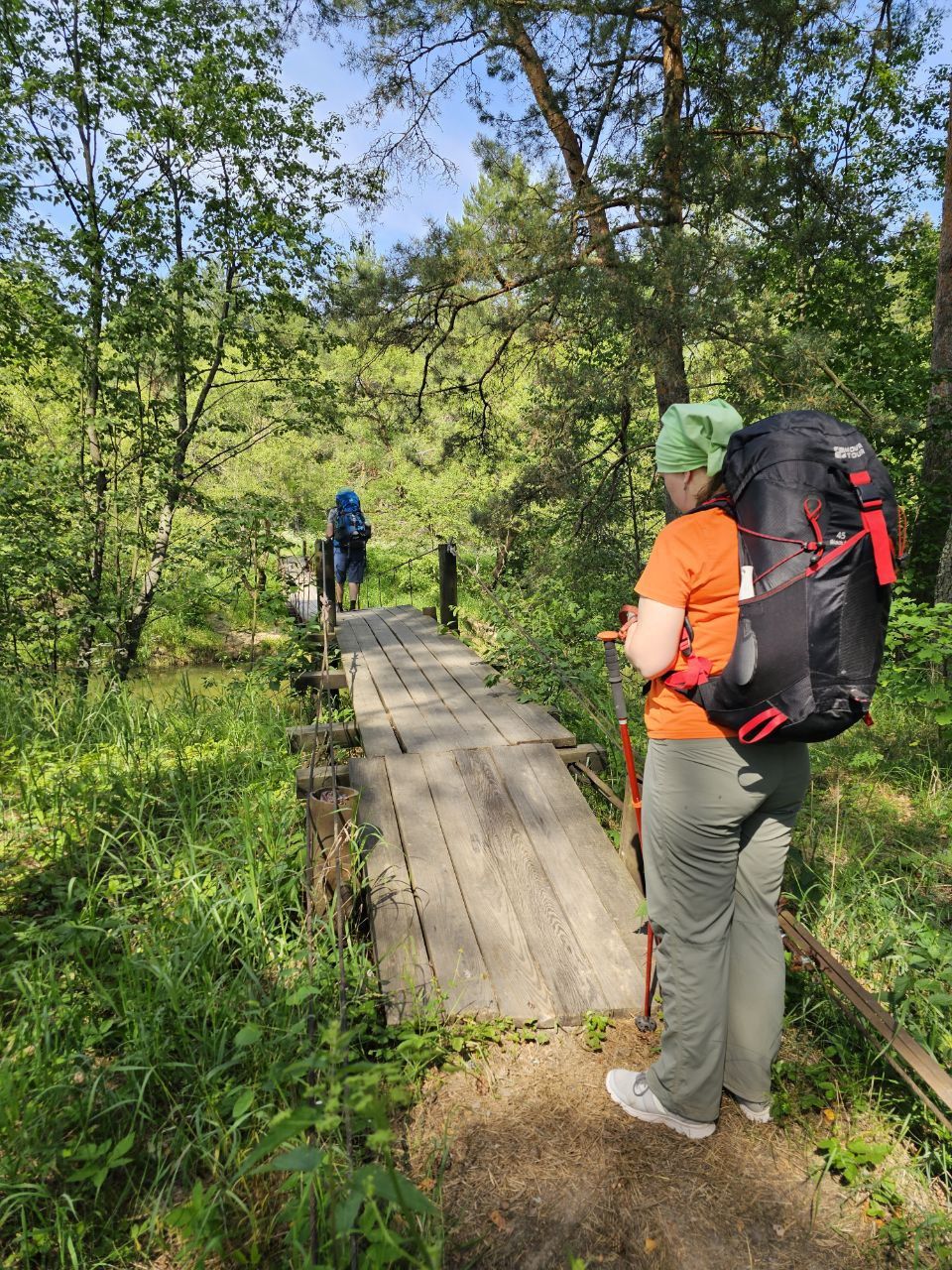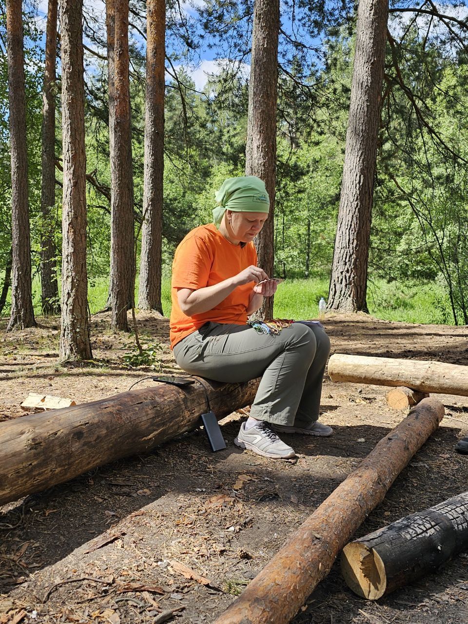 21 июня 2023 Всё сводится к тому, что есть июнь, Река и кромка берега под нами И небо с кучевыми облаками, И солнце льёт с небес на нас латунь. И что сказать, когда слова пусты? В них не вместить ни облака, ни реку, Ни кромку берега, ни тело человека, Сидящего у края пустоты. Всё сводится к тому, что есть момент, Который тихо сквозь тебя сочится. Река журчит, а небо золотится, Как фантики растаявших конфет. Давай молчать и впитывать закат И реку эту и её течение, Такое странное земное приключение - Ловить момент, что не вернуть назад. Ловить момент. В моменте раствориться. На жизнь текучую во все глаза смотреть. И умирать, чтоб снова возродиться, И возрождаться, чтобы умереть. © Наташа Маякова Т.к. я сама - поэт, зовусь Незнайка, то начну со стихов Наташи Маяковой, на которую давно подписана в ВК. Нравится мне как она пишет. И почти всё отзывается. В общем, поход. Встретиться договорились в 9:30, т.к. мы ехали на электричках с двумя пересадками и электричка наша прибывала на 173 км в 9:33. Прикольный опыт, когда ты не сел в машину и поехал до лагеря, а повесил рюкзак за спину и вперёд)))) Утренняя фотка у лифта в 5 утра)))) Женька тут прям говорит - И на что я подписался?)))) Поезда - романтика и вышивка))) Завтракали мы во Вкусно и точка в Орехово-Зуево - у нас там было 40 минут между электричками. В электричке Орехово-Зуево - Александров ехало очень много туристов. И обычных и вело))) Дачники слегка косились))) И вот встреча, настройка трекинговых палок по размеру, намазывание себя солнцезащитным кремом (обещали жару), распихивание питьевой воды по рюкзакам и в путь!) А дальше 21 км в первый день. Душа пела и наслаждалась запахами травы, нагретой солнцем земли и хвои, пока руки синхронно с ногами отсчитывали ритм палками. На смолке и горицвете кукушкином (гуглила, если что))) очень много бабочек какустниц). В пути мы постоянно находили то гусеницу, то ящерку, то какую-нибудь птицу на ветке, то грибы (подберёзовики и даже белые))). А ещё - делали привалы и о чем-то болтали). В какой-то момент поняли, что пора искать место под стоянку) Сначала прошли одно на стрелке двух рек. Потом долго не было ничего подходящего. И вот - ОНО - прекрасная полянка с местами для палаток и местом для посидеть, поболтать и приготовить еду. И даже река рядом со спуском и выходом в реку, хотя и не очень удобным, но нас это в итоге не остановило от купания)))) Я воду прохладную не очень жалую, но тут оказалось, что опустить усталые ноги в прохладу - это просто блаженство! Ну и обустройство быта в лагере - это всегда отдельная песня - установка палаток, готовка еды (мы с Женькой прям оценили буженину от Кронидов, а вот борщ их не зашёл)... По еде - в этот поход мы не заморачивались с подсчётами - веса, калорий и т.д. Шли всего на 2 дня, магазины на маршруте были, поэтому еды было всякой много))) Мне вот теперь интересно сходить дней на 5, где все посчитано и учтено). Потом все начинают бродить вокруг))) А нашим мужчинам вообще пришлось за водой вернуться к речке, которую мы проходили, чтобы набрать воды для готовки (оказалось, что мало взяли). С водой тоже надо учиться подсчётам. Фото, кстати, довольно мало. У меня телефон уже не очень хорошо держит зарядку. Розеток на соснах не было, зарядок от солнечных батарей у нас тоже нет, а банка (пауэр-банк) не вечная. Приходится как раньше с плёночным фотиком - думать что и когда фоткать + отключить ка