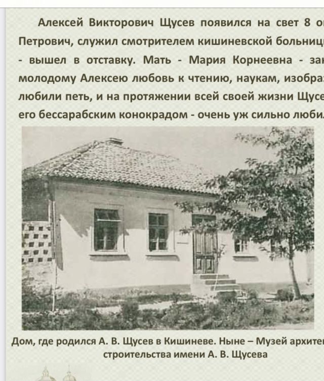 21 ноября 2023 1 минуту назад, Юнона1960 сказал(а): И я там был, мед-пиво пил.. Повеяло ностальгией. 8 октября 1873 Место рождения Кишинёв, Бессарабская губерния, Российская империя Это я застала. Музей громко сказано - и не обратила бы тогда девчонкой внимания, если бы постоянно не спотыкалась о ступеньки, по дороге в школу. Разминуться негде , сразу проезжая часть. Обычный крестьянский домик, хоть отец и был земским чиновником . И я была там не один раз. Жили в три дома правее за перекрестком. Это уже после реставрации, ибо все рушилось. Оль, теперь "вы обязаны на мне жениться" ты должна рассказать про Щусева, не откладывая в долгий ящик. Теперь и не отвертишься!))) Боюсь загадывать, но постараюсь завтра тогда про него написать, а потом уже про отпуск))) Юнона1960, vasilisa-1977, Marusya1978 и 4 других сказали спасибо Поделиться сообщением Ссылка на сообщение