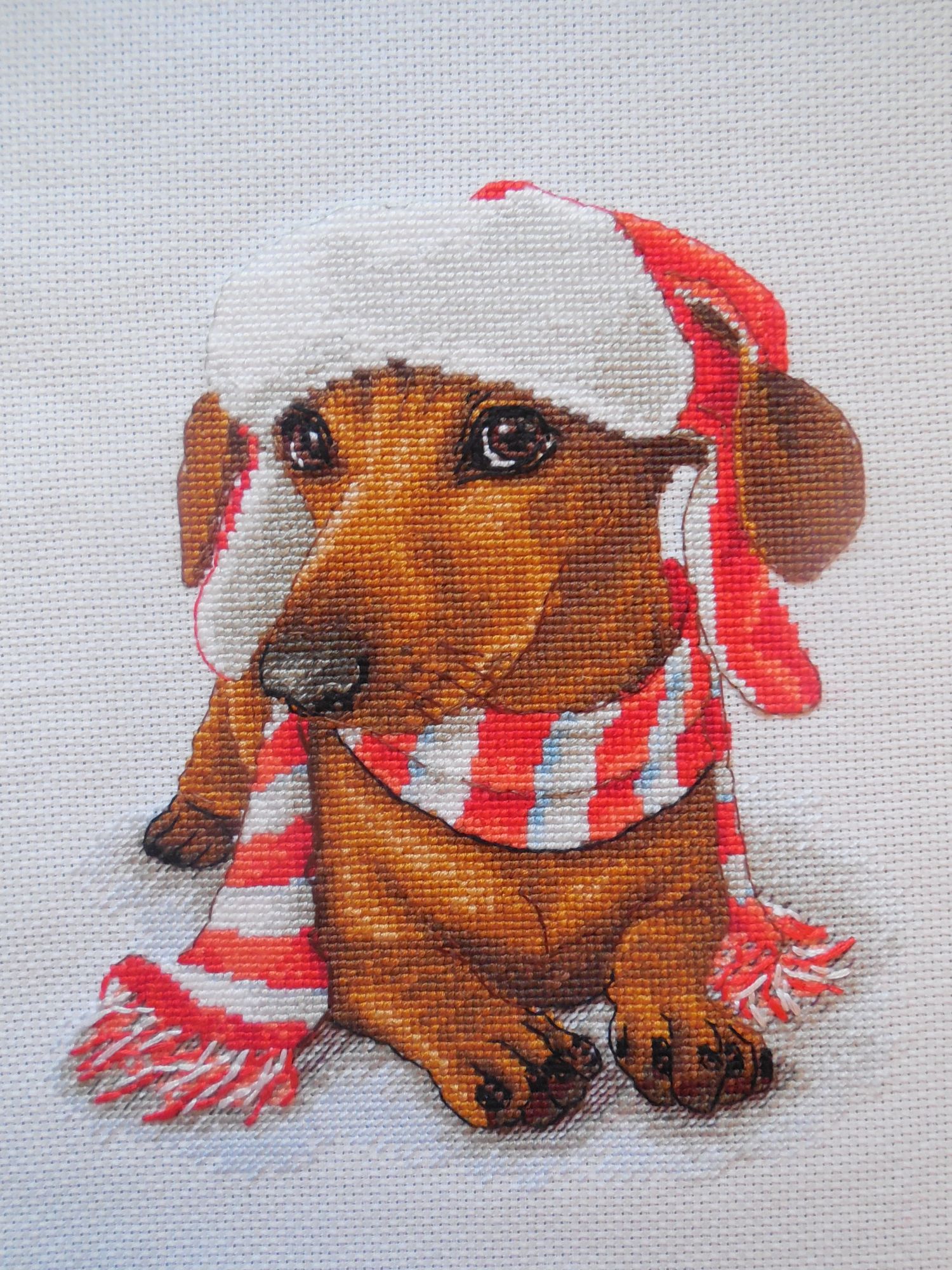 12 ноября 2017 Вот и готова моя собачка! Очень милая получилась, новогодняя!!! Глазки покрупнее Еще раз повторюсь - процесс очень мне понравился, ну и результат конечно тоже, без сомнения вышила бы еще раз этот сюжет с удовольствием Несколько слов скажу о наборе: схема хорошо проработана, крупная, цветная, правда размер очень большой, можно было и немного поменьше сделать; ниточки мягкие, шелковистые, с блеском, очень приятно ими вышивать; иглу можно смело брать тоньше, ну и для бэка конечно тоже понадобится другая игла. Ниточек мне хватило всех, только ниток под №3 осталось очень мало, боялась, что может на бэк не хватить, т.к. этим номером он вышивается в 3 сложения. Совсем небольшое изменение внесла - убрала малюсенький кусочек красного бэка сверху шапочки и заменила его на серый - мне кажется так лучше смотрится. Теперь буду думать над оформлением, ну и потом конечно приду в темку, покажу, что получилось galaktyka, Lisa511, Victoria Lawyer и 11 других сказали спасибо Поделиться сообщением Ссылка на сообщение