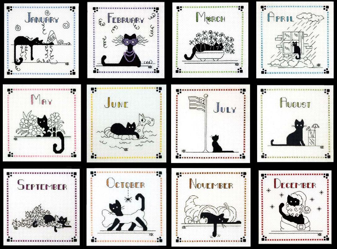 8 апреля 2012 Девочки предлагаю свою картинку Себе беру - МАРТ и НОЯБРЬ основной цвет вышивки - черный, и чуть-чуть белого для кошачьих глазок)) в каждой картинке есть немножко яркого цвета, буквально на пару ниточек - предлагаю проявить фантазию и подобрать цвет самостоятельно (если вам не сложно) Поделиться сообщением Ссылка на сообщение
