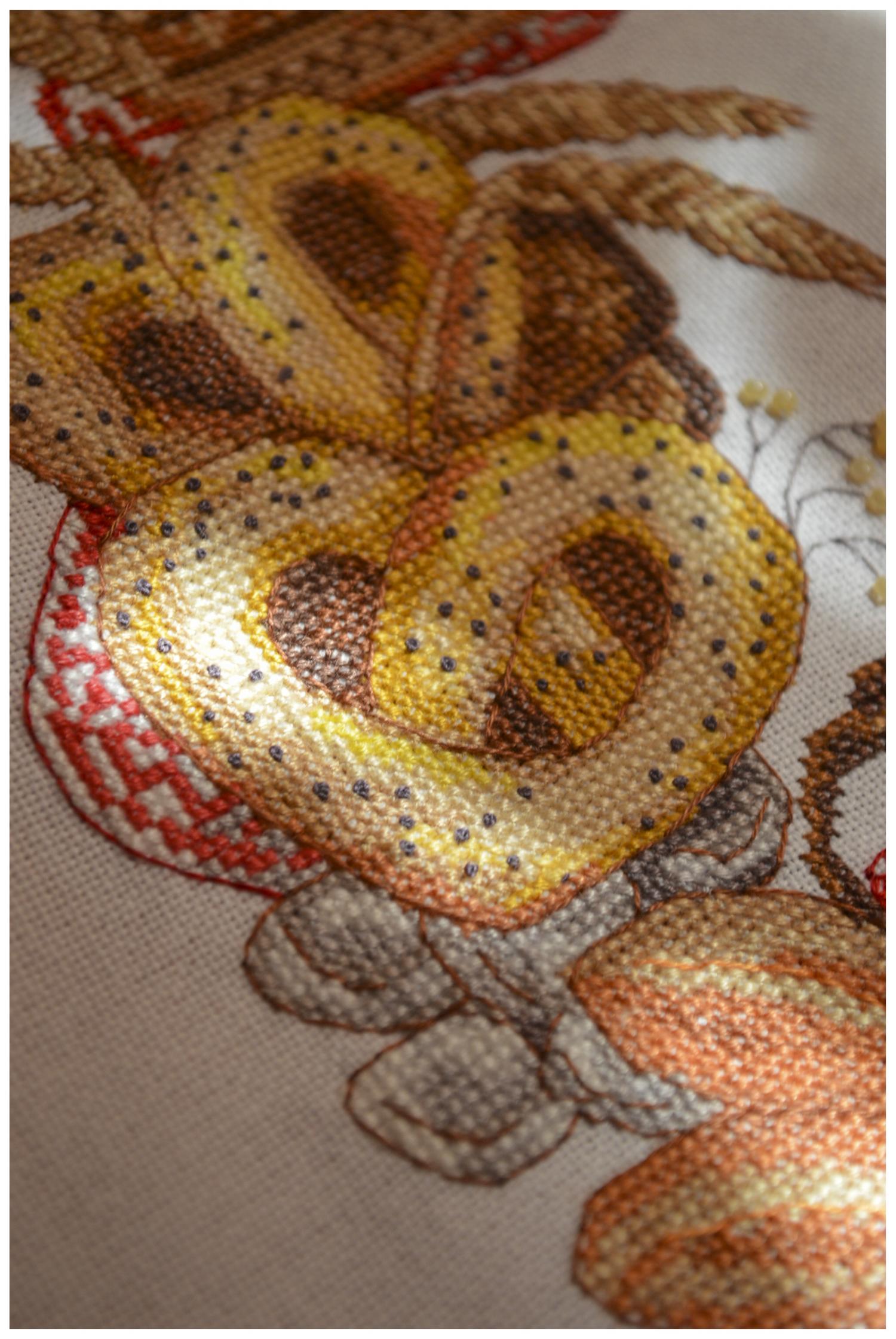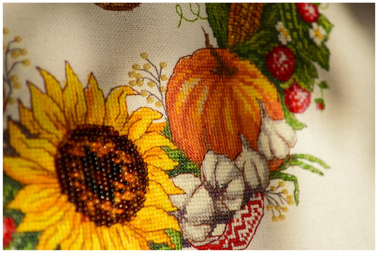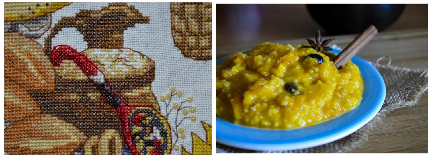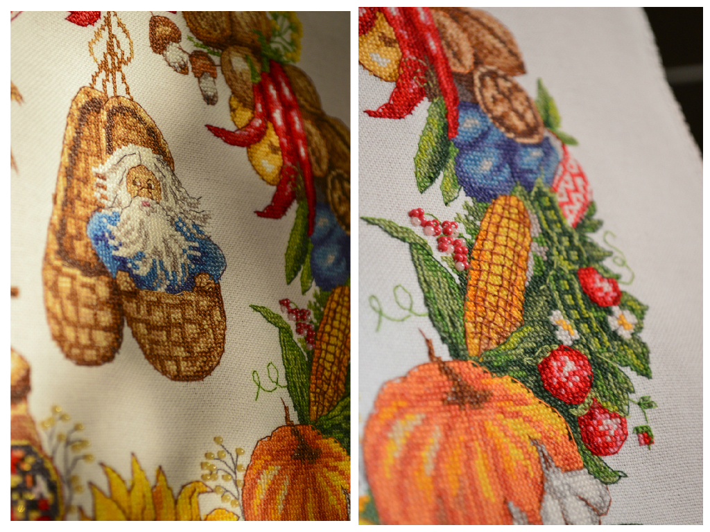26 сентября 2015 Здесь должна быть предпоследняя серия Домовенка, но случилась последняя. Вот что значит найти правильный сериальчик)). Как это было: Панна Венок изобилия,размер на Аиде 16 была заявлен как 32*32. После замены на равномерку Мурано 32 и ее стирки перед вышиванием размер составил 27*27. Цветов 42, бисер. Процесс очень приятный, не вызвал никаких затруднений. Повозиться пришлось только с бисером в подсолнухе. Сначала казалось, что все хорошо и бисеринки точно по размеру, но после трех вышитых рядов они начали сбиваться и не хотели помещаться ровными рядами. Заменила нитку для пришивания с белой на коричневую, думала, что так лучше буду контролировать, куда тычу, равномерке ж дырок нет. Три раза распарывала, потом плюнула и стала пришивать бисер так,как он хочет, оставляя между рядами одну нить основы. "Проплешин" нет. в самом конце, вышивая последний бэк, нашла свой косяк, естественно))), как без него)). В работе много цветов бэка и 2 из них оранжевые. Но в одном случае оранжевая линия слегка заштрихована, чего я при свете луны на схеме не заметила. В общем, я теперь, глядя на картину вижу только этот бэк не тем цветом, но перешивать жутко не охото. Начну ее пороть, поврежу крестики. Пусть будет как есть. Кукуруза представлена на фото одновременно с тыквой)) в виде тыквенной каши на кукурузной крупе)) Лена1973, Weatherwax, Nyurka-86 и 19 других сказали спасибо Поделиться сообщением Ссылка на сообщение