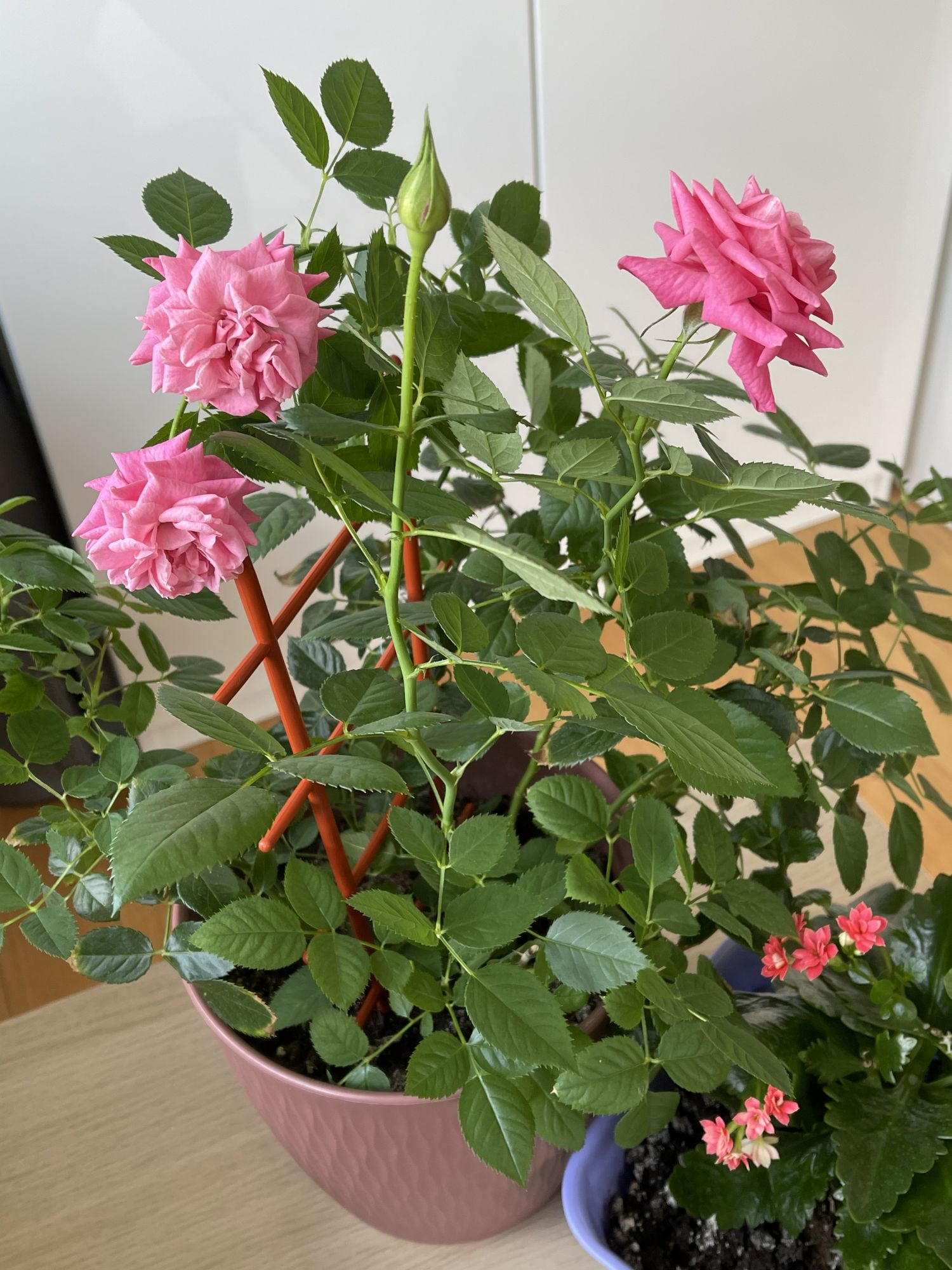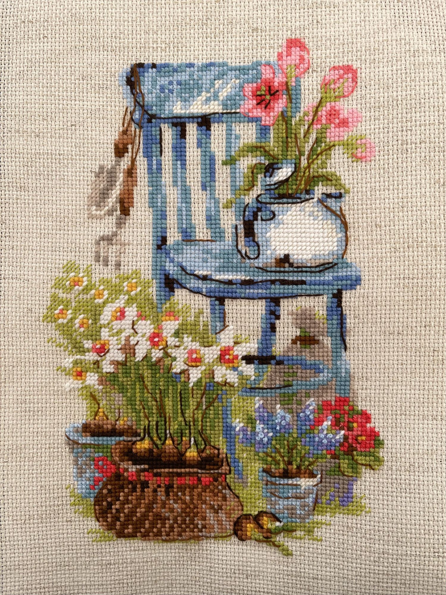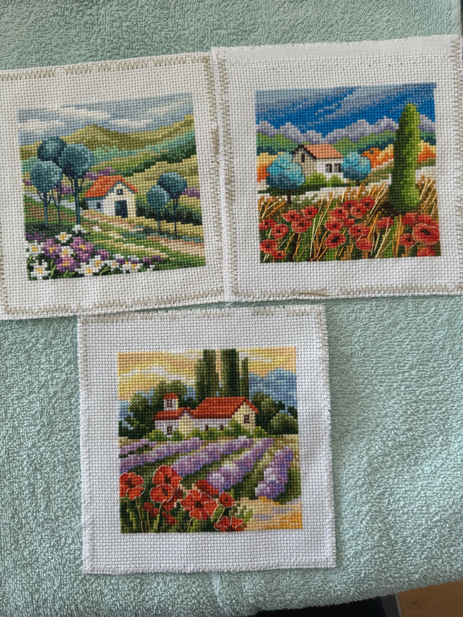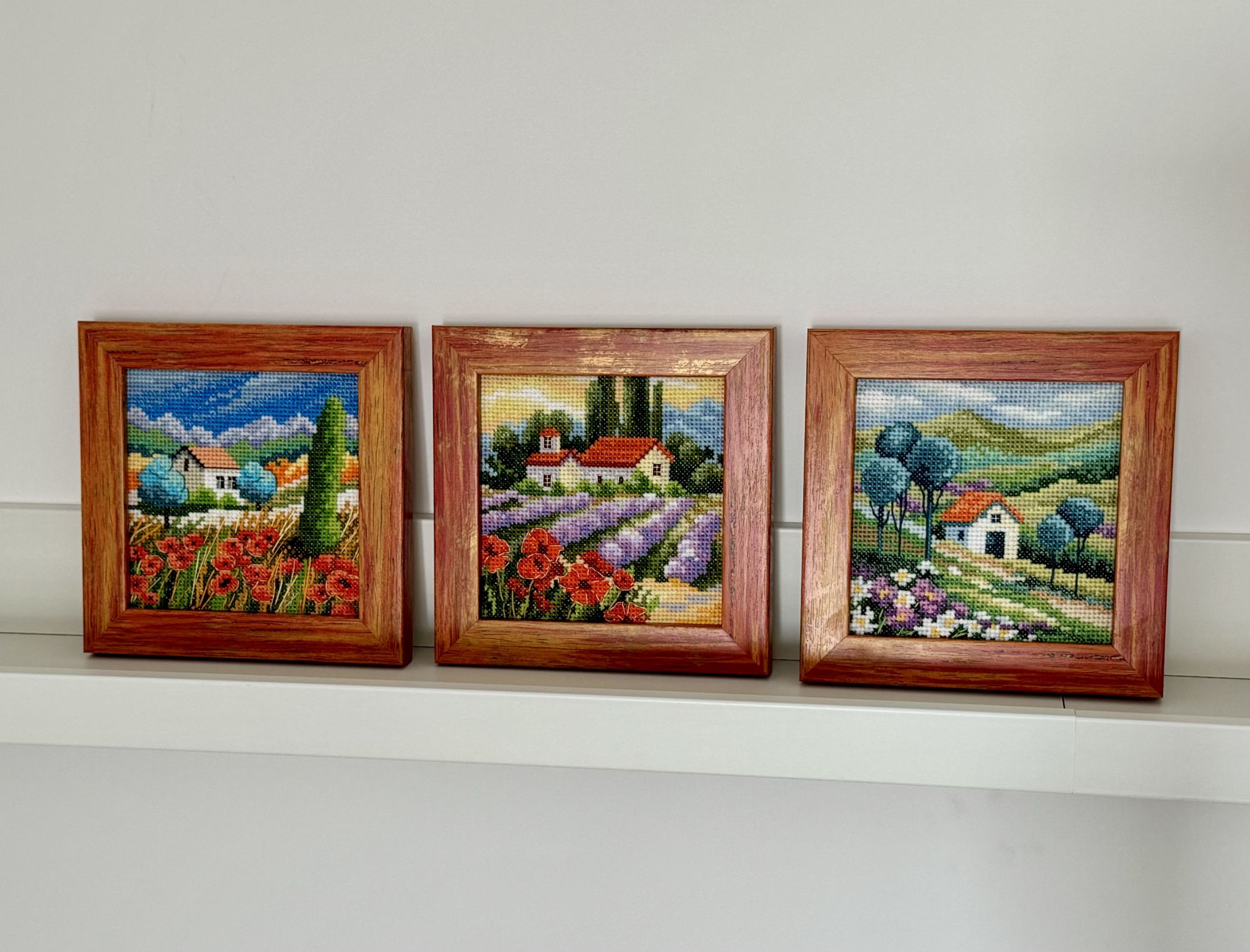 19 июня Добавляю два новых, и завершенных, процесса: RTO C360, Краски лета: и RTO C361, Краски лета: Первый из трех этой серии я вышила еще в марте; второй (с лавандой) оказался похожим, таким же ярким. Третий немножко разочаровал своим пасмурным небом, на обложке голубой цвет был более светлым. Хотела вставить их в тройную спец. рамочку от Щепки. Но потом вдруг лень стало каждую вышивку размещать-пришивать в окошке, обрезАть и совмещать их рядом… Поэтому сделала проще: заказала в ближайшей багетке 3 рамочки, и уже на след. день получила их, и быстренько за вечер натянула все три) И еще один новый-завершенный процесс, шерстяной Риолис 1656: Начала его весной прошлого 24г, на днях закончила. Ооочень нравится голубой цвет стульчика! И остальные все цвета тоже яркие-красивые. Влюбилась в этот дизайн с первого взгляда) В пару к нему купила зимний, с белочкой; и это еще новый процесс, Риолис 1751: Надкусила, а чтобы не забросить, вышью его в Долгостроях) Остальные, Лето-осень, не нравятся так сильно. Если было бы еще Лето с ягодками-грибами, например. То вышила бы все 4 сезона. А раз Лета нет, то пусть будет 2 штуки, пока так решила) А еще я откопала Овечек, и наконец-то сшила держатель для туалет. бумаги) Пять+ лет руки не доходили, чтобы прострочить всего три машинных строчки! А всё потому, что лень было размечать эти строчки, там размеры оказались не подходящими, под стандарт. рулоны. Пришлось маленько подвигать две стороны туда-сюда, булавками перекалывать, много-много раз. Потом когда-нибудь отфотаю покрасивее, и добавлю в готовые) И надо еще будет найти крепкий крючок на липучке, чтобы повесить эту штуку на место... (Это набор Permin 41-2136, есть в моих Процессах.) Неожиданная радость - на этой неделе у меня зацвели розочки! Купила еще в апреле ярко-розовый цветущий куст. Потом вылупились еще три уже не яркие-розовые, а почти белые, и мелкие бутончики; потом цветение закончилось, далее росли только листья. Я и не думала, что так скоро снова могут появиться цветы! Они не такие крупные, как были первые. И всего-то 4 бутончика, и розовый другого оттенка… Вообще, выглядят бутоны по-другому, лепестки почему-то заворачиваются уголками наружу… Но всё равно красивые, и пахнут, и очень радуют свою хозяйку У меня вообще цветы с трудом приживаются, а розы я даже и не пробовала раньше, думала точно не выживут, такие неженки) Так что хожу вокруг них, и налюбоваться не могу Lysinda, Забава_, Путешественница и 2 других сказали спасибо Поделиться сообщением Ссылка на сообщение