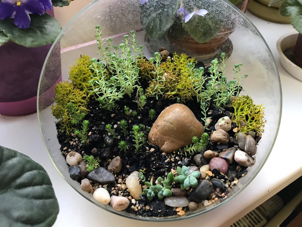 30 октября 2018 Когда то сотруднице подариле на 8 марта этот флорариум. Остался только мох (названия мы не знаем) и небольшая камнеломка на переднем плане. А недавно с дачного участка я привезла два вида камнеломок-очиток(кажется), которые разрослись сами по себе. Вот я и решила их добавить в композицию. Раньше привозила в виде розы очиток, но не прижилась. А эти прям на второй день воспряли и стоят, напоминая деревца. Может ещё что нибудь добавим. Alena Lanscowa, Хозяйка смешных зверей, Рейлэнэ и 4 других сказали спасибо Поделиться сообщением Ссылка на сообщение