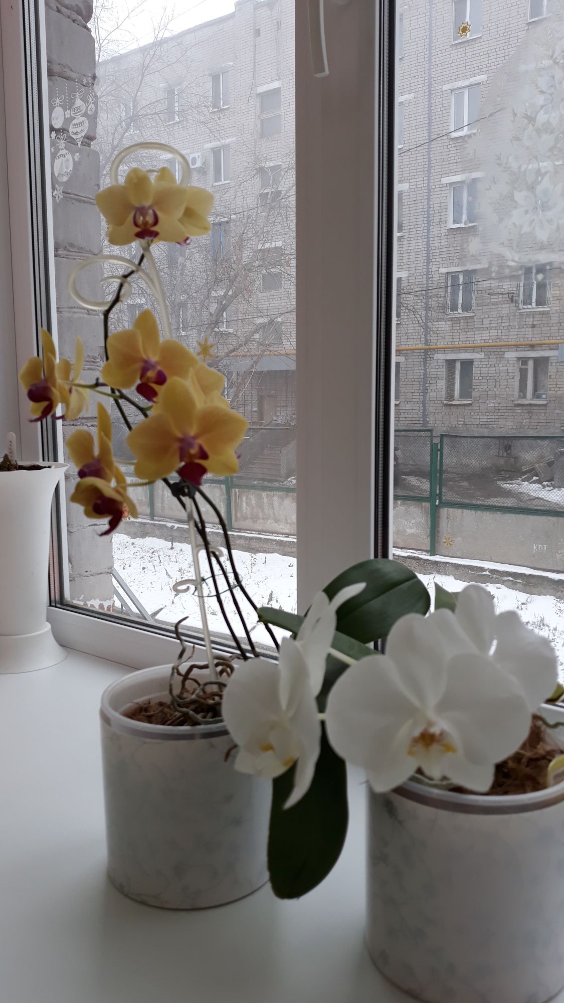 10 декабря 2019 3 часа назад, Евгения Чичкова сказал(а): Для тех, кто думает, отрезать ли старые цветоносы на орхидее. Сейчас на моей 6 цветоносов, из них только один новый, из капусты, остальные 5 появились на старых. Правда, пришлось вставить металлический прут, вместо деревянной палочки, но это детали.) Последний цветок на уровне 70 см. От этой орхидеи, когда уже пошли цветоносы, отсаживала детку, побоялась, что, если и она зацветёт, то в бок и придётся ей отдельную комнату выделять. Были опасения, что передумает цвести, но, как видите, нет, хотя корни я ей обкромсала знатно. Да, цветоносы не нужно отрезать, если они не желтеют... много раз зацветали по новой... Очень мне нравятся белоснежные фалики))) как невесты в платье... lenning, Verok, tamara.34 и 4 других сказали спасибо Поделиться сообщением Ссылка на сообщение