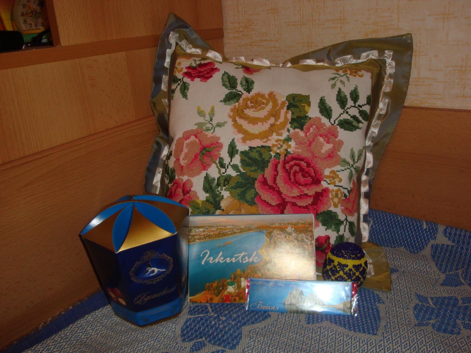 7 мая 2012 Выполняю норму - по одному сюрпризу в день))) Теперь моя очередь)) Приехала ко мне посылочка от Женечки КлЮкВы. Достали мне на почте здоровенную коробку, а там... Вот такая красота. Обалденная подушка с розами, бисерное яйцо, вкуснющие конфеты, магнитик с озером Байкал и открытки с видами Иркутска. И, конечно, письмо) Видели бы вы подушку! Верх аккуратности - что вышивка, что пошив наволочки К тому же, мама давно просила меня сделать домой вышитую подушку, а у меня все руки не доходили. Теперь, благодаря Жене, вышитая подушка у нас есть)) Бисерное яйцо будет жить у меня в комнате на полке, а в следующую пасху займет почетное место на столе. Конфеты очень вкусные, уже попробовала)) На открытках - достопримечательности Иркутска. Сразу же захотелось погулять по этим улицам, посмотреть на изображенные там дома и памятники. Женя, спасибо тебе огромное! Попасть на Байкал - моя заветная мечта. Не реализованная пока, к сожалению. Но я твердо намерена там побывать)) В этом году вряд ли, но в следующем - сделаю все возможное для того, чтобы моя поездка состоялась А пока мне будет греть душу магнит на холодильнике Отдельное спасибо за письмо и теплые пожелания) Сюрприз удался! OlgaKo, Snadis, fikus-1 и 7 других сказали спасибо Поделиться сообщением Ссылка на сообщение