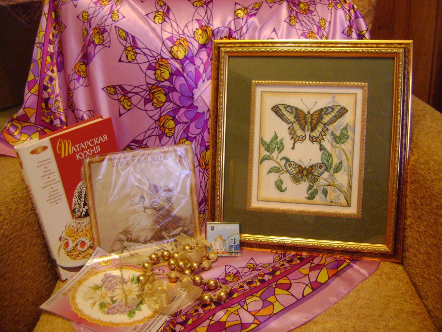 12 мая 2012 Девочки, занимайте места в первом ряду я показываю и рассказываю о своем сюрпризе. Подучила я его уже часа четыре назад. Но сил не было оторваться от этой красоты. Сейчас страсти и восторги немного поулеглись и я обрела способность связно излагать свои мысли. А то до этого кроме "вот это да!", "ах, как красиво!", "вау!!!" и прочих возгласов, я даже и сказать ничего не могла. И так! Получила я этого ОГРОМНОЕ счастье от Рикки. Викуля, спасибо тебе спаспибущее!!!! Первое - это необычайной красоты вышитая картина. Очень нежная, аккуратная, с идеально ровными крестиками. А сколько мелких деталей у бабочек, мамадорогая!!! Ювелирная рабта. Ну, а оформление - просто нереально красивое. Потом на свет появилась коробочка со вкуснящками. Называется это чудо кулинарного искусства Чакчак. Ничего подобного в жизни не пробовала! Просто тает во рту. И Кулинарная книга национальной Татарской кухни. Очень интересная. Я так думаю, что книгу Викуля специально положила, чтобы я не рыдала над пустой коробкой, когда все вкусняшки закончатся, а научилась делать их сама. Дальнейший разбор коробки происходил только одной рукой, потому, что вторая была уже вымазана медом и постоянно запихивала в рот вкуснючие медовые штучки. Оторваться было невозможно. На фото уже лишь скромные остатки. И те отобрала с боем, а то фотографировать было бы уже нечего. В общем, прощай диета ... Следующими были чудесные наборчики. Один с нежной весенней сиренью. А второй с моей любимой кошкой. Вышью обязательно в самое ближайшее время. Первой конечно кошку, как свою вечную и постоянную любовь. Магнитик на холодильник. Магнитики мы дома специально не собираем. Но они как то сами собрались из разных городов. Теперь есть и из Альметьевска. Он прекрасно вписался с компанию на холодильнике. Ну и в завершении красивейший платочек в моих любимых сиреневых тонах (жаль, мои способности фотографа не могут передать всю красоту цвета). И бижутерия - колье и браслет золотистого цвета, очень модного в этом сезоне. Ну и в конце самое главное! Мне всегда нарвились работы Рикки. Я отличала их во всех сюрпризах и, как только у меня появилось право голосовать, голосовала всегда за нее. А теперь у меня есть свой, собственный Шедевр от Рикки. Да, чуть не забыла. Весь сюрприз целиком, но только без вкусняшек. Они закончились. treisi, Топтыжкина, NatMix и 8 других сказали спасибо Поделиться сообщением Ссылка на сообщение