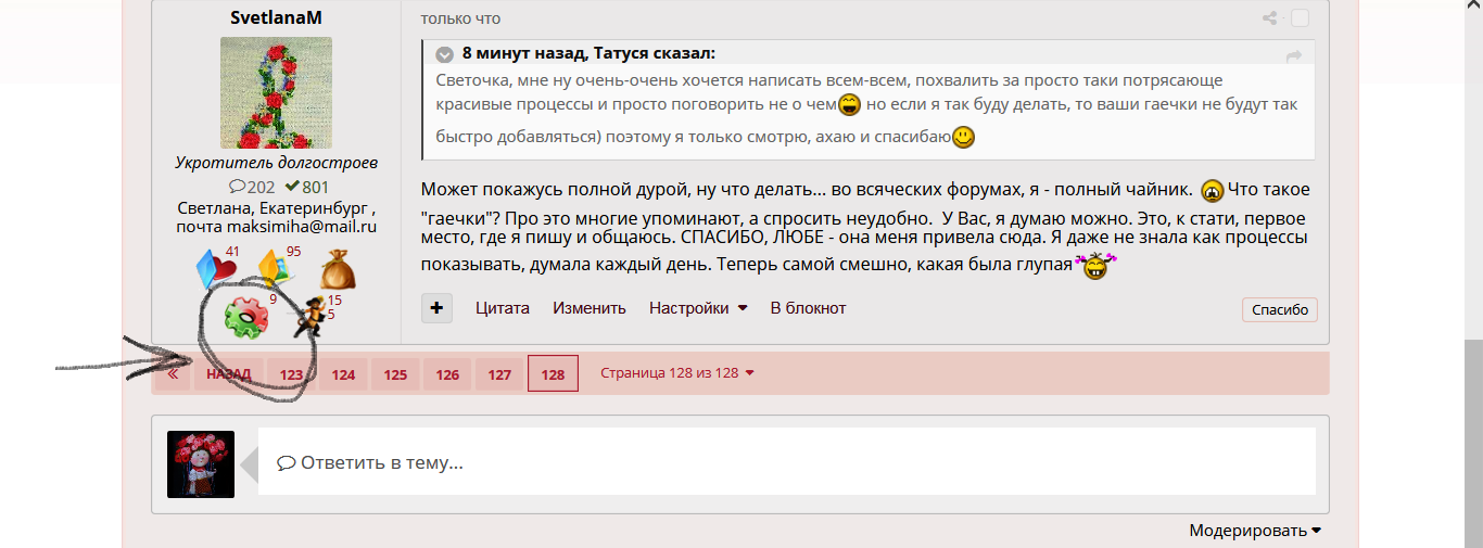 27 сентября 2016 10 минут назад, Татуся сказал: Светочка, мне ну очень-очень хочется написать всем-всем, похвалить за просто таки потрясающе красивые процессы и просто поговорить не о чем но если я так буду делать, то ваши гаечки не будут так быстро добавляться) поэтому я только смотрю, ахаю и спасибаю Может покажусь полной дурой, ну что делать... во всяческих форумах, я - полный чайник. Что такое "гаечки"? Про это многие упоминают, а спросить неудобно. У Вас, я думаю можно. Это, к стати, первое место, где я пишу и общаюсь. СПАСИБО, ЛЮБЕ - она меня привела сюда. Я даже не знала как процессы показывать, думала каждый день. Теперь самой смешно, какая была глупая оленек, чеба, белая-мягкая-пушистая и 2 других сказали спасибо Поделиться сообщением Ссылка на сообщение