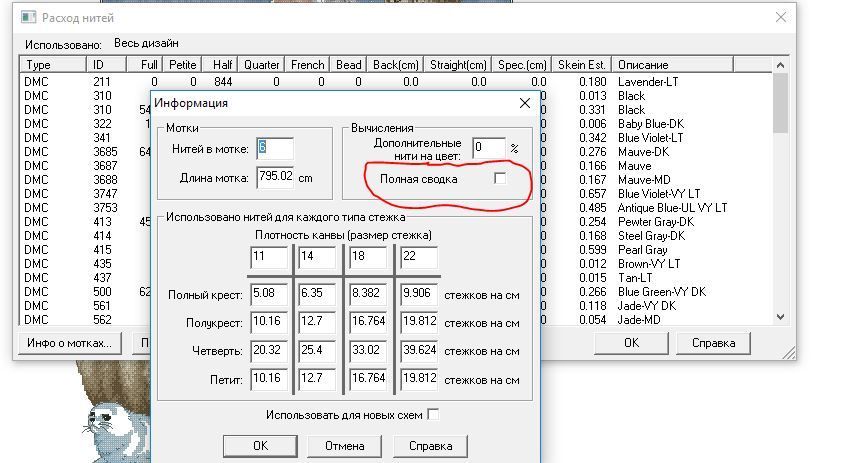 13 ноября 2017 1 час назад, LenusyaK сказал: В левом нижнем углу кнопка "Информация о мотке". Нажимаешь ее и попадаешь в такое окошечко: В правом верхнем углу этого окна "Полная сводка" (обведено). Если стоит галочка, то подсчет идет целыми мотками. Если галочку убрать (как на картинке), то подсчет идет уже дробный. А дальше простая арифметика - 0,5 мотка = 4 метра; 0,2 мотка = 8 метров * 0,2 = 1,6 метра. В этом же окошке видно, что программа настроена для подсчета расхода нитей для каунтов 11, 14, 18, 22. Если в настройках заявлен другой каунт, то расход не считается. Не совсем поняла ситуацию с N/A. Я у себя таких файлов не нашла, поэтому не могу проверить настройки. Чтобы задать каунт ткани выбираем в командной строке "Ткань" В выпадающем списке выбираем "Размеры", открывается такое окно: Обведено окошко, в котором задается каунт. СветланаМ, sunny981, оленек и 6 других сказали спасибо Поделиться сообщением Ссылка на сообщение