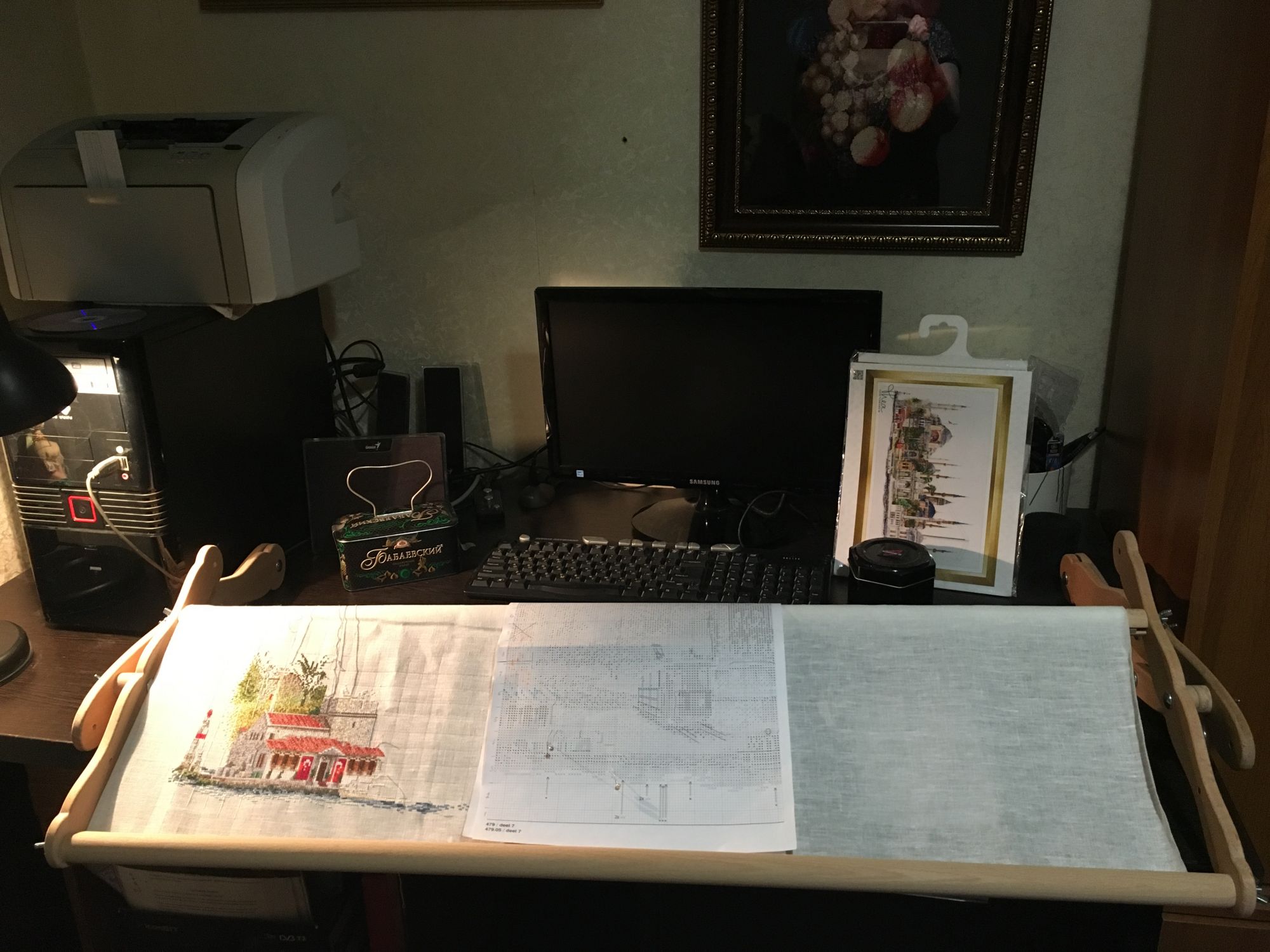 4 февраля 2018 Лет 10 у меня был напольный станок от Золотого Руна, купленный в местном магазине, где он был один. Потребность в станке созрела, а выбора не было. Но он меня выручил. И всё было хорошо, пока дети не заказали набор Теи Стамбул. На пяльцах я не могу шить , ткани много - вот кое-как натянула на станок. Переживала за лён по верхней планке, я клипсами зажала на высоту рамы, максимально натянула и боялась , что лён повредится. Но мне не нравилось всё это. Ни организация рабочего места, ни сам процесс шитья не радовал. Наоборот, угнетал. это фото было сделано детьми просто, мимоходом. Но сегодня пригодилось. На нём видно и сам станок, и как лён висит простыней сзади и сбоку. Такого же типа фото и про клипсы по верхней планке. Для наглядности. Сейчас у меня диванный станок Рукодельница и рама на 90 см. Собрать станок очень элементарно. Выглядит хорошо. Дерево ошкурено, приятное на ощупь. Но именно как диванный вариант использовать у меня не получилось. Я думаю, из-за большой рамы (своя рама этого станка почти в 2 раза меньше) он немного трясётся. Два вечера я кружила с ним по квартире. Разложу, посижу за ним, потом соберу - и дальше думаю. В конце-концов я положила весь этот механизм на свой компьютерный стол, который до этого казался мне ненужно-большим. и для меня теперь всё логично. Для удобства левый край немного выдвигаю вперёд к себе. Пока я внизу вышивки - так нормально. По мере продвижения вверх, выдвигать надо больше, и конструкция пытается завалиться на меня. Пока помогает коробочка с вышивальными мелочами в качестве противовеса. Дальше посмотрим. теперь мне всё нравится. Удобно, организованно, чётко, красиво. Единственно, натяжение не барабанное. Сначала я натянула лён на всю высоту рамы, но провисала сильно ткань. На этой высоте лучше. Почему-то левый край идеально натянулся , а справа даже по фото видно провисание. Но терпимо. Шить не мешает. С планками сама одна не справилась. Сын помогал , и это всё, что мы смогли сделать с натяжением. Получилось длинно, но , надеюсь, будет кому-то полезно. murzopyat, Pirani@, JanaTX и 15 других сказали спасибо Поделиться сообщением Ссылка на сообщение
