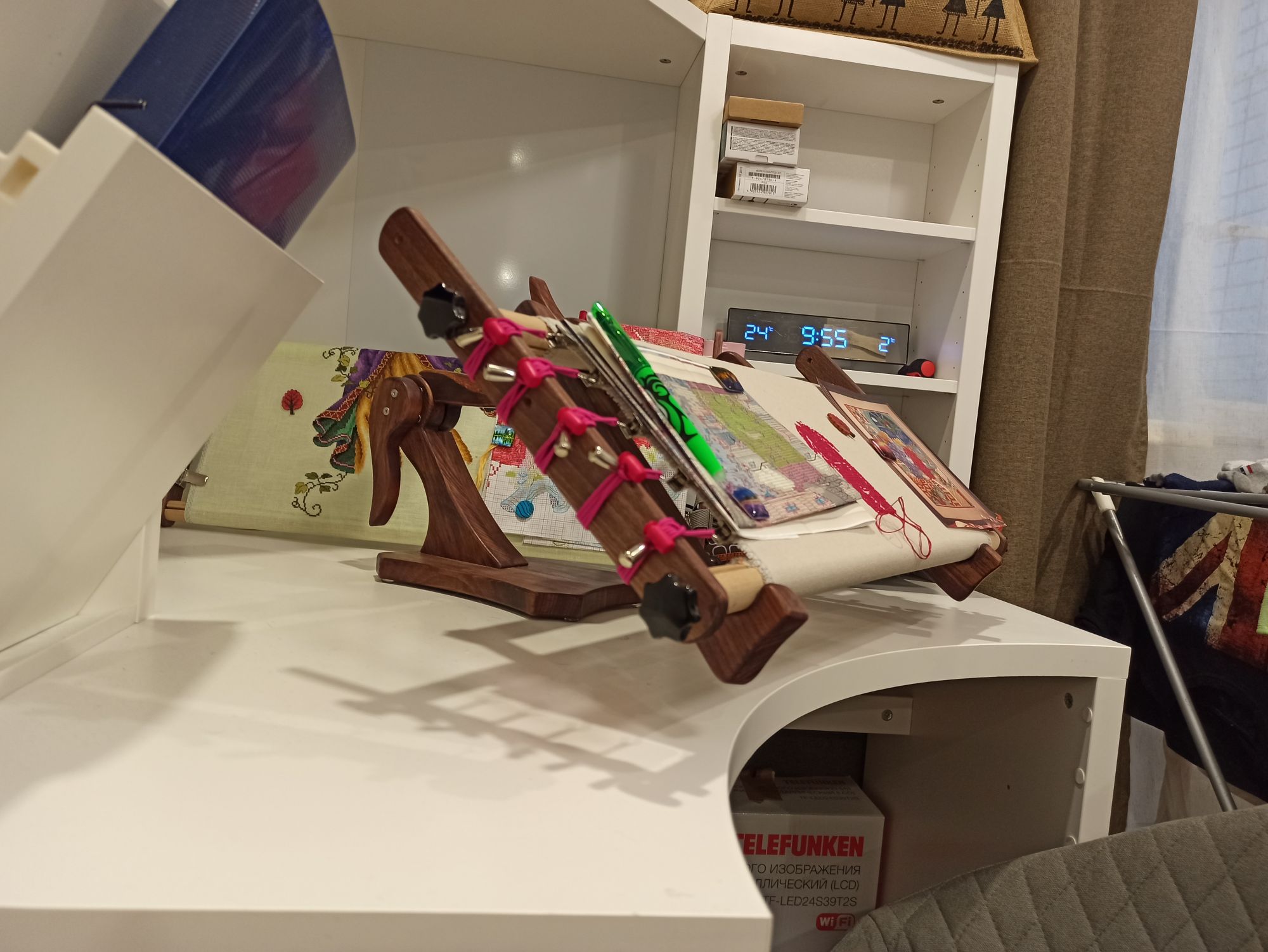 20 января 2020 Я довольно долго вышивала стоя. Станок был сначала стичсмарт( маловат при росте 160 в прыжке), потом воронежский. На станках были рамы. И все таки, стоя, на мой взгляд, можно вышивать для разнообразия положения тела. Сидя все ж удобнее и комфортнее. Сейчас у меня есть от Серёги - мастера вот такой держатель. Он задуман как диванный, но у меня струбциной он прикручен к столу, его максимальная высота ок 54 см, +стандартная высота стола ок 80 см. Вот с этим держателем довольно удобно вышивать стоя. Единственное, рамы он большие не держит, ку снапы с трудом. И, конечно, его надо чем то крепить, иначе заваливается. ivk_, JanaTX и Слонопотам сказали спасибо Поделиться сообщением Ссылка на сообщение