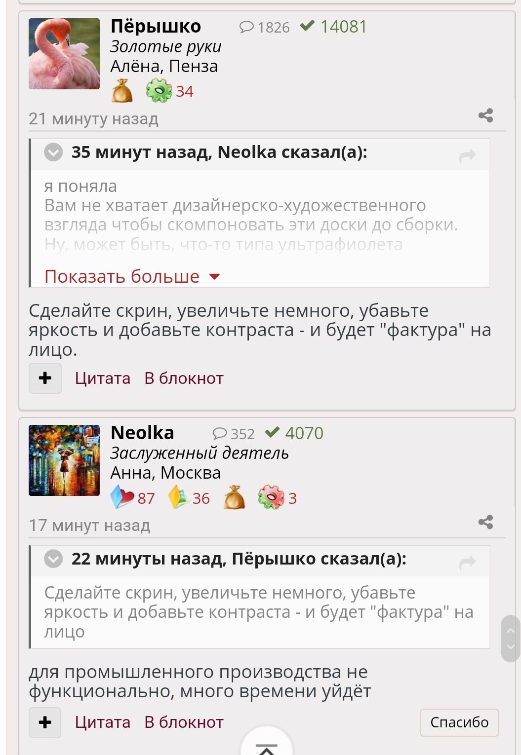 30 июня 2022 5 минут назад, Neolka сказал(а): для промышленного производства не функционально, много времени уйдёт Полминуты. Вы не поняли о чем речь -направление волокон дерева и кляксы Сибирская Кошка сказал(а) спасибо Поделиться сообщением Ссылка на сообщение