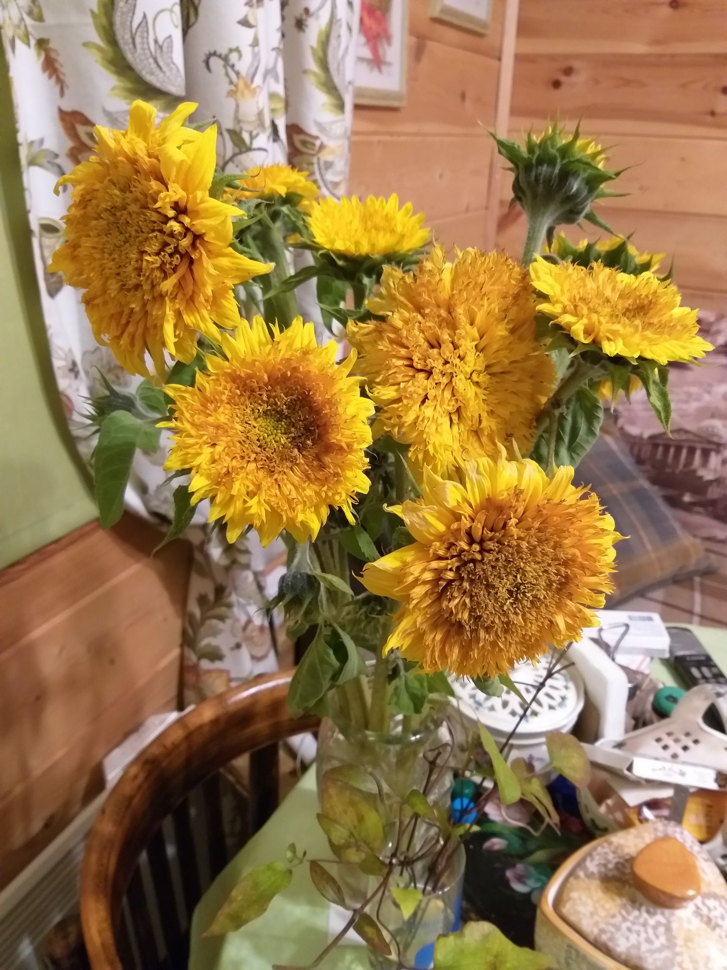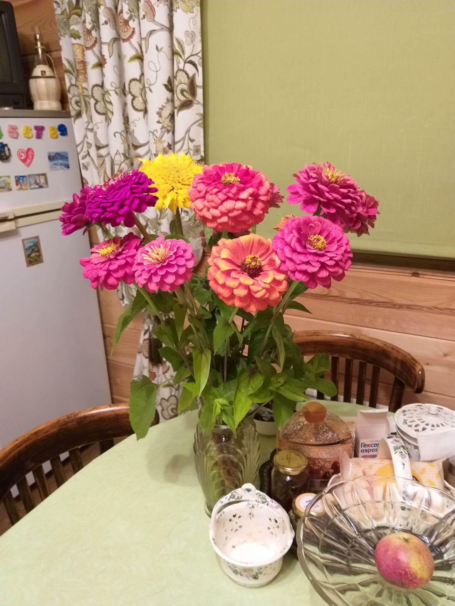 2 октября 2019 А я тоже сажала в этом году подсолнечники 2 вида. Один кустовой, а второй Золотое солнце. Вот нарвала в букет, уже правда первым морозцем прихватило. Поэтому решила, чтобы солнышки дома ещё дарили тепло. И цинии тоже.. но в срезке они не так долго простояли... kurta63, letka, Беладонна и 17 других сказали спасибо Поделиться сообщением Ссылка на сообщение