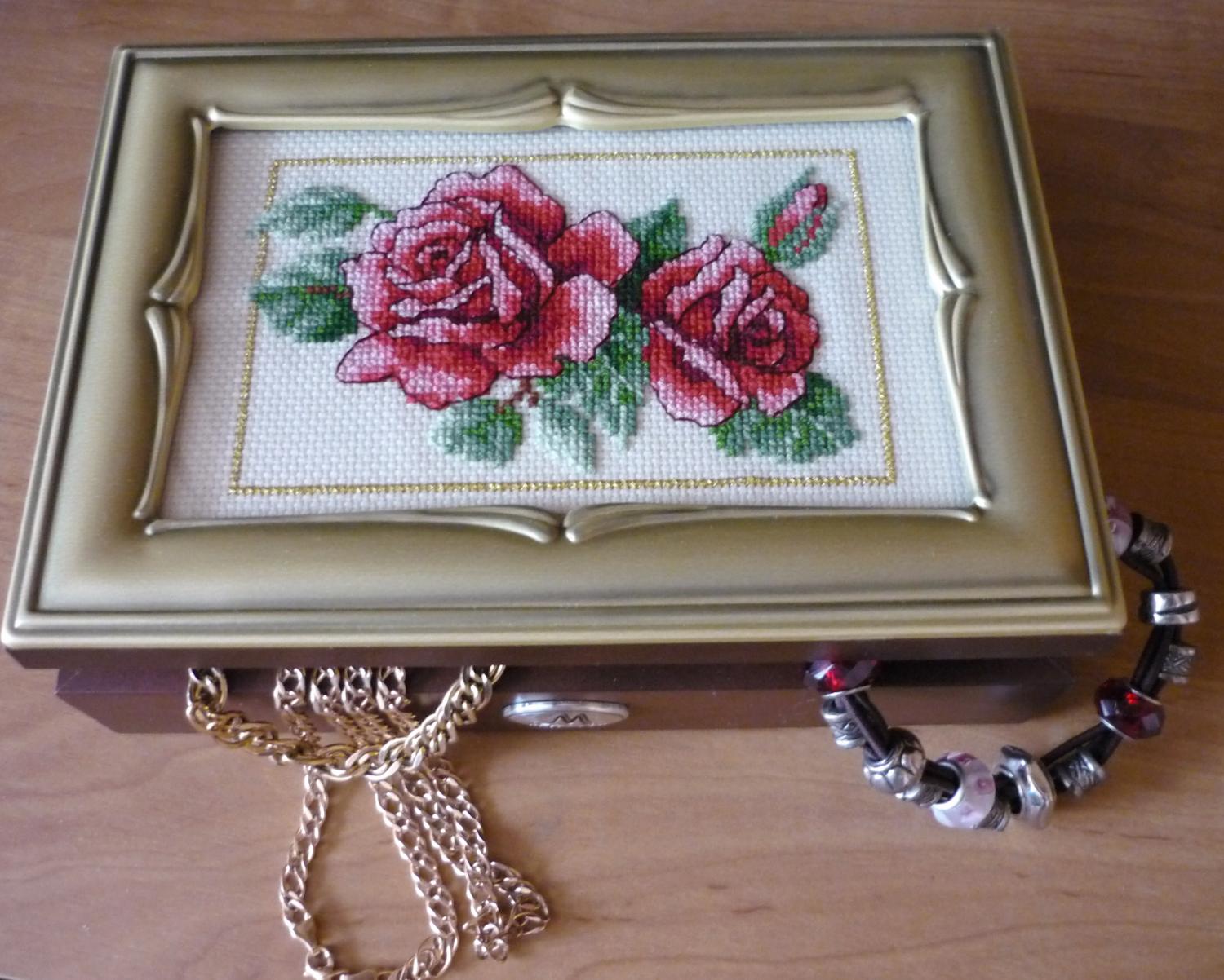 17 апреля 2015 Закончила свои фиалочки Теперь надо собраться оформить. Занималась ещё вышивкой для шкатулки.Самая обычная шкатулка, небольшого размера с тремя отделениями внутри, но главное достоинство этой вещицы то , что в крышке фоторамка со стеклом , значит туда можно приспособить и вышивку Долго перебирала в уме подходящие сюжеты, размер полезной площади уж больно мал 8 на 13 см да и хотелось чего-то поярче. Остановилась на этом фрагменте из набора DOME , только поменяла канву на 18 ( как раз размеры все уменьшились).Думала показывать процессик или нет, потом решила - вдруг кому пригодится . Итак, розы от DOME, 18 канва цвета топленого молока, 16 цветов, размер 8 на 13 см. Сделала бэк на цветочках и рамочку золотым люрексом.Вот что получилось Так что теперь украшения не будут валяться где попало ,а при желании можно и поменять сюжетик, хотя пока мне эти розы больше всего нравятся... alex1942, Юнона1960, Наталья2013 и 10 других сказали спасибо Поделиться сообщением Ссылка на сообщение