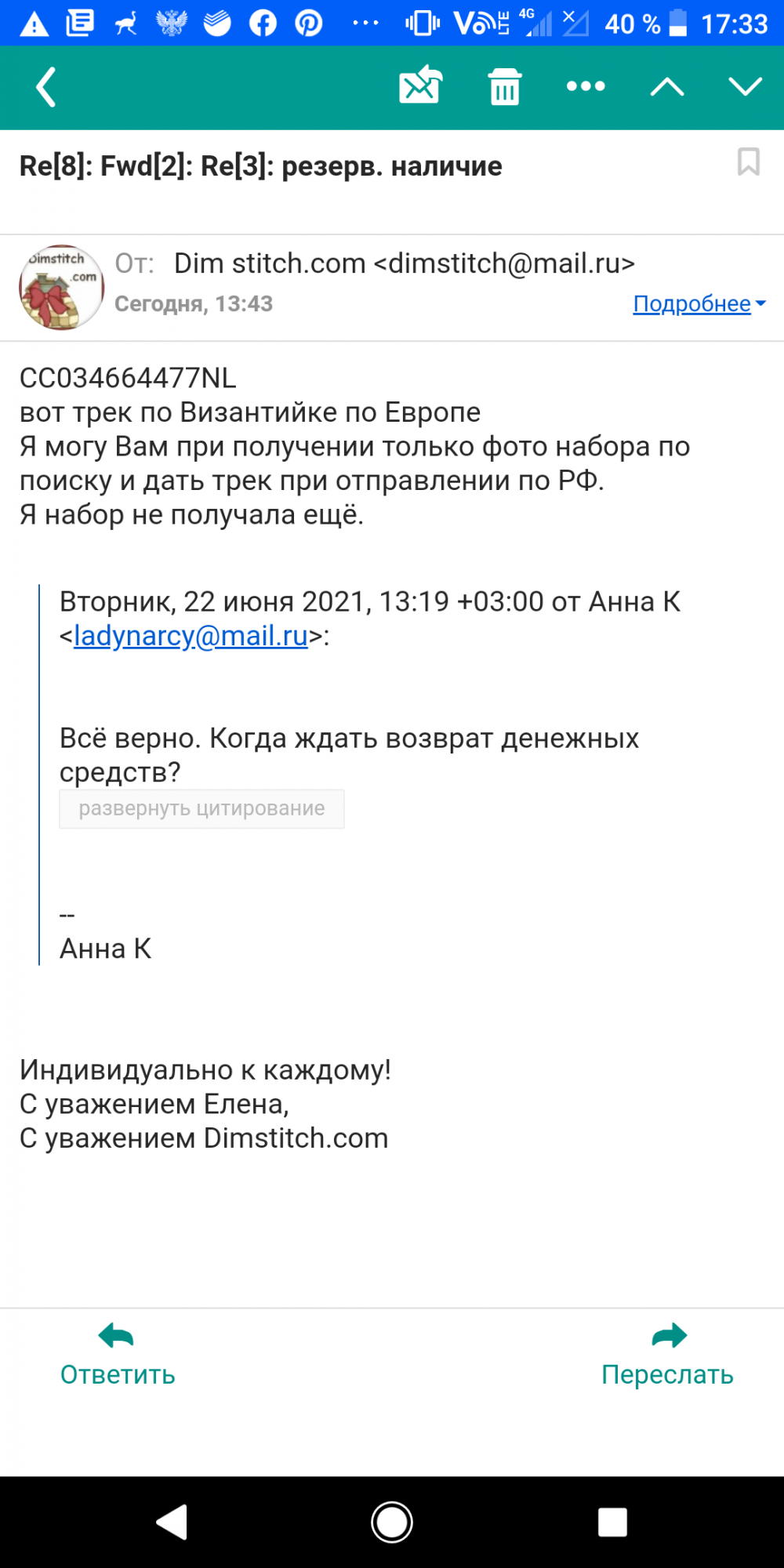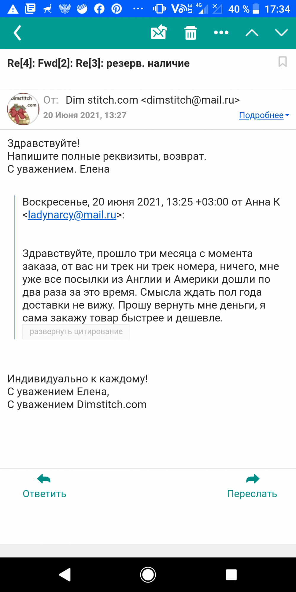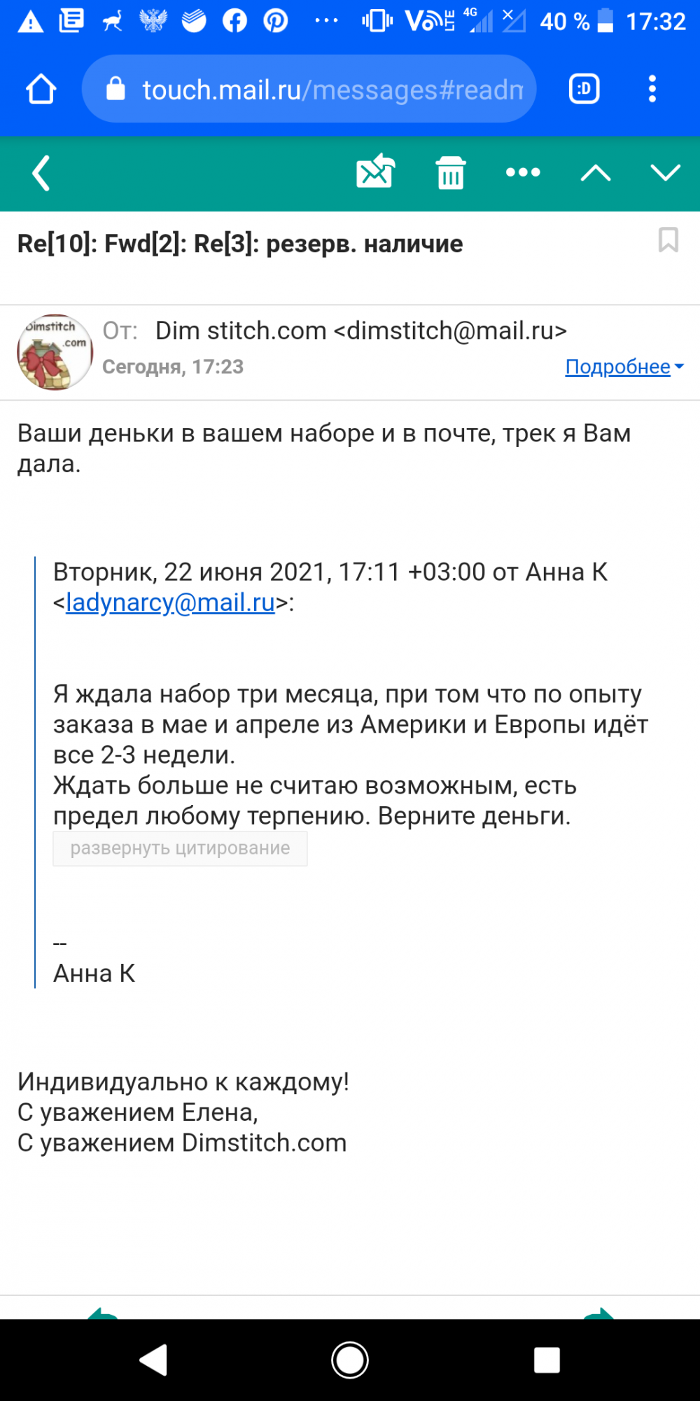 22 июня 2021 Сделала огромную ошибку заказав набор в этом магазине. В итоге три месяца прошло, я терпеливо ждала, но набора нет, попросила вернуть деньги. Сперва запросили реквизиты на возврат, а потом резко ушли в отказ вместо перевода моих денег обратно. То есть пустя три месяца честного ожидания мне дали непонятный трек номер, который не отслеживается и отказали в возврате денег, сказав что уже их потратили. Есть ли управа на эту организацию и предел произволу? Три месяца никакой работы, непонятный трек номер и посыл вместо возврата денег за не исполненный заказ. Полюбуйтесь переписке, мне запрещают предъявлять претензии даже. Пишу чтоб предостеречь вышивальщиц от общения с этой недобросовестной конторой. almmatea, Pirani@, Златолео и 7 других сказали спасибо Поделиться сообщением Ссылка на сообщение