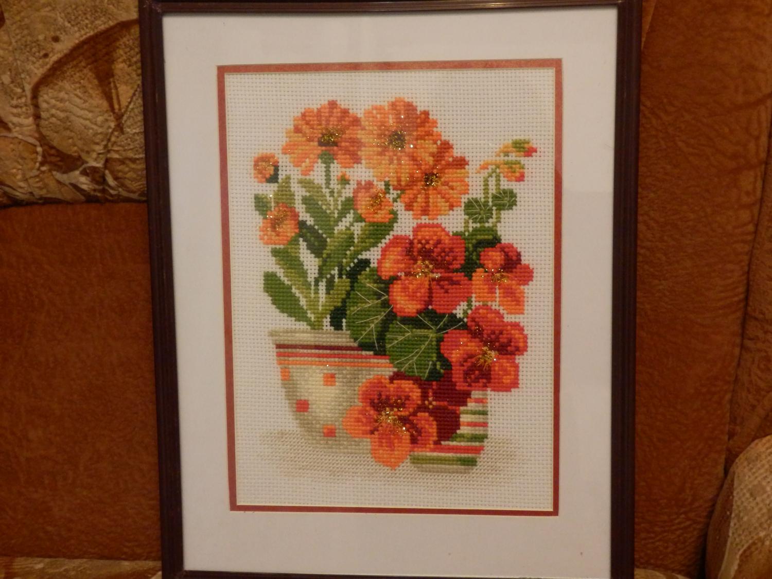 18 апреля 2014 Итак,я посетила Китай и оформила три свои картинки! За все три картинки заплатила 1200 рублей. Причем считал он так:померил длину,ширину,поднял голову в верх,подумал секунду и на калькуляторе вывел сумму. Во все три картины сделал добавочку,но это не испортило вид,а добавило красоты. Он серединки цветов посыпал блестками! Первая картинка это Настурции и ноготки от Риолис. Autumn, Графиня, Татуся и 1 другой сказали спасибо Поделиться сообщением Ссылка на сообщение