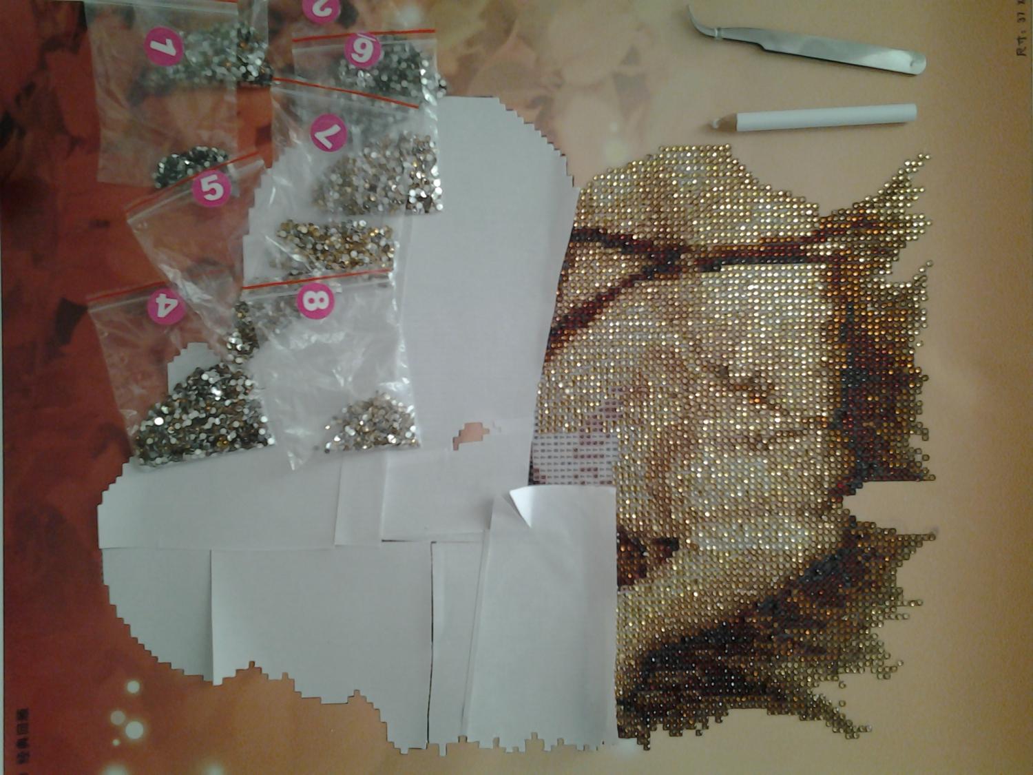 29 апреля 2014 Приобрела я в Китае алмазную вышивку. Затягивает хуже семечек! Присела попробовать и половину картины сделала... Это за два вечера. Получается очень красиво! В наборе есть все:картинка, стразики,карандашик,пинцет и тарелочка. Белую бумажку убираем и там липкая основа,на картинке стоят номера,выбираем нужный цвет и карандашиком кладем стразик на свое место. Очень интересно,что к карандашику стразик как к магниту прилипает! Стразики не отклеиваются. Пинцетиком поправляю липкую основу или если стразик упал с карандашика не туда. Ginger_mama, Сибирская Кошка, Lakis и 3 других сказали спасибо Поделиться сообщением Ссылка на сообщение